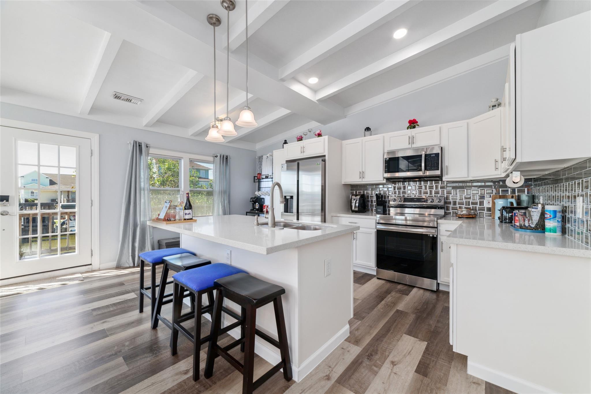 Welcome to this Beautiful Canal Front Home located in Bayou Vista!!! Experience the ultimate coastal lifestyle in this beautifully renovated canal-front home, complete with a private boat deck. This stunning residence features brand-new appliances, including a bonus washer and dryer, and new cabinets topped with elegant quartz countertops. The upper level boasts sleek laminate flooring, two carpeted bedrooms, and two full bathrooms, while the lower level offers durable tile flooring, two additional bedrooms, and another full bathroom. With ample storage space inside and out, this home is designed for both comfort and convenience. Located just minutes from Galveston and local shops, this property is your perfect retreat by the water. LOW TAX and No HOA. This won't last long and schedule your private tour with us TODAY!!!