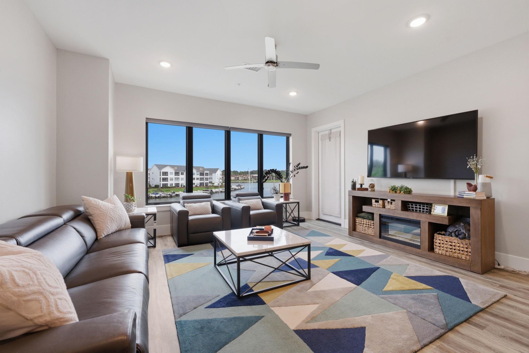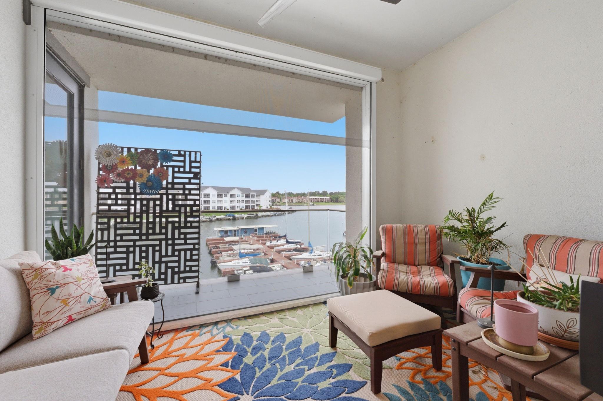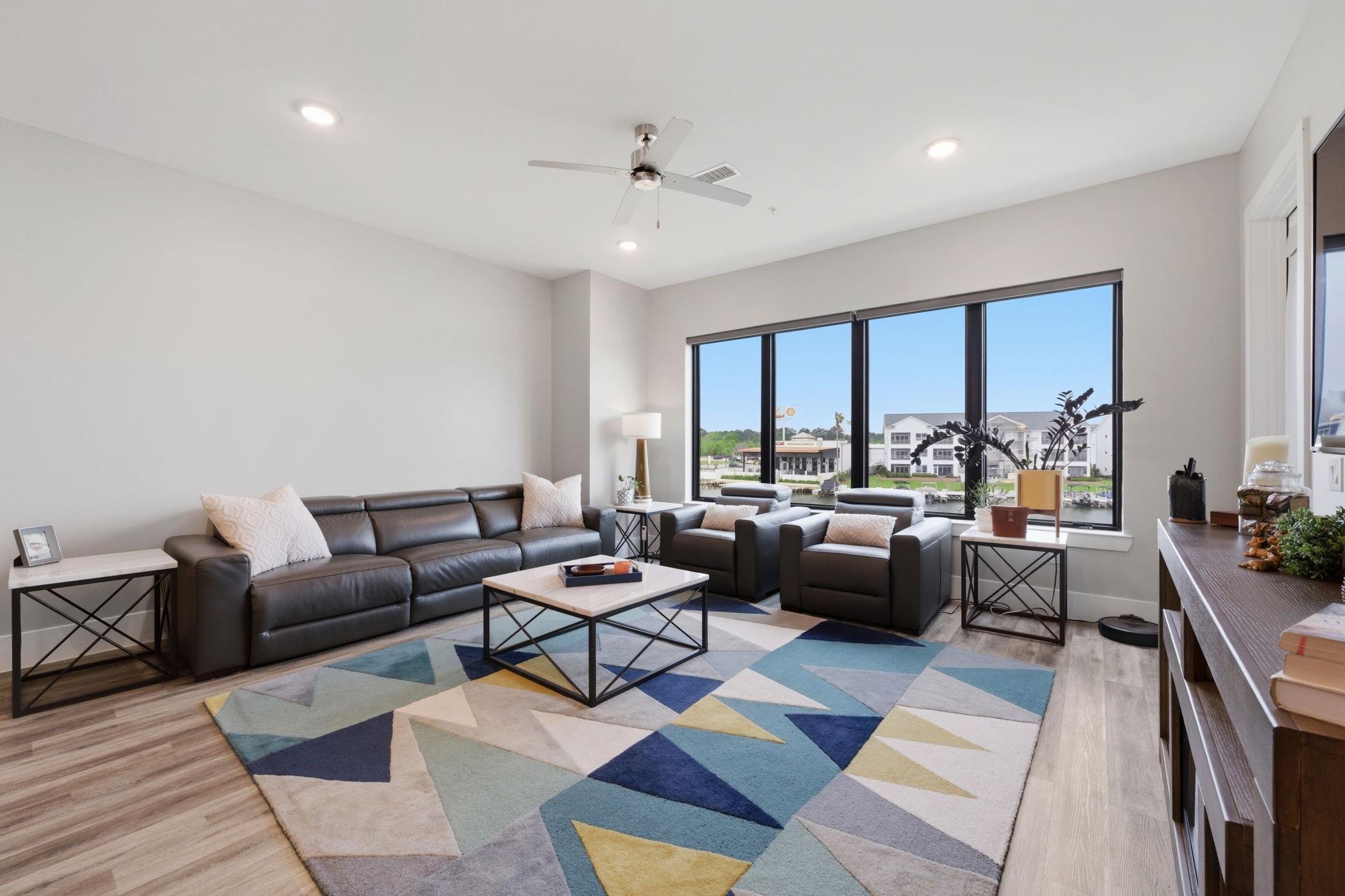 Location means a lot, and this is a prime location!! Enjoy elevated lakefront living in this tastefully designed 3-bedroom, 3-bath condo at The Shoreline at Waterpoint on Lake Conroe. This mid/high-rise residence features a modern look with soaring 9.5-foot ceilings, elegant neutral tones, and blackout curtains for a serene retreat. Step onto the private balcony, enhanced with a remote-controlled screen—perfect for enjoying the breeze and watching boats drift by, bug-free. Community amenities include EV charging, garage parking, secure entry, two saltwater pools, and a hot tub. Walk to nearby dining, unwind with a massage, go for coffee, ice cream, or stop by CVS for a late-night snack or prescription. Medical and dental offices are conveniently located close by, too. It is all within walking distance, and you still have the privacy you are looking for. Experience low-maintenance luxury living with stunning views and everyday ease.