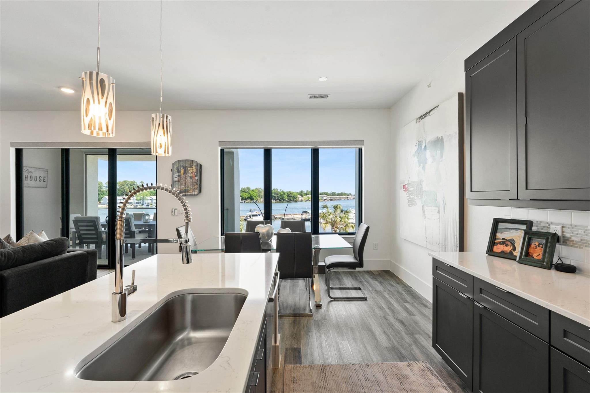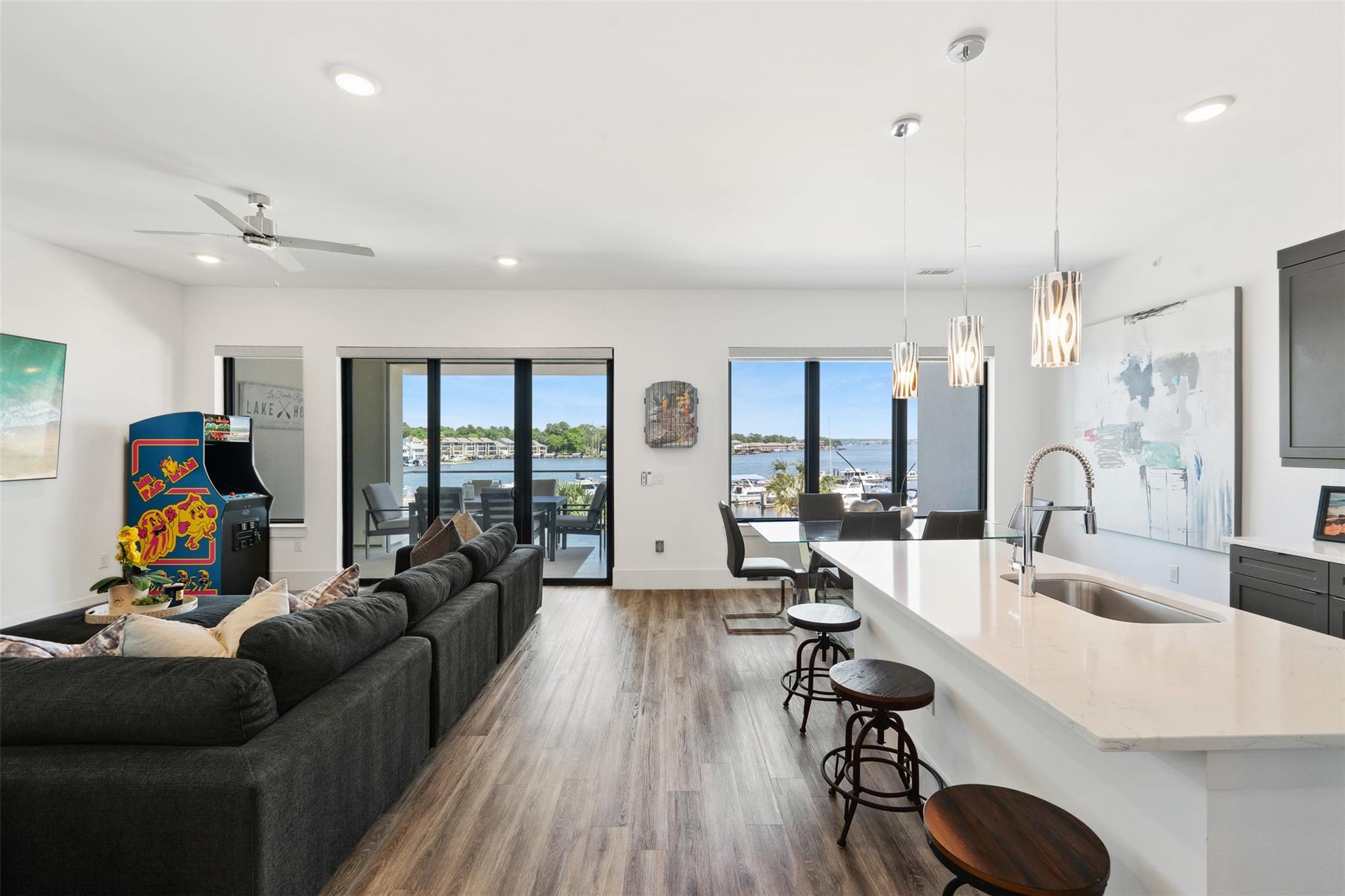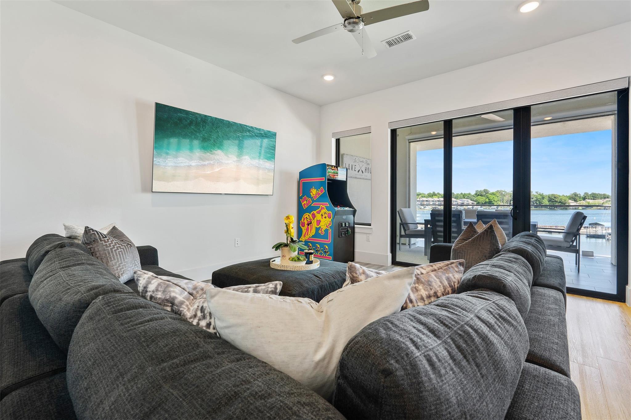 WELCOME TO PARADISE! This gorgeous 2 bed/2 bath luxury condo is being offered fully furnished (Pac Man game not included) and is the ONLY 2 bedroom unit currently for sale that faces the OPEN LAKE side of the building! Enjoy breathtaking views from your private covered balcony of Lake Conroe, The Waterpoint Marina and Shoreline's resort style pool that features a water fall and fountains. Lush landscaping compliments these amenities and night lighting provides the feel of a tropical paradise even after the sun sets. Gated entry (FOB system), two pools, hot tub, grilling stations, and elevators are among the amenities of this upscale 56 unit property. This unit (#208) is located on the 2nd floor, on the coveted open lake side of the building. Steps away you'll fund full service waterfront restaurants like Fajita Jacks, Akashi, Crust Pizza, Starbucks and Monty's as well as boutique shops, service businesses, and a CVS. Keep your boat steps away in the best marina on Lake Conroe.