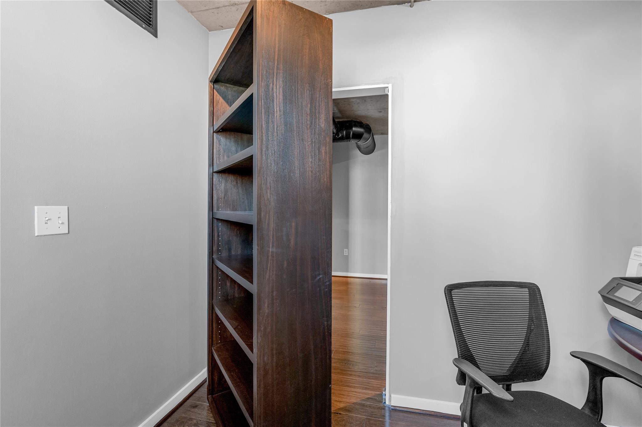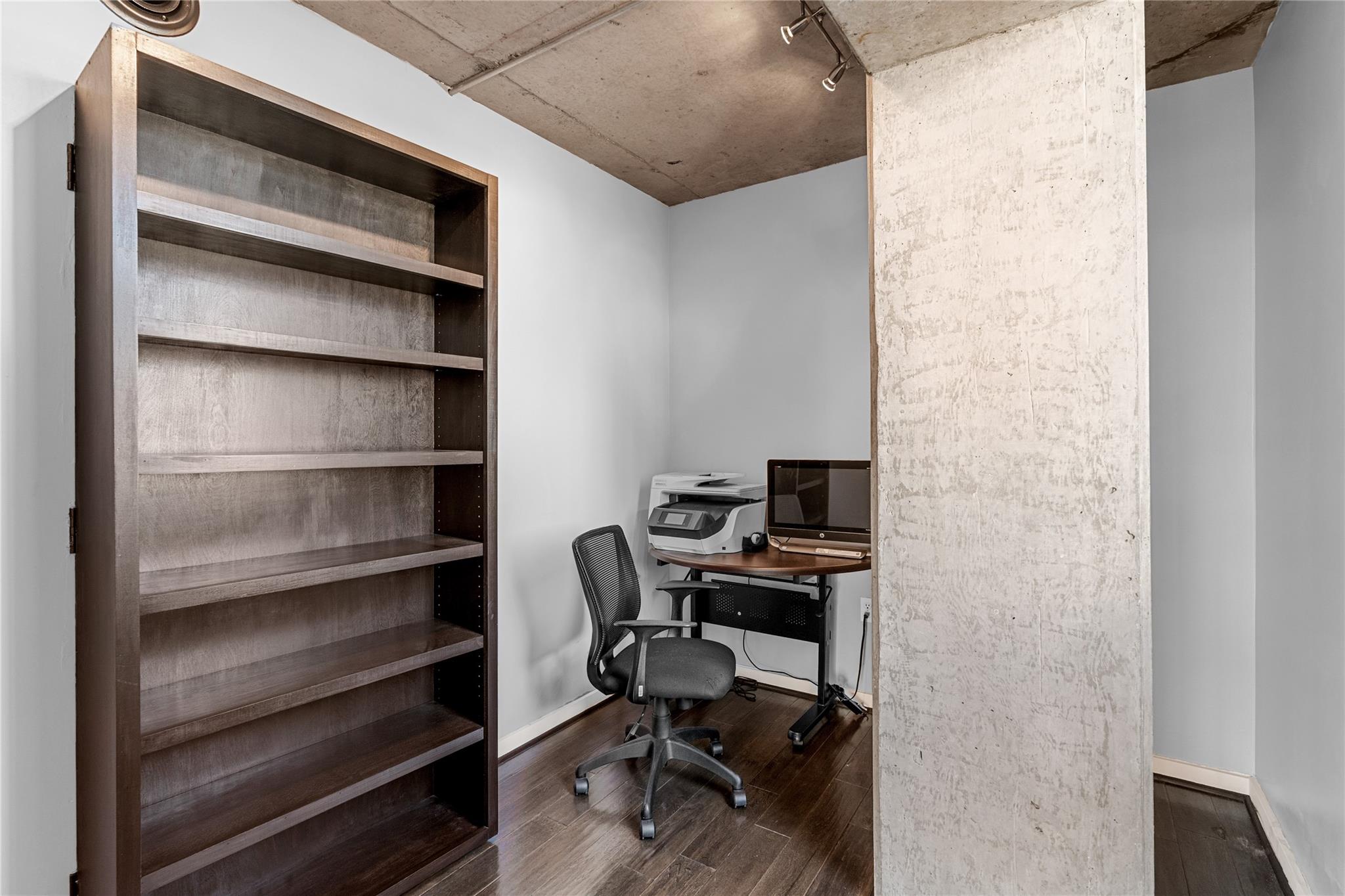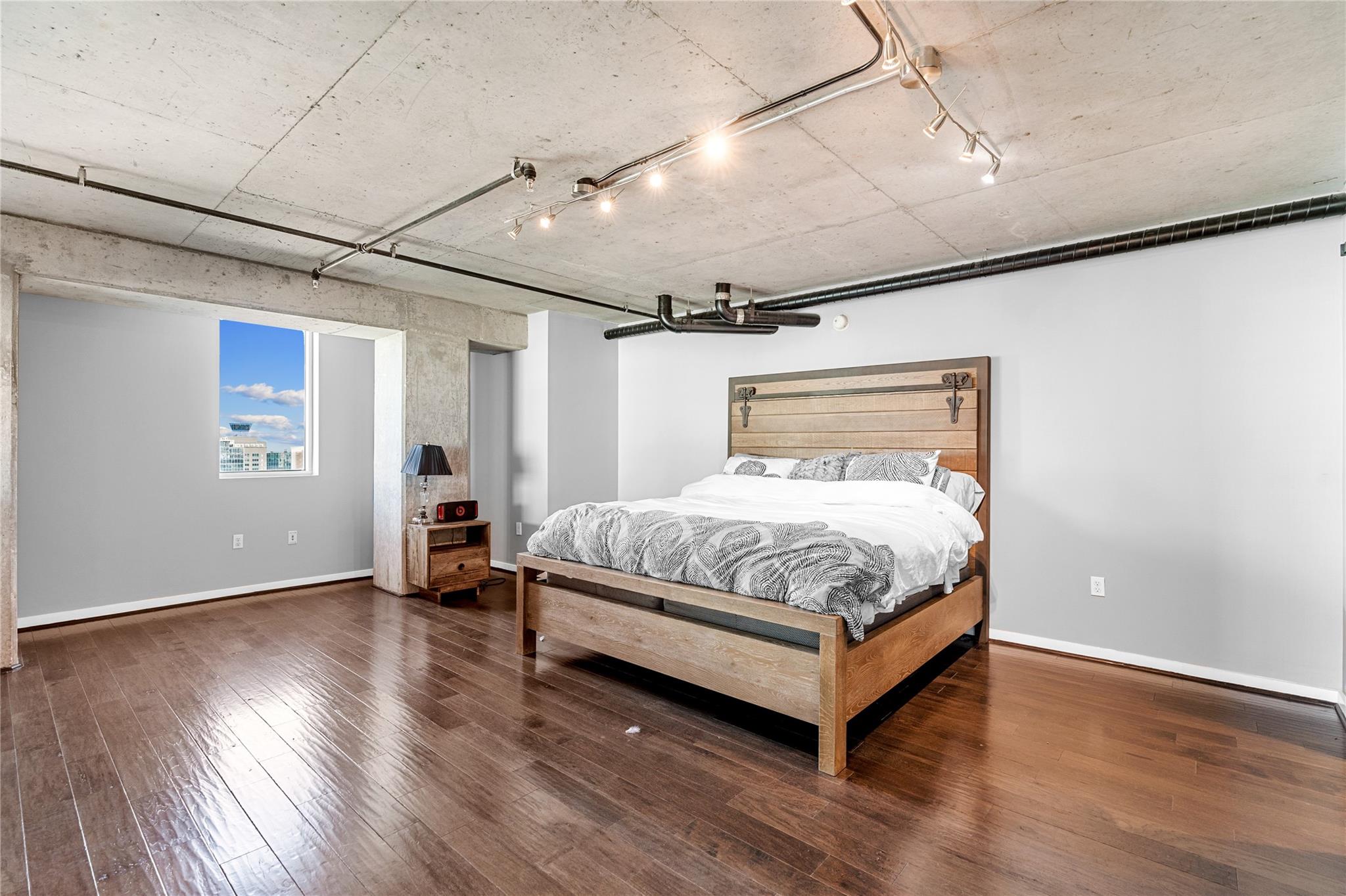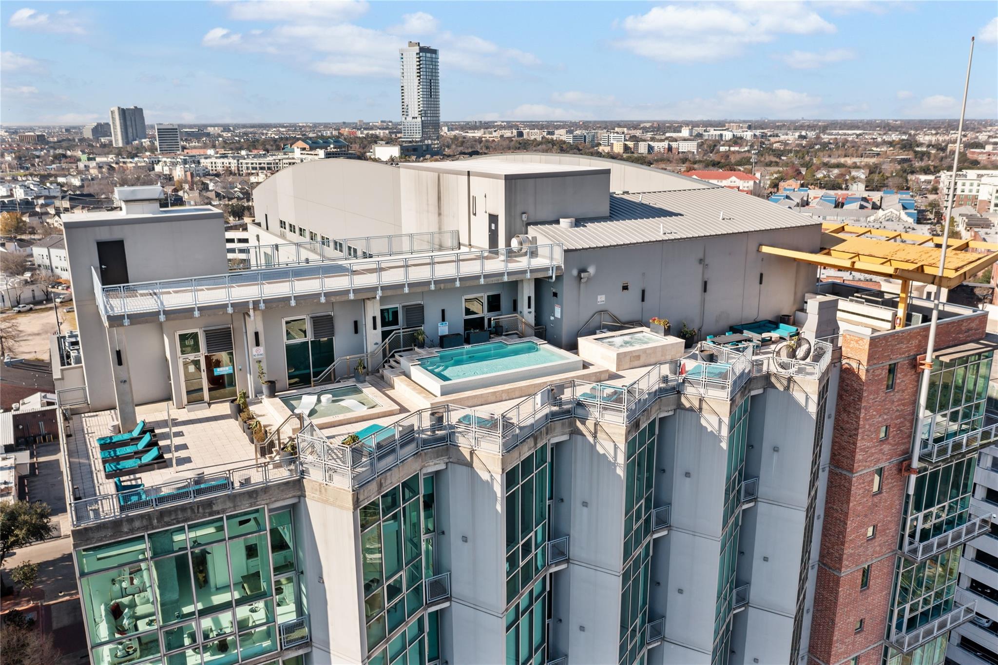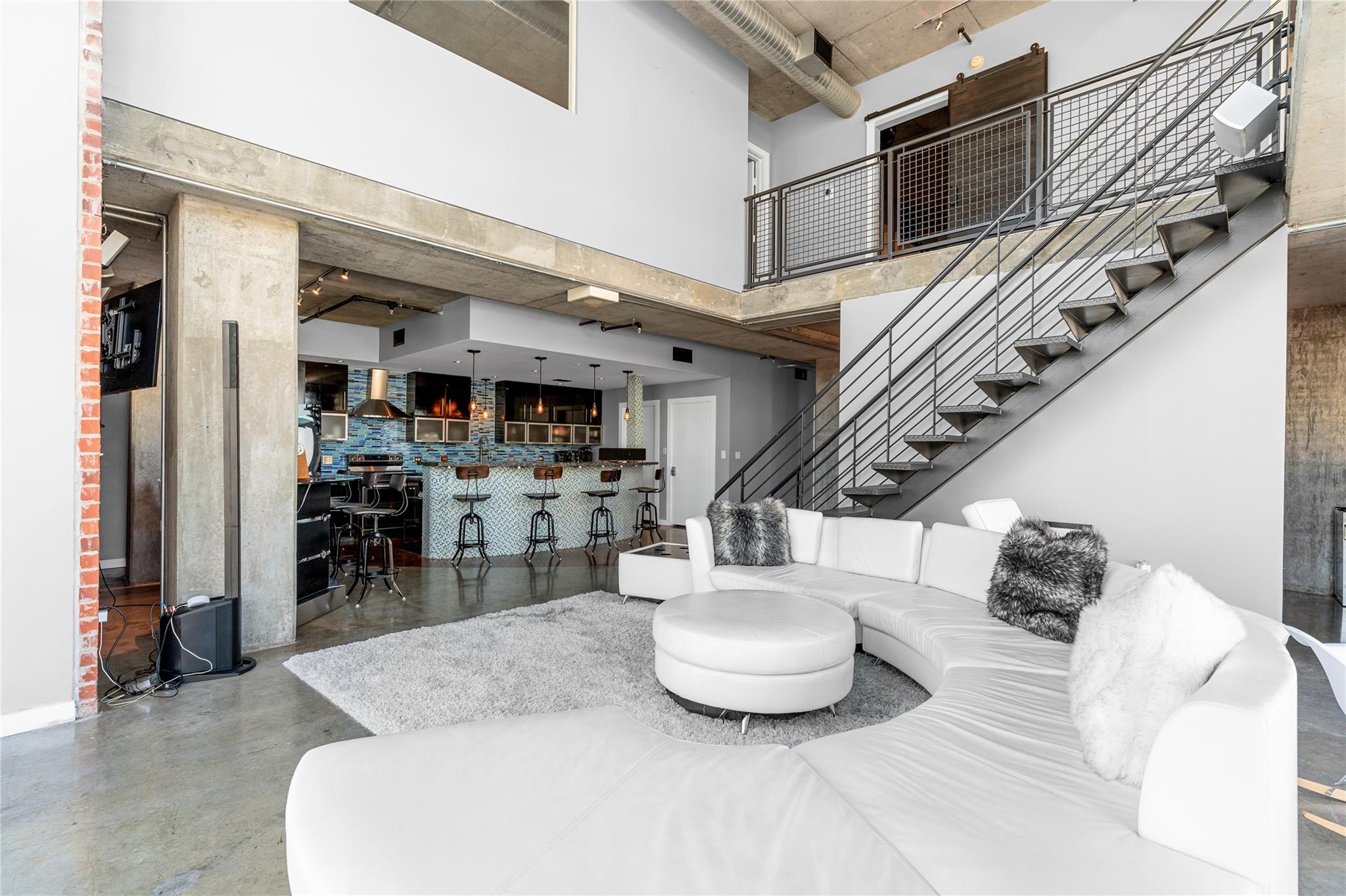 A rare penthouse feel without the penthouse price tag located in the vibrant heart of Midtown, including Midtown's hottest attractions and amenities conveniently located within walking distance. This exquisite luxury condo is perched on a coveted top corner from the rooftop infinity pool, ensuring convenience and elite status. Two-story, floor-to-ceiling glass windows highlight mesmerizing downtown corner views from dual perspectives and an expansive wrap-around balcony. Inside, the first floor captivates with its industrial-chic aesthetic, featuring stained concrete floors. Soaring ceilings, open floor plan, and spacious kitchen, boasting a large island and a private wet bar, perfect for entertaining. The dining area flows seamlessly into a grand living room. Upstairs, the primary bedroom offers a sanctuary of spacious luxury, including a recently remodeled ensuite with an oversized shower, dual sinks, and a generous walk-in closet, plus a secondary room with a secret office.