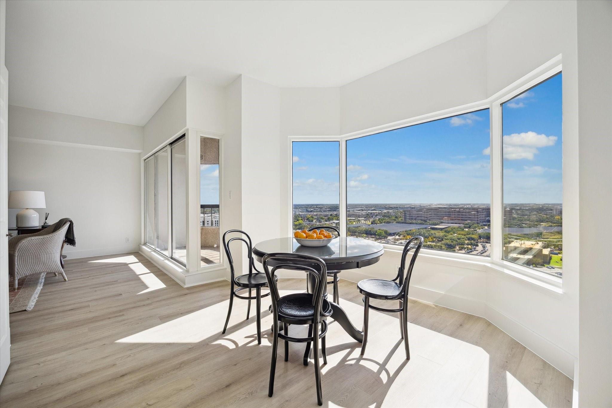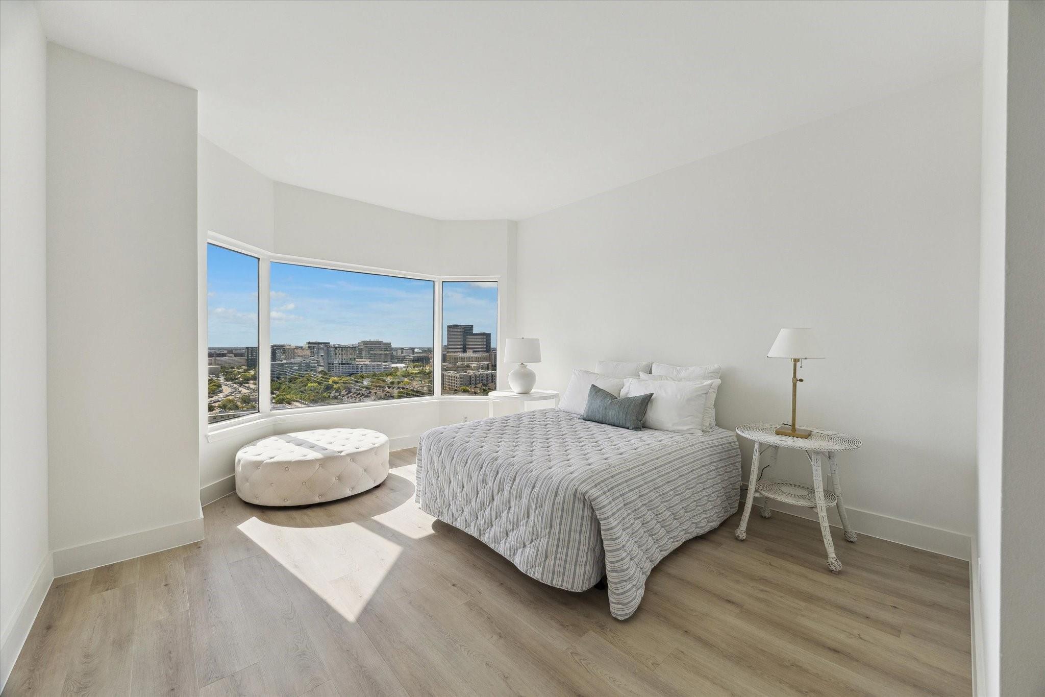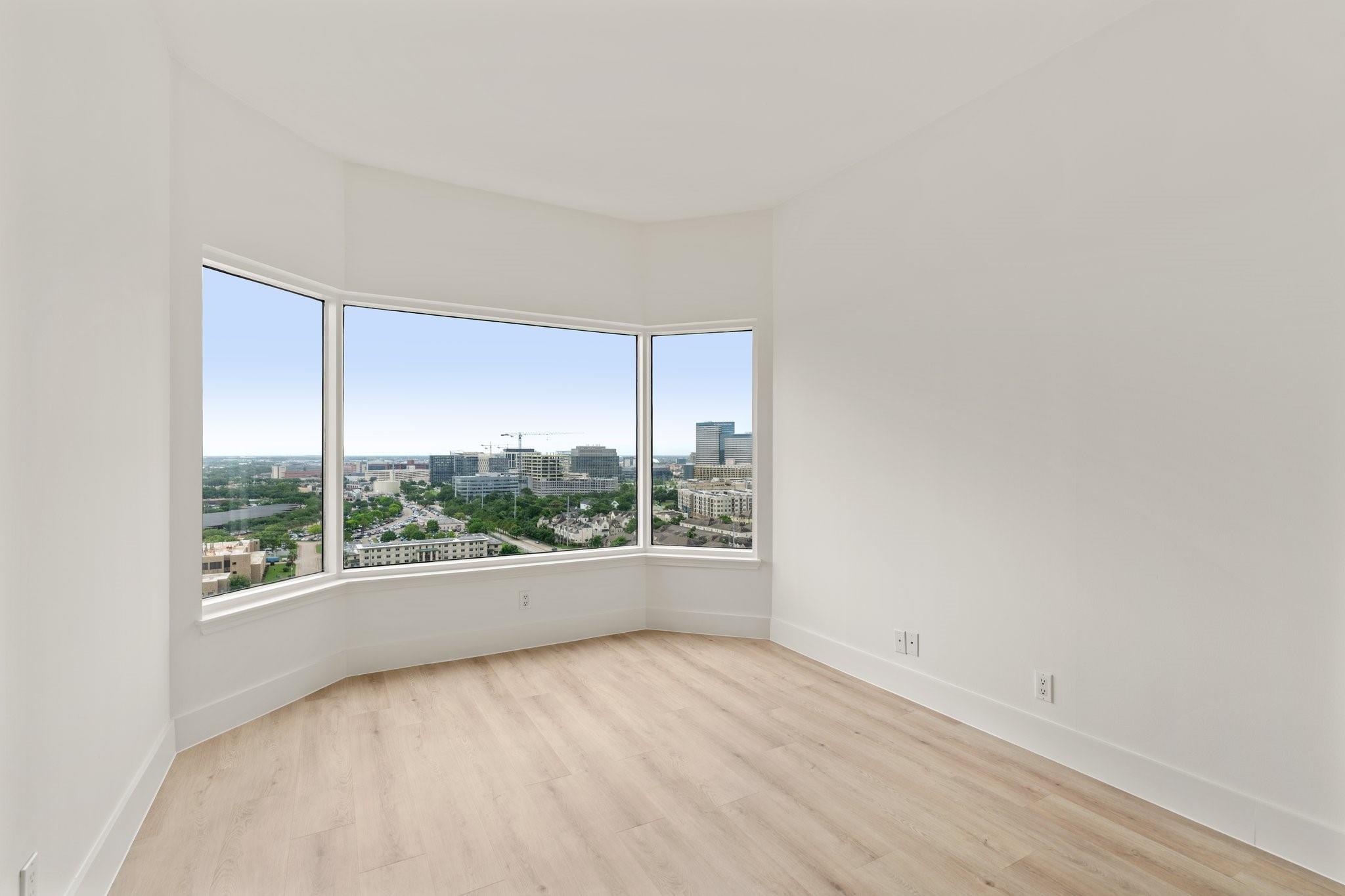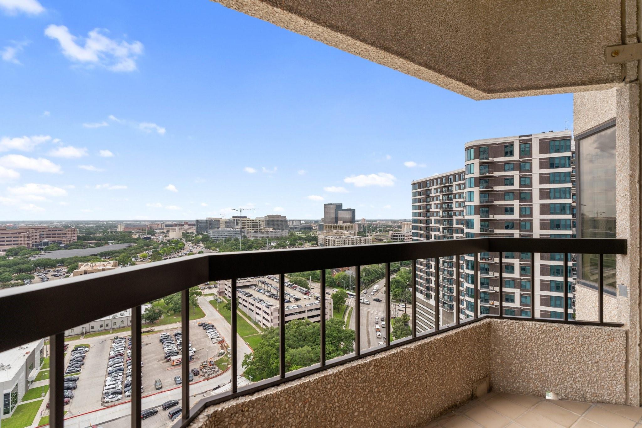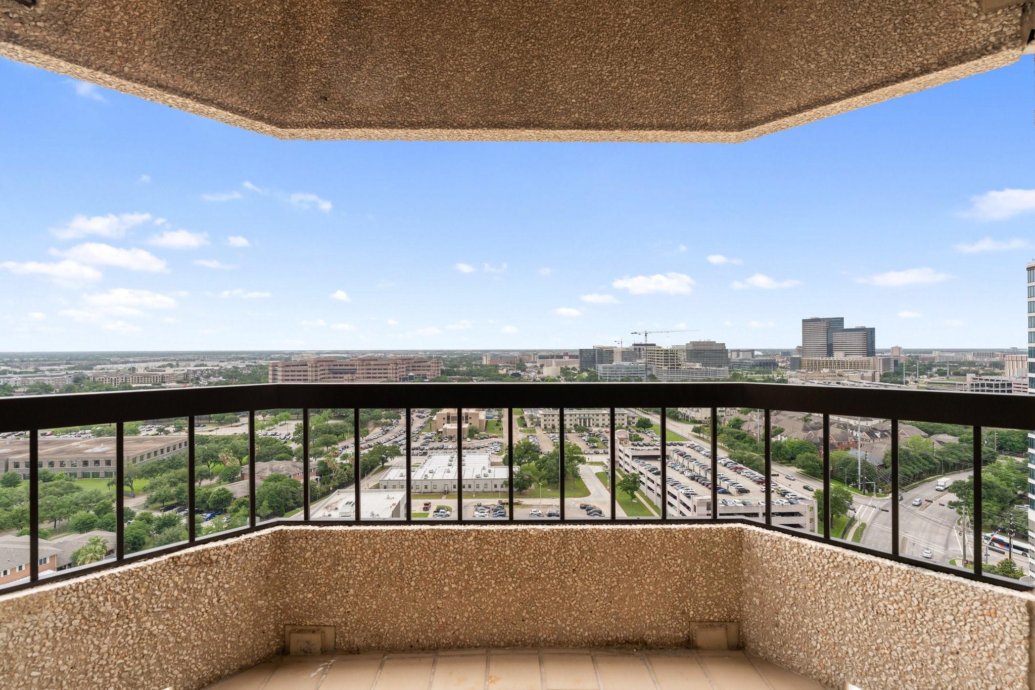 Lovely 19th floor 2/2 residence with fresh luxury vinyl wood look flooring, paint, baseboards, recessed lighting (2025). Kitchen offers granite counters, stainless steel appliances including refrigerator. Bathrooms with granite counters and tile tub/shower surrounds. Primary suite with walk-in closet. Great floor plan! Private covered balcony. Stacked washer/dryer to remain. Park-side full service high rise living with 24 hour guarded entry, concierge, valet, porter, fitness center with dry sauna, party rooms and indoor racquetball court. Private resident access to hike/bike trails connecting you to Hermann Park and the medical center. Convenient access to freeways and Downtown.