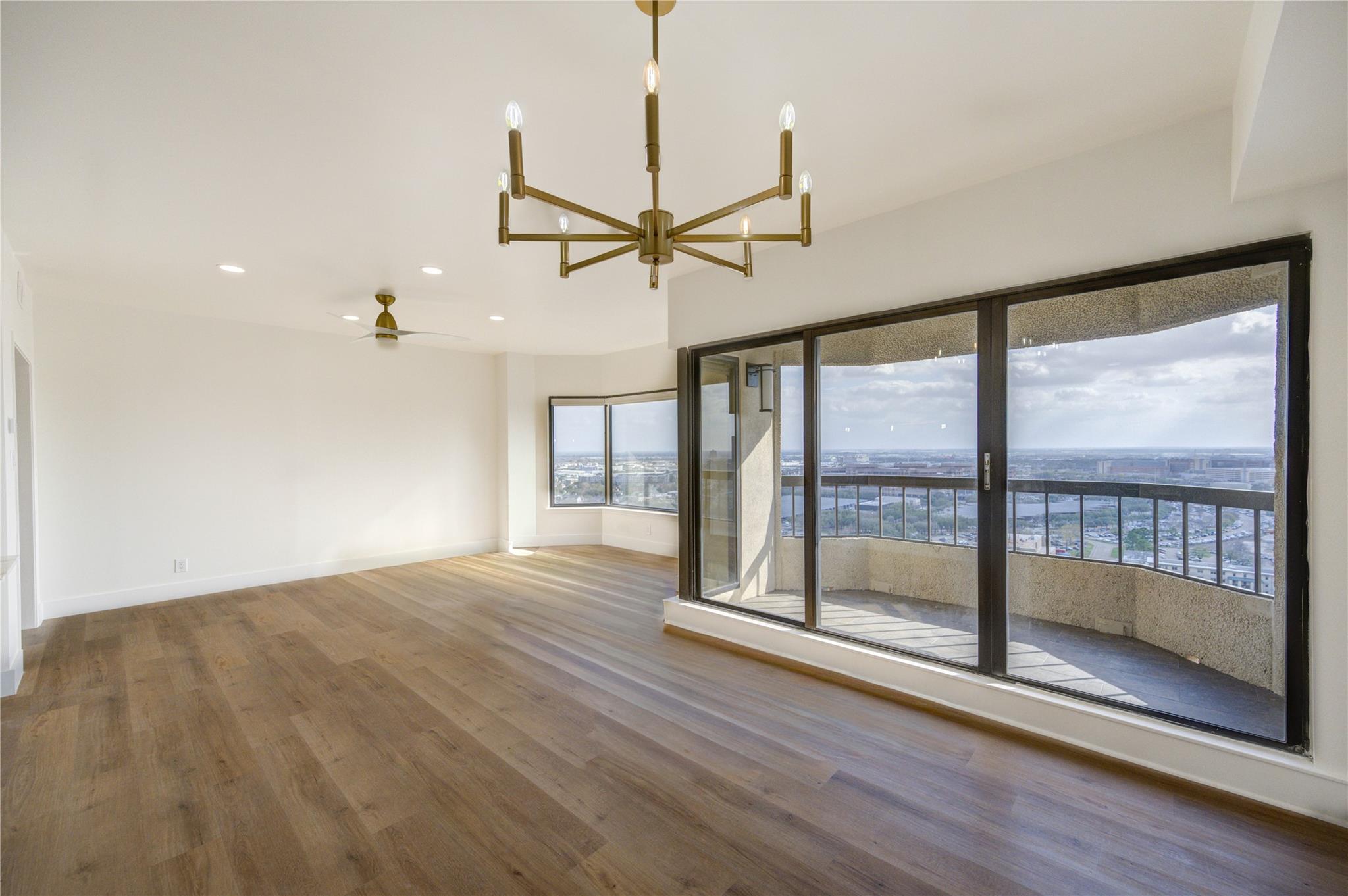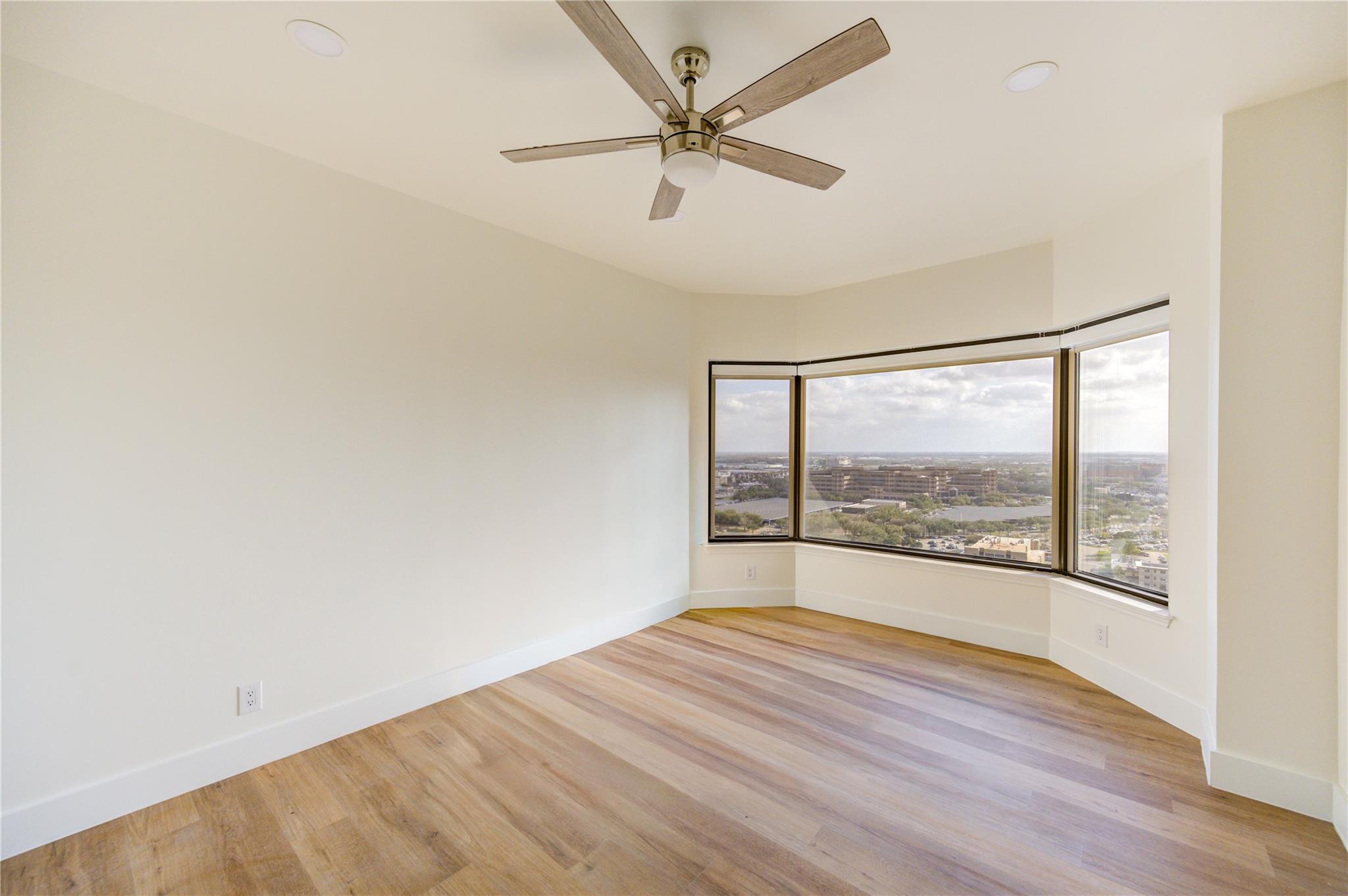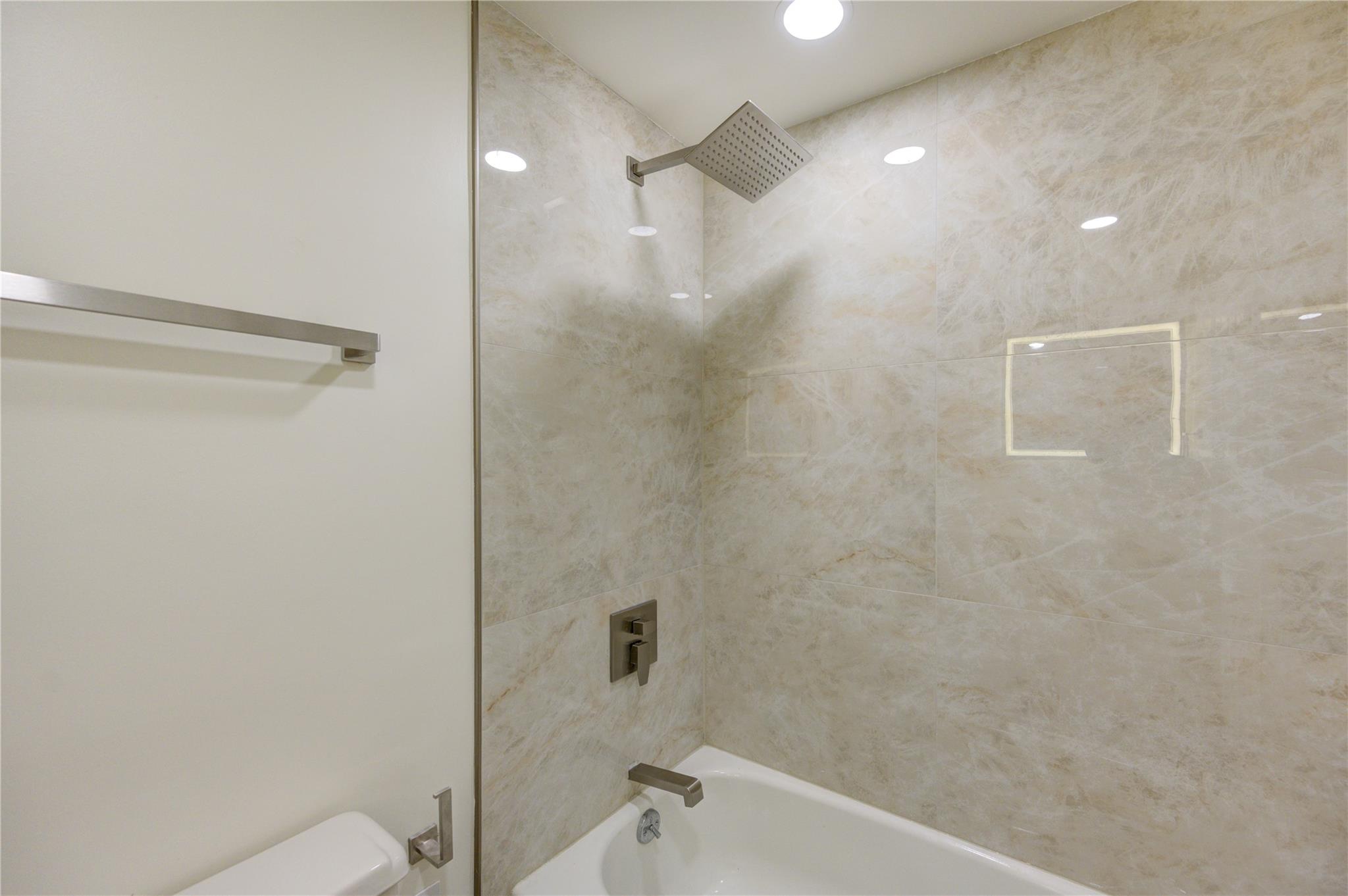 Highly sought-after Dover floor plan at The Spires, just minutes from the Texas Medical Center, Hermann Park, and Houston Zoo. Fully renovated November 2025 with luxury vinyl wood plank flooring throughout, fresh paint, new custom cabinetry in kitchen, pantry & baths, luxury countertops, glass backsplash, stainless steel appliances, designer lighting, digital thermostat, and remote blackout blinds in all rooms. Washer & dryer included. Abundant storage.Two assigned parking spaces plus private storage. Full-service building with 24/7 concierge & valet, controlled access, double-gated garage, monitored cameras, and perimeter fencing. Amenities include a heated pool with a lap lane, 24-hour fitness center, wet & dry saunas, tennis & pickleball courts, racquetball, party rooms, outdoor grill/kitchen, and direct access to Bayou Hike & Bike Trail. Dedicated emergency power.