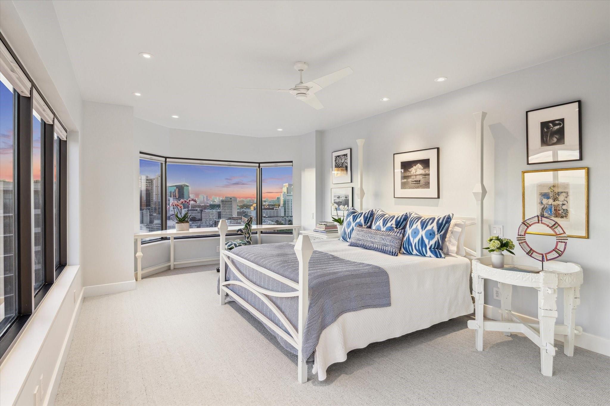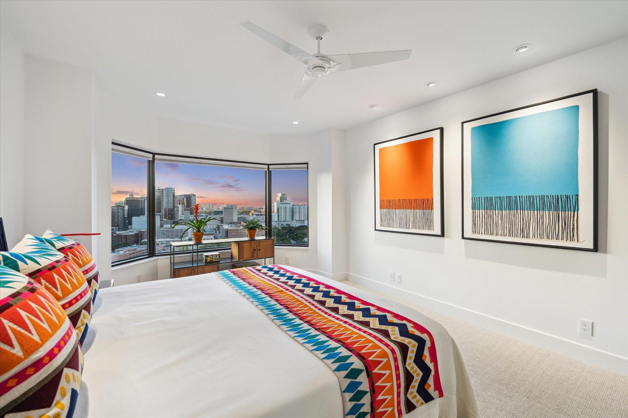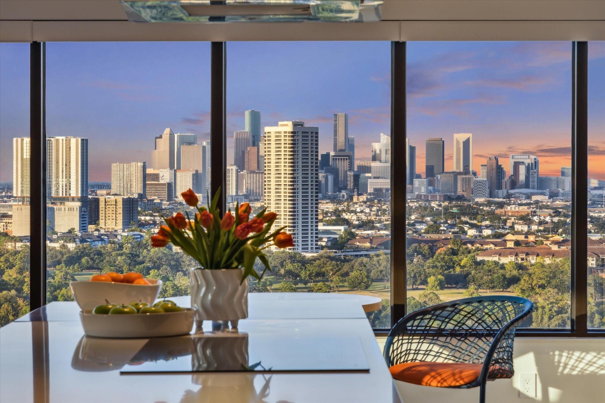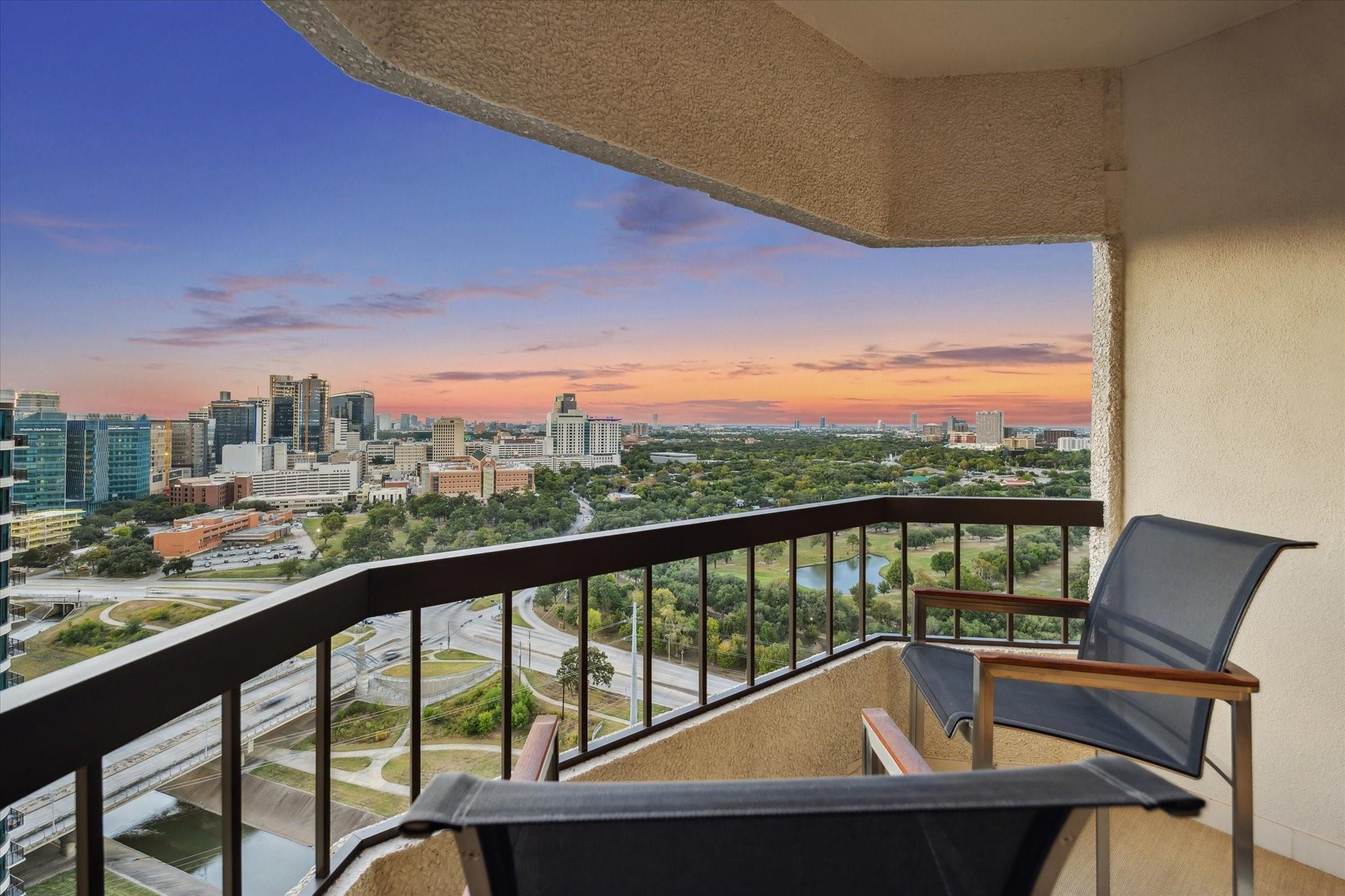Exceptional 24th floor fully renovated three bedroom, two bath residence with sweeping views of the Texas Medical Center, Hermann Park and the Downtown skyline. Inviting interiors offer clean lines, timeless finishes and smart space design. Magazine worthy renovation with all new surfaces and reimagined open concept living. Thoughtfully renovated with recessed art lighting, custom cabinetry, herringbone hardwoods, porcelain tile and plush wool carpeting. Sleek island kitchen with breakfast room. Covered private balcony. Full size stacked washer/dryer. Replaced HVAC systems and tankless water heater. Park-side full service high rise living with 24 hour guarded entry, concierge, valet, porter, fitness center with dry sauna, party rooms and indoor racquetball court. Private resident access to hike/bike trails connecting you to Hermann Park and the medical center. Convenient access to freeways and Downtown.
