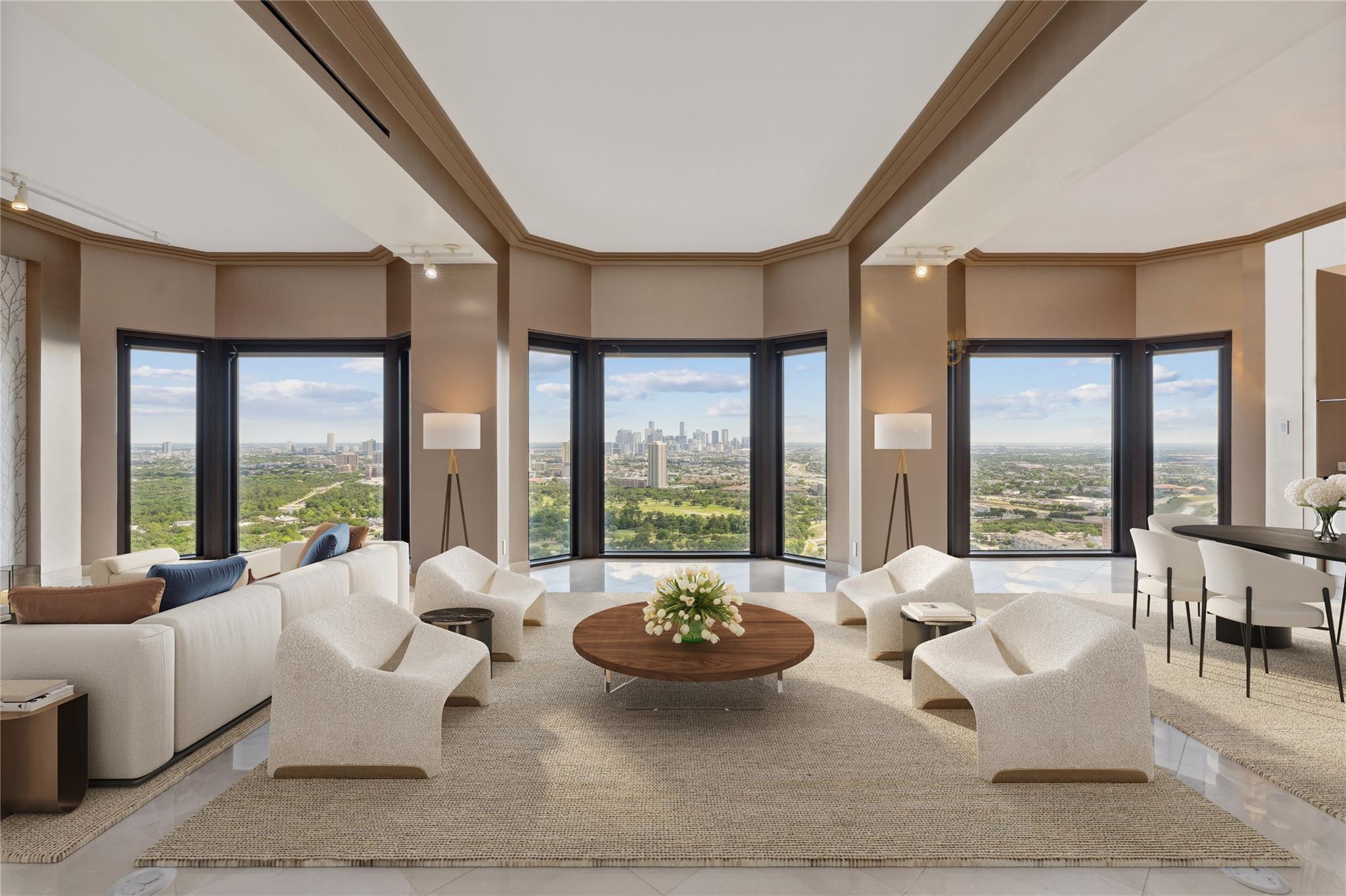 /monthTwo story penthouse on floors 39 and 40 overlooking Hermann Park with expansive views of the Houston skyline. High ceilings, open floor plan and generous room sizes. Island kitchen with breakfast room and walk-in wine storage. Formal dining room with glass display shelves, granite top serving areas with shelved cabinetry below offering great storage. Large living room with cozy library alcove with built-in shelving. Marble floors at living areas on floor 40, hardwoods at bedrooms on floor 39. Electric solar shades, designer and art lighting. Expansive primary suite with sitting room, walk-in closet, private balcony and luxurious bathroom. Walk-in laundry with full size stacked W/D. Park-side full service high rise living with 24 hour guarded entry, concierge, valet, porter, fitness center with dry sauna, party rooms and indoor racquetball court. Private resident access to hike/bike trails connecting you to Hermann Park and the medical center. Convenient access to freeways and Downtown.