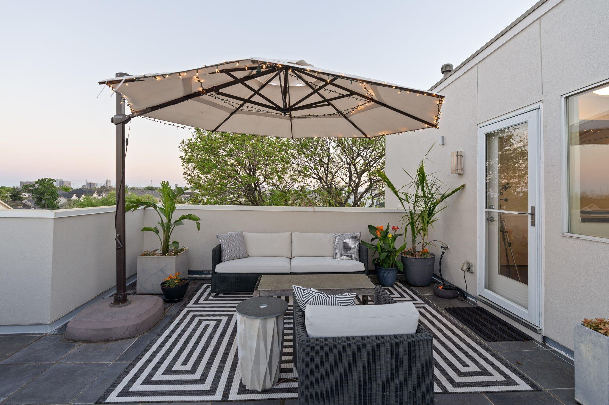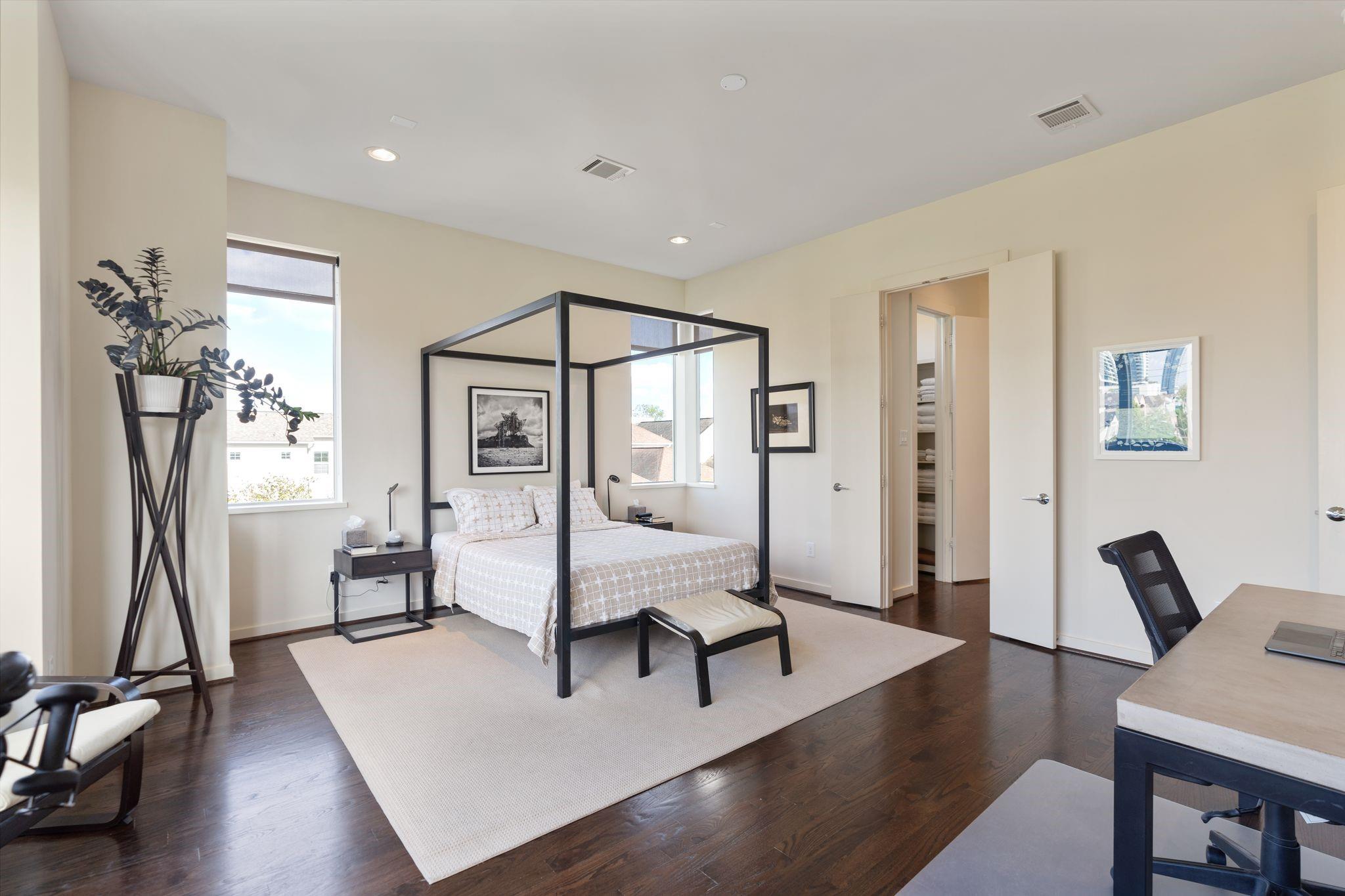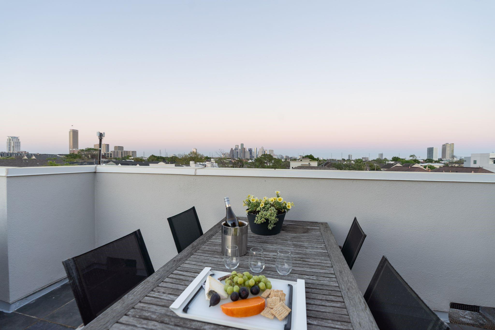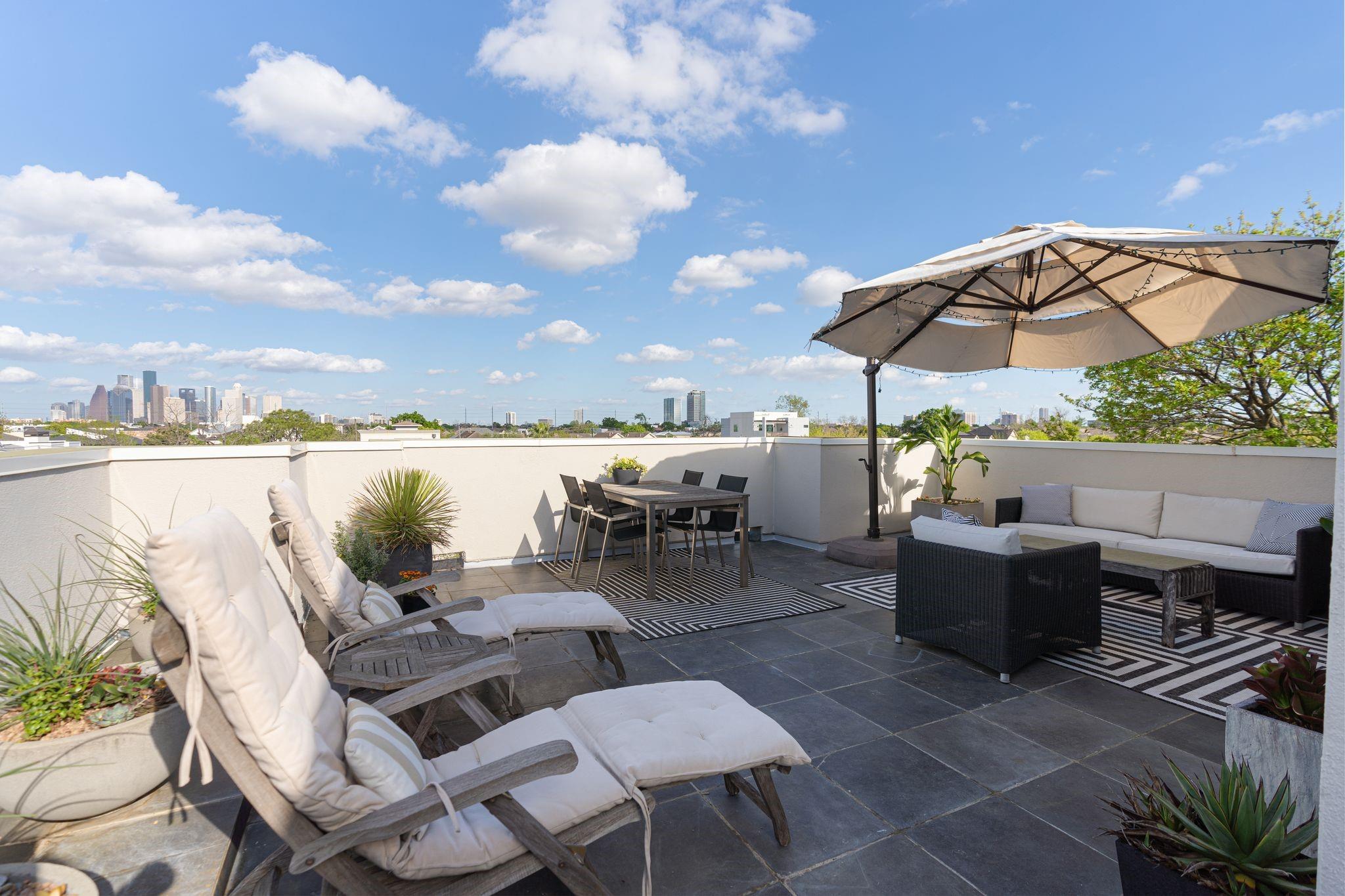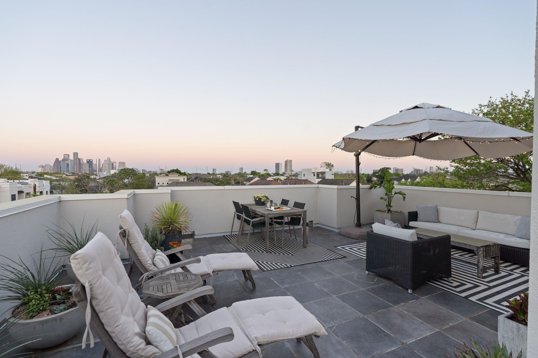 Chic contemporary townhouse offering breathtaking, unobstructed views of the Houston skyline from the 4th floor rooftop terrace. This light filled home features hardwood floors, high ceilings, elevator capability, a fenced side yard, and a 2 car garage with private driveway. The open concept kitchen boasts a large island with stone countertops and stainless appliances, flowing seamlessly into the dining and living areas—ideal for entertaining. The spacious primary suite includes three walk in closets and a spa like bath with dual sinks and stone surround tub and shower. Both secondary bedrooms offer en suite baths; the first floor suite provides excellent guest privacy or a perfect office. Large windows enhance every room with natural light. Enjoy walkability to River Oaks Shopping Center, top restaurants, and entertainment. Minutes from downtown, the Galleria, and premier schools.