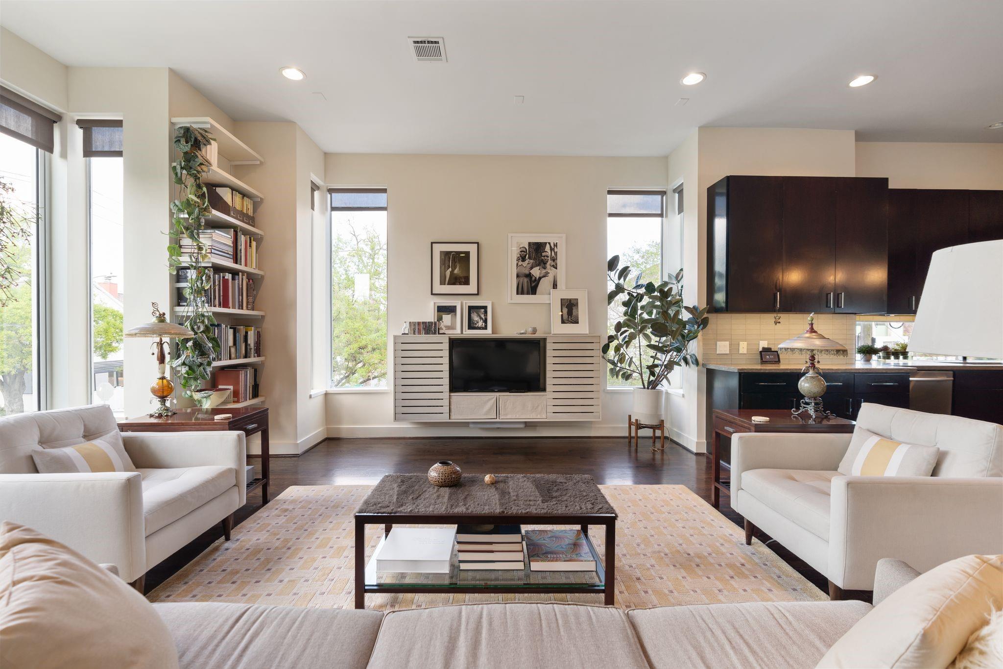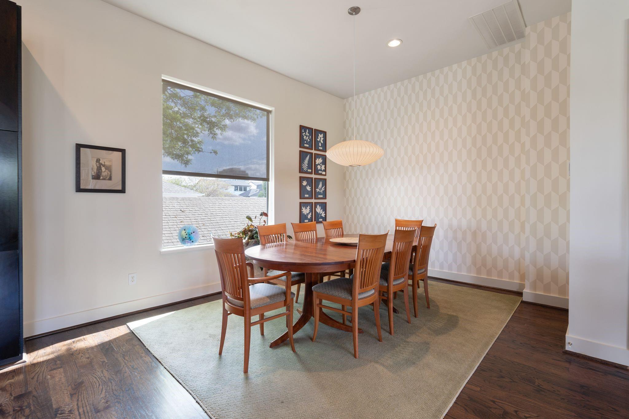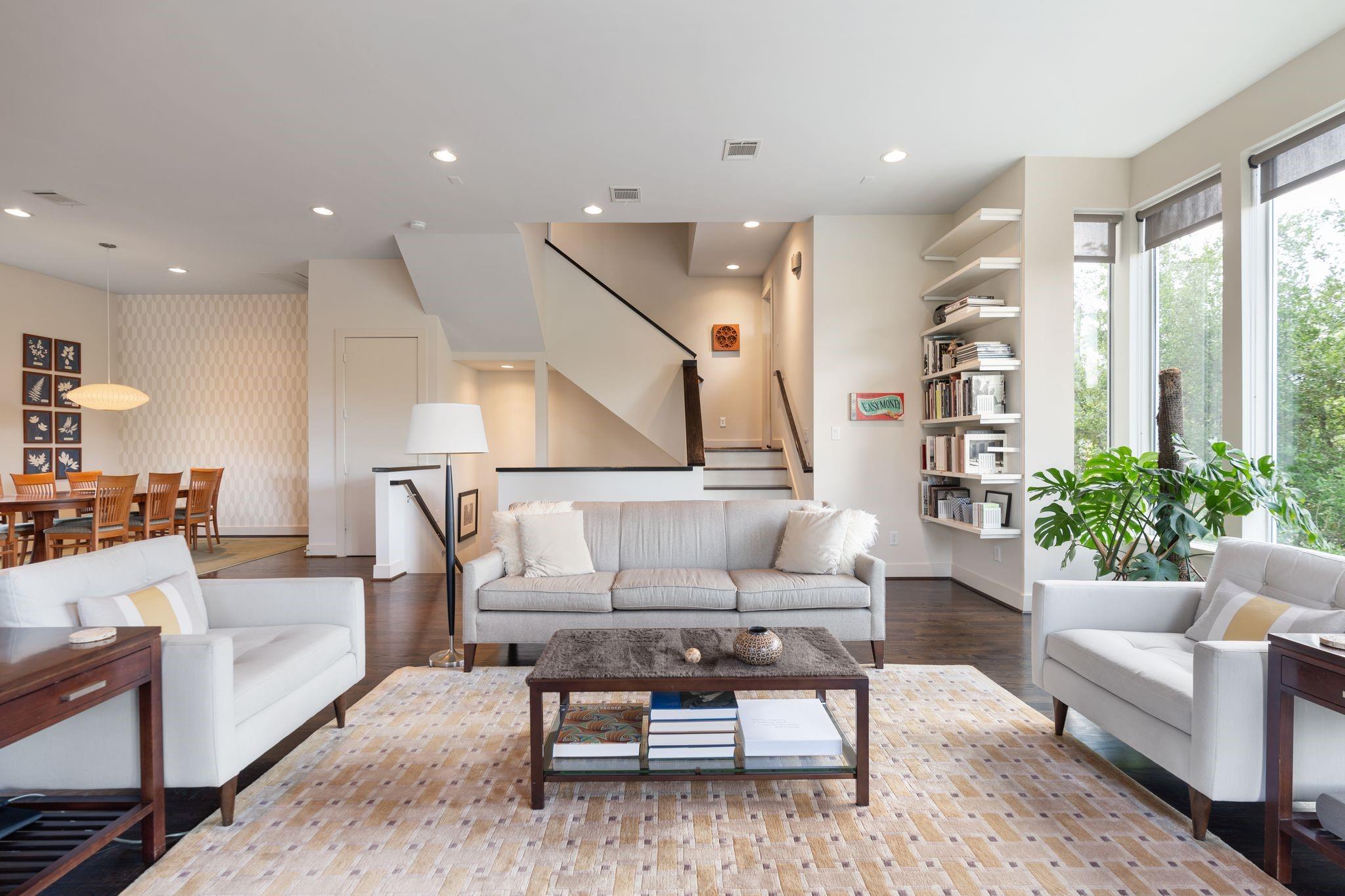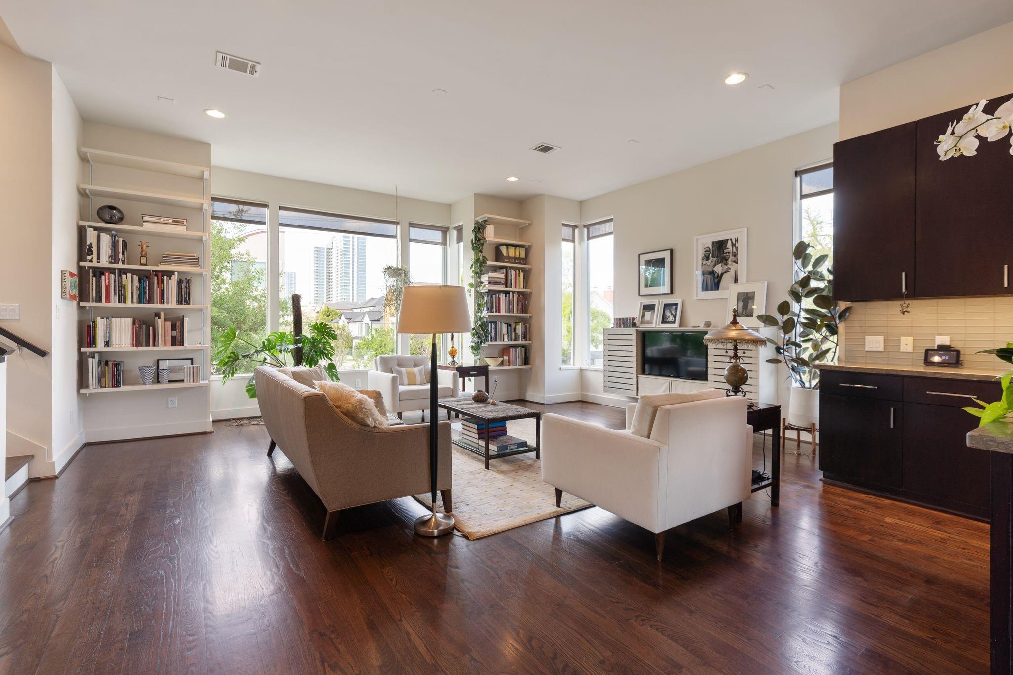 Chic contemporary townhouse offering breathtaking, unobstructed views of the Houston skyline from the 4th floor rooftop terrace. This light filled home features hardwood floors, high ceilings, elevator capability, a fenced side yard, and a 2 car garage with private driveway. The open concept kitchen boasts a large island with stone countertops and stainless appliances, flowing seamlessly into the dining and living areas—ideal for entertaining. The spacious primary suite includes three walk in closets and a spa like bath with dual sinks and stone surround tub and shower. Both secondary bedrooms offer en suite baths; the first floor suite provides excellent guest privacy or a perfect office. Large windows enhance every room with natural light. Enjoy walkability to River Oaks Shopping Center, top restaurants, and entertainment. Minutes from downtown, the Galleria, and premier schools.