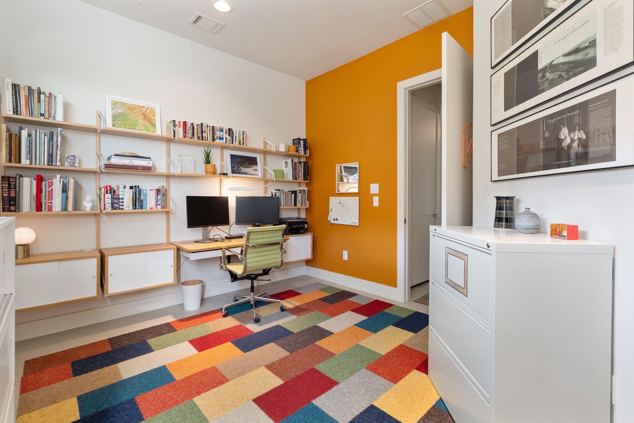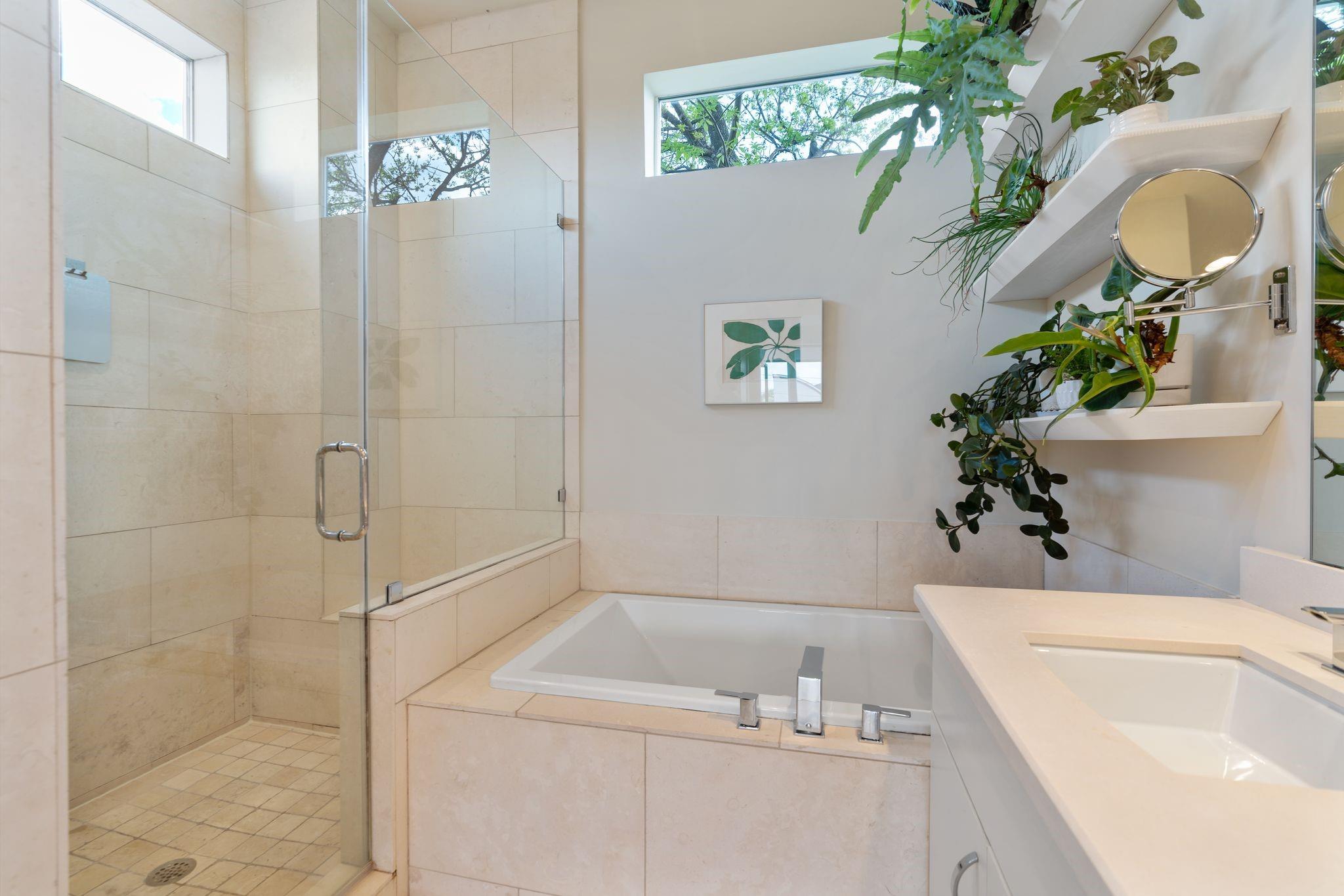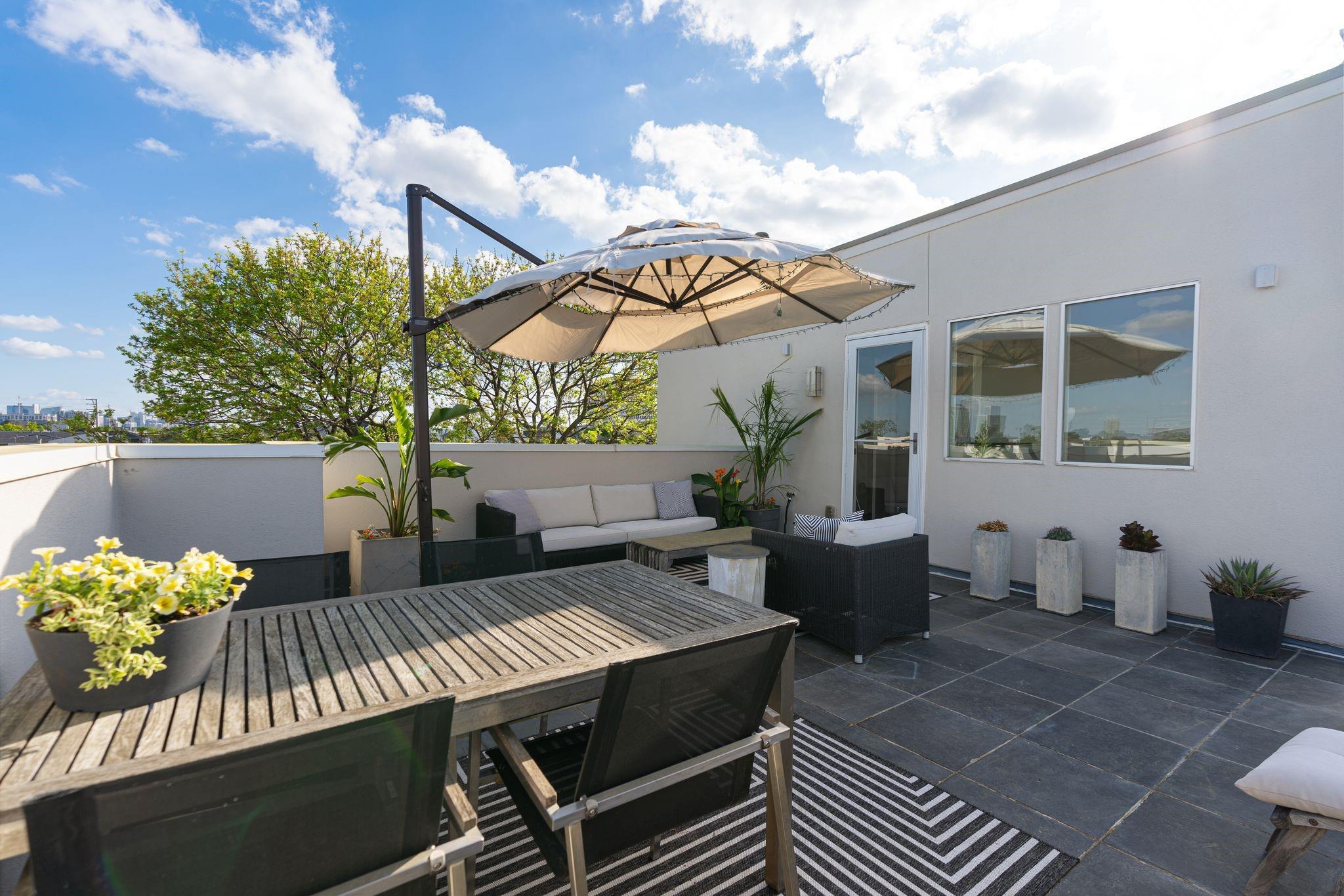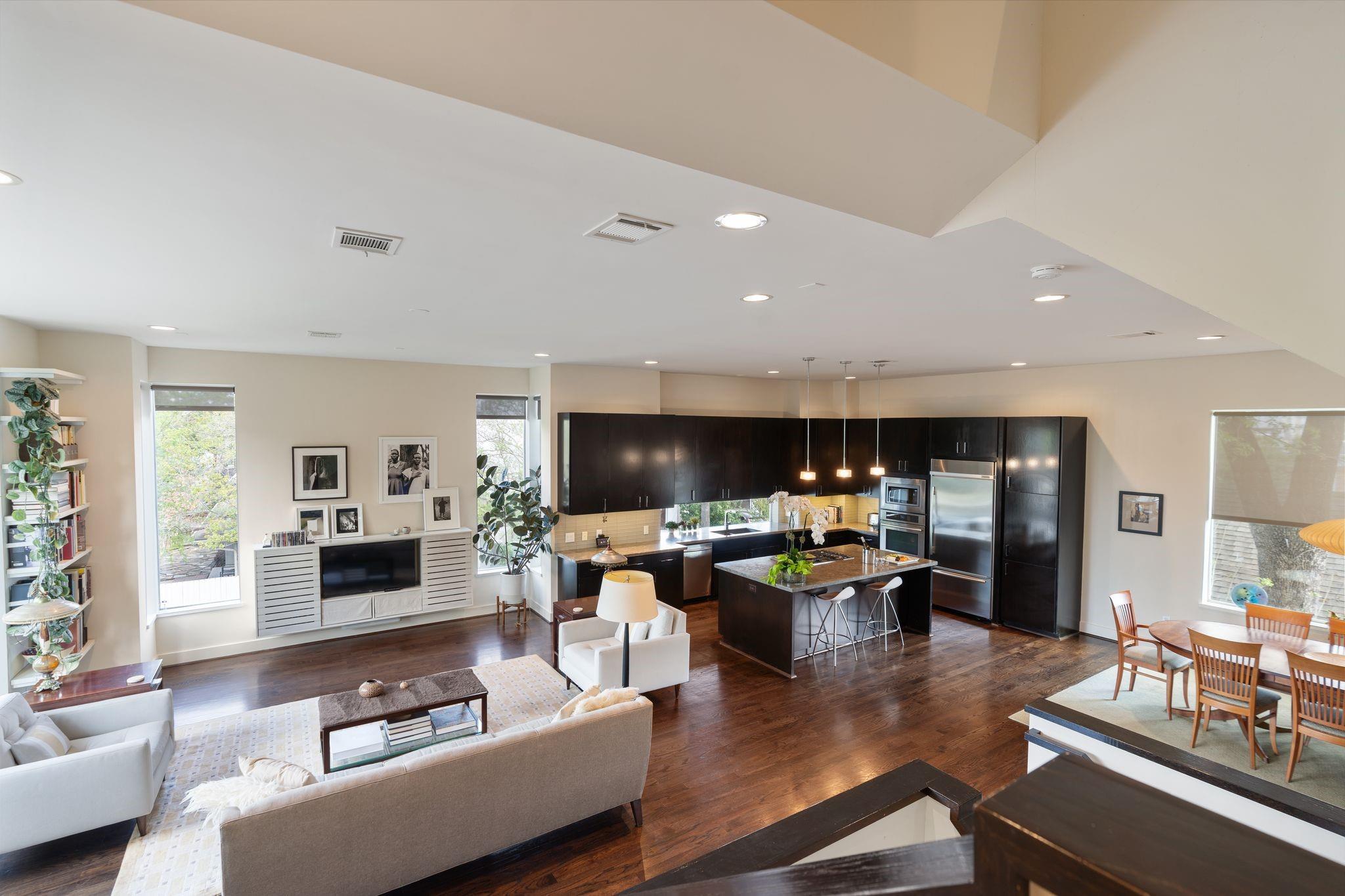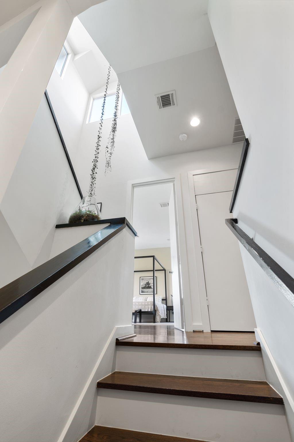 Chic contemporary townhouse offering breathtaking, unobstructed views of the Houston skyline from the 4th floor rooftop terrace. This light filled home features hardwood floors, high ceilings, elevator capability, a fenced side yard, and a 2 car garage with private driveway. The open concept kitchen boasts a large island with stone countertops and stainless appliances, flowing seamlessly into the dining and living areas—ideal for entertaining. The spacious primary suite includes three walk in closets and a spa like bath with dual sinks and stone surround tub and shower. Both secondary bedrooms offer en suite baths; the first floor suite provides excellent guest privacy or a perfect office. Large windows enhance every room with natural light. Enjoy walkability to River Oaks Shopping Center, top restaurants, and entertainment. Minutes from downtown, the Galleria, and premier schools.