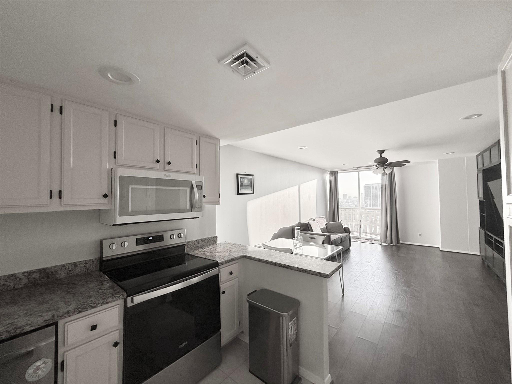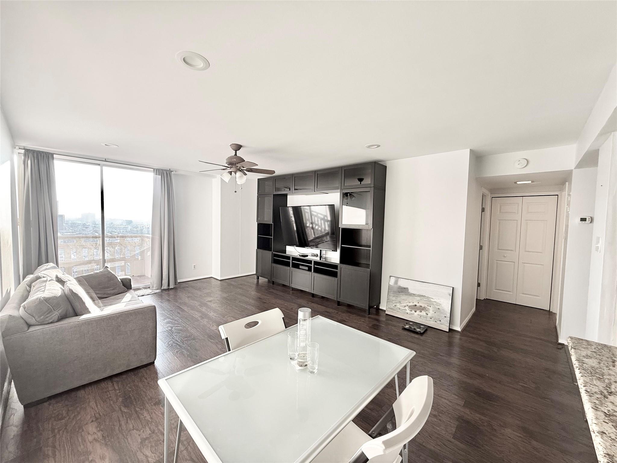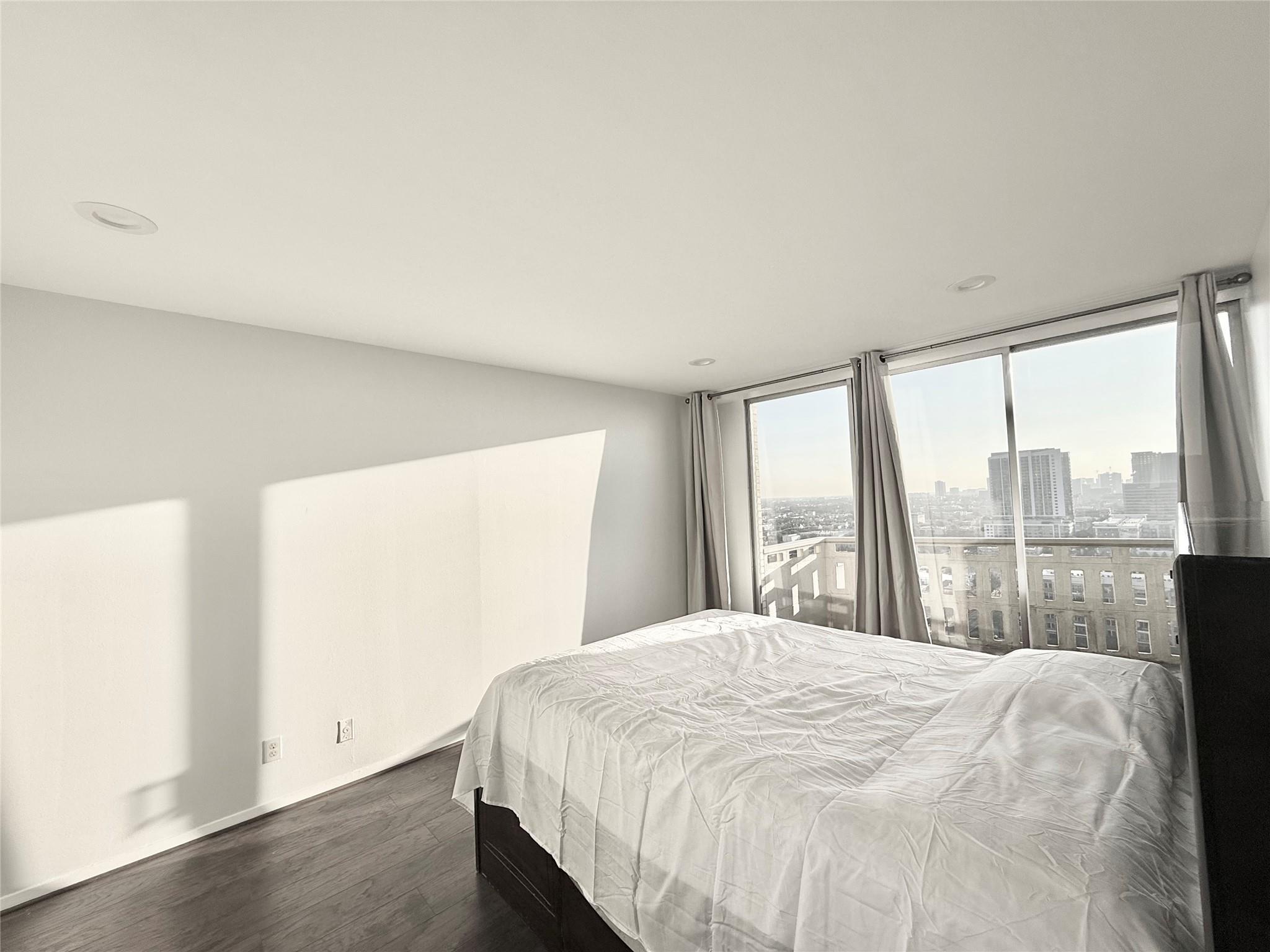 Limited 1x1 floor plan with a midtown/med center view. Open concept for the kitchen/living dining area, all in one W/D, sensational sunsets from 2 balconies, ample natural light, renovated and spacious bathroom. HOA FEE INCLUDES ALL BILLS: electricity, internet, cable, water, free pest control, trash (you need a router). COMMUNITY: 24/7/365 courtesy staff, limited access, resident lounge, free coffee bar, new pool, gym, 1 assgn parking space, grills, party rm, guest rm, package rm, Amazon Locker. Located on the Rail. Walking distance to: bayou running & cycling trails, midtown/downtown parks & dog parks, eateries, theaters, shopping, hotels, grocery stores and the 7 mile underground tunnel system. Instant access to I-45, I-10, and Hwy 59/288. Close to: Museums, TX Medical Center, UofH (Central and DT), TSU, Rice, St. Thomas, and S. TX. Law, Minute Maid Park, George R Brown and Shell Soccer Stadium. This floor plan is rare and ready for a new owner. Come see your new condo!!
