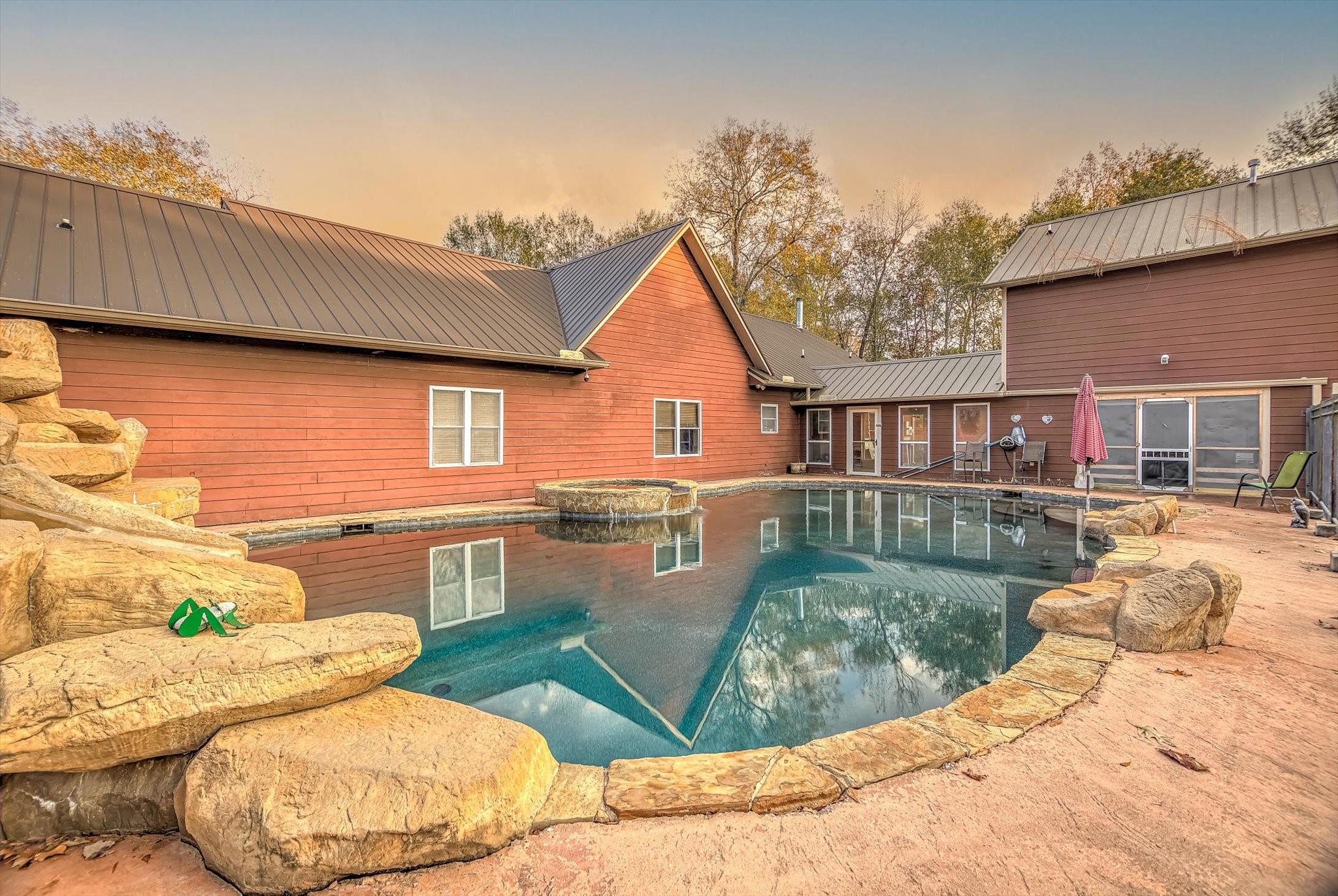 Nestled on 30.06 acres of shaded pasture, this stunning property has a 3,847 sq ft Quad-Lock ICF home with 5 bedrooms and 3.5 baths. The home features spacious rooms, two fireplaces, a durable metal roof, a concrete driveway, a pool, and a 2-bed, 1-bath garage apartment. The versatile barn/shop and fenced land are perfect for horses or cattle. With a modern construction, multiple living options, and vast open space, this property offers a unique blend for ranching or peaceful country living.