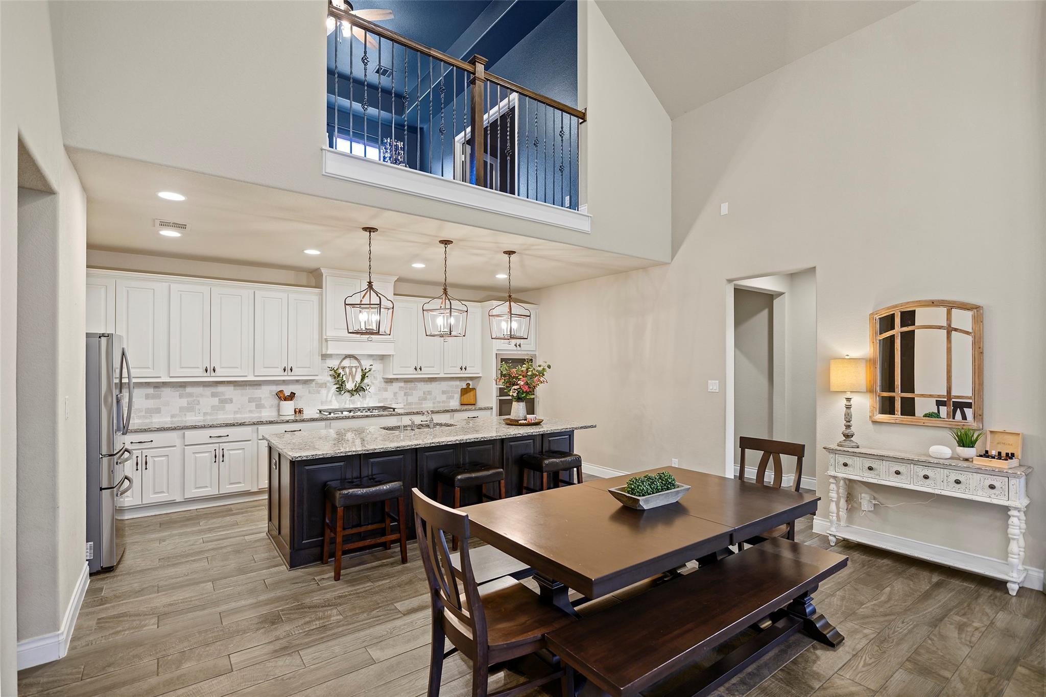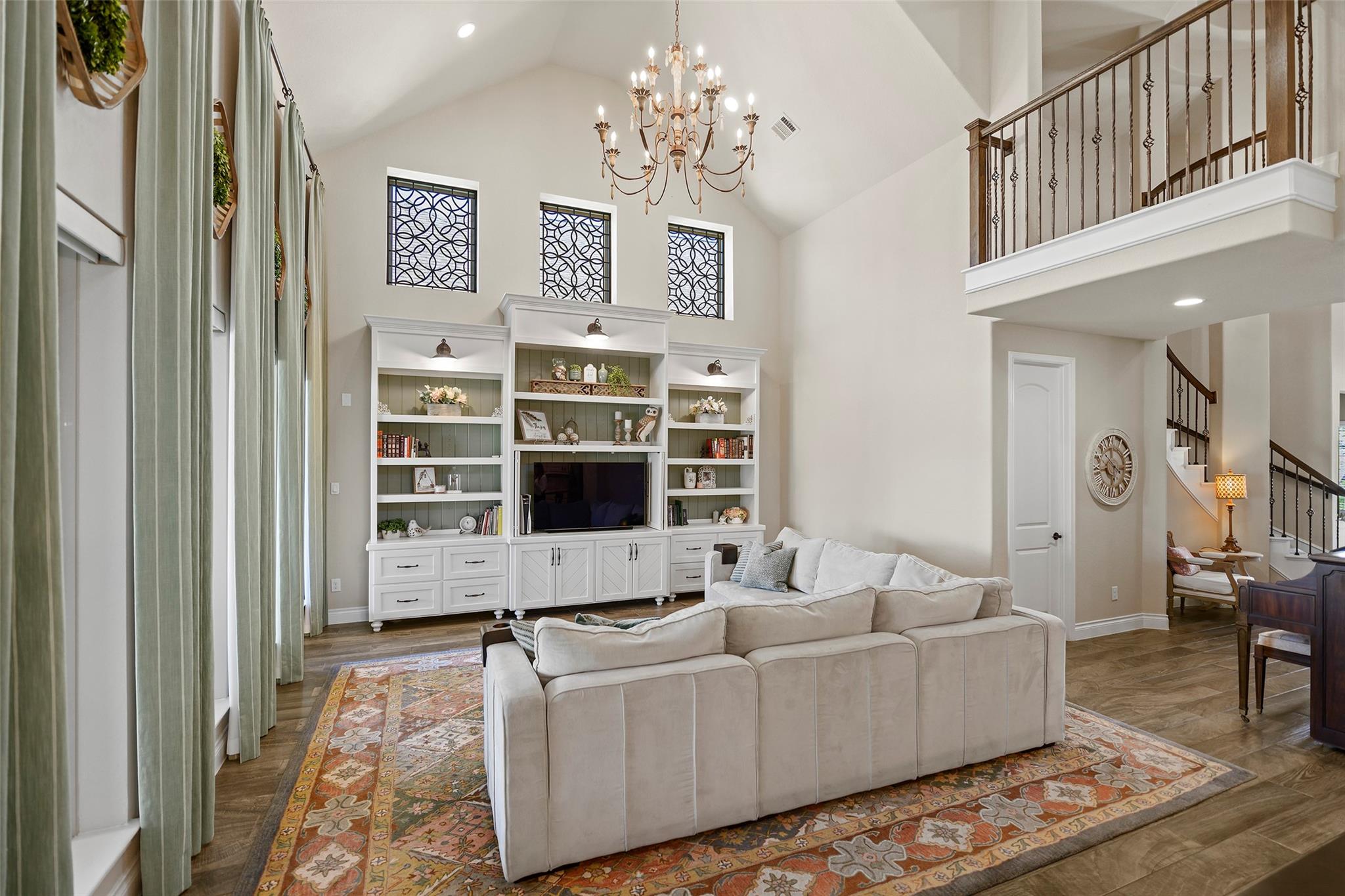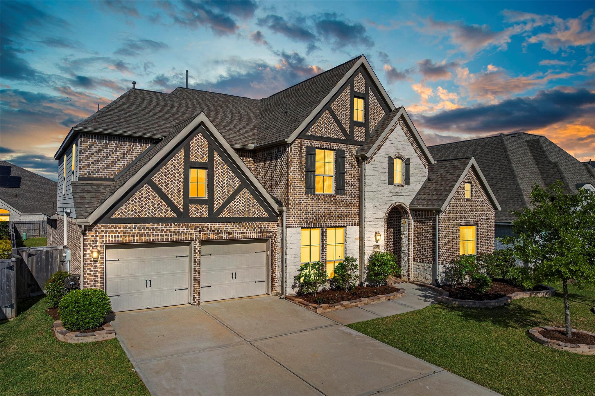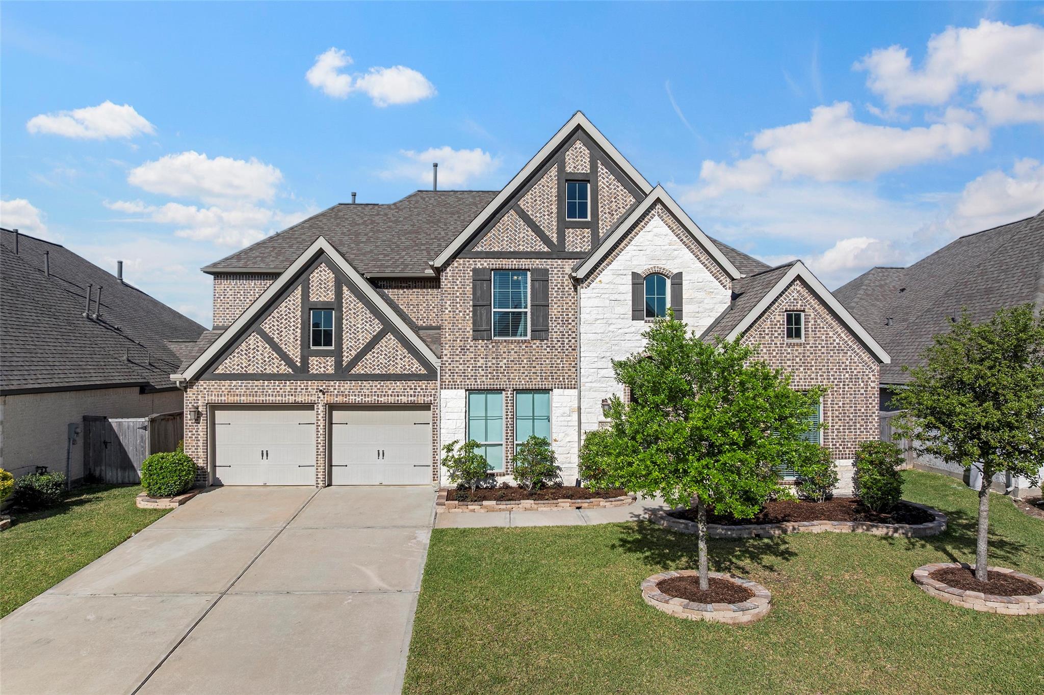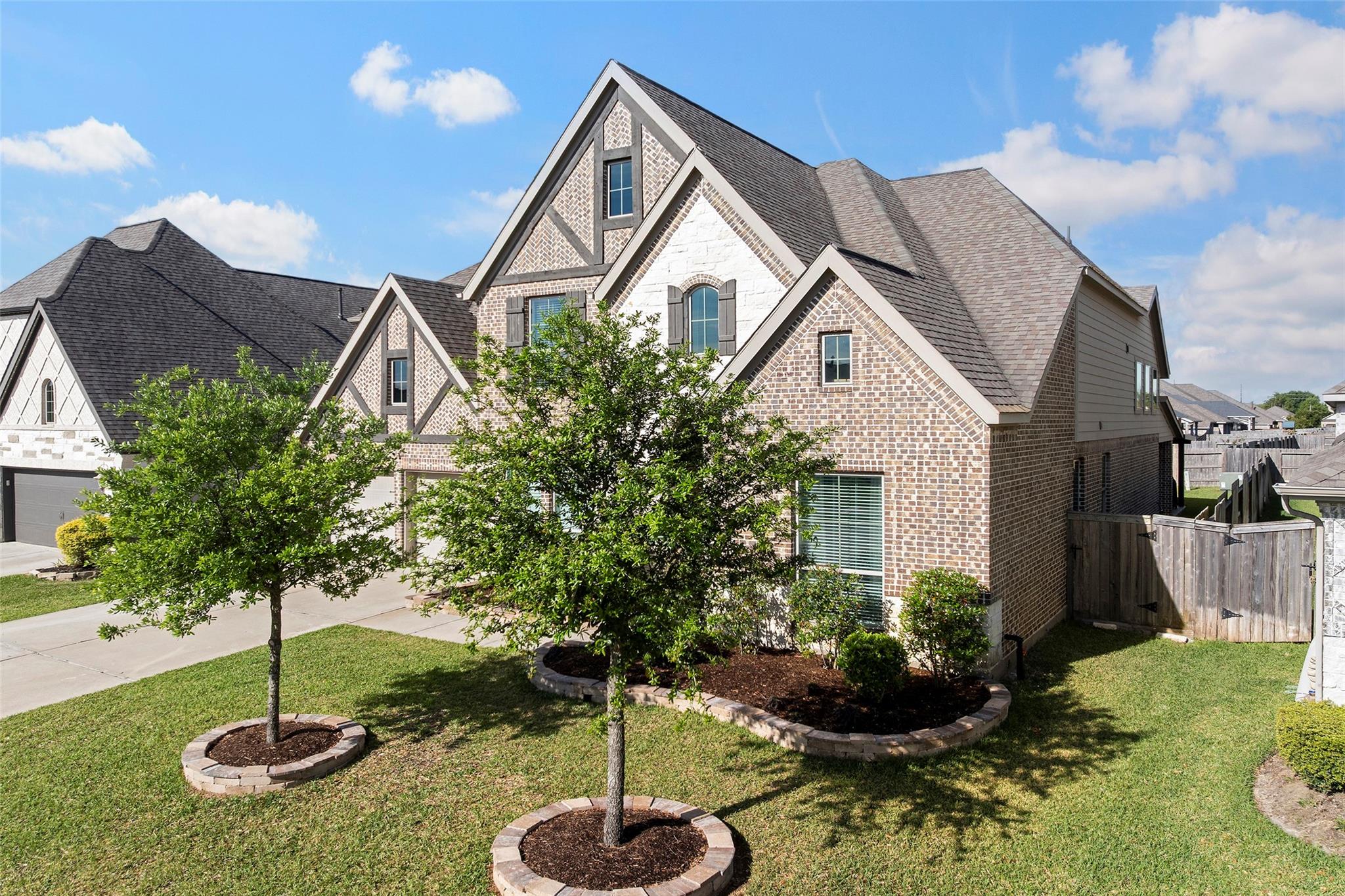 Step into a lifestyle of comfort and elegance in this stunning Amira home w/charming Tudor accents. From morning coffee or relaxing evenings on the expansive covered patio w/breezy fans & stamped concrete; every space is designed for living well. Inside, a winding staircase & private office flank the entry & gorgeous wood tile flooring flows throughout the main living areas! As natural light pours through a dramatic wall of windows w/tableaux faux iron accents, soaring ceilings, custom built-ins, & inviting casual dining space, perfect for gathering. Grand open kitchen is the heart of the home, featuring a large island, abundant storage, stainless appl including gas cooktop! Serene primary offers a peaceful retreat w/spa-like bath & dual walk-in closets, while a secondary bedroom downstairs provides flexibility for guests or multi-generational living. Upstairs boasts 3 spacious bedrooms, a game room & media room creating the perfect setting for fun, relaxation & everyday living!