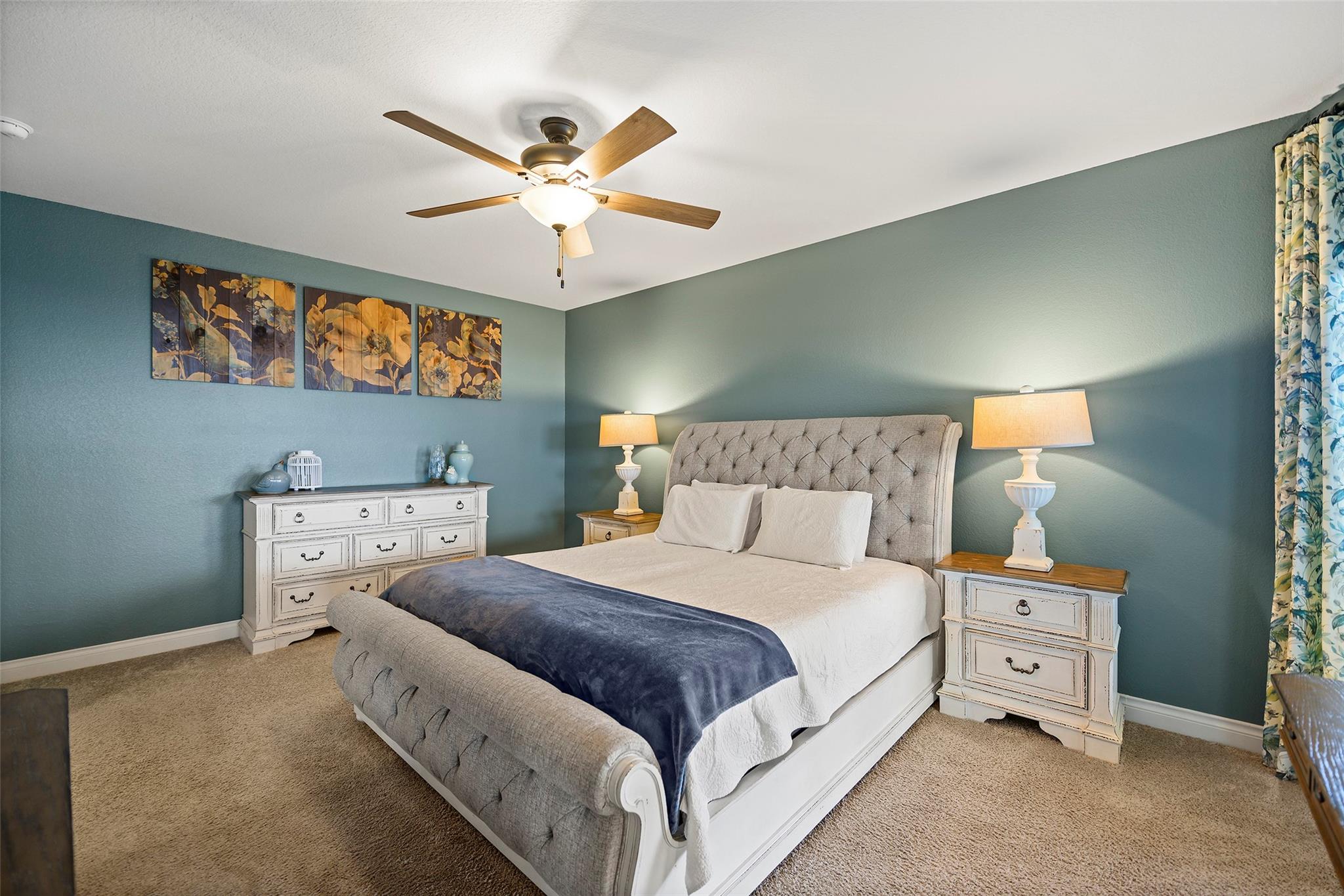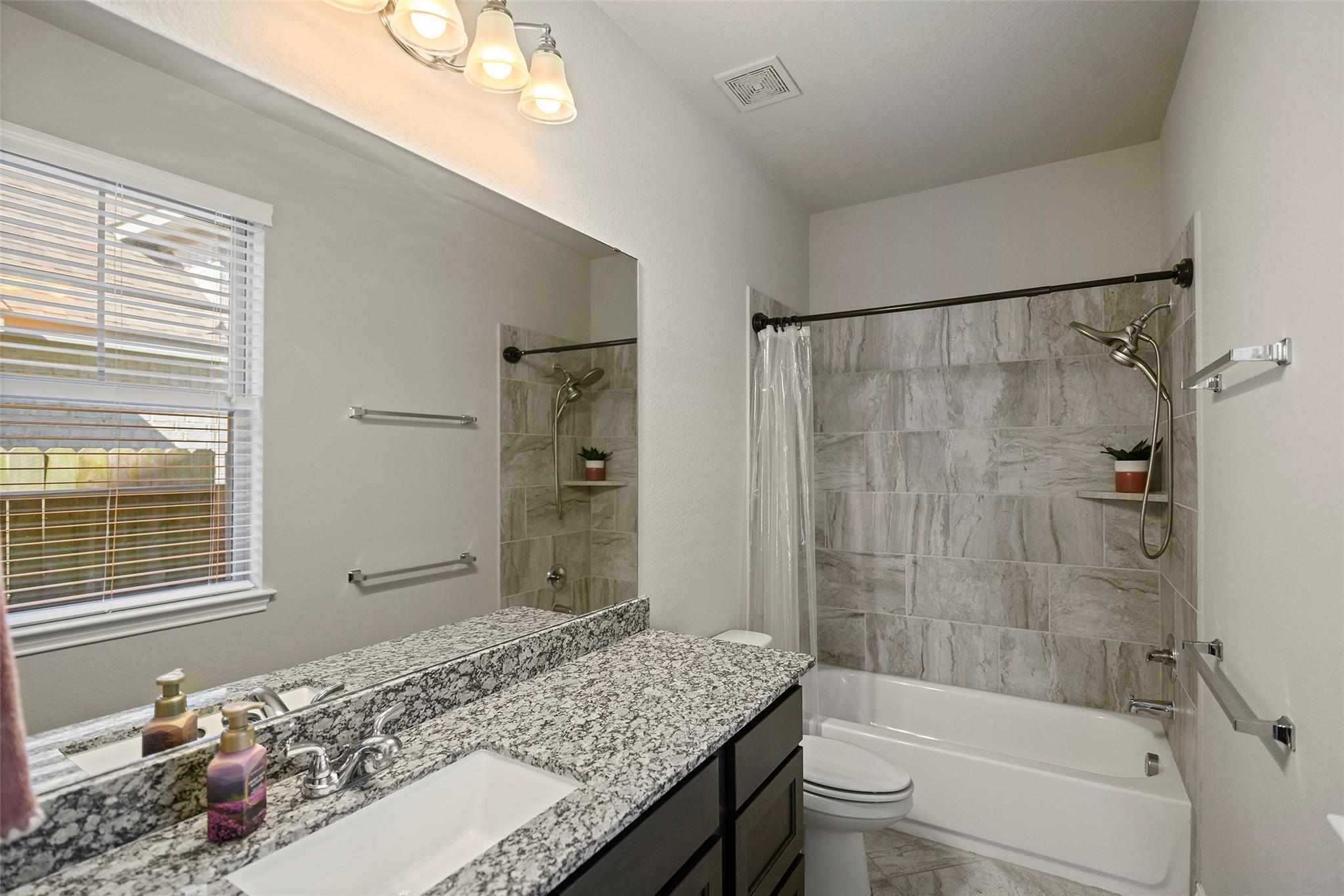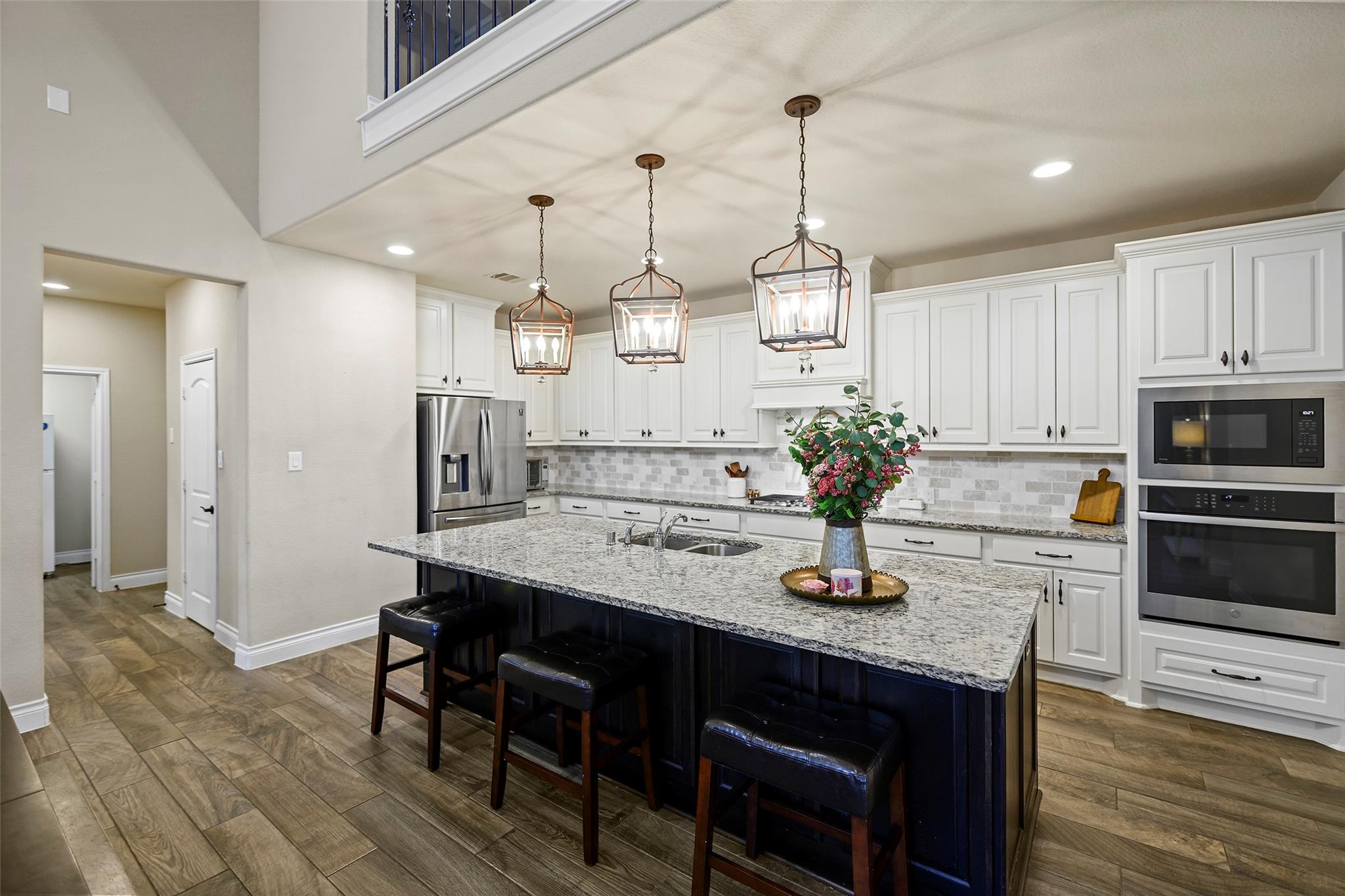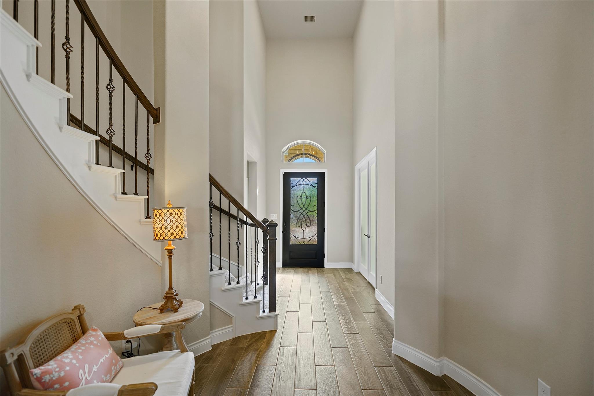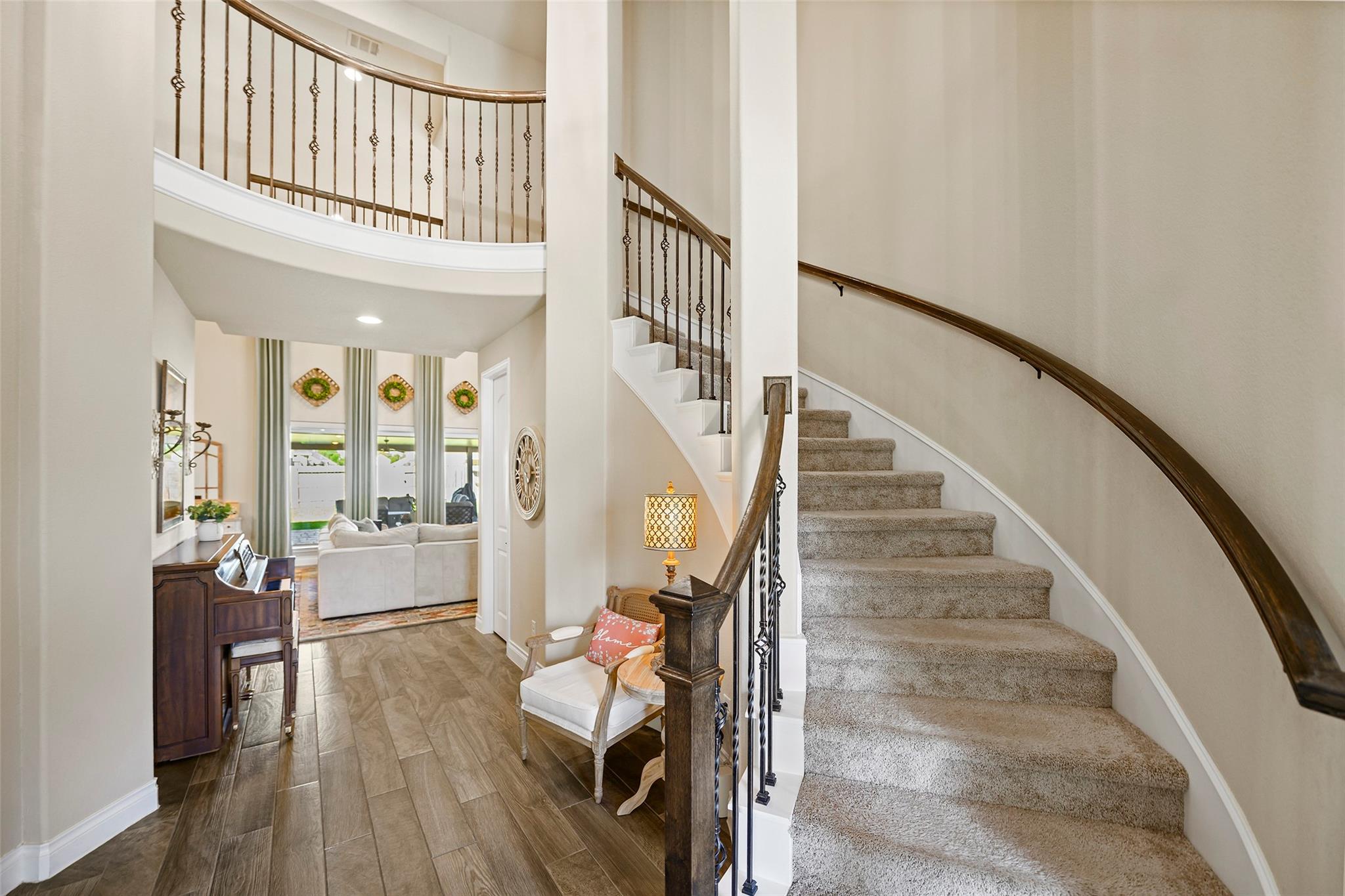 Step into a lifestyle of comfort and elegance in this stunning Amira home w/charming Tudor accents. From morning coffee or relaxing evenings on the expansive covered patio w/breezy fans & stamped concrete; every space is designed for living well. Inside, a winding staircase & private office flank the entry & gorgeous wood tile flooring flows throughout the main living areas! As natural light pours through a dramatic wall of windows w/tableaux faux iron accents, soaring ceilings, custom built-ins, & inviting casual dining space, perfect for gathering. Grand open kitchen is the heart of the home, featuring a large island, abundant storage, stainless appl including gas cooktop! Serene primary offers a peaceful retreat w/spa-like bath & dual walk-in closets, while a secondary bedroom downstairs provides flexibility for guests or multi-generational living. Upstairs boasts 3 spacious bedrooms, a game room & media room creating the perfect setting for fun, relaxation & everyday living!