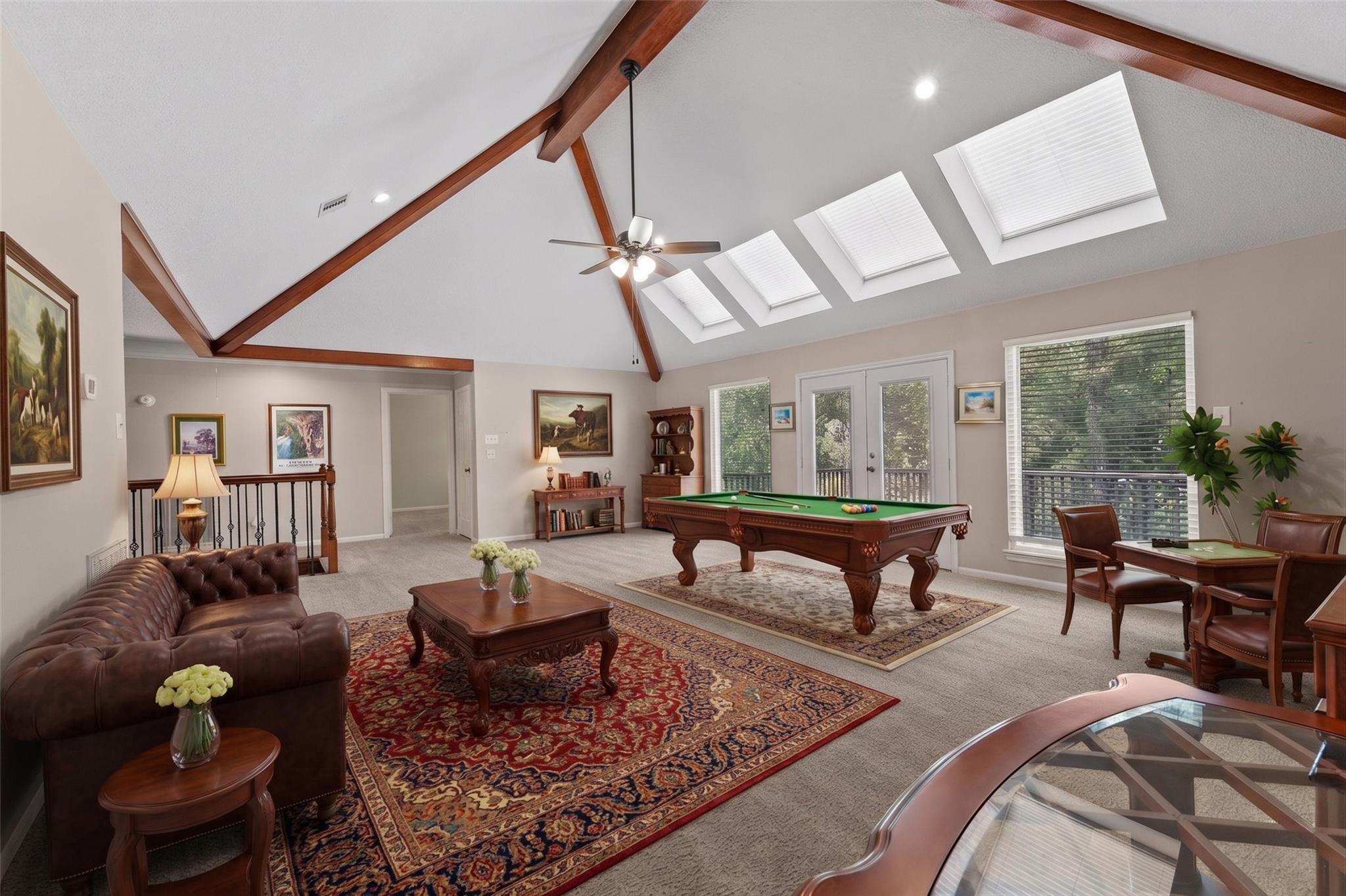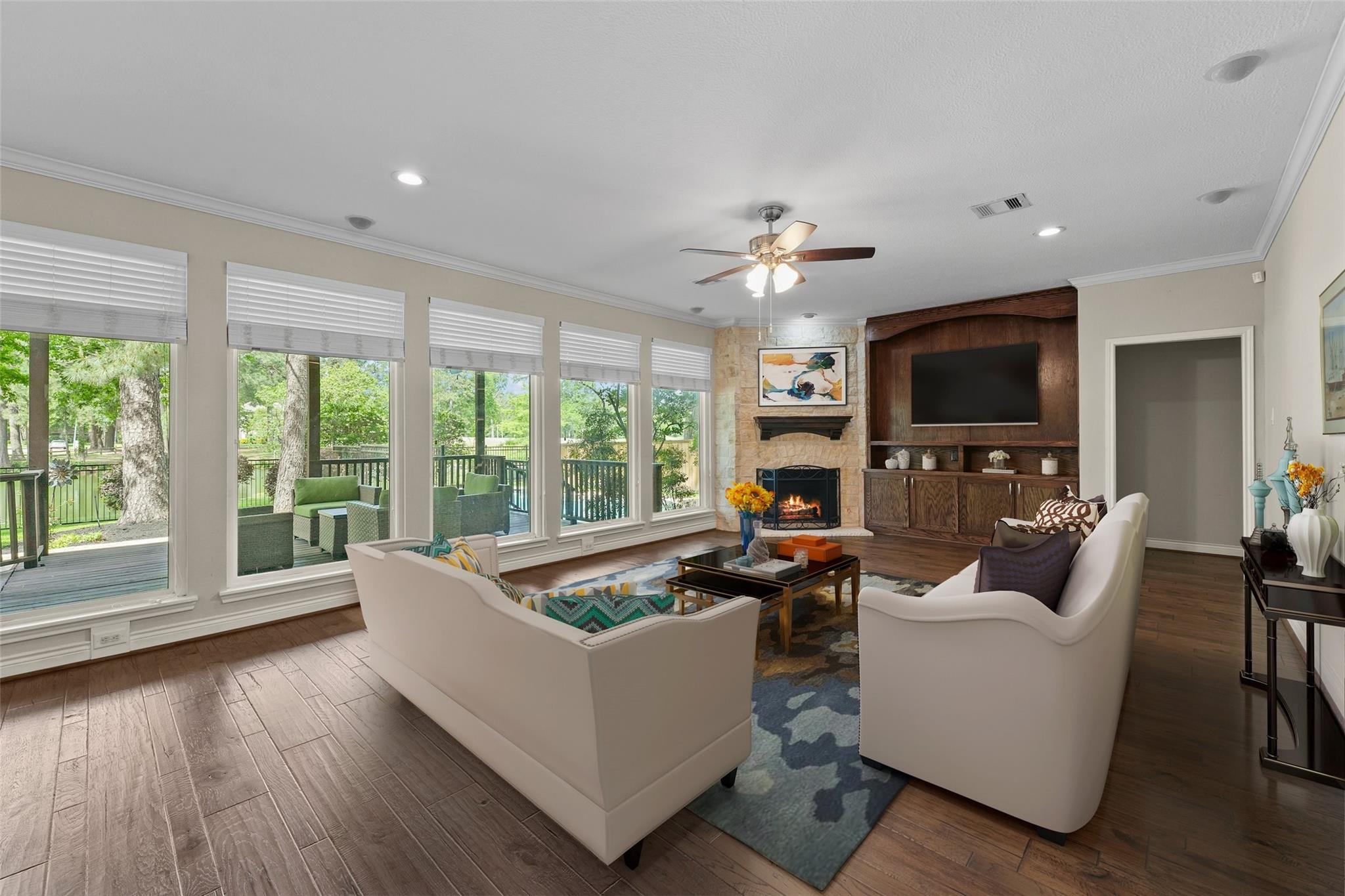 Experience comfortable living in this beautifully updated Kingwood home, ideally situated on a corner lot with stunning views of the Deerwood golf course. Designed with a spacious layout and abundant natural light, this 5-bedroom home offers a study, formal dining room, and a welcoming den with fireplace and a wall of windows overlooking the backyard outdoor living space. The large backyard features a pool, covered patio, and plenty of room to relax or entertain, while a private balcony provides elevated golf course views. Inside, enjoy hardwood floors through most of the first floor, an updated primary bath, and energy-efficient double-pane windows. A versatile second floor gameroom adds flexibility to fit your lifestyle. A wonderful opportunity to enjoy Kingwood living with space, comfort, and scenic surroundings.