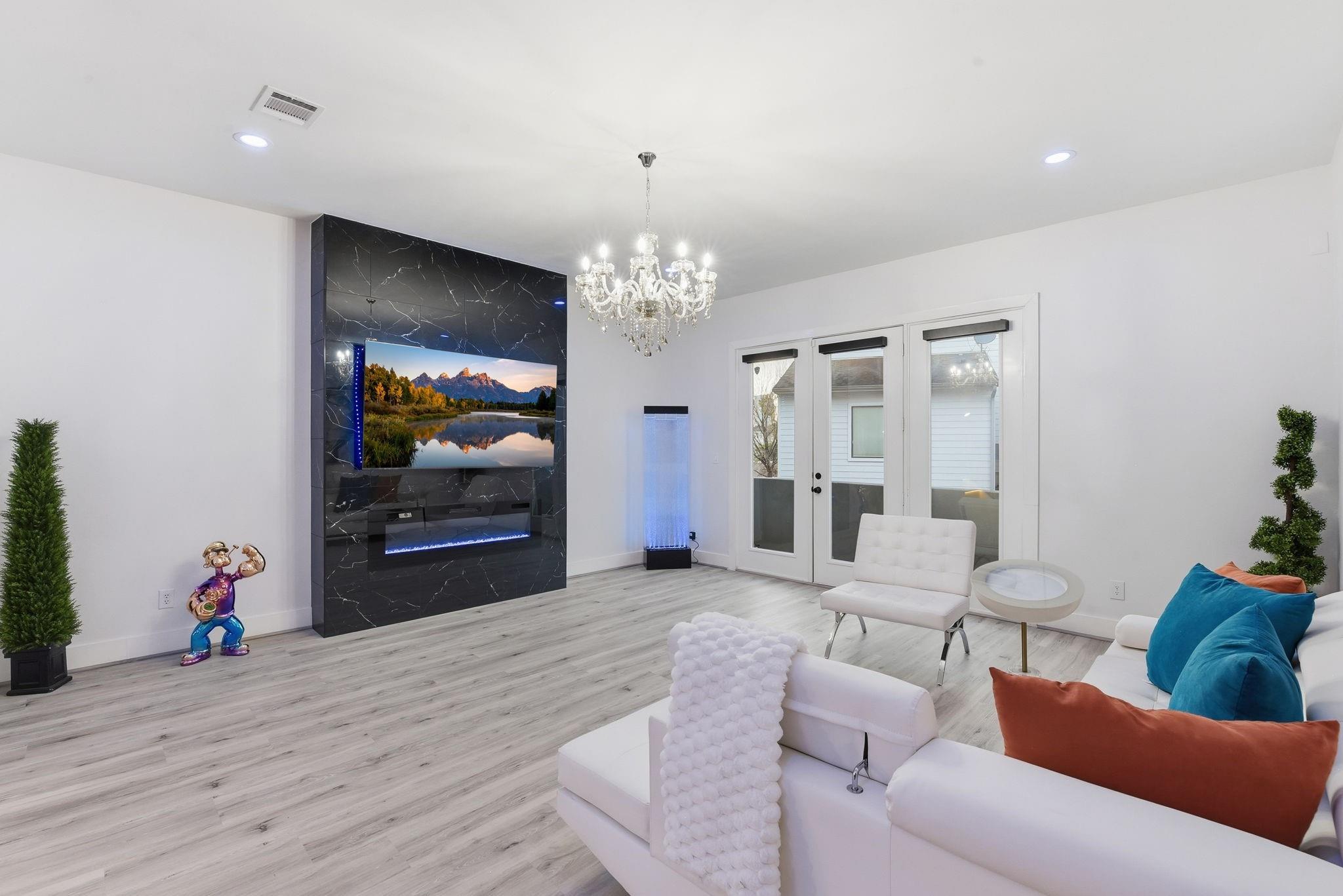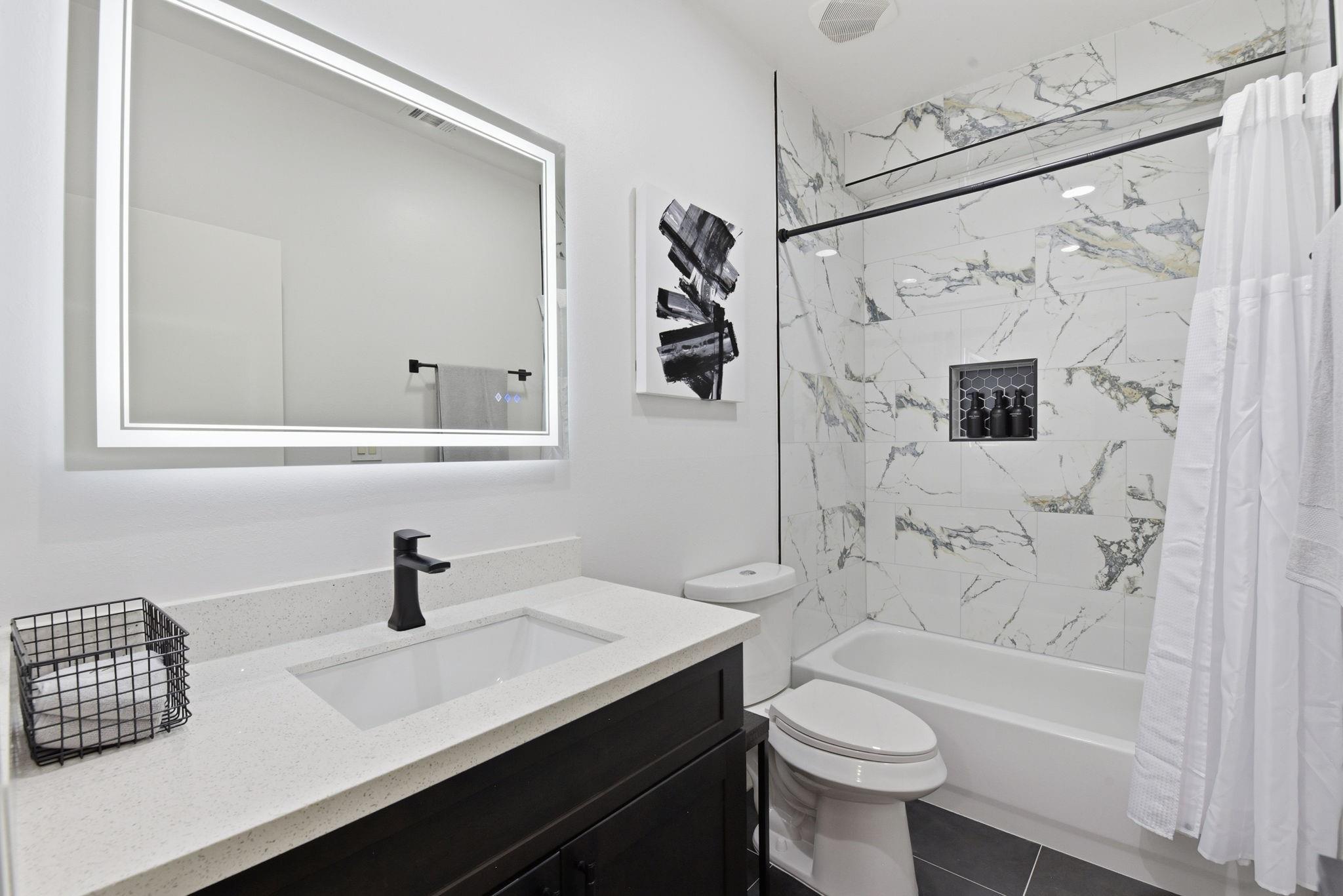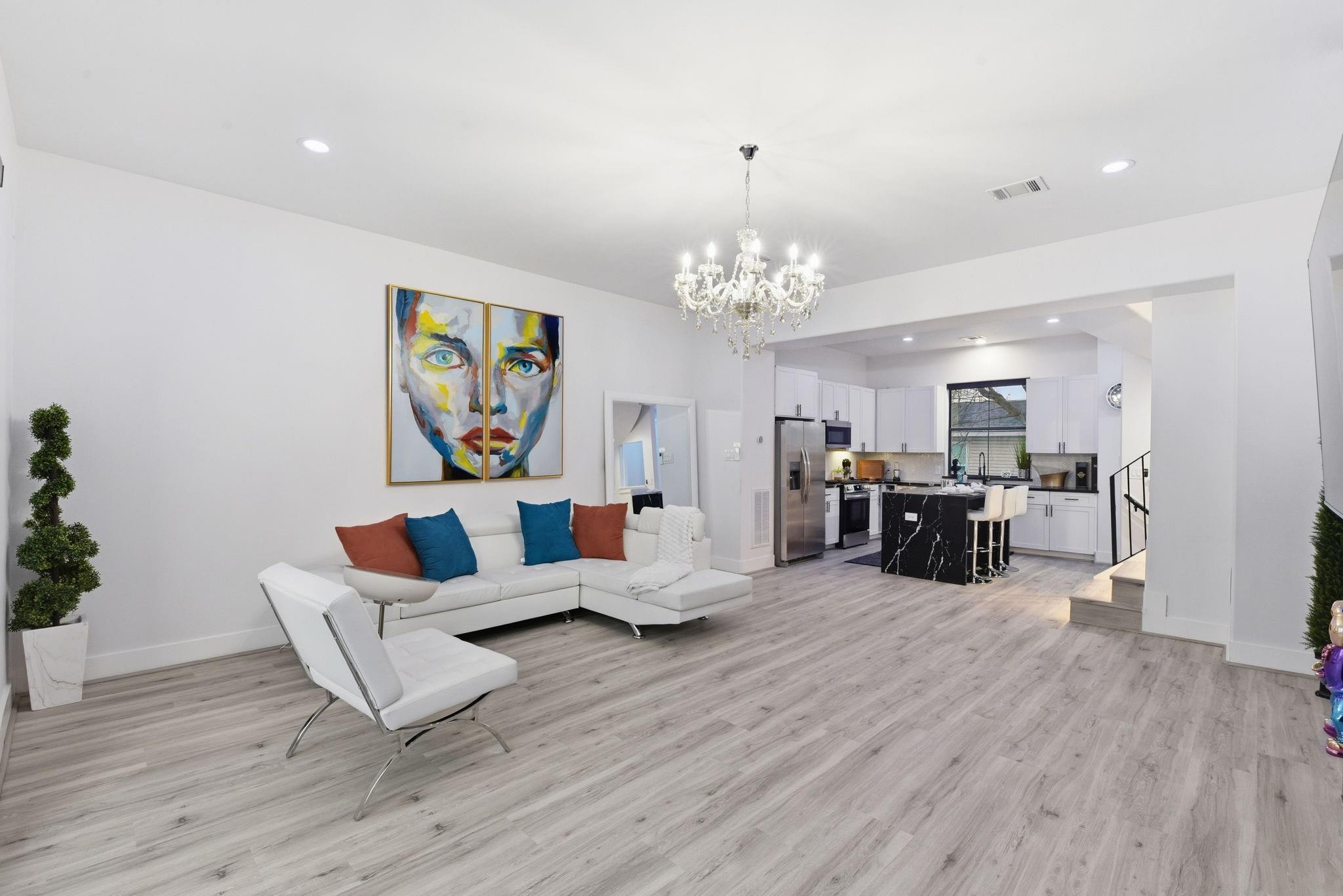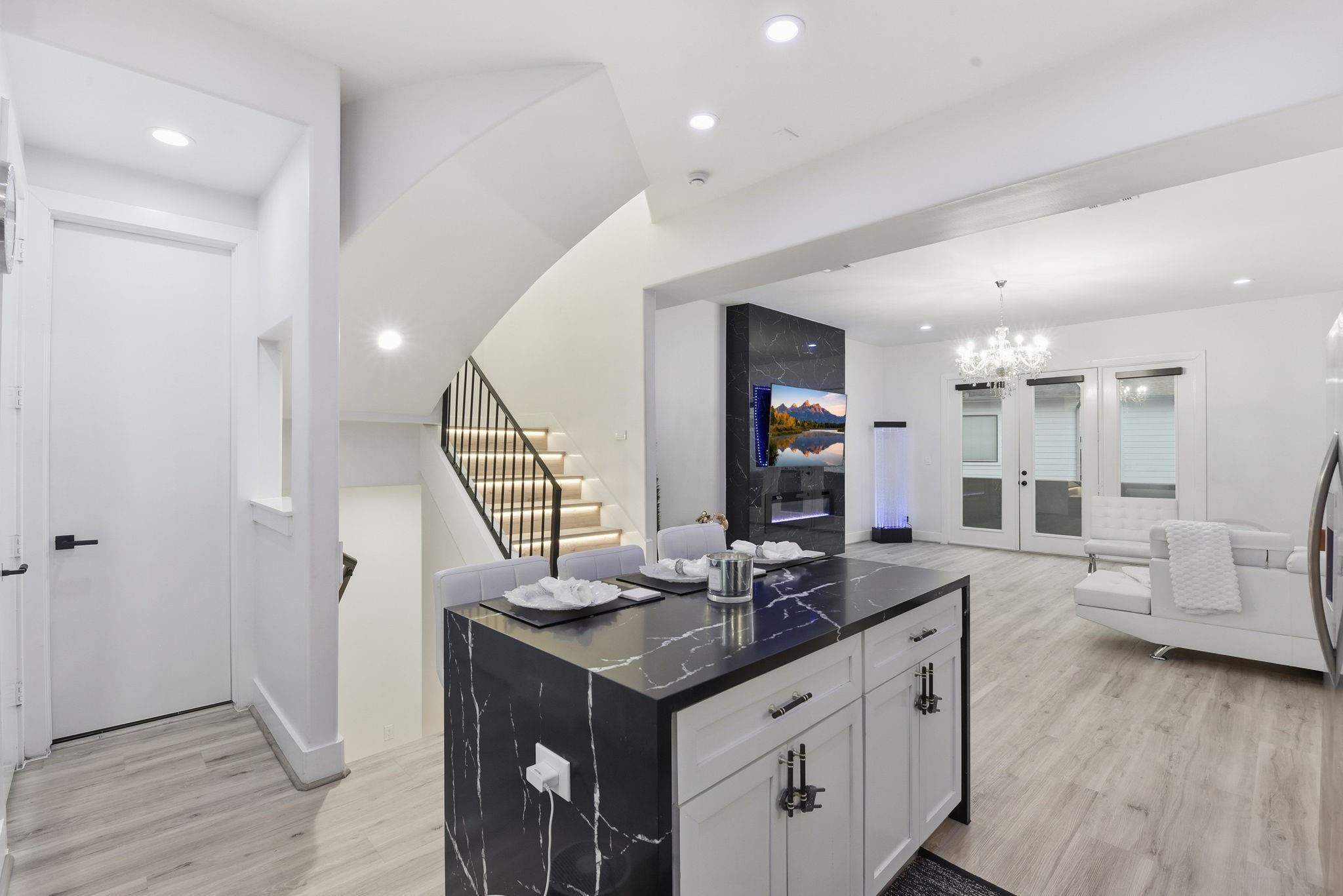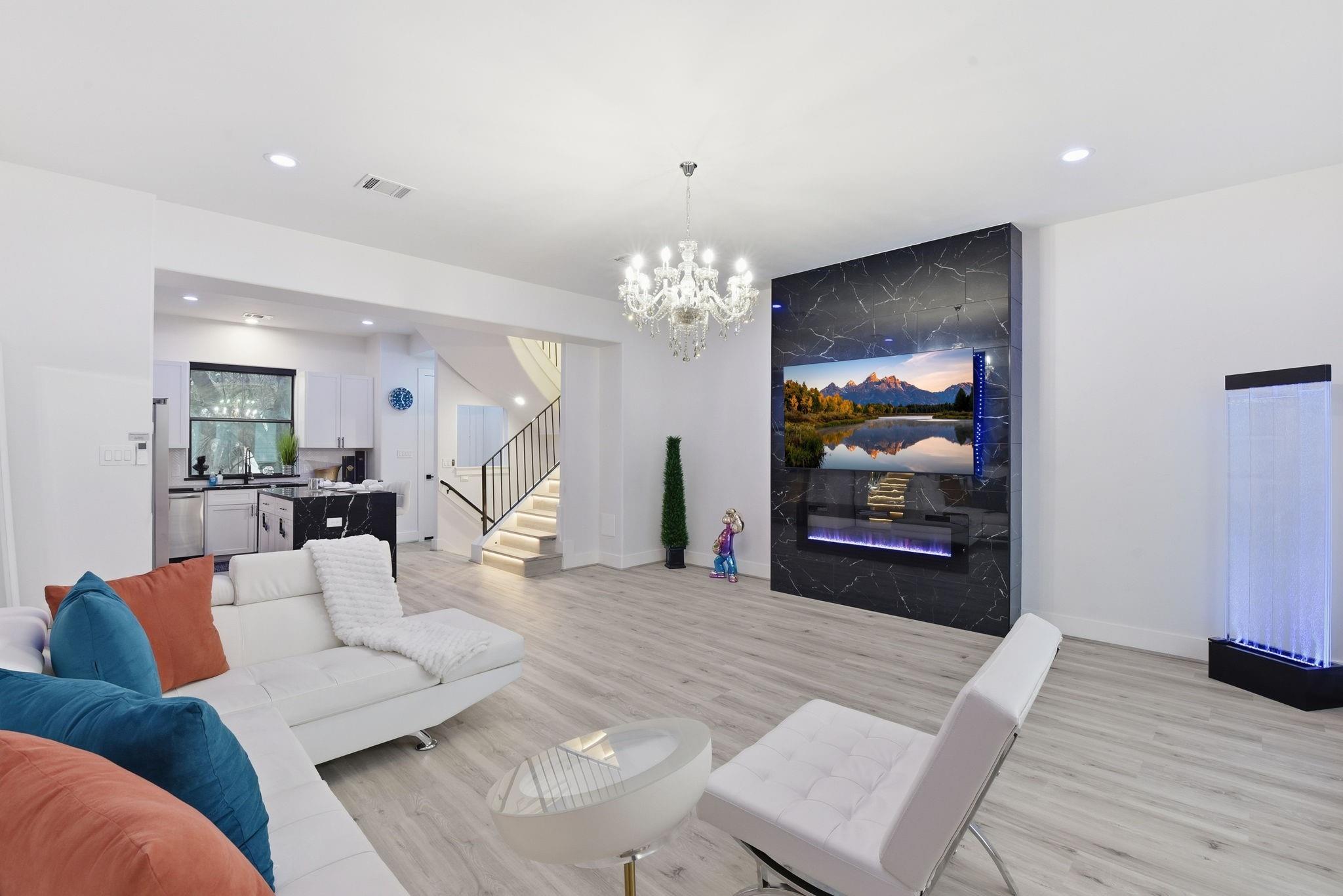 Modern 3-bedroom, 3.5-bath townhome located in the heart of Midtown Houston. This recently updated home offers an open-concept layout with soaring ceilings, LVP flooring, a statement fireplace wall, and thoughtfully selected designer lighting throughout. The kitchen is both functional and striking, featuring a waterfall-edge island, quartz countertops, stainless steel appliances, and sleek black finishes. The primary suite is complemented by a spa-like bath with dual vanities, backlit mirrors, a soaking tub, and a frameless glass shower wrapped in floor-to-ceiling marble-style tile.All bedrooms include en-suite baths, creating a comfortable and private layout. A clean, modern space in a prime location — ready for its next owner. Don’t miss the opportunity to own this beautifully designed Midtown home.
