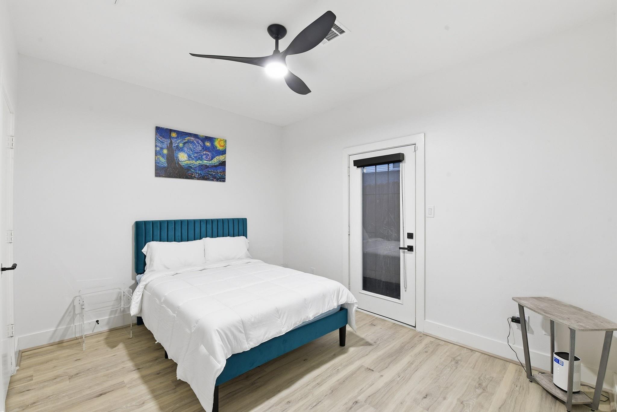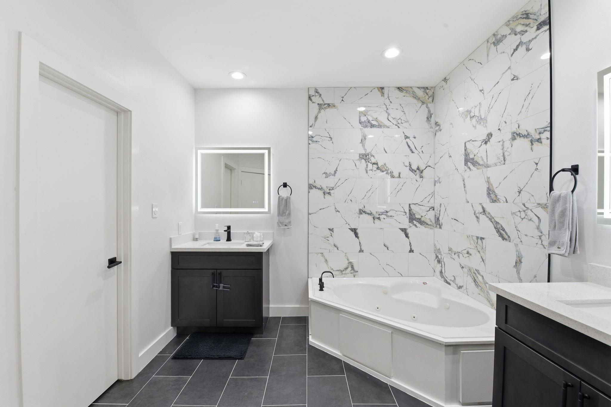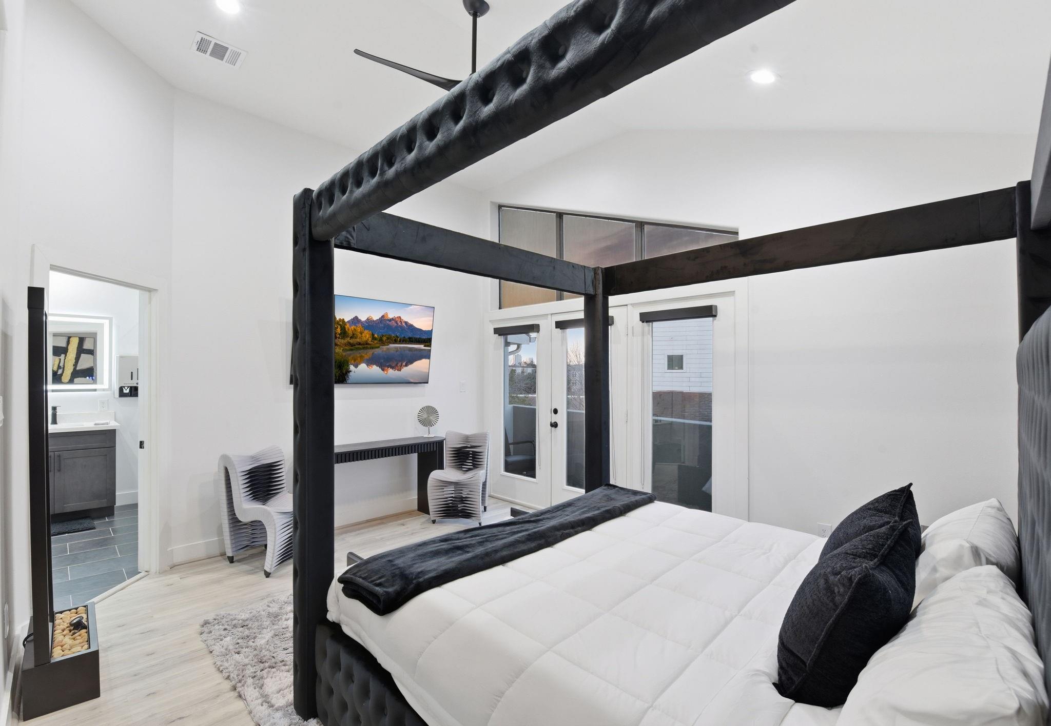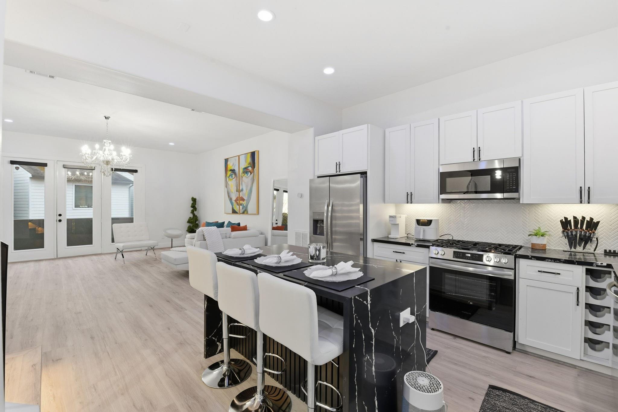 Modern 3-bedroom, 3.5-bath townhome located in the heart of Midtown Houston. This recently updated home offers an open-concept layout with soaring ceilings, LVP flooring, a statement fireplace wall, and thoughtfully selected designer lighting throughout. The kitchen is both functional and striking, featuring a waterfall-edge island, quartz countertops, stainless steel appliances, and sleek black finishes. The primary suite is complemented by a spa-like bath with dual vanities, backlit mirrors, a soaking tub, and a frameless glass shower wrapped in floor-to-ceiling marble-style tile.All bedrooms include en-suite baths, creating a comfortable and private layout. A clean, modern space in a prime location — ready for its next owner. Don’t miss the opportunity to own this beautifully designed Midtown home.