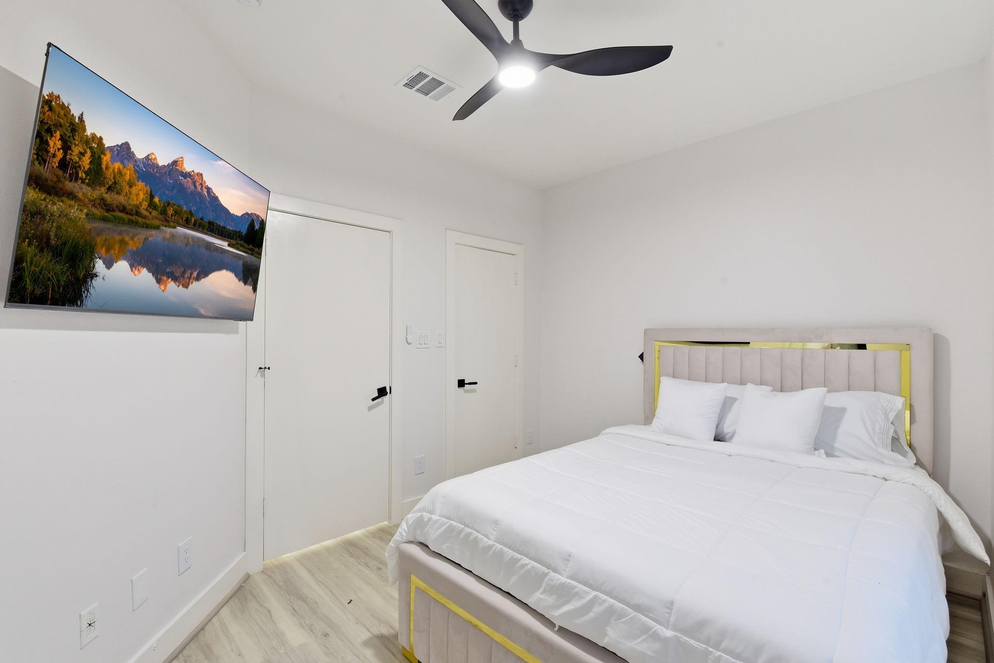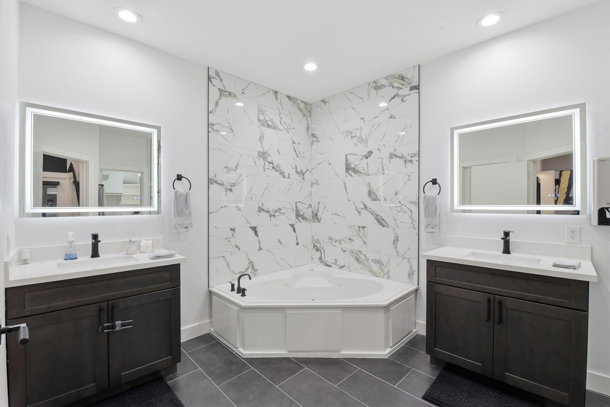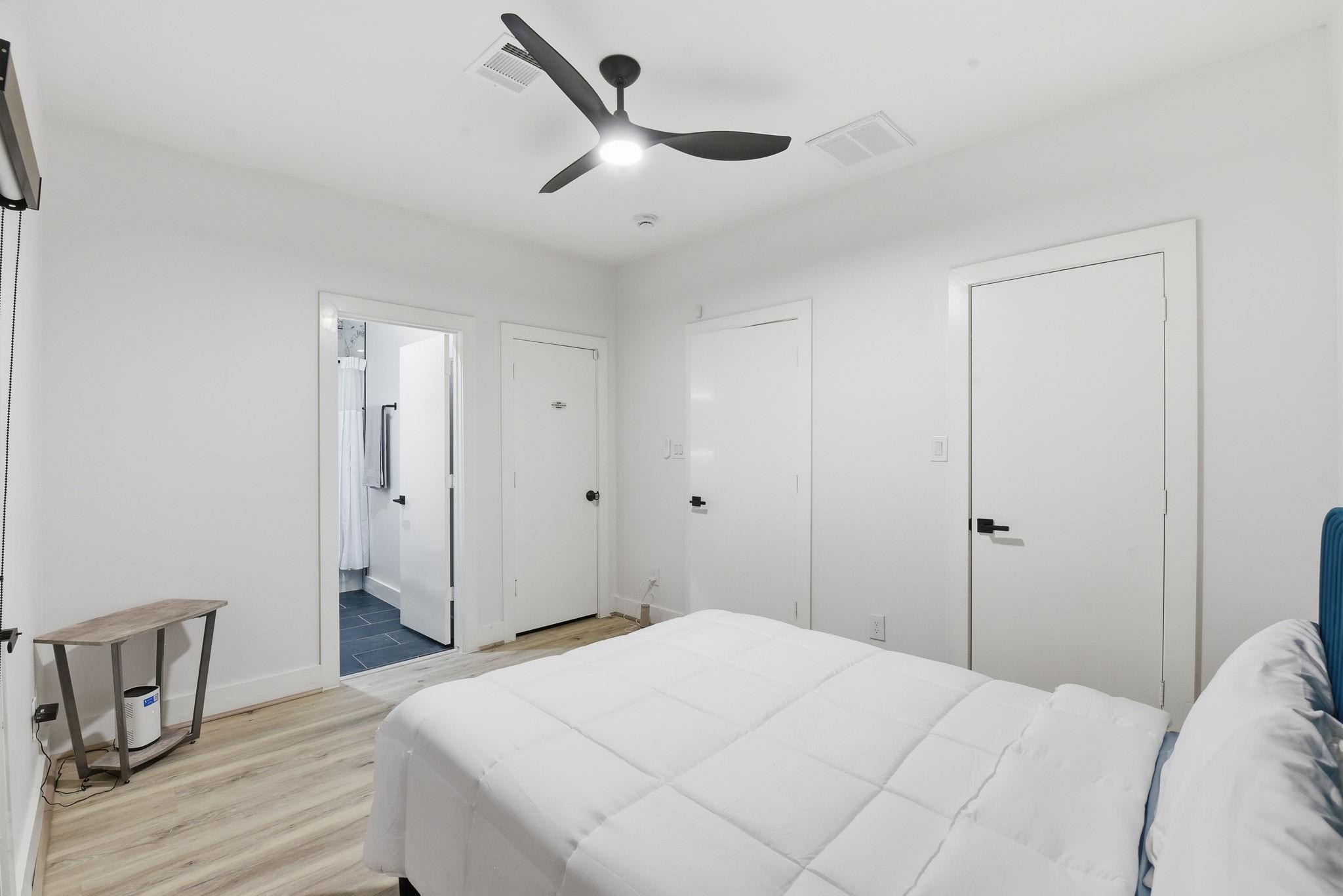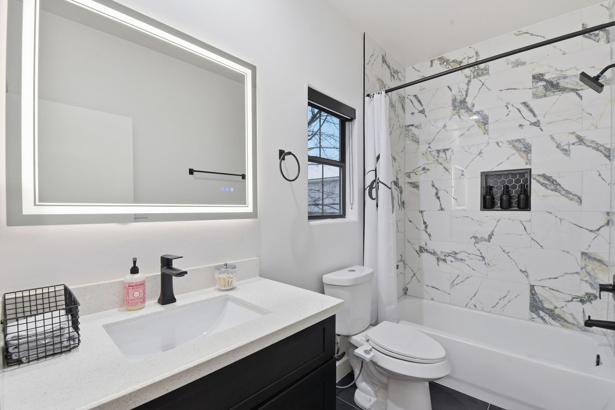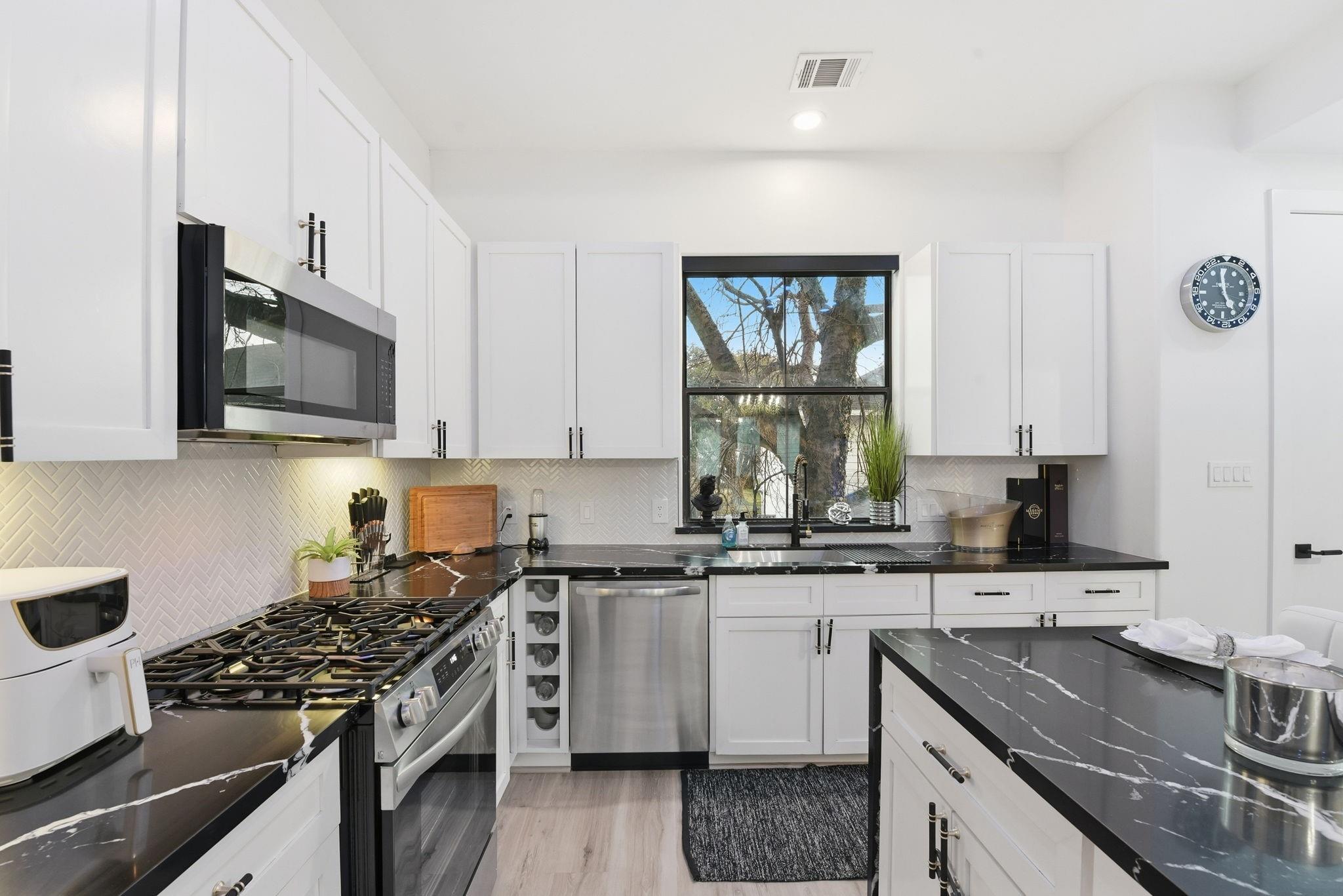 Modern 3-bedroom, 3.5-bath townhome located in the heart of Midtown Houston. This recently updated home offers an open-concept layout with soaring ceilings, LVP flooring, a statement fireplace wall, and thoughtfully selected designer lighting throughout. The kitchen is both functional and striking, featuring a waterfall-edge island, quartz countertops, stainless steel appliances, and sleek black finishes. The primary suite is complemented by a spa-like bath with dual vanities, backlit mirrors, a soaking tub, and a frameless glass shower wrapped in floor-to-ceiling marble-style tile.All bedrooms include en-suite baths, creating a comfortable and private layout. A clean, modern space in a prime location — ready for its next owner. Don’t miss the opportunity to own this beautifully designed Midtown home.