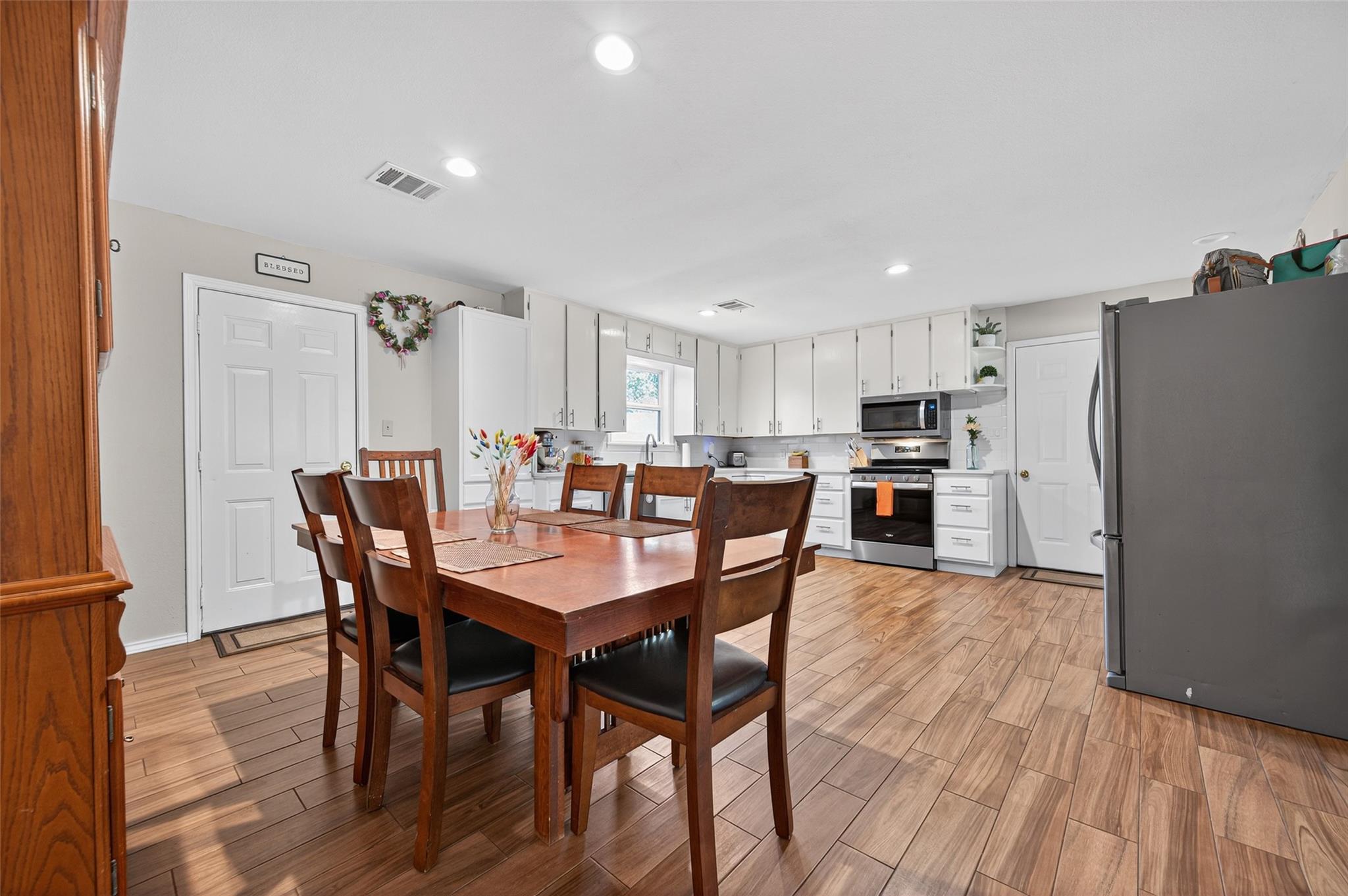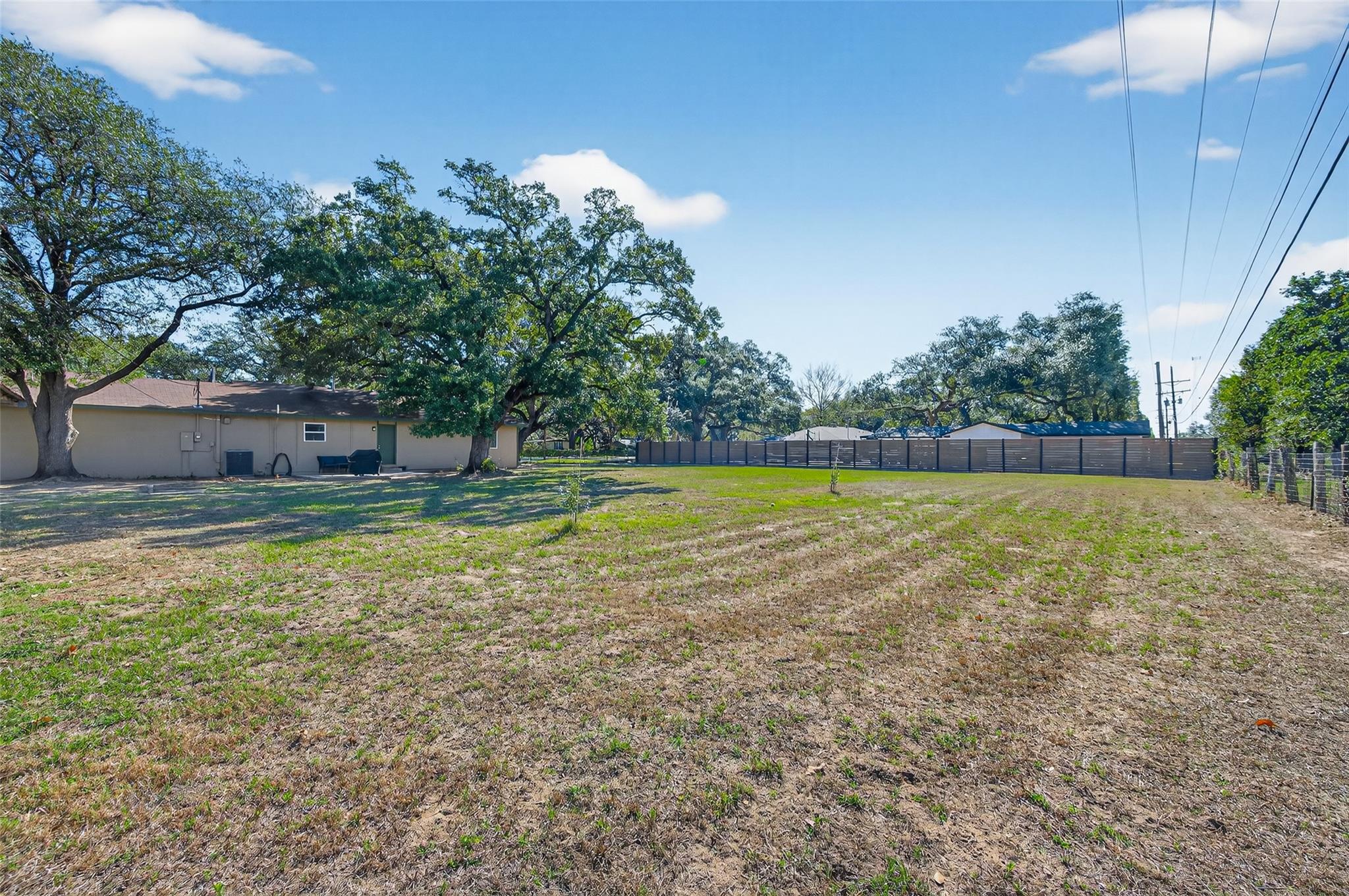 Discover this inviting home on a quiet street in Columbus, TX, featuring 3 bedrooms and 1 full bath, along with a separate 1-bedroom, 1-bath guest suite with its own private entry and backyard access. The property sits on a double lot with mature trees, providing a large yard perfect for outdoor activities and gatherings. Inside, the kitchen, dining, and living areas flow seamlessly, with modern quartz countertops, white cabinetry, and stainless steel appliances creating a bright, functional space for cooking and entertaining. Additional highlights include a large workshop with electricity, a covered backyard carport, and an oversized garage that accommodates 2.5 vehicles. Recent improvements include PEX plumbing throughout and upgraded water and electrical service. This home blends country-style living with convenience, just minutes from shopping and dining, while offering plenty of space, versatility, and modern updates for comfortable everyday living.