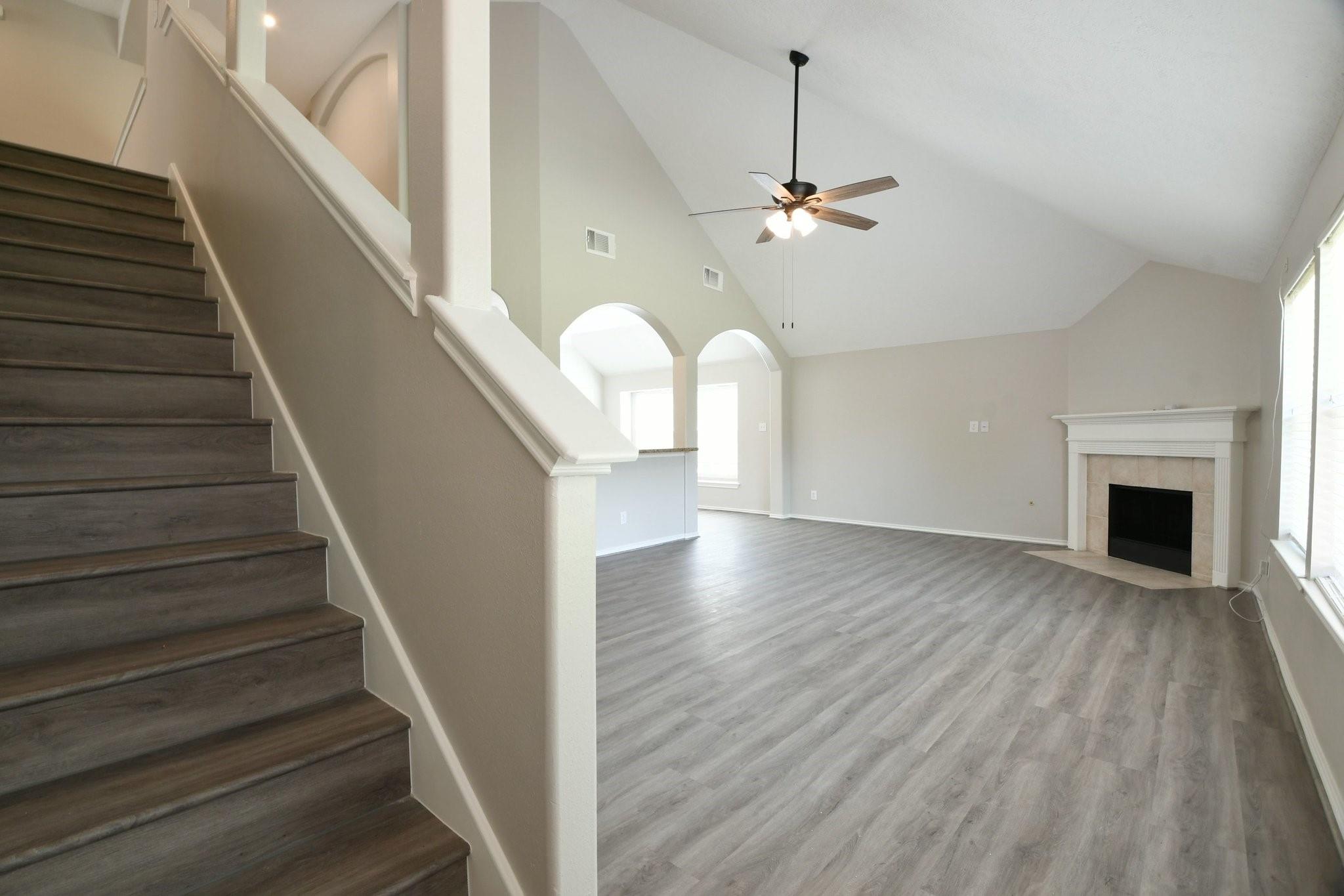 Welcome to this stunning 2-story home in Windrose! The property features a beautiful entryway, formal living room, and a spacious kitchen with granite countertops and backsplash. Enjoy the cozy family room with a fireplace and soaring 2-story ceiling. The main floor master suite offers a garden spa tub, separate shower, double sinks, and his/her closets. Upstairs, you'll find 2 bedrooms, 1 full bath, and a spacious game room. Recently painted with upgraded flooring, ceiling fans in every room, and a sprinkler system. Roof replaced 1 year ago. Located in the prestigious Klein school district.