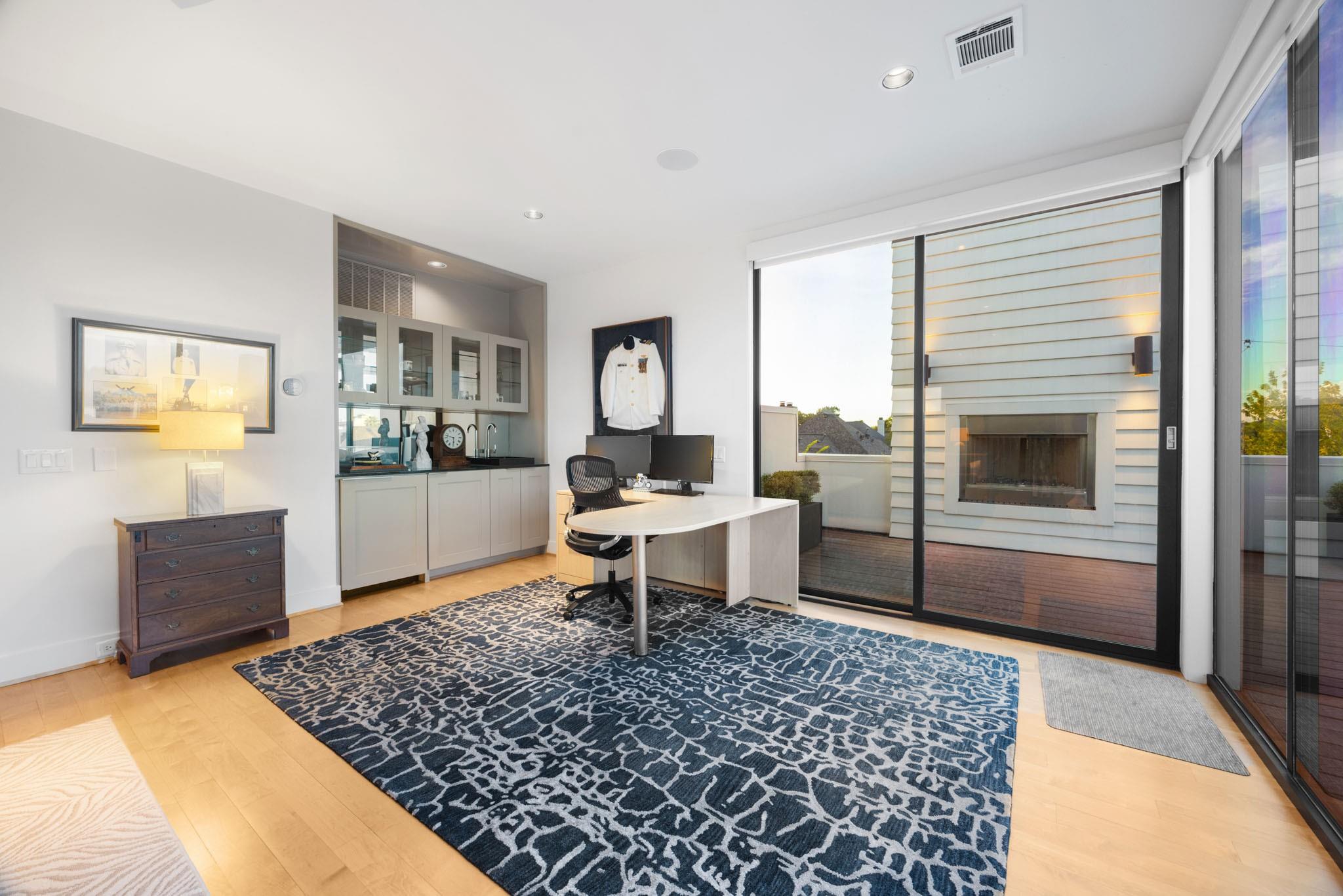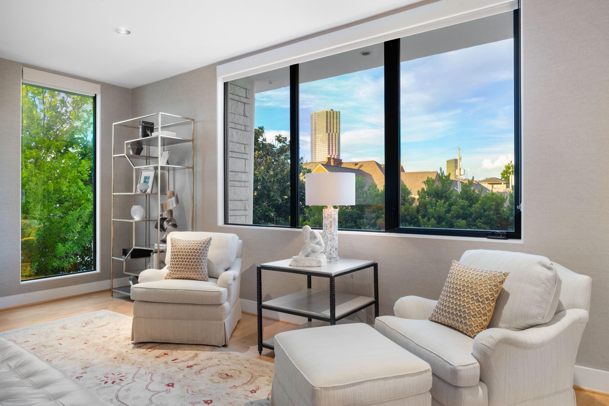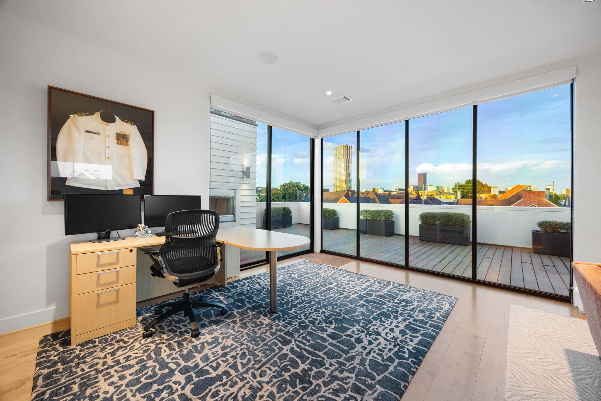 Enjoy luxury living in the heart of Houston's Galleria area. 2114 Potomac #A, nestled in an exclusive gated enclave of 3 patio style homes,offers both the privacy of a retreat and walking distance to city life.Owners purchased the home before completion and added many upgrades.Whether you need 4 bedrms or prefer a 3 bedrm layout with gamerm,office,study,this beautiful home adapts to your lifestyle with 1st flr living and elevator ready access to all 3 flrs(per builder) Front facing location provides lovely views of the private,perfectly landscaped patios and gardens- enjoyed from both formals, gathering rm and chef's kitchen.Upstairs,the primary suite is a haven of tranquililty with it's spa-inspired bath and 2 large walk-in closets. Top floor,currently used as a family rm /office has direct access to the 515 sq ft rooftop deck featuring an outdoor fireplace and awesome city views. Don't miss the pristine garage with built-in storage cabinets and premium Swisstrax system tile flooring.