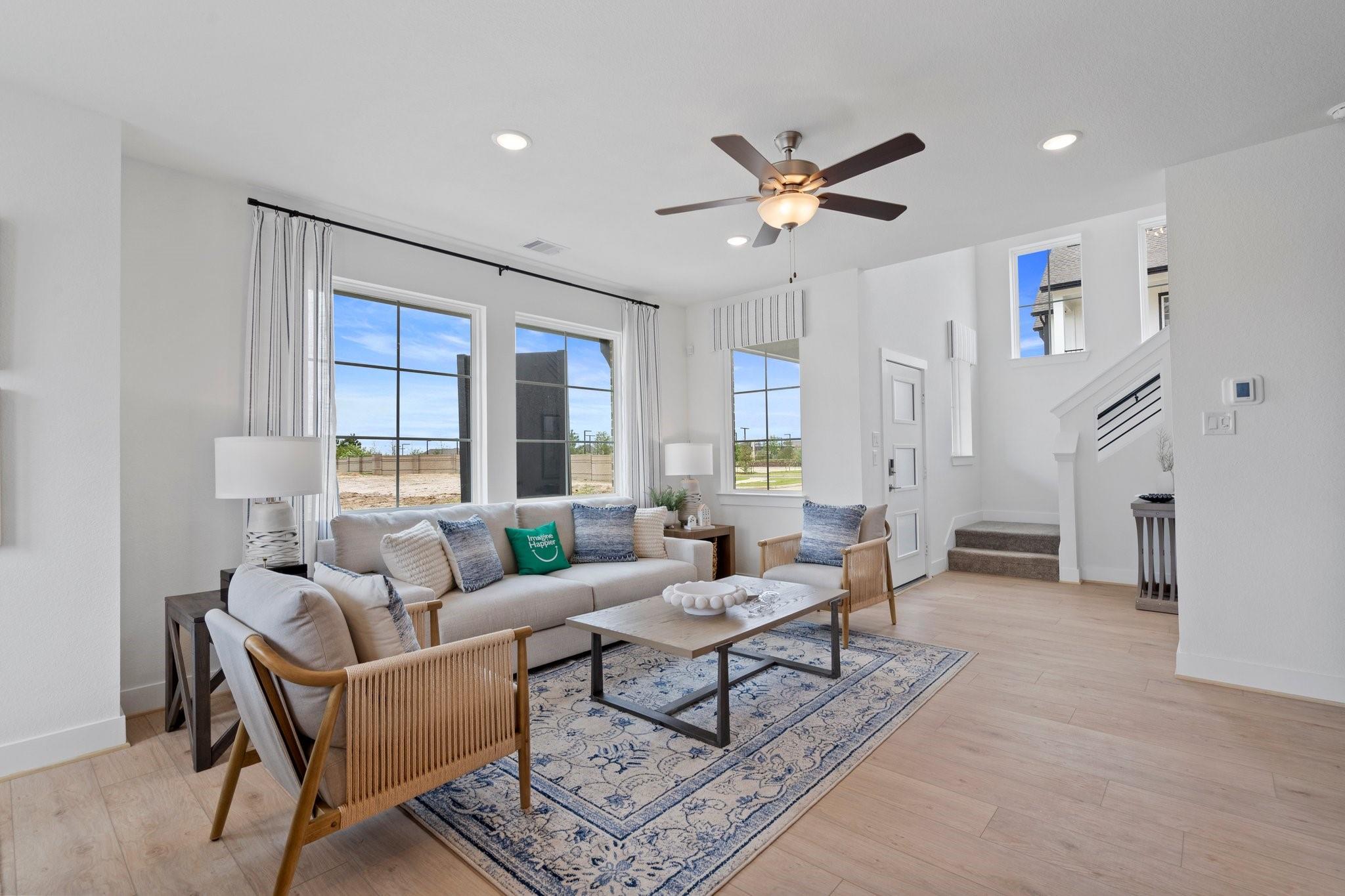 Elevate your lifestyle in this beautifully crafted two-story Riverdale—designed for entertaining and modern living! Featuring 3 bedrooms, 2.5 baths, a 2-car garage, and inviting outdoor spaces, this home blends charm with functionality. The main floor boasts a striking two-story foyer leading to a cozy family room with modern fireplace, a spacious quartz island kitchen, and casual dining perfect for gatherings. Upstairs, the split-plan layout ensures privacy with a luxurious owner’s suite, while secondary bedrooms with walk-in closets connect to the balcony through a versatile flex room, ideal for an office or playroom. Thoughtful additions include GE stainless steel appliances, blinds, sprinkler and security systems, full gutters, and a landscaped yard—fully equipped for comfort and convenience. The Riverdale brings every detail together to create a space you’ll love coming home to!