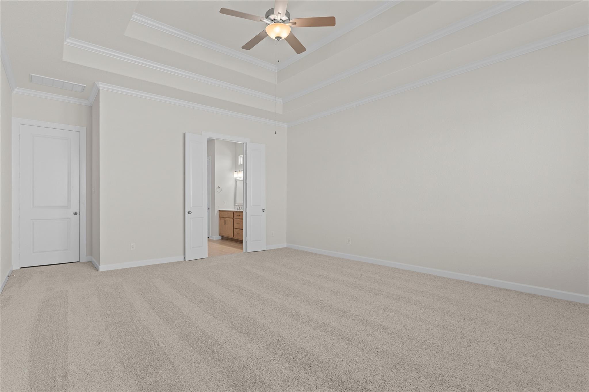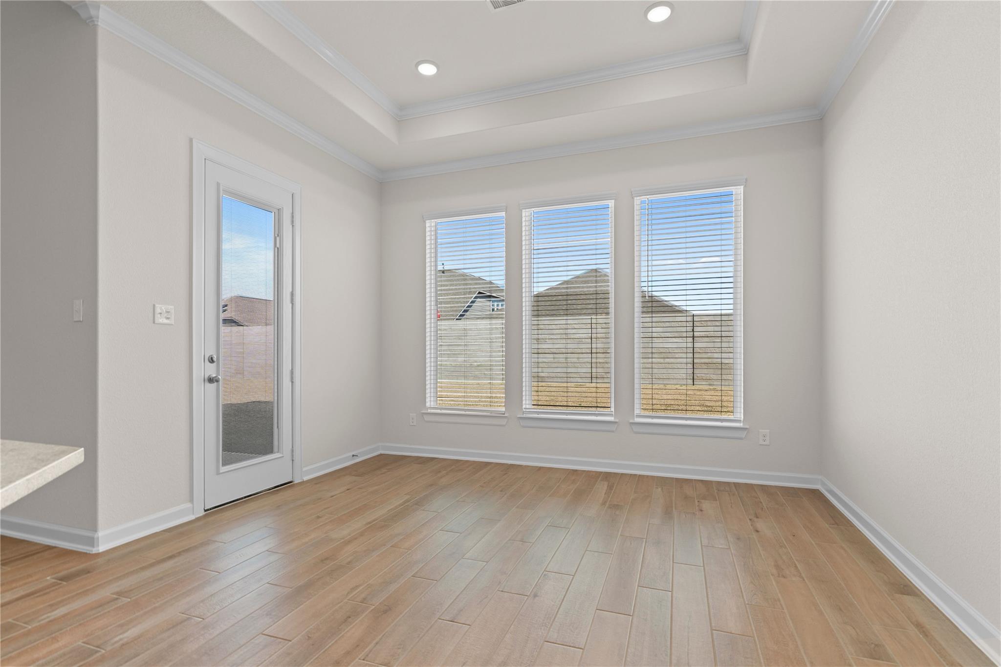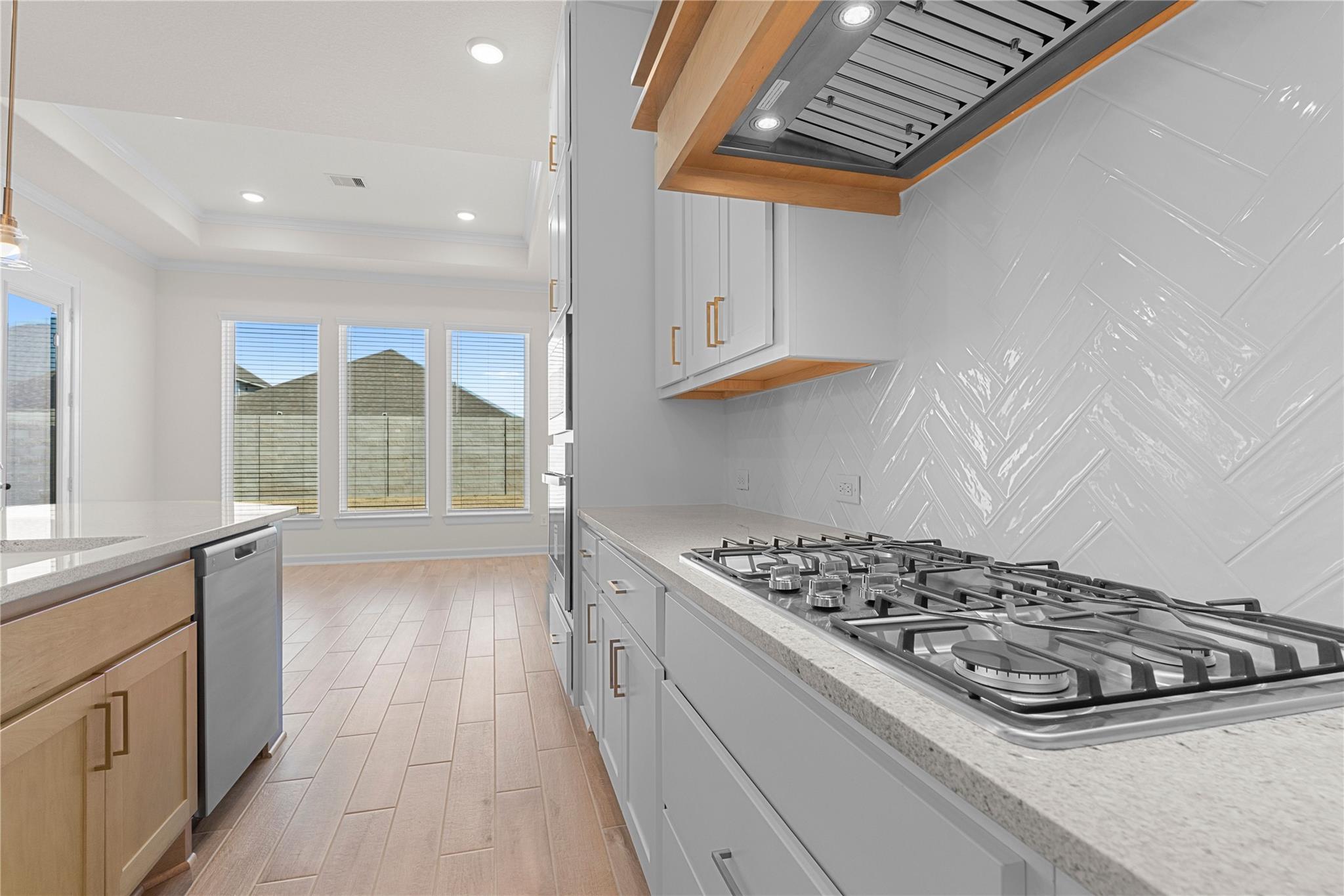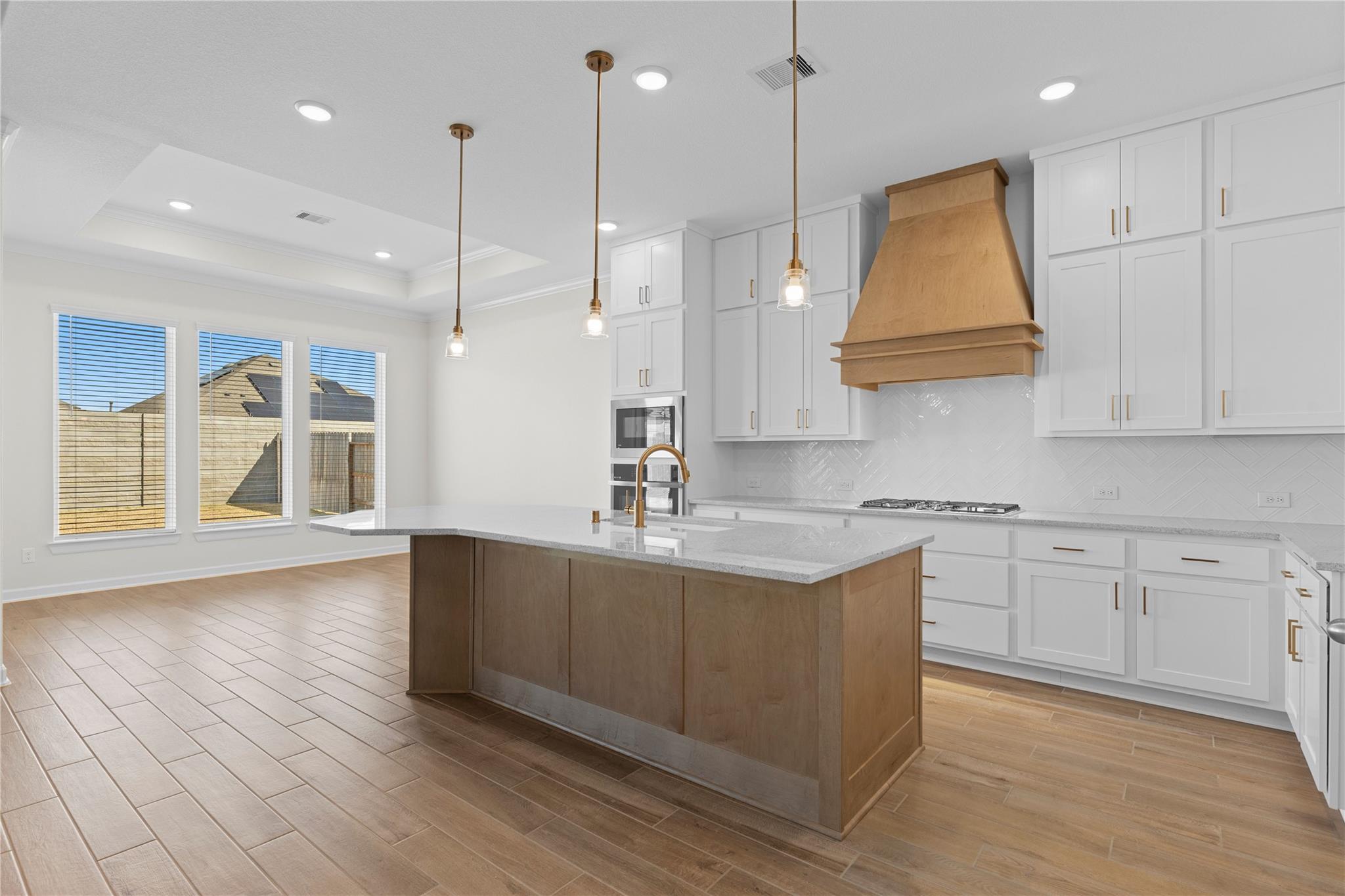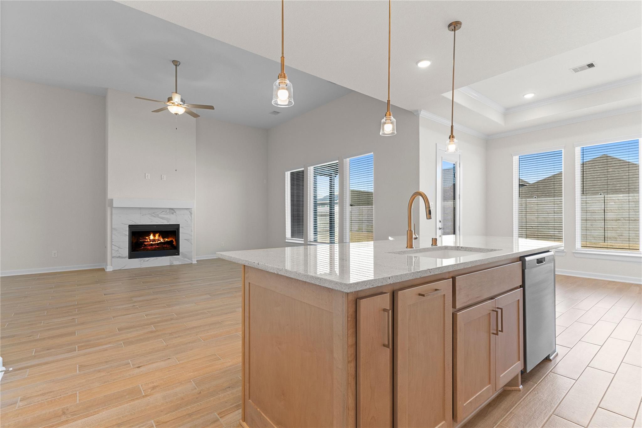 Gated Community! CastleRock Communities presents the Malibu Floor Plan, a one-story home with Energy Star certification and green features. Step inside to high ceilings, crown molding, and an open-concept layout. The spacious family room with gas fireplace flows into the gourmet kitchen featuring granite countertops, soft-close cabinets and drawers, pots and pans storage, a large island, breakfast bar, gas cooktop, convection oven, and walk-in pantry. The primary suite offers a spa-style bath with dual sinks, soaking tub, separate shower, and walk-in closet. Three additional bedrooms, including a 4th bedroom in lieu of a study, offer flexible living space, plus a secondary bath with tub and shower combo. Energy upgrades include a tankless water heater and high-efficiency HVAC. Enjoy a covered patio and fenced backyard. Amenities include clubhouse, pool, splash pad, fitness center, courts, and trails. Convenient access to shopping, dining, and major roadways nearby.