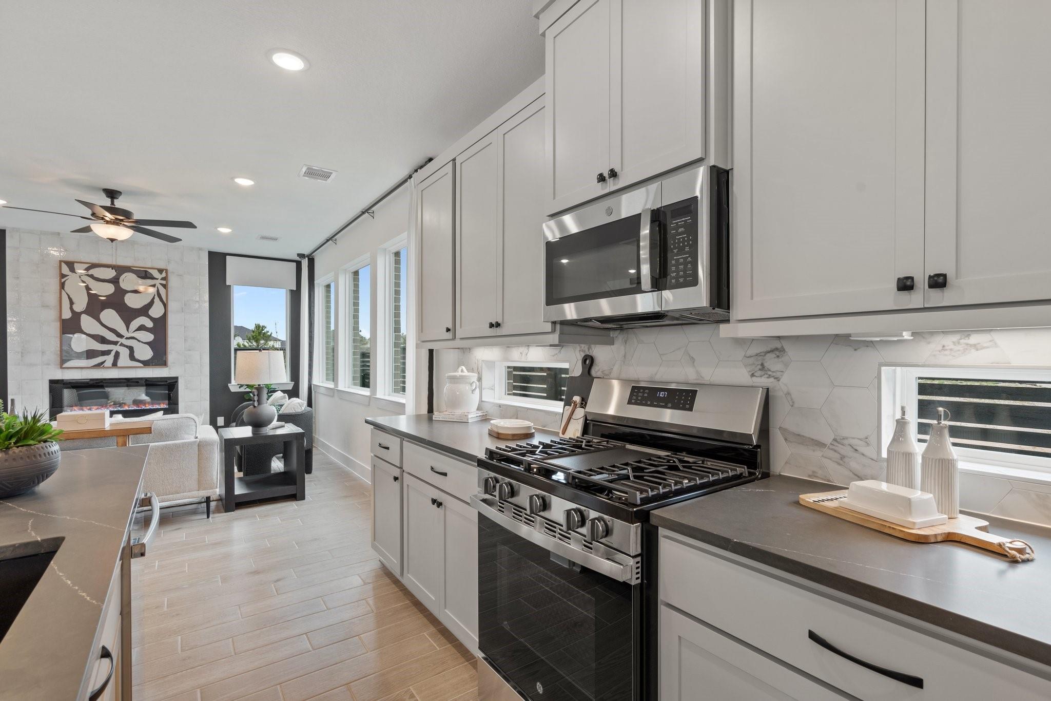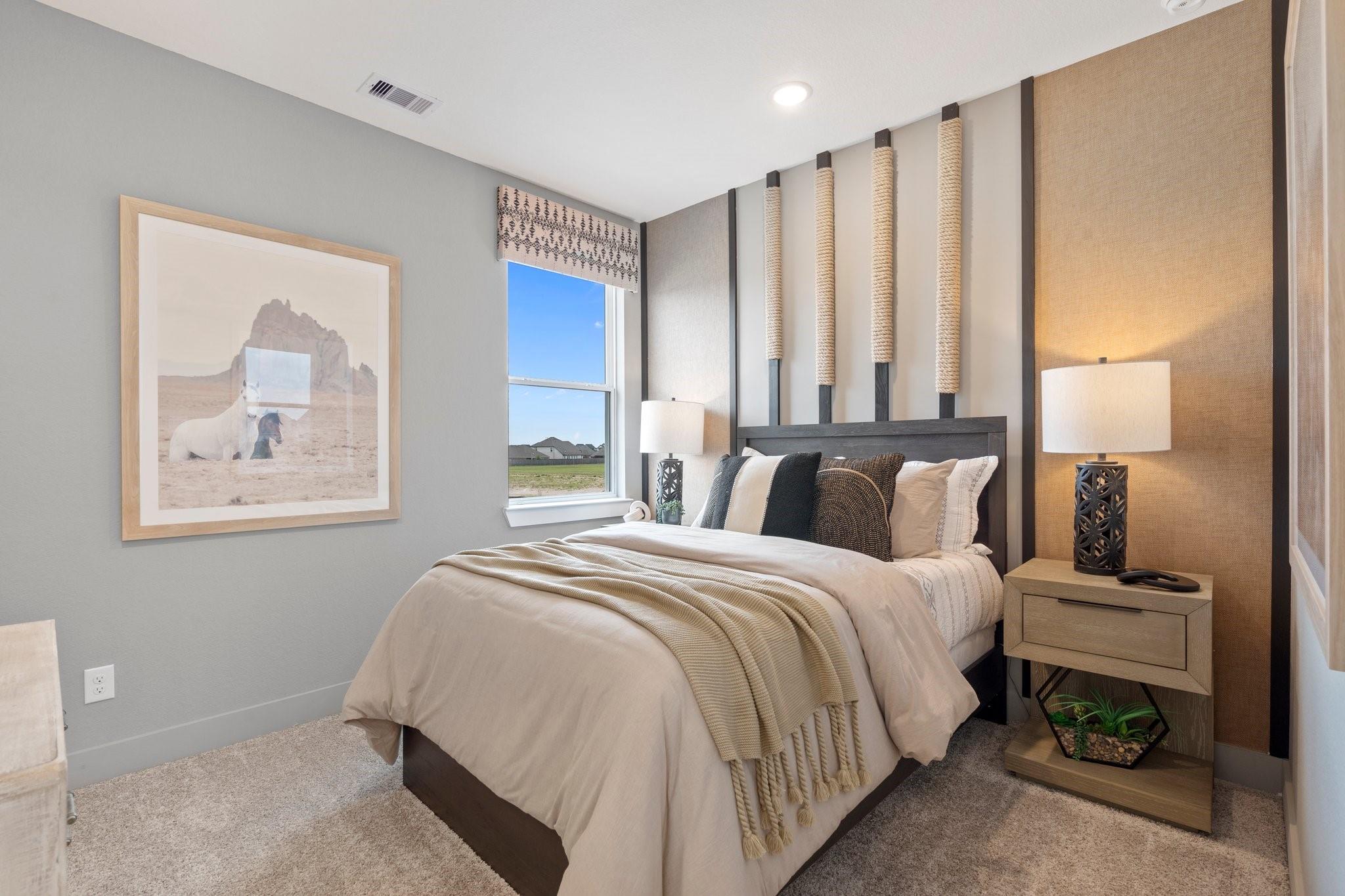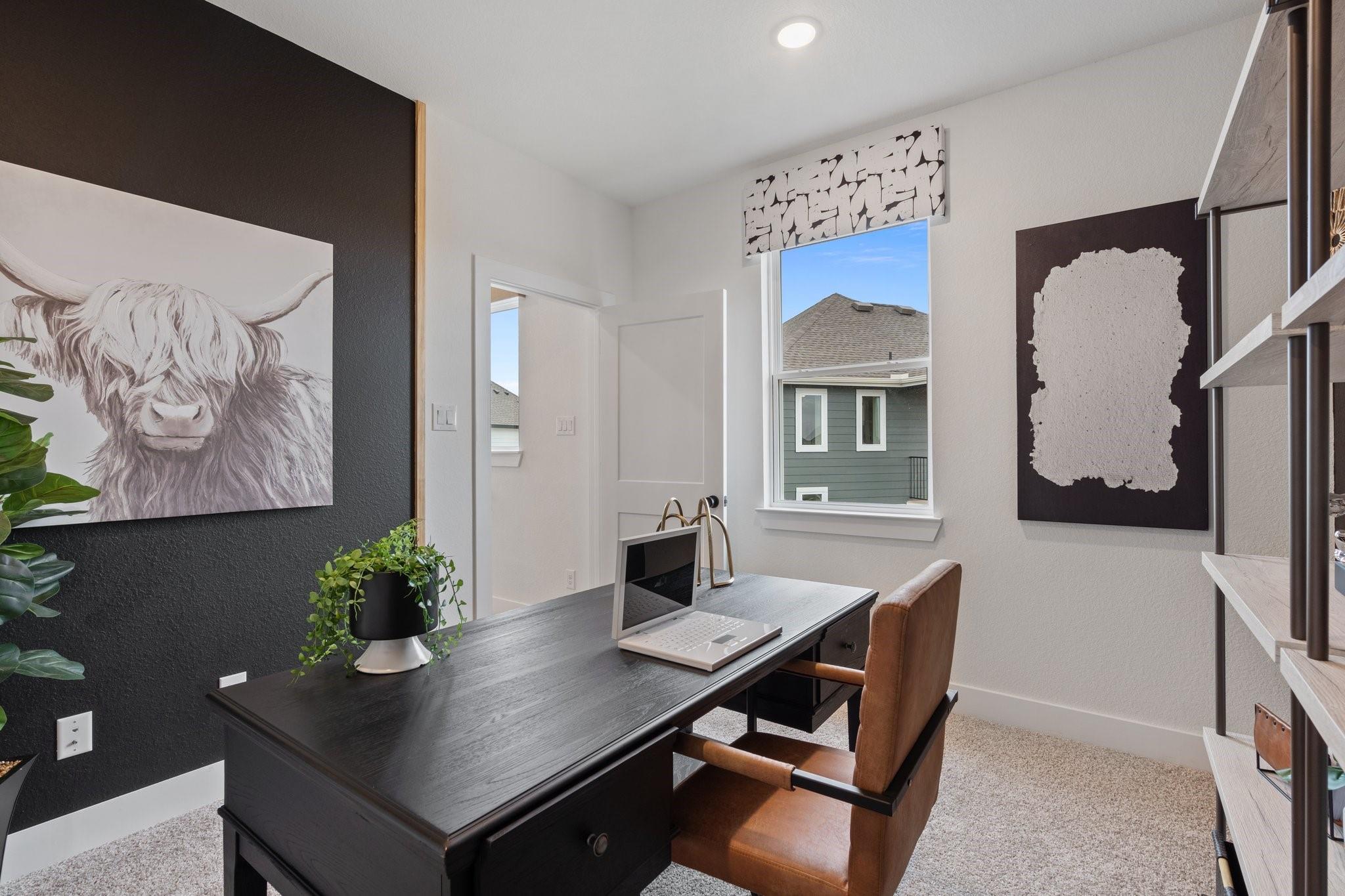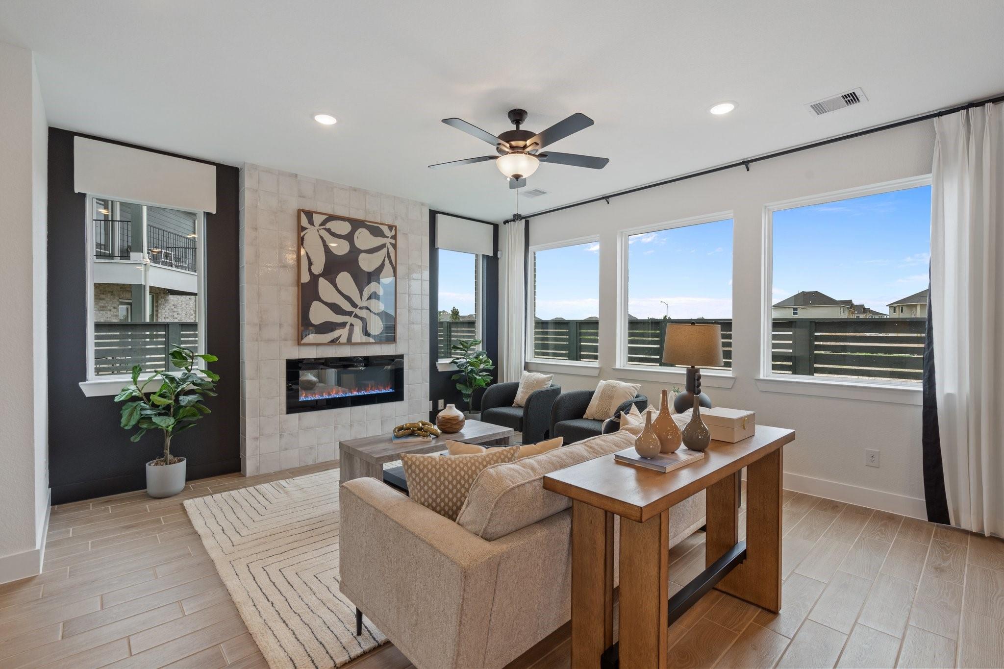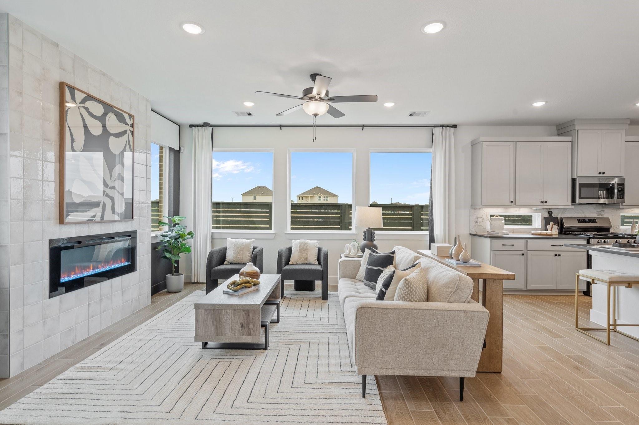 Fall in love with this courtyard two-story stunner featuring wide-open spaces and thoughtful design. The main floor offers a sprawling great room with a modern fireplace, a sleek quartz-island kitchen, and a dining area that flows to a spacious covered patio—perfect for relaxing outdoors. A versatile pocket office adds a private spot for work or hobbies. Upstairs, the owner’s suite is a true retreat with dual sinks, an oversized shower, and a walk-in closet. Secondary bedrooms surround a central flex space ideal as a game room or study. This home includes GE stainless steel appliances, blinds, security and sprinkler systems, full gutters, a fully sodded yard, and premium landscaping—all crafted for comfort, beauty, and ease. The Rosewood is ready to welcome you home.