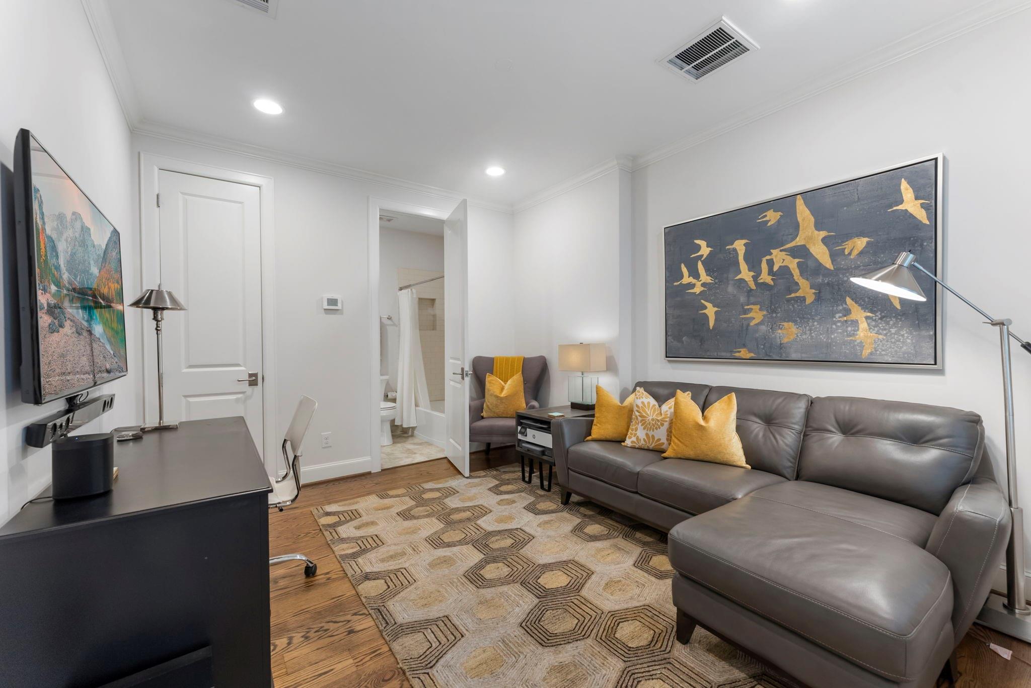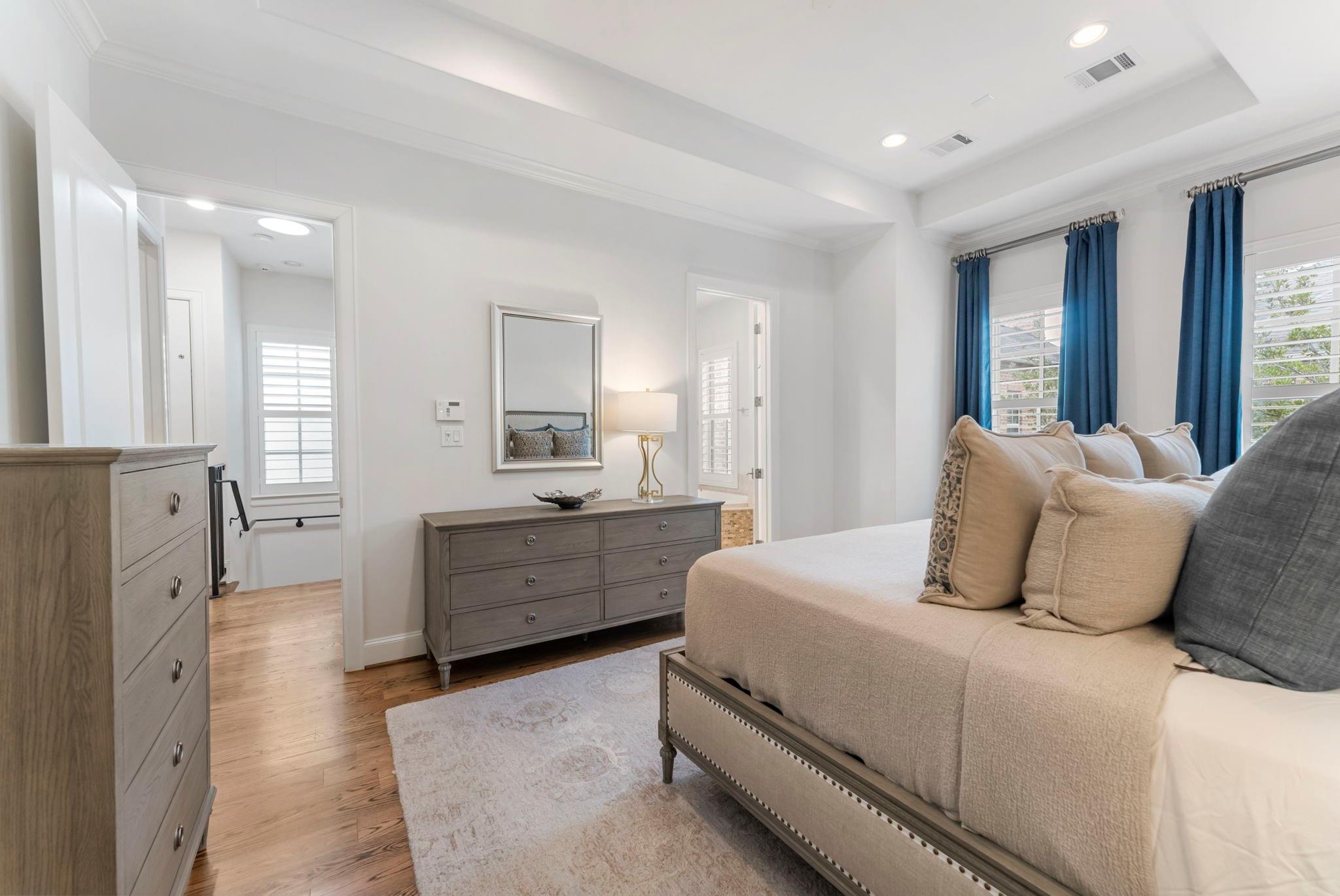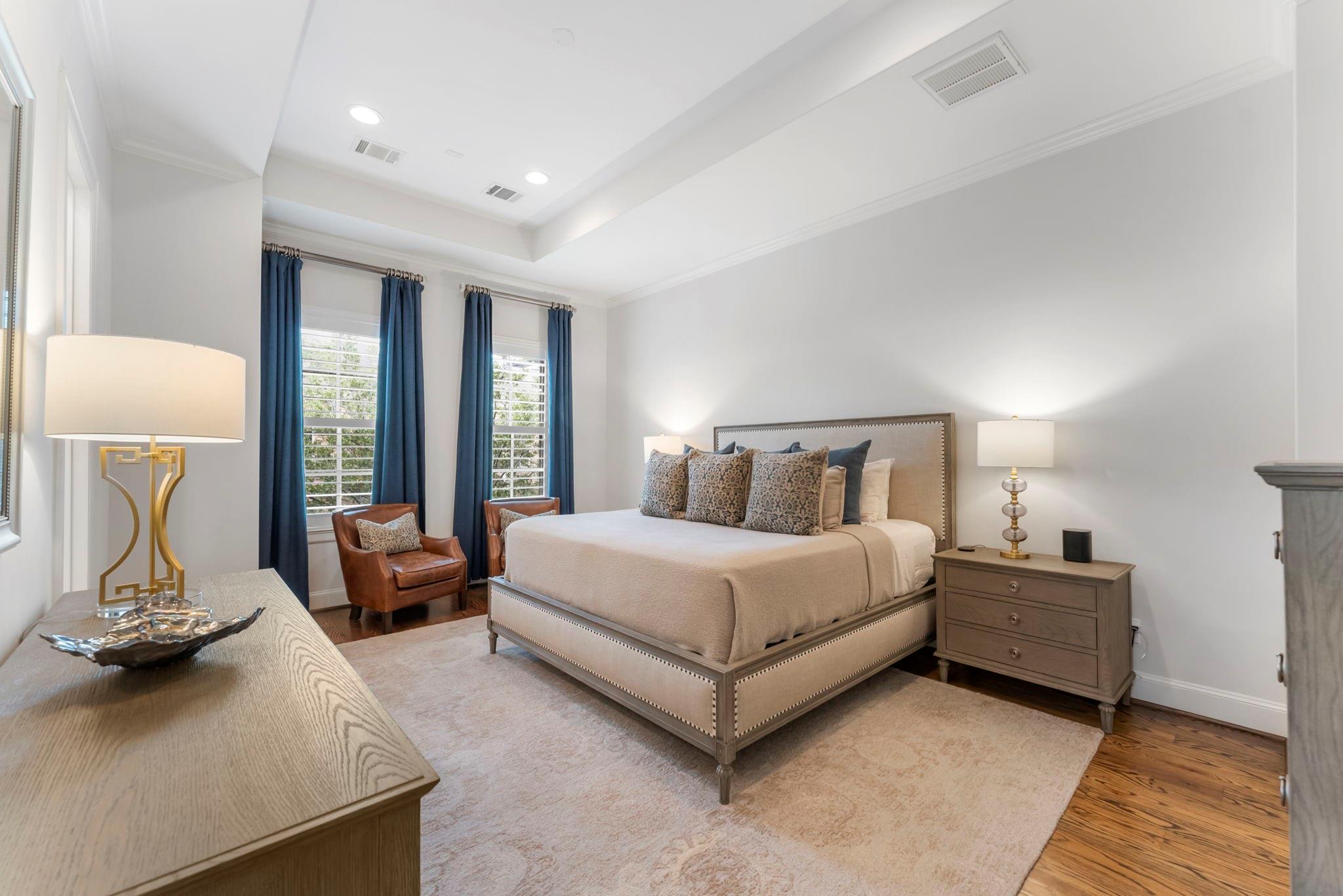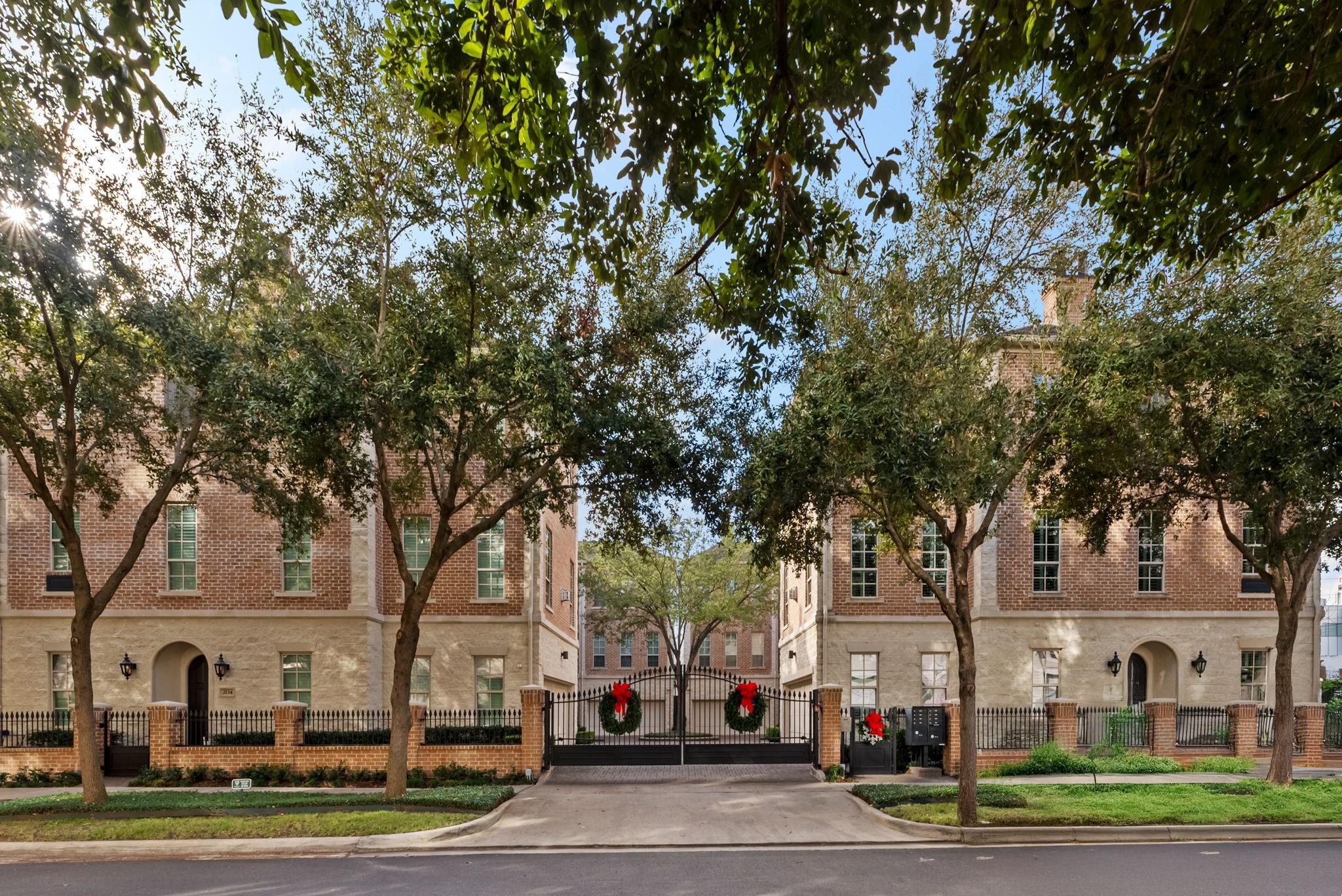 Nestled on the tree-lined Briarglen Drive, this sophisticated home offers privacy, modern upgrades, and unbeatable convenience in the heart of Houston. Less than a 5 minute walk to the River Oaks District, a quick 4 min. drive to Central Market, & under a mile from The Galleria, you're surrounded by premier shopping, dining, and culture. A private elevator enhances the ease of multi-level living. Located in a secure, gated community, the home boasts thoughtful upgrades, including a new Bosch 800 Series, tankless water heater, Plantation shutters, and a whole home UV Light HVAC Air Purification System. The kitchen shines with custom pullouts, elegant finishes, and gleaming countertops. Hardwood floors flow throughout, adding timeless charm. Outdoors, a private patio and inviting sidewalks under mature trees offer relaxation and community charm. With its prime location and stunning interiors, 2126 Briarglen Drive is the perfect urban retreat.
