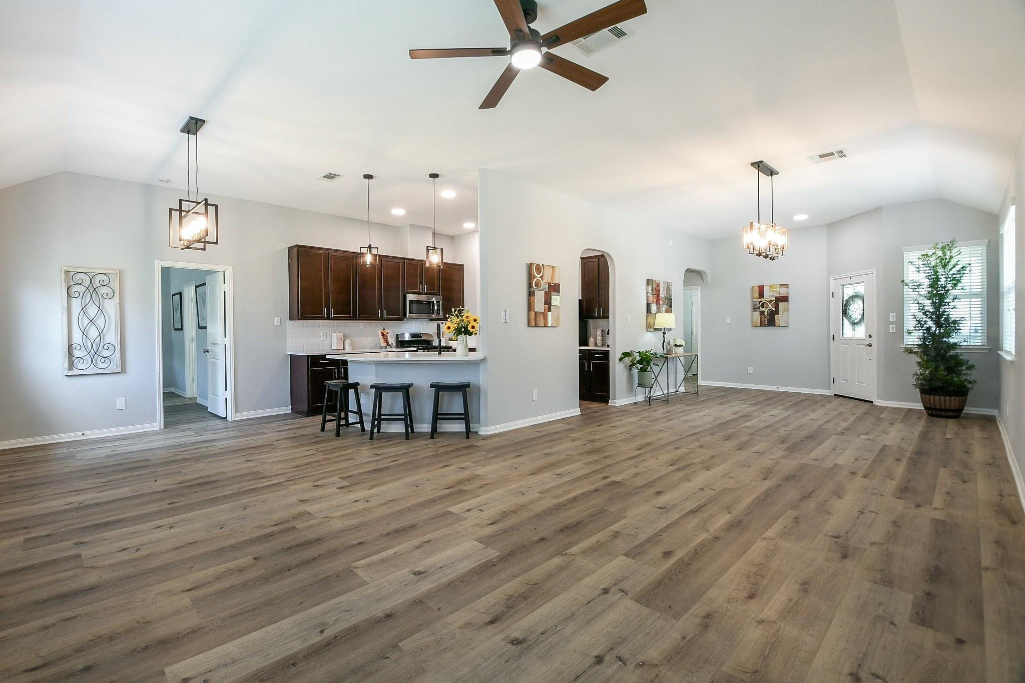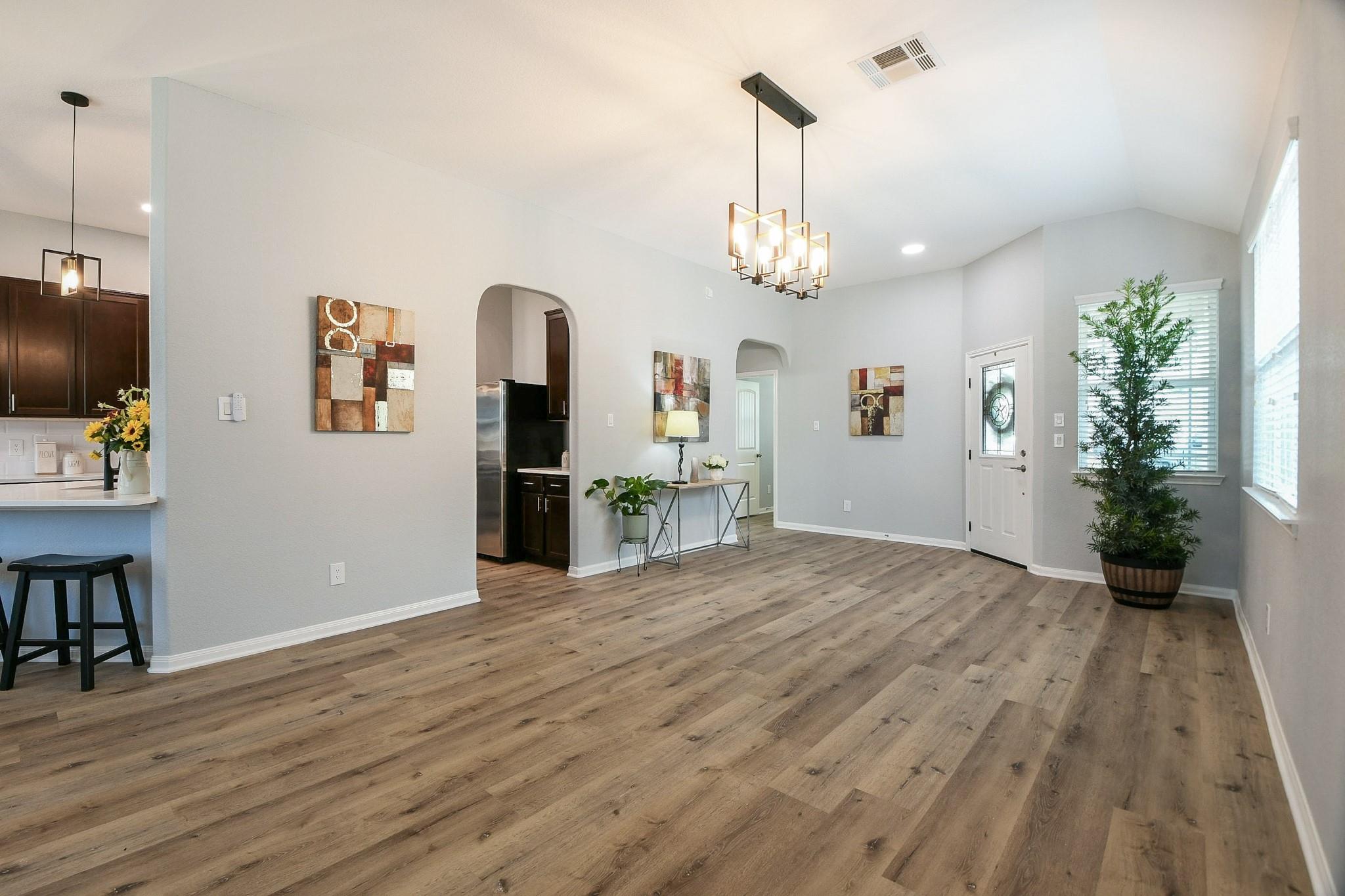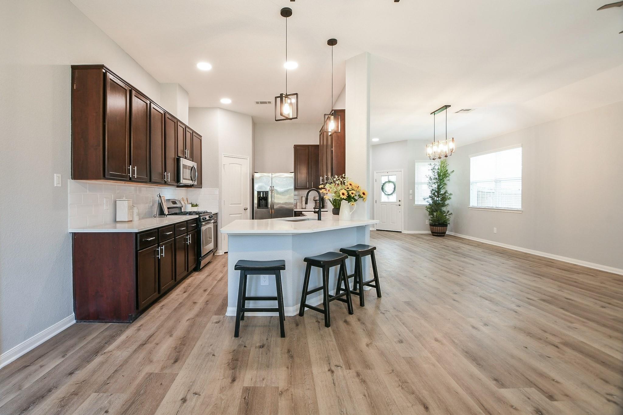 Welcome to your dream home! This stunning 4-bedroom residence has been updated from top to bottom, offering the perfect blend of elegance & comfort. Fresh paint throughout & new LVP flooring in the bedrooms & living spaces give the entire home a crisp, move-in ready feel. The open-concept layout shines as the spacious kitchen flows seamlessly into the family room. The chef-inspired kitchen features sleek quartz countertops, stainless steel appliances & a brand new microwave — perfect for everyday living and entertaining alike. The primary suite offers a beautifully updated en-suite bath featuring dual sinks, a frameless glass shower, and marble-look tile. Both bathrooms are finished with matching quartz countertops and new plumbing fixtures. Updated light fixtures throughout add a modern, polished touch, and a new 50-gallon water heater ensures reliable efficiency for years to come. Enjoy the private patio, charming front porch & 2-car garage. Schedule your showing today!