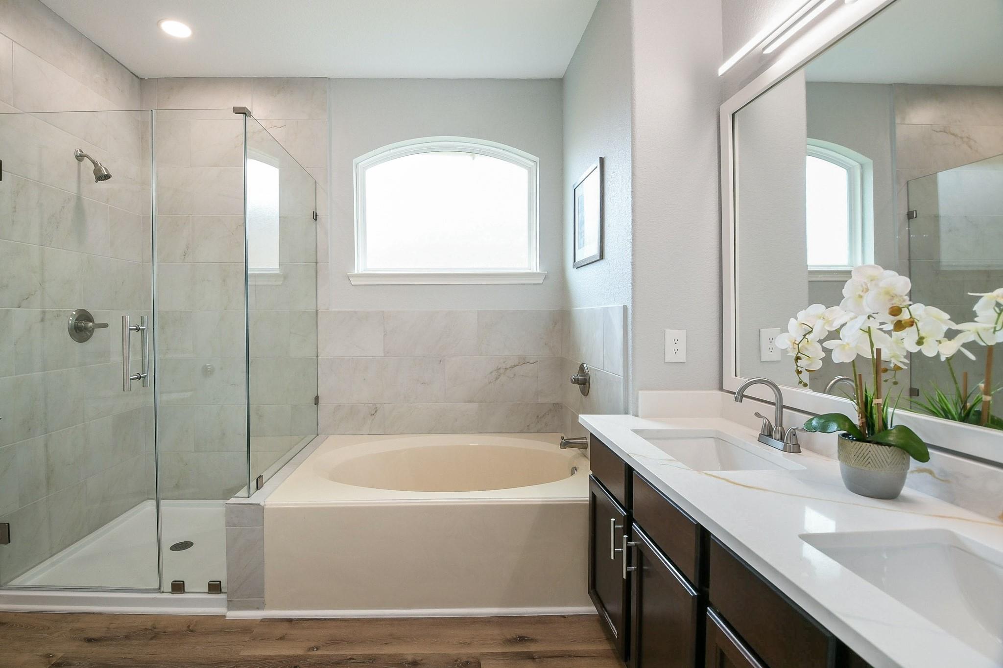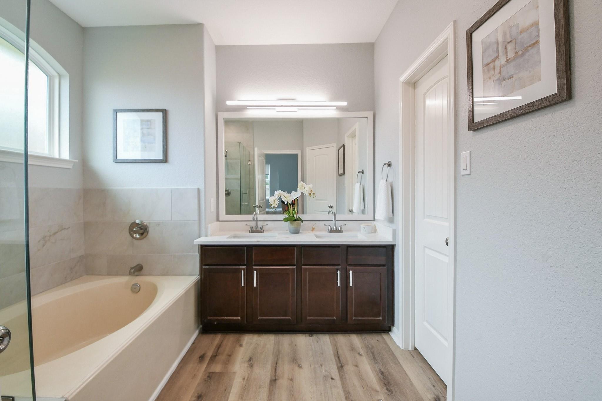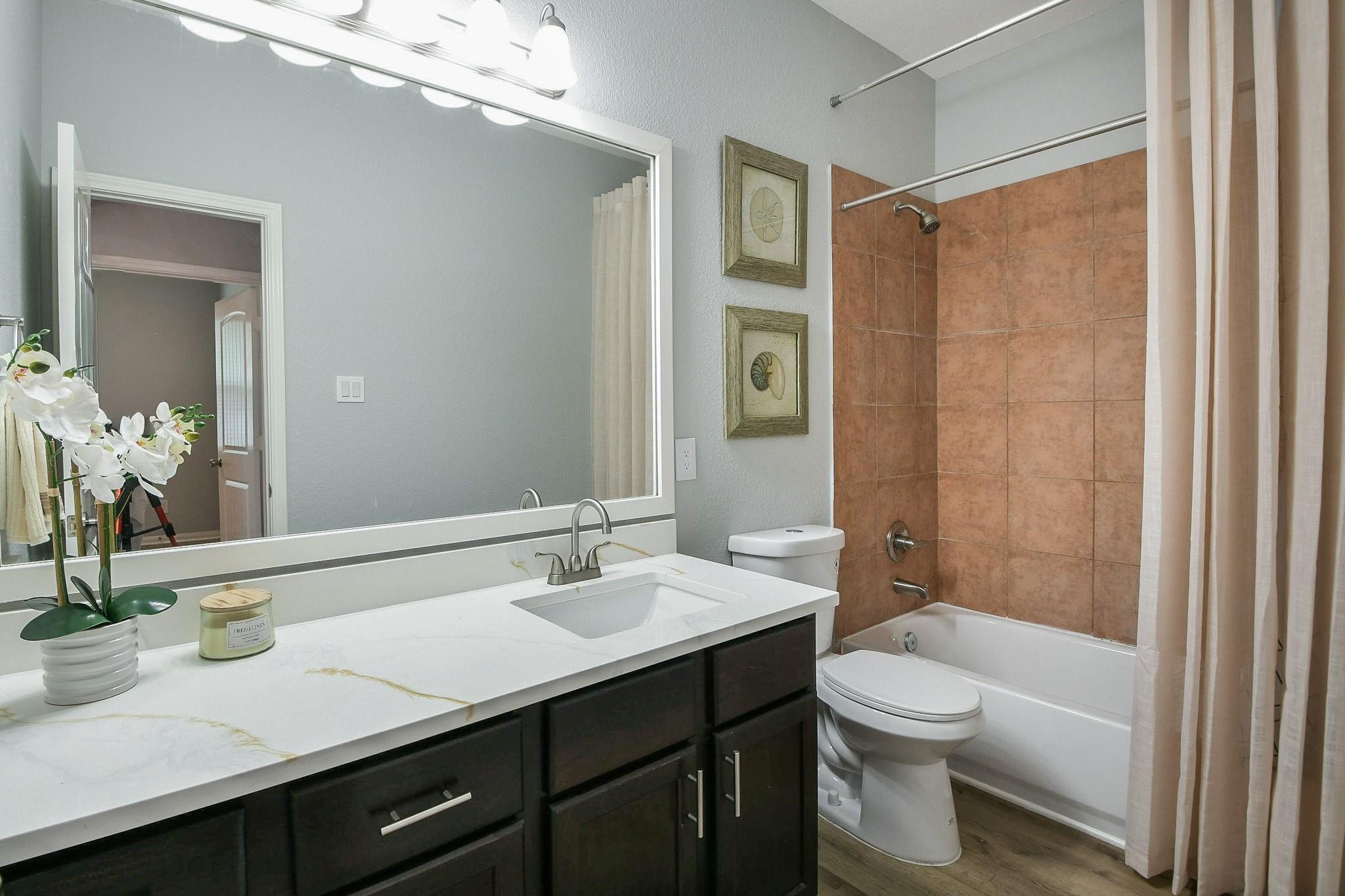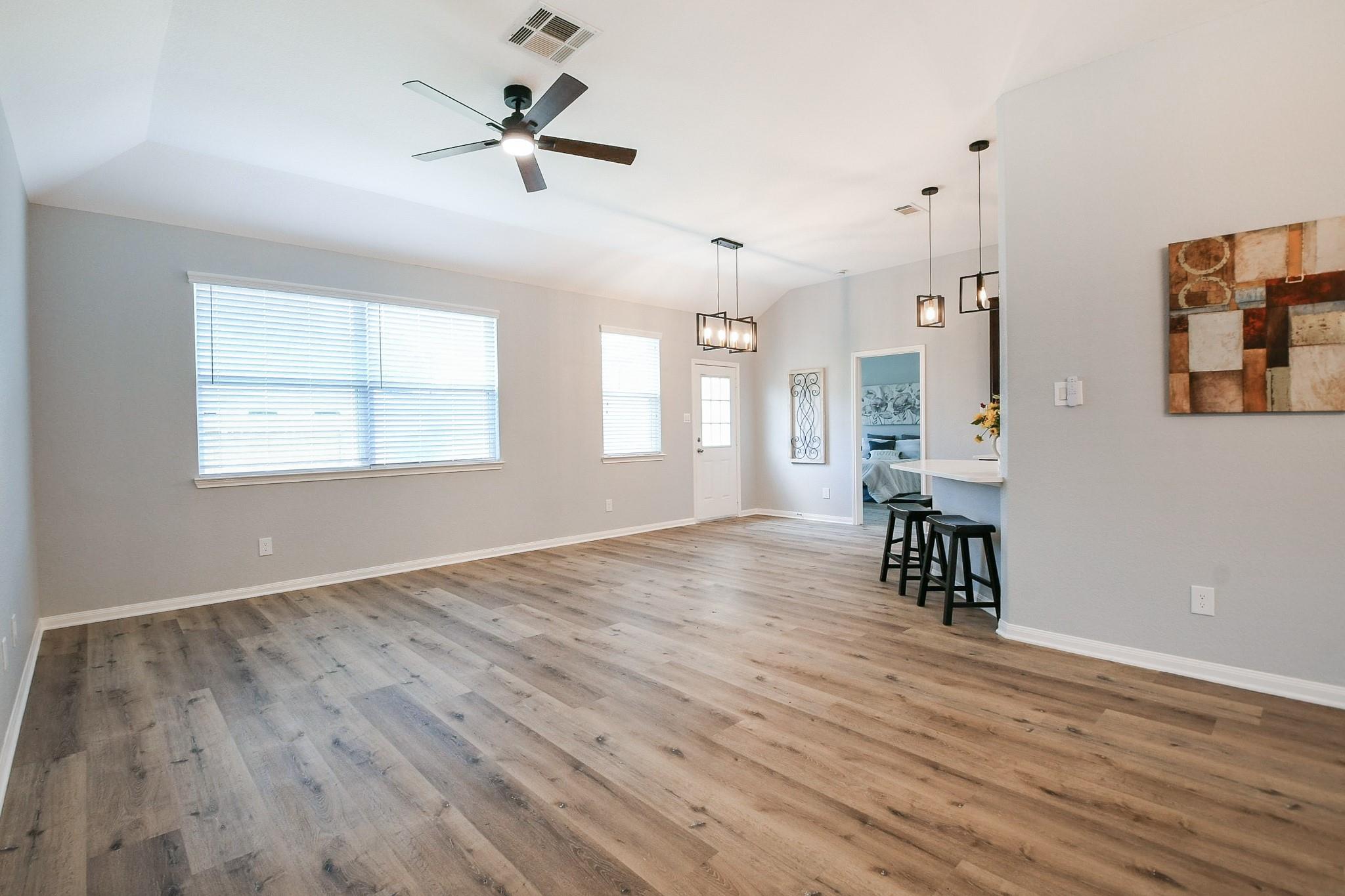 Welcome to your dream home! This stunning 4-bedroom residence has been updated from top to bottom, offering the perfect blend of elegance & comfort. Fresh paint throughout & new LVP flooring in the bedrooms & living spaces give the entire home a crisp, move-in ready feel. The open-concept layout shines as the spacious kitchen flows seamlessly into the family room. The chef-inspired kitchen features sleek quartz countertops, stainless steel appliances & a brand new microwave — perfect for everyday living and entertaining alike. The primary suite offers a beautifully updated en-suite bath featuring dual sinks, a frameless glass shower, and marble-look tile. Both bathrooms are finished with matching quartz countertops and new plumbing fixtures. Updated light fixtures throughout add a modern, polished touch, and a new 50-gallon water heater ensures reliable efficiency for years to come. Enjoy the private patio, charming front porch & 2-car garage. Schedule your showing today!