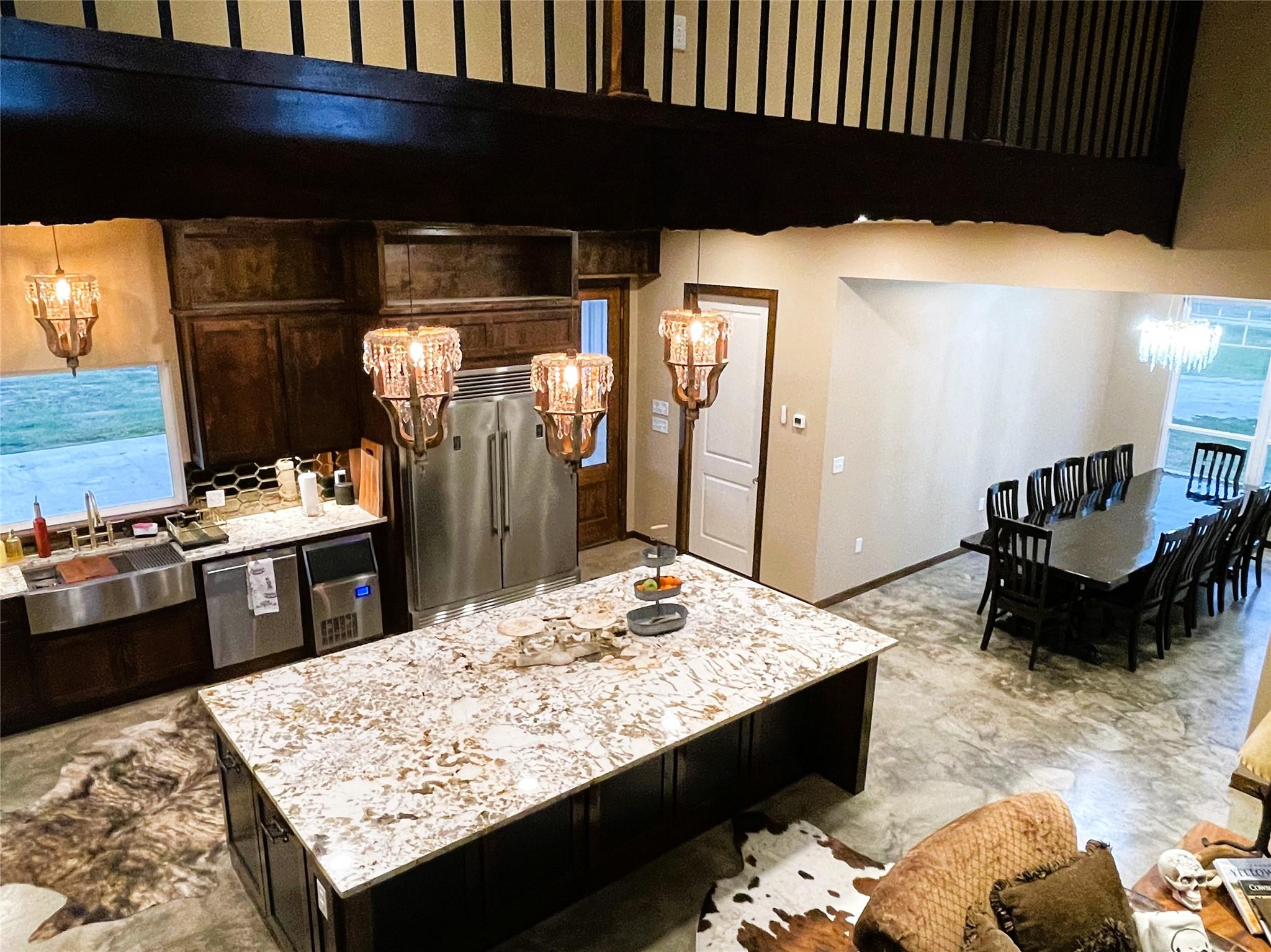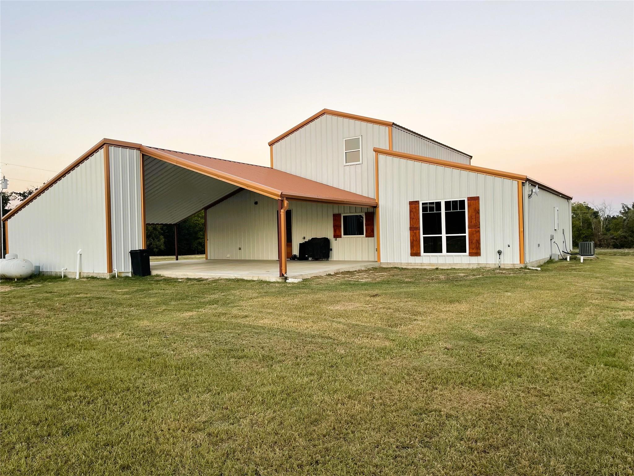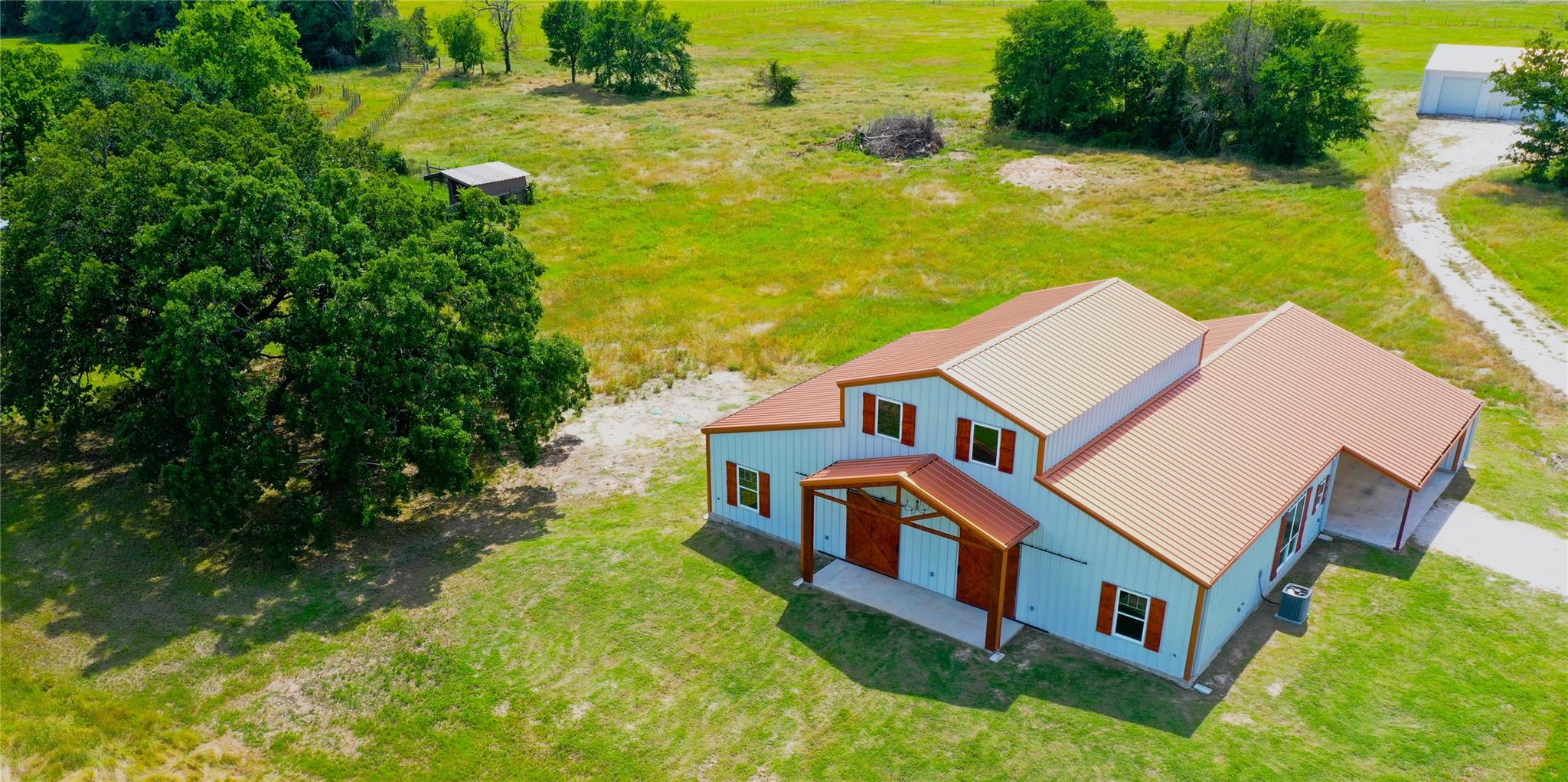Sleek & Smart meets Comfort & Efficiency in this Truly One of Kind Barndominium on 10.323 acres. Metal Roof & Siding, foam insulation, polished concrete floors, water well approx 475' deep, propane stove, tankless water heater, & fireplace. Open concept, stunning island kitchen, commercial grade appliances, icemaker, 8 burner gas range, pot filler, granite countertps, Soaring cathedral clg in the living rm. Fireplace framed by sliding glass patio drs for lots of natural light, revealing the pasture & pond in front. Close the exterior barn drs to provide privacy. Primary suite, tremendous organized walk in closets, Luxurious bathtub, double vessel sink, French Country shutters cover the window near the Roman shower of tumbled tile, dual shower head syst. Upstairs bedrm, ensuite bath, Bedrm 2, ensuite bath, opulent black & gold accented blk tile, glass dr, vessel sink. Laundry rm, mop sink, Oversized carport, storage rm & Half Bath, 30x50 Shop, 20x50 Lean to. 1 pond. Ag exempt.