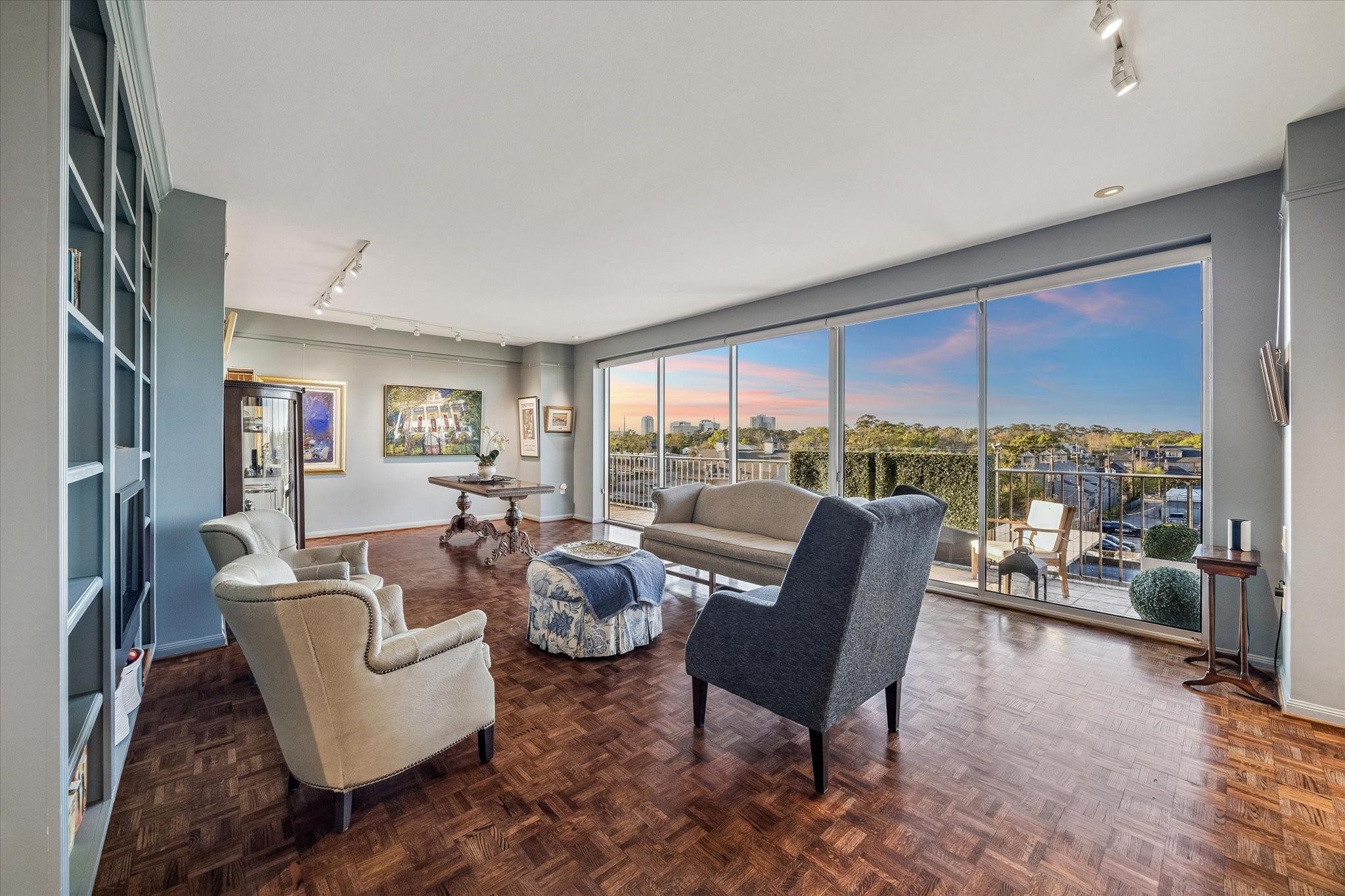 From the massive wrap-around veranda with treetop views, to the exquisite high end remodeled Kitchen, you will truly love this "one of a kind" River Oaks area high rise home! This rare corner unit boasts beautiful refurbished hardwood floors, custom "state of the art" fireplace, a stylish chef's Kitchen like no other, a rare in-unit utility room, exquisite art lighting, custom window treatments plus way too much to list here. You'll marvel at the endless stunning lush outdoor grounds that have been recently renovated including a massive sparkling pool & spa, covered loggia area with outdoor fireplace & grill space, fenced dog park, serene fountains and sitting areas & more! All this in a quiet location, walking distance to Highland Village, The River Oaks District, Central Market and endless shops, restaurants & coffee shops, parks & more!