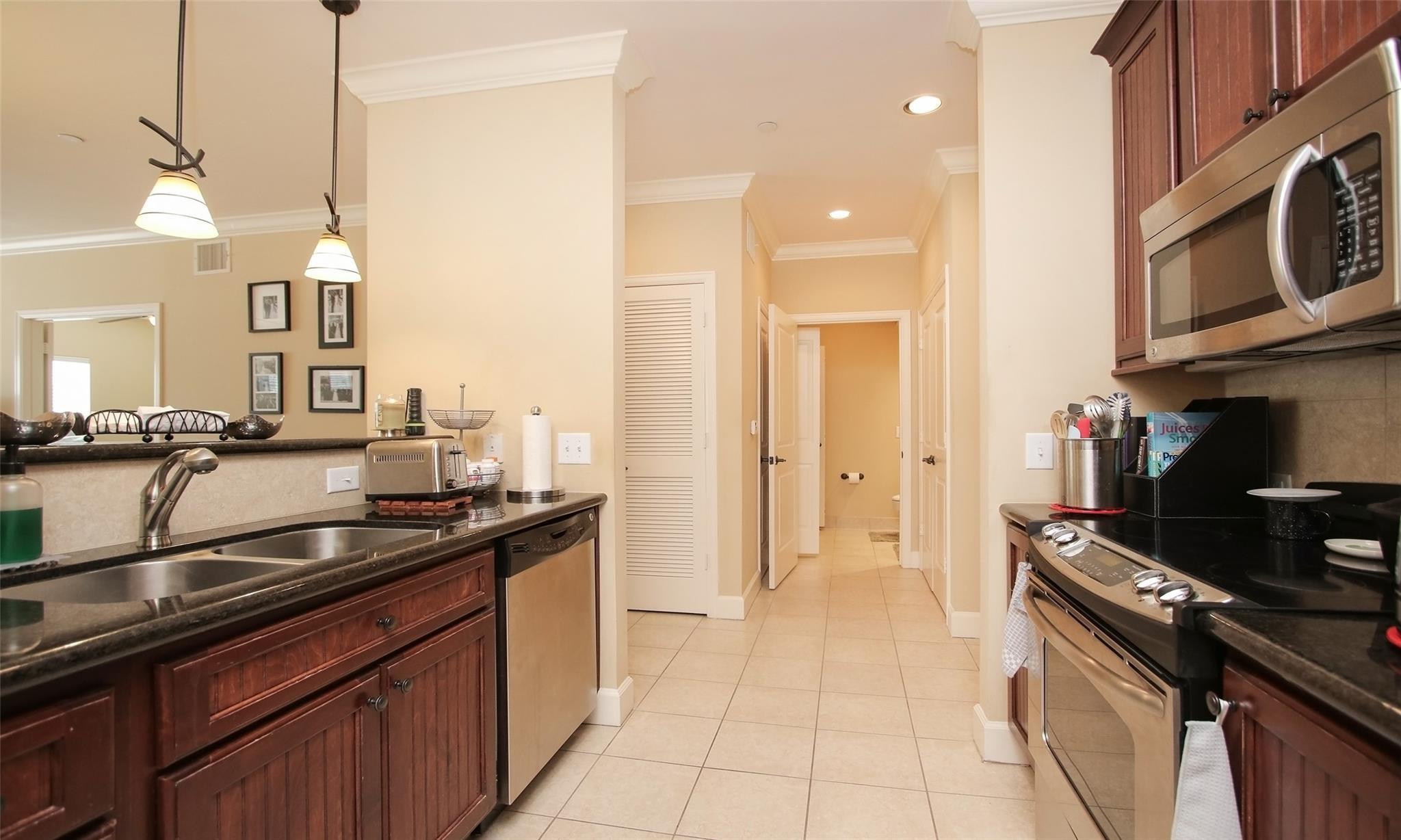 Welcome to Serento! Conveniently located within walking distance to the Medical Center, close to hospitals, restaurants, shopping, and NRG stadium. This beautiful and impeccably maintained unit features an open dining living area, crown molding, engineered wood floors, granite countertops, in-unit laundry, a Primary en-suite with a large tub/shower combo, and 1/2 bathroom for guests. The recessed lighting has been upgraded to temperature-adjusting LED cans, an new Water Heater., and new dryer. The building has limited amenities like a gym, a community outdoor terrace, and dog area. Schedule your showing today!