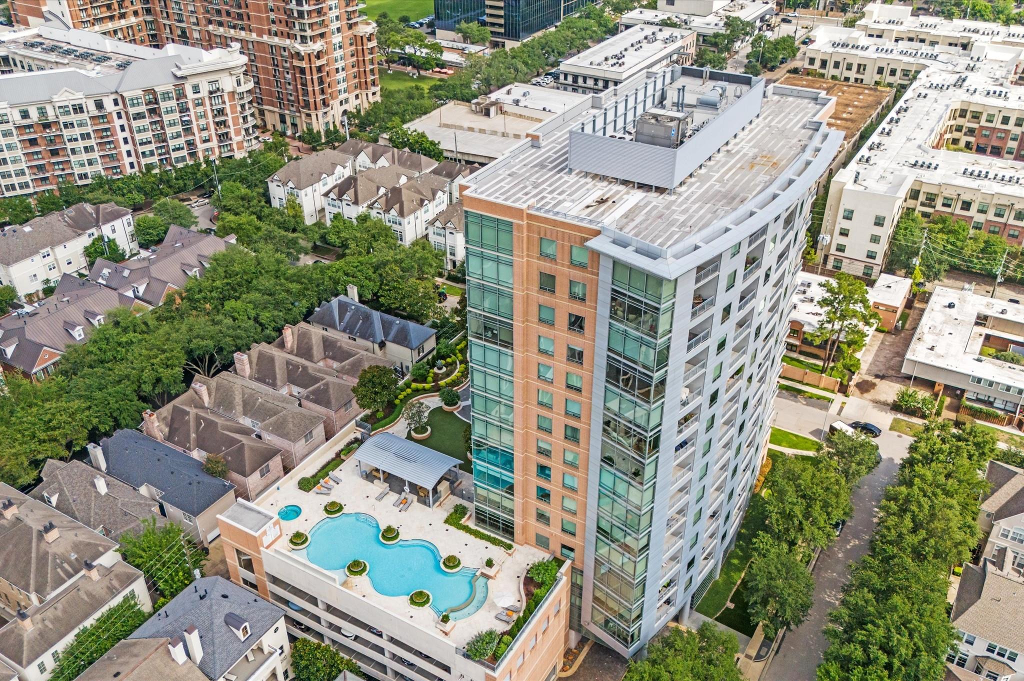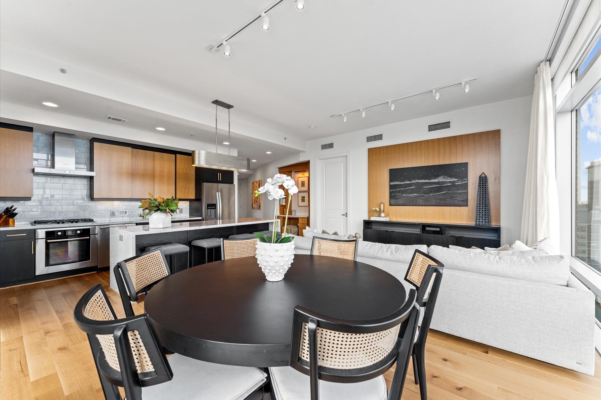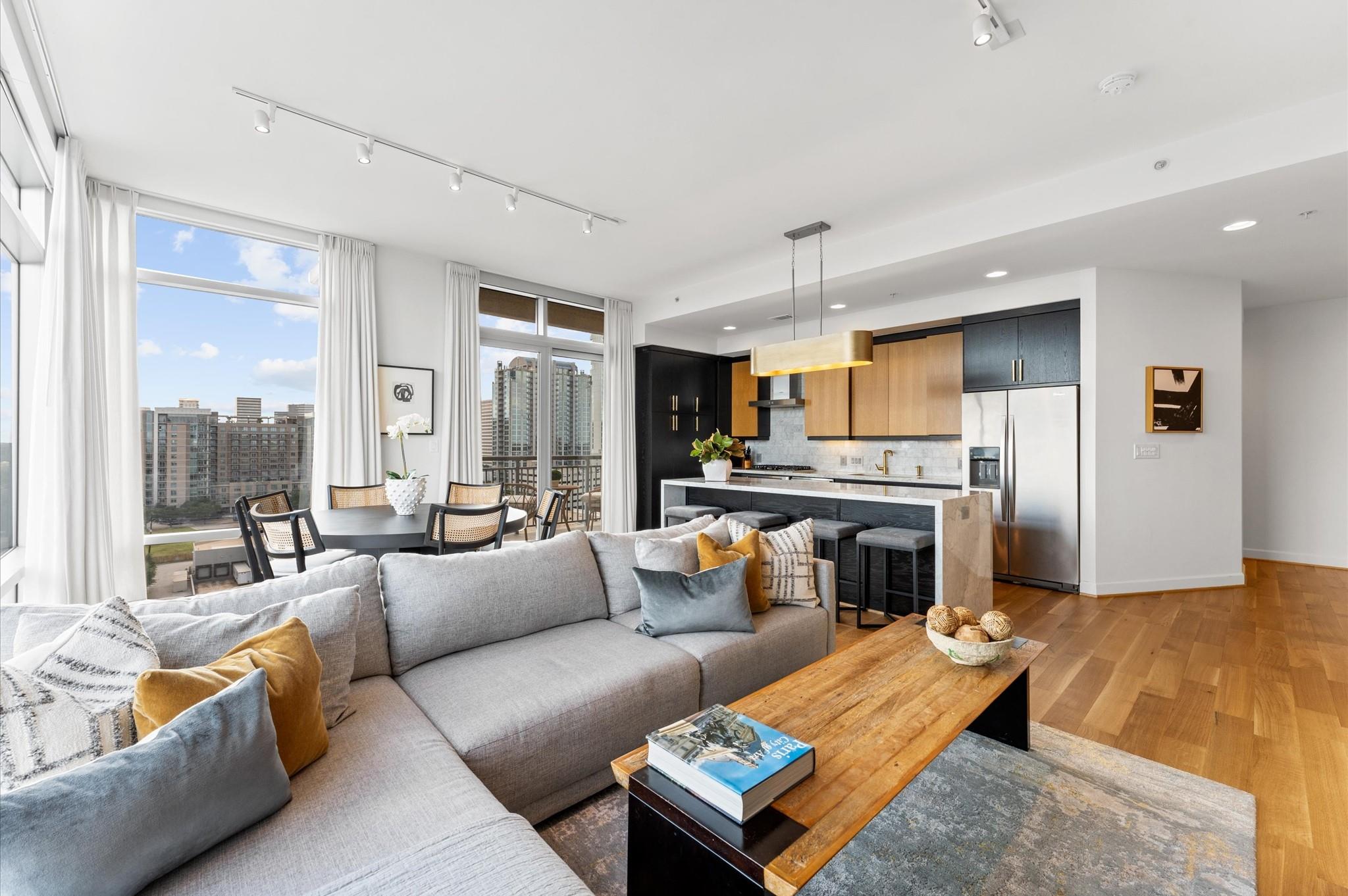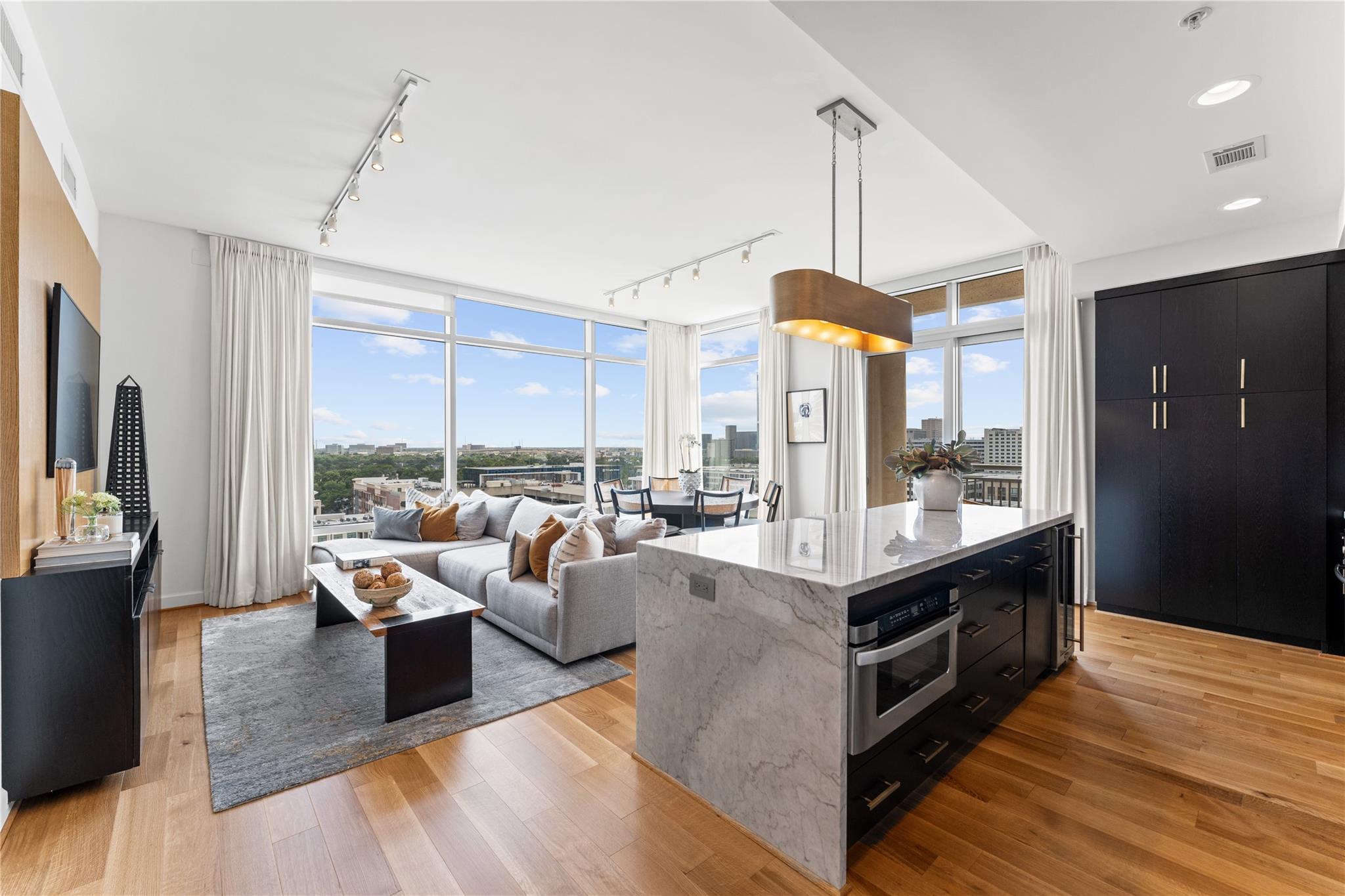 Experience elevated living in this impeccably maintained 11th-floor residence. This high-end condominium features newly installed wide plank engineered hardwood floors that flow seamless throughout, adding warmth and contemporary elegance. Floor-to-ceiling windows flood the space with natural light, enhanced by automated electric blinds. A custom-built desk area offers ideal blend of form and function. The open-concept layout centers around exquisite infinity marble island kitchen, perfect for entertaining, complete with Bosch gas cooktop, and wine cooler. Building amenities include an infinity pool, hot tub, gas fireplaces and grill area with a TV. inside amenities includes gym, lounge and catering kitchen.2 assigned parking spaces and climate controlled storage unit. Building offers valet parking and 24 hours concierge. Walking distance to the prestigious River Oaks District.