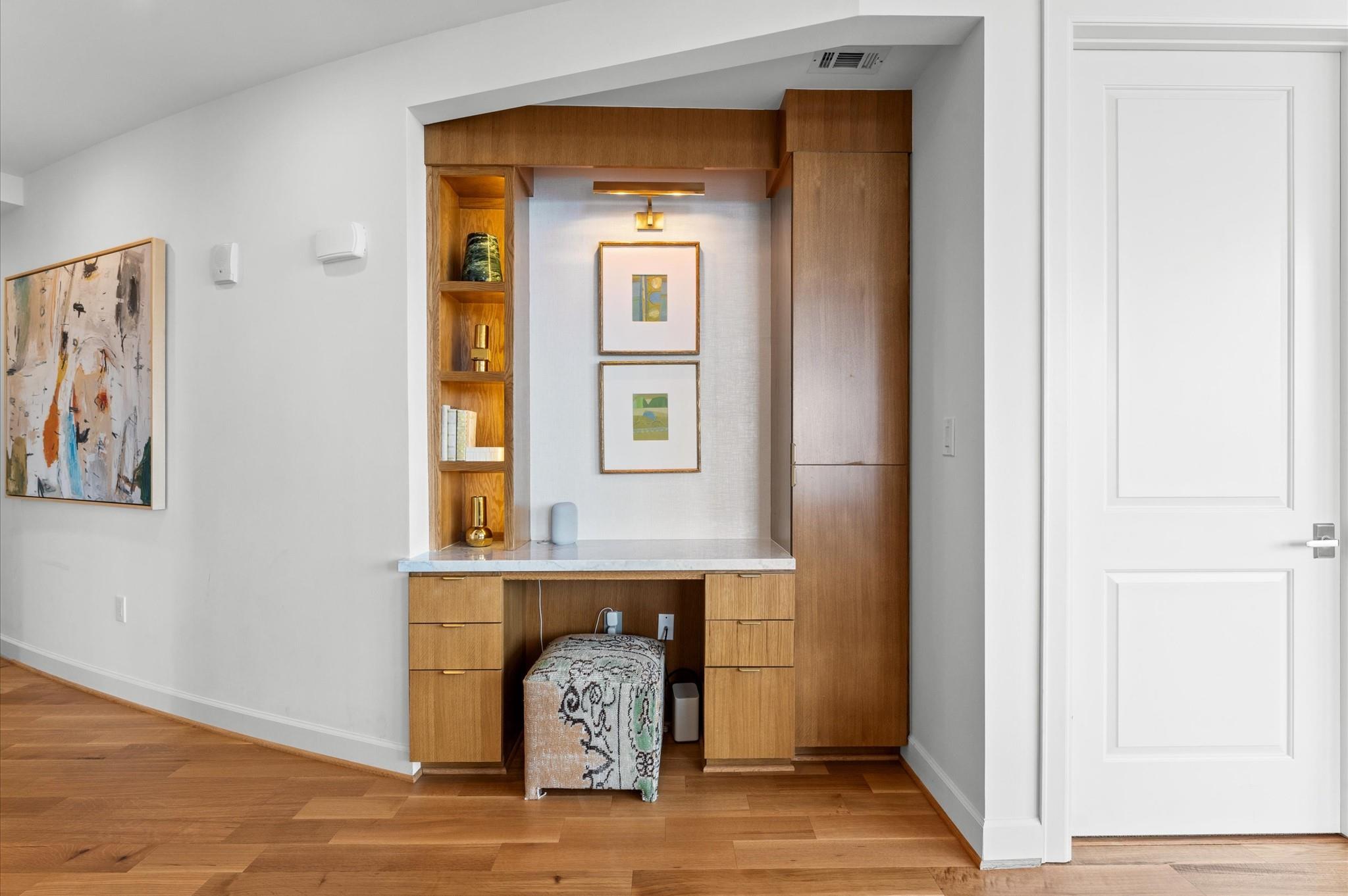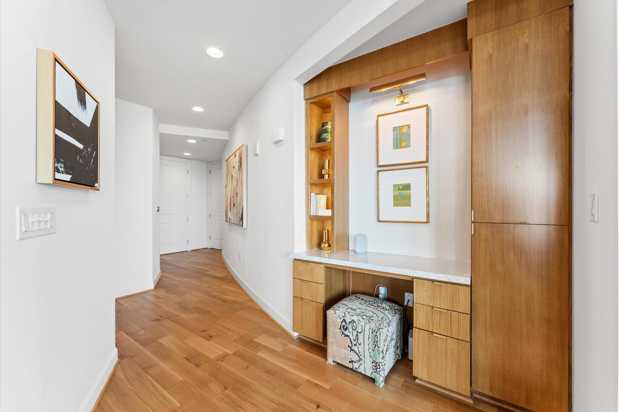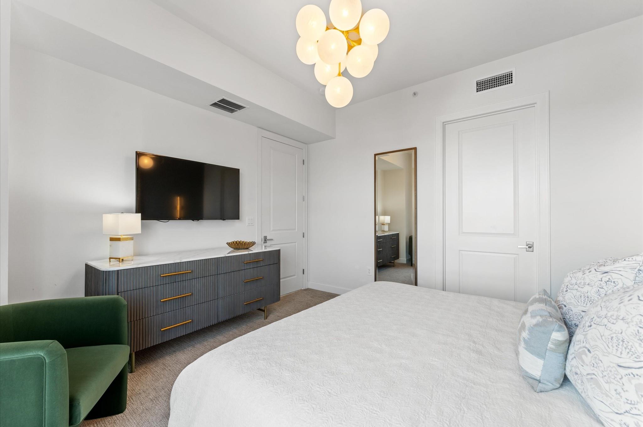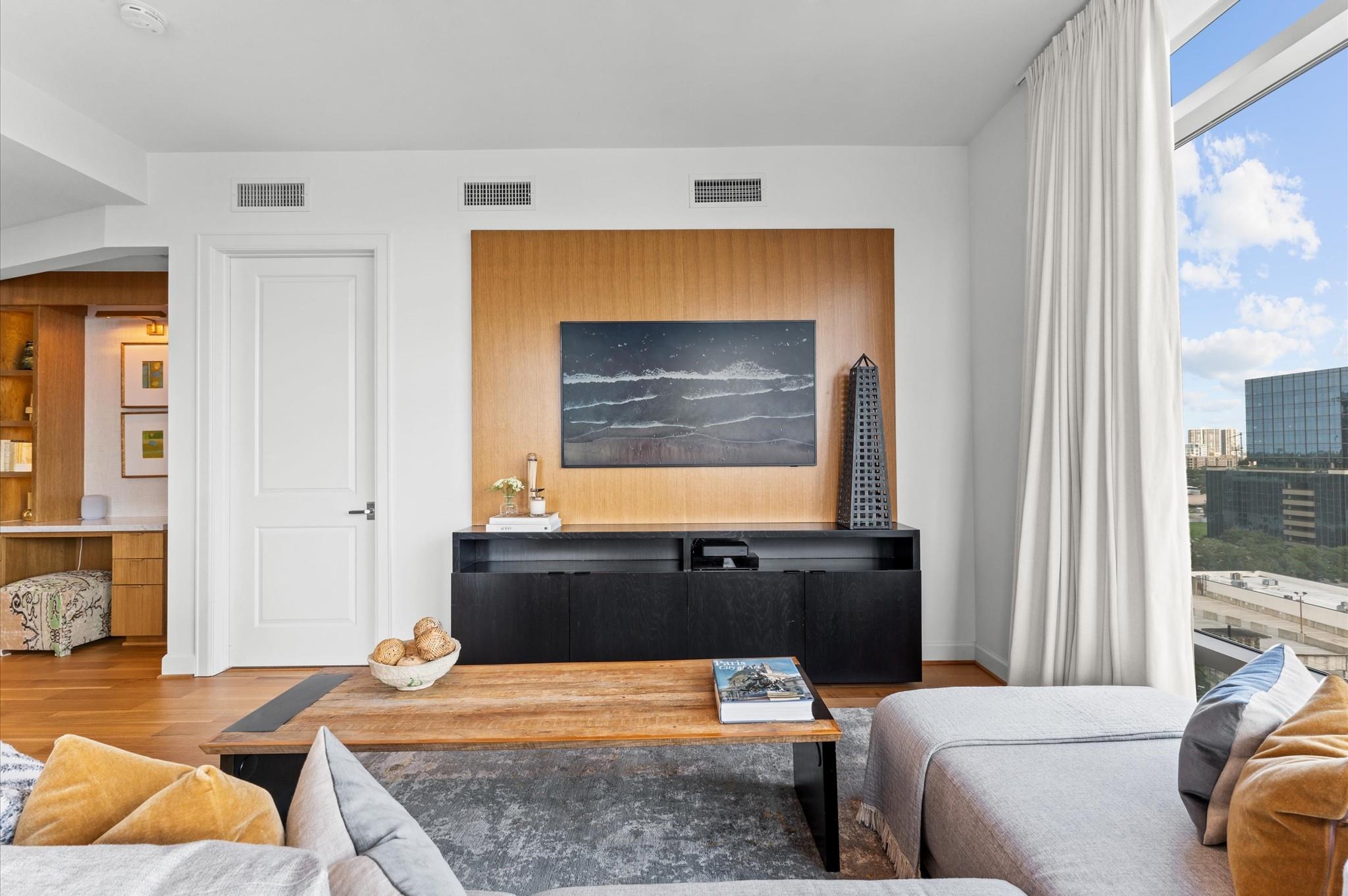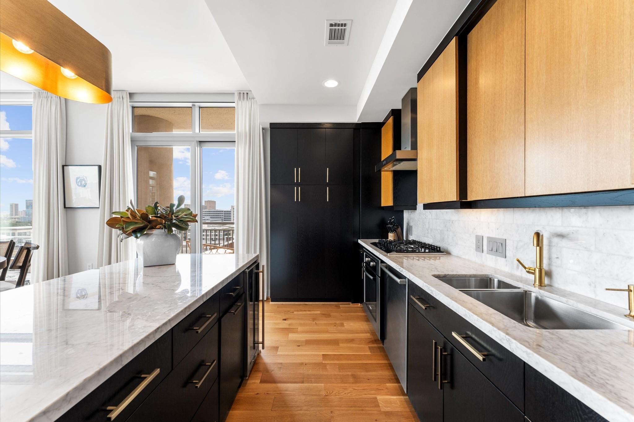 Experience elevated living in this impeccably maintained 11th-floor residence. This high-end condominium features newly installed wide plank engineered hardwood floors that flow seamless throughout, adding warmth and contemporary elegance. Floor-to-ceiling windows flood the space with natural light, enhanced by automated electric blinds. A custom-built desk area offers ideal blend of form and function. The open-concept layout centers around exquisite infinity marble island kitchen, perfect for entertaining, complete with Bosch gas cooktop, and wine cooler. Building amenities include an infinity pool, hot tub, gas fireplaces and grill area with a TV. inside amenities includes gym, lounge and catering kitchen.2 assigned parking spaces and climate controlled storage unit. Building offers valet parking and 24 hours concierge. Walking distance to the prestigious River Oaks District.