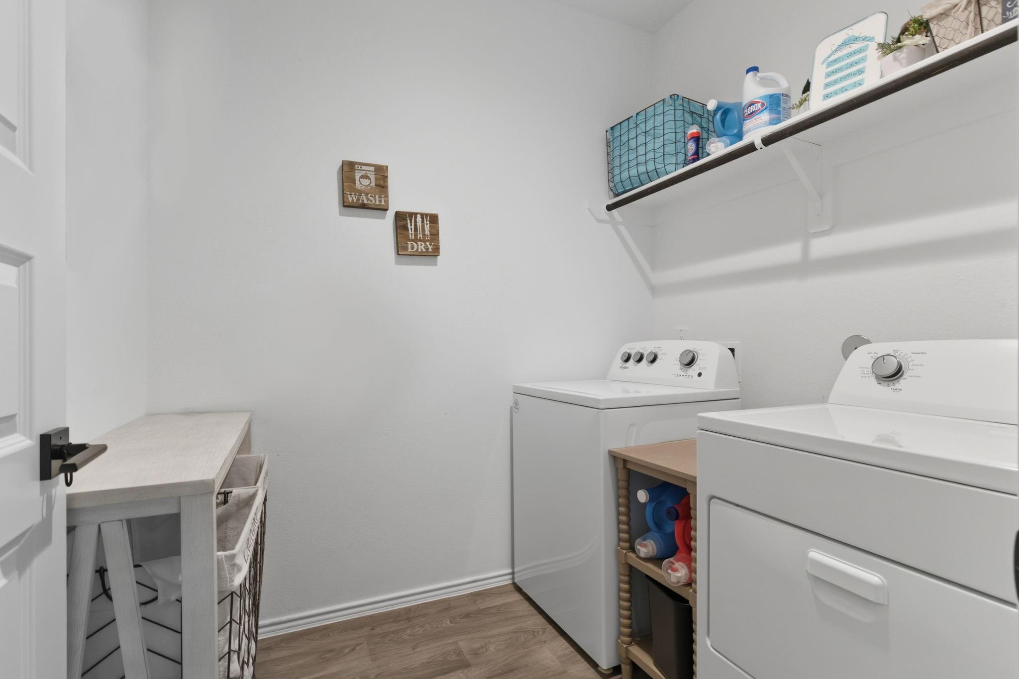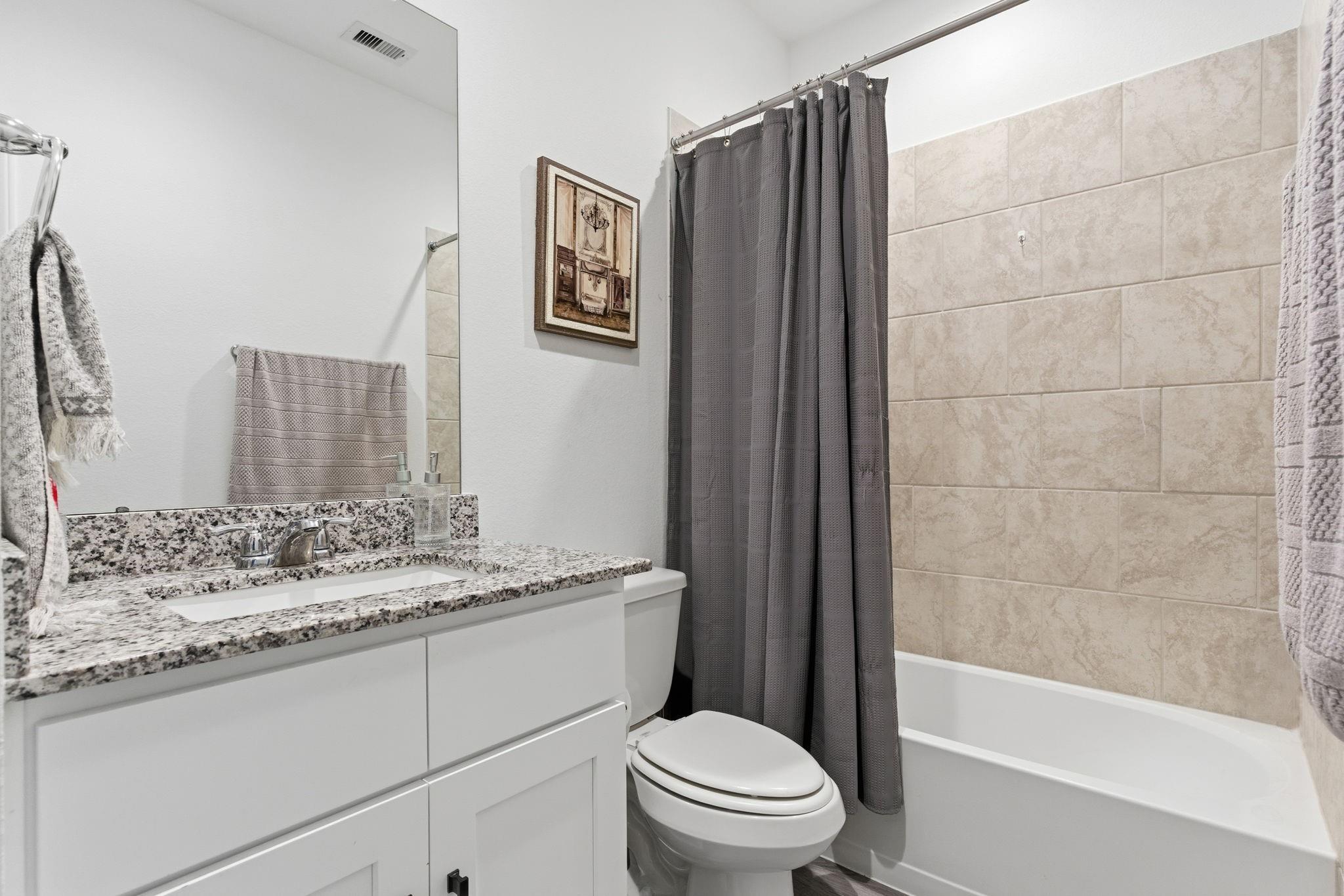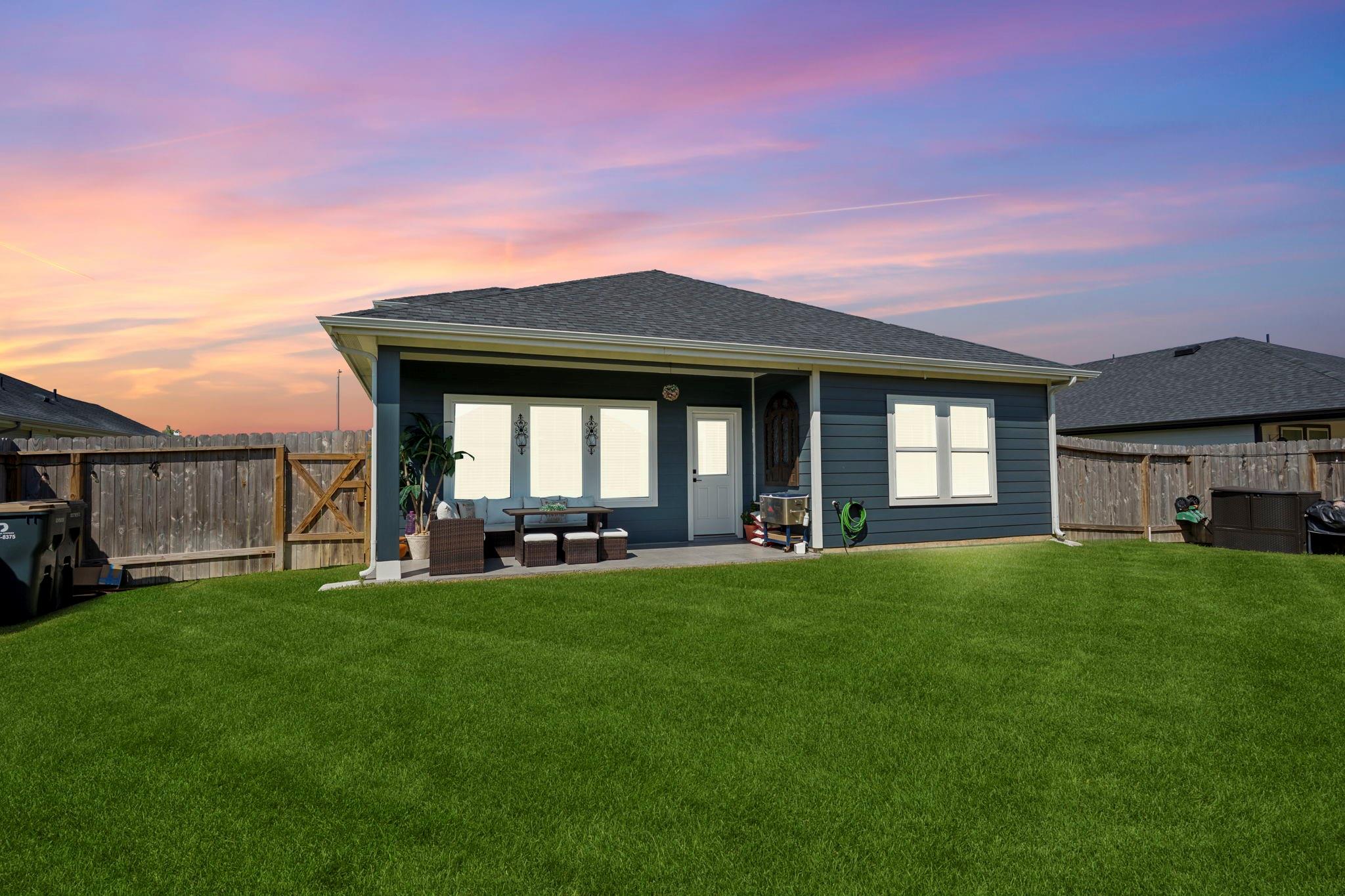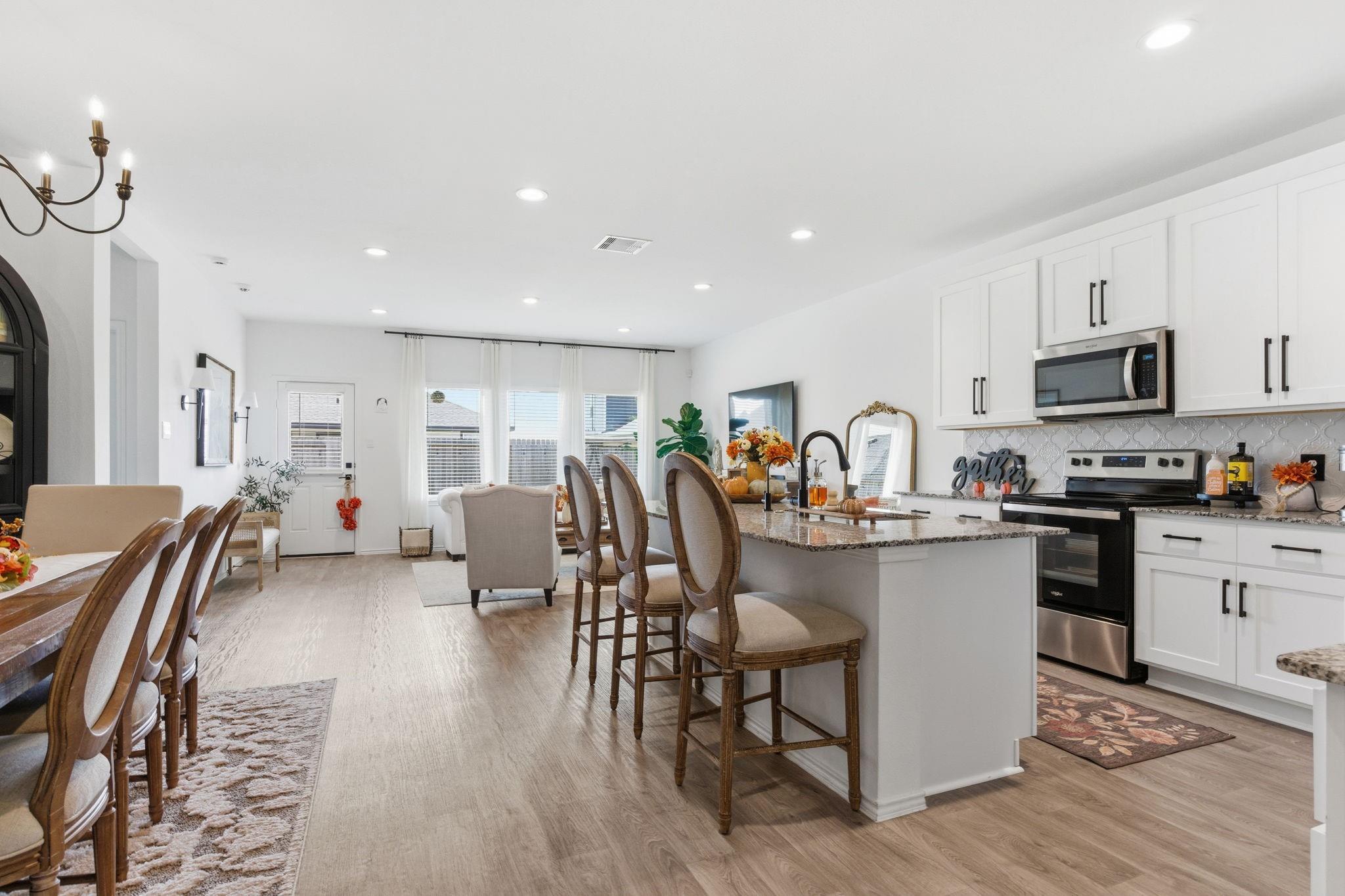 Welcome to this beautifully designed two-story home featuring modern finishes and a charming farmhouse elevation. As you walk into your recently tiled entry way, you're welcoming by the open-concept living area that is filled with natural light and showcases vinyl wood flooring throughout. The gourmet kitchen features granite countertops with upgraded backsplash, tall shaker cabinets with recently added cabinet pulls, stainless steel appliances, and a large eat-in island. Upgraded chandeliers in dining and foyer add to your new homes cozy, inviting ambience. This spacious layout offers a primary bedroom on the first floor with a full bath. The primary bath includes dual granite vanities, a massive shower, and a walk-in closet. Upstairs, you’ll find a game room, three bedrooms, and a full bath with granite finishes. Enjoy outdoor living with a covered patio and a fully fenced backyard on a large 60' lot! Additional highlights include access to community pools, playground, and clubhous