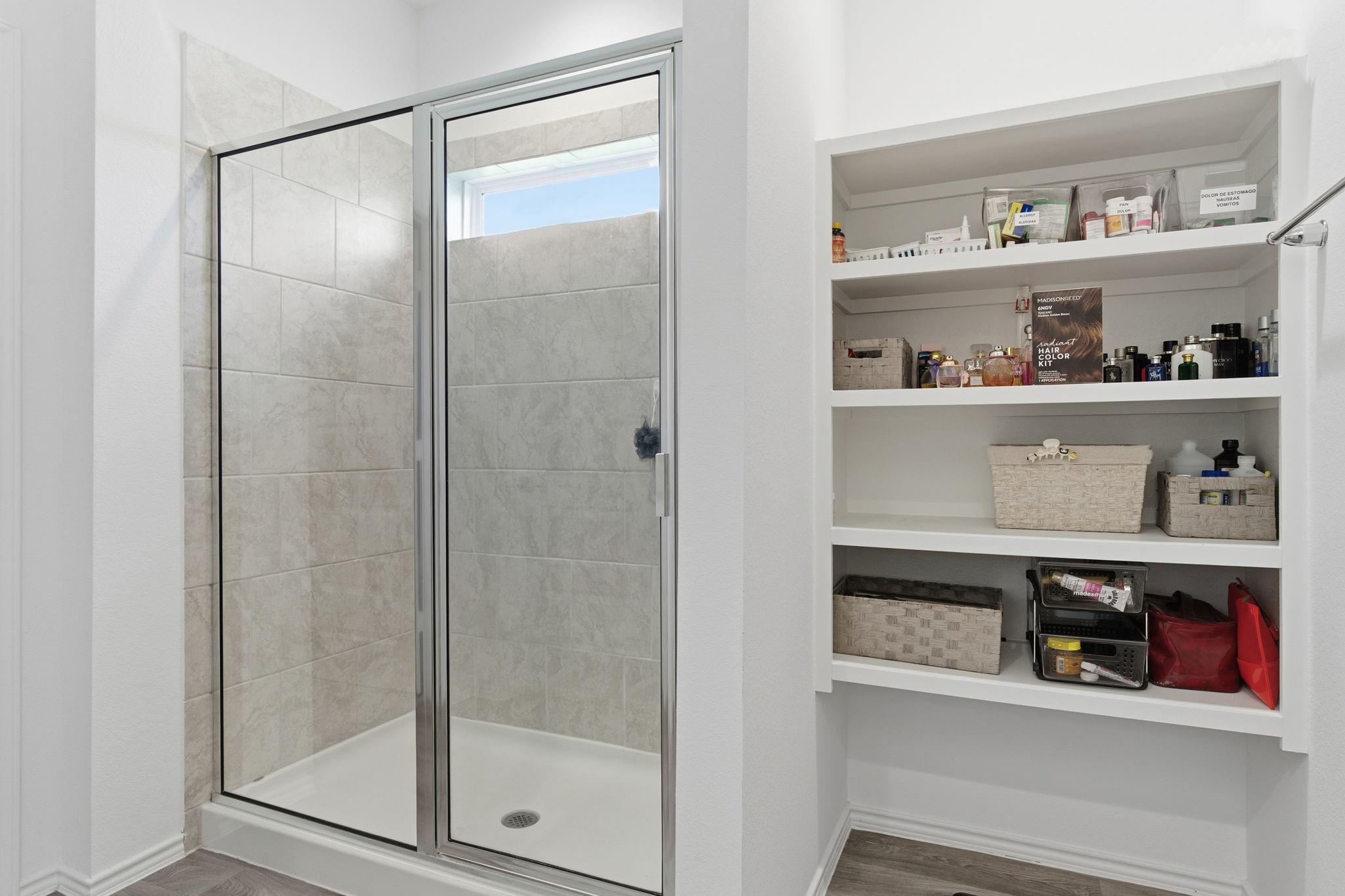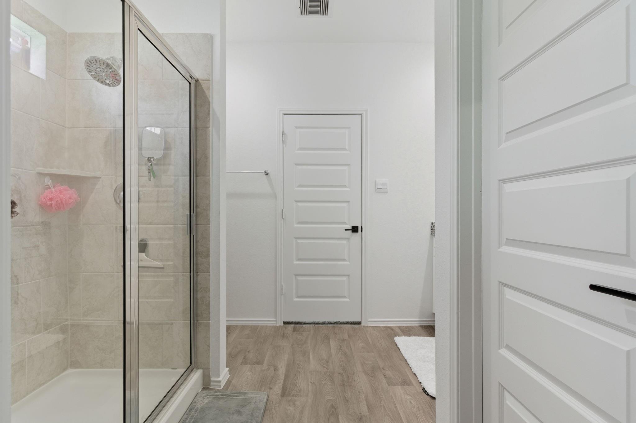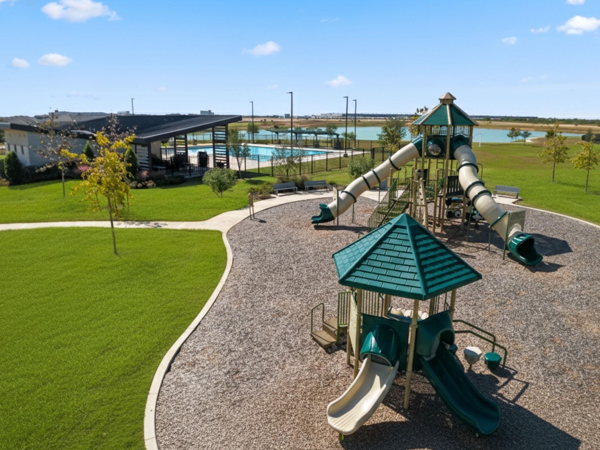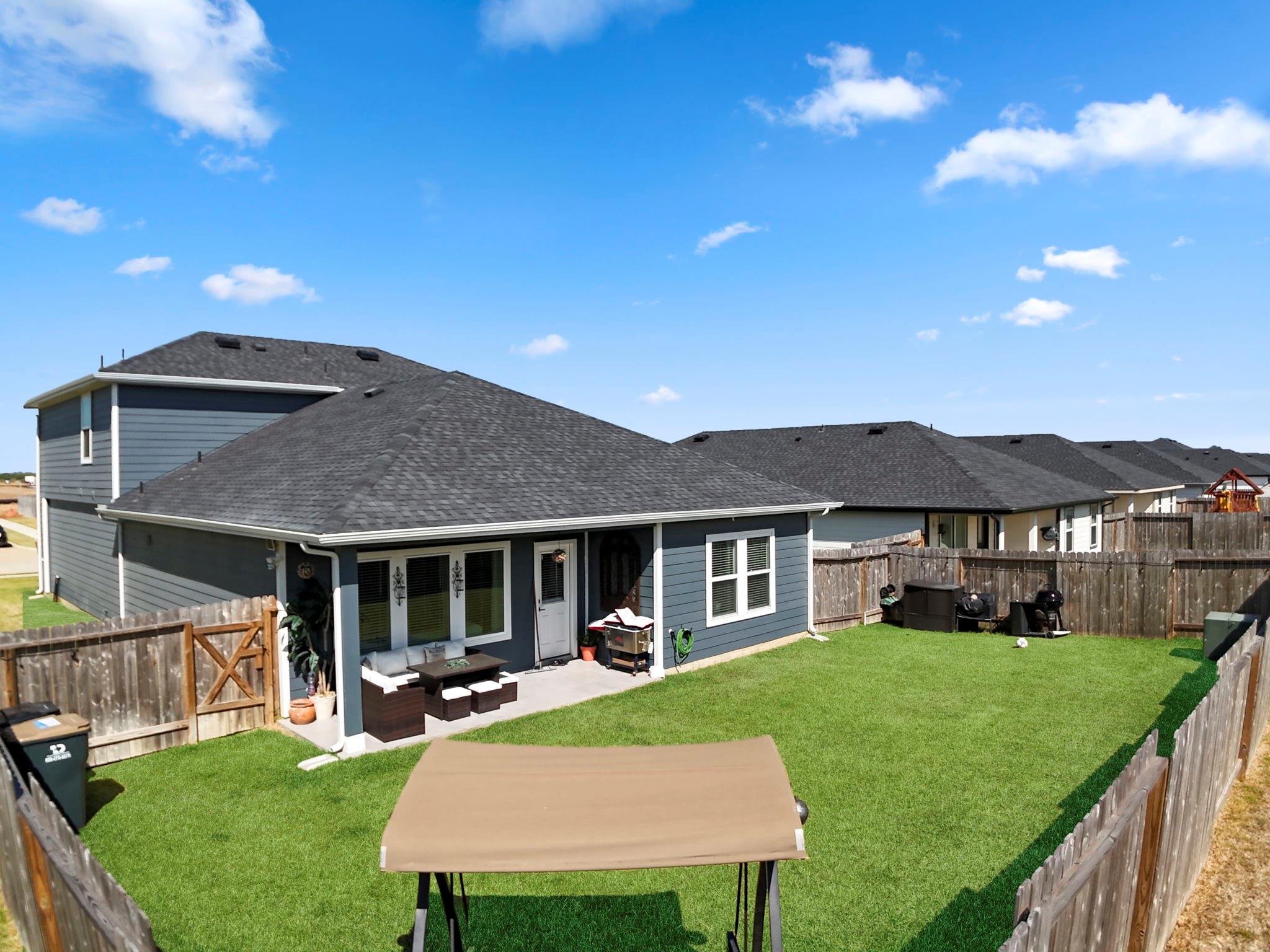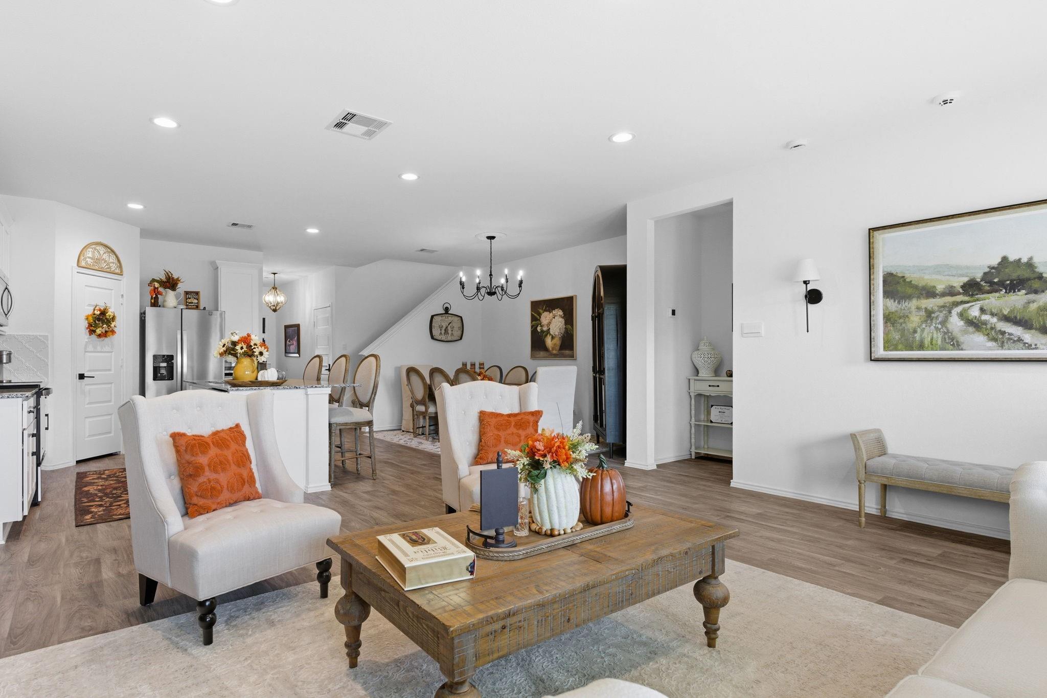 Welcome to this beautifully designed two-story home featuring modern finishes and a charming farmhouse elevation. As you walk into your recently tiled entry way, you're welcoming by the open-concept living area that is filled with natural light and showcases vinyl wood flooring throughout. The gourmet kitchen features granite countertops with upgraded backsplash, tall shaker cabinets with recently added cabinet pulls, stainless steel appliances, and a large eat-in island. Upgraded chandeliers in dining and foyer add to your new homes cozy, inviting ambience. This spacious layout offers a primary bedroom on the first floor with a full bath. The primary bath includes dual granite vanities, a massive shower, and a walk-in closet. Upstairs, you’ll find a game room, three bedrooms, and a full bath with granite finishes. Enjoy outdoor living with a covered patio and a fully fenced backyard on a large 60' lot! Additional highlights include access to community pools, playground, and clubhous