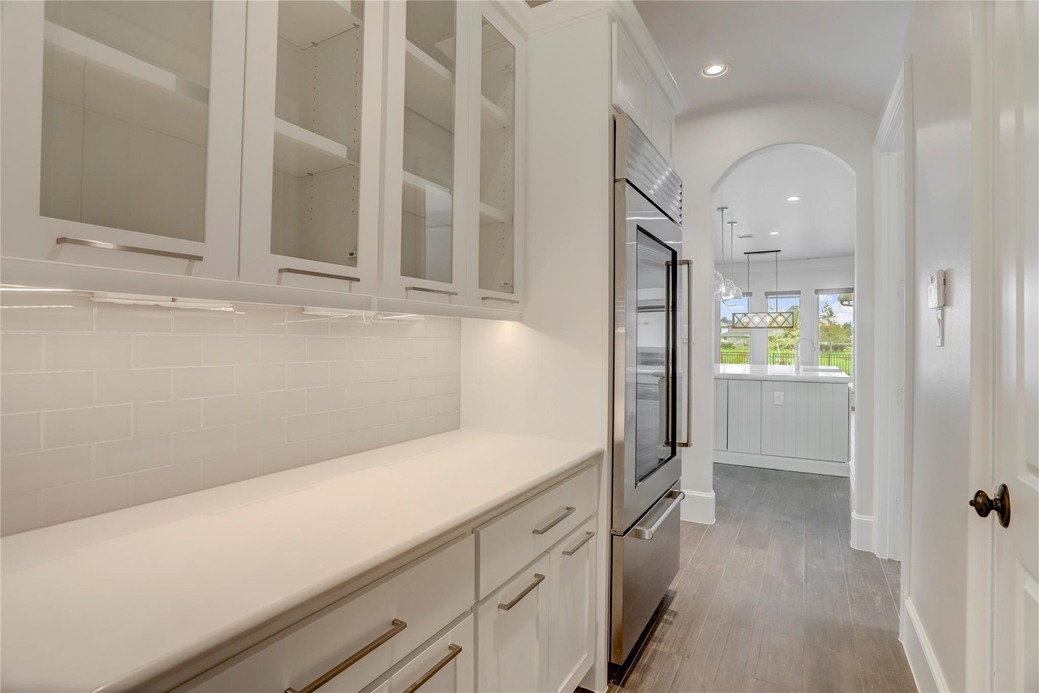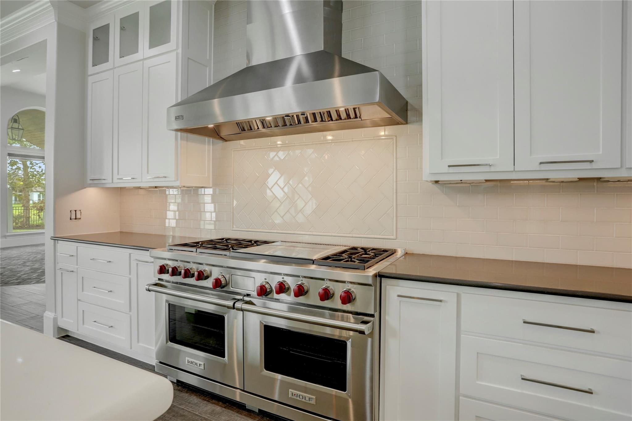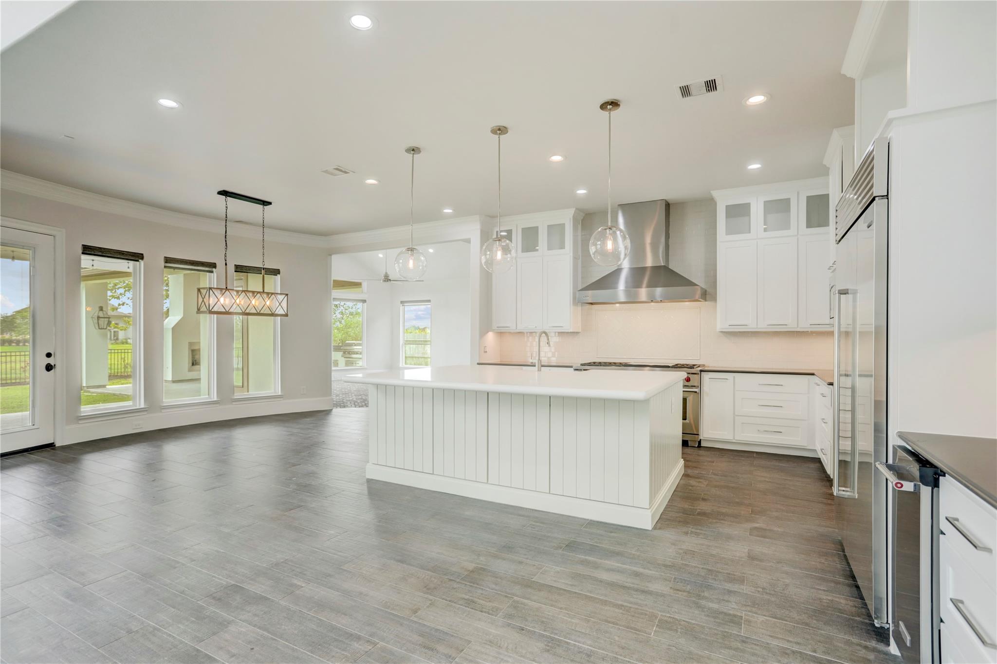 RARE opportunity to be on the lake! Fresh paint inside and out, new carpet, new front doors with new keypad entry. This home is ready for you! Inside you will find duel staircases, a brick floored game room, sunken wine room with a Sub Zero Wine fridge, 22' stone fireplace, a Chef's kitchen featuring a quartz countertop island (with sink), 2 built in Sub Zero refrigerators, a separate ice maker, 60" Duel Fuel WOLF range with Viking Hood! If you love to host, this is your house! The kitchen is open and splits the game & family room featuring floor to ceiling windows with a STUNNING lake view! The primary bathroom has a HUGE walk in closet, double vanities/sinks and a walk in shower with 2 separate shower heads and controls. Upstairs has 3 bedrooms and a media room. Garage is bigger & deeper than normal; 24' wide, 18' wide door x 8' tall Enjoy the view of the lake under your covered outdoor kitchen w/NatGas Grill and fireplace. Walkable to new Cline Elementary and Friendswood JH.