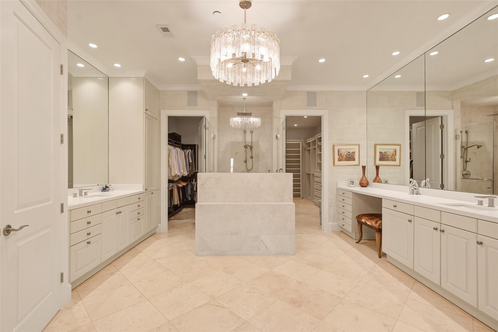 Exceptional residence in the prestigious Chateau 10, an intimate midrise building featuring 10 luxury units in prime River Oaks. The heart of this home showcases a chef's kitchen outfitted with premium Eggersmann German cabinetry, a striking oversized island featuring unique backlit onyx, and professional-grade Thermador appliances. Elegant travertine floors flow throughout the residence, complemented by 10-foot ceilings adorned with crown molding. The formal dining room and expansive living area create ideal spaces for entertaining. Three bedrooms, each with en-suite bathrooms, feature glass-enclosed showers and Eggersmann cabinetry. Solid-iron panoramic sliding doors open to a private balcony offering stunning downtown Houston views. Two side-by-side parking spaces and dedicated storage complete this offering. The location provides convenient access to upscale dining and shopping, while being zoned to the highly-rated River Oaks Elementary school.