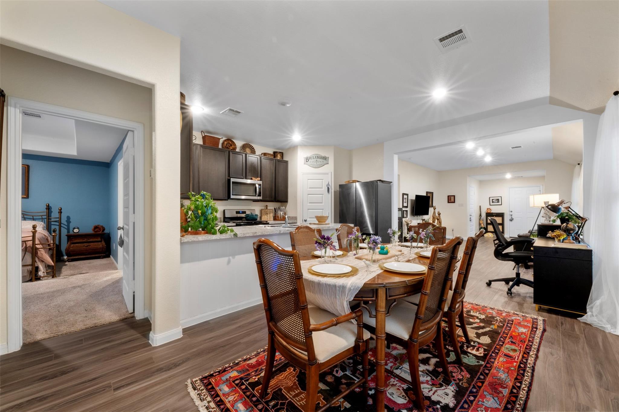 InteriorFloors:Carpet,Vinyl PlankBathroom Description:Half Bath,Primary Bath: Shower Only,Secondary Bath(s): Tub/Shower ComboBedroom Desc:All Bedrooms Down,Primary Bed - 1st Floor,Walk-In ClosetKitchen Desc:Breakfast Bar,Kitchen open to Family Room,Walk-in PantryRoom Description:1 Living Area,Breakfast Room,Entry,Utility Room in HouseHeating:Central GasCooling:Central ElectricConnections:Electric Dryer Connections,Washer ConnectionsDishwasher:YesDisposal:YesMicrowave:YesRange:Gas RangeOven:Electric OvenEnergy Feature:Attic Vents,Digital Program Thermostat,HVAC>13 SEER,Insulated/Low-E windows,Insulation - Batt,Insulation - Blown Fiberglass,Radiant Attic BarrierInterior:Dryer Included,Fire/Smoke Alarm,Formal Entry/Foyer,High Ceiling,Refrigerator Included,Washer Included
