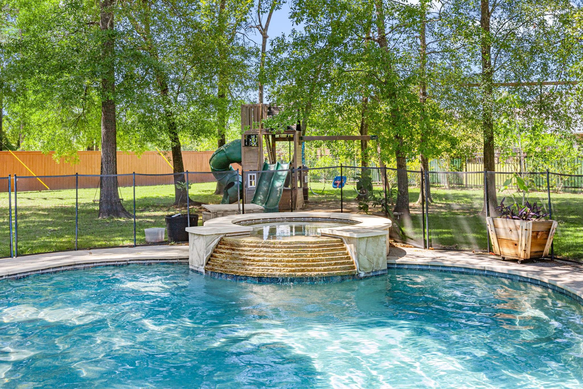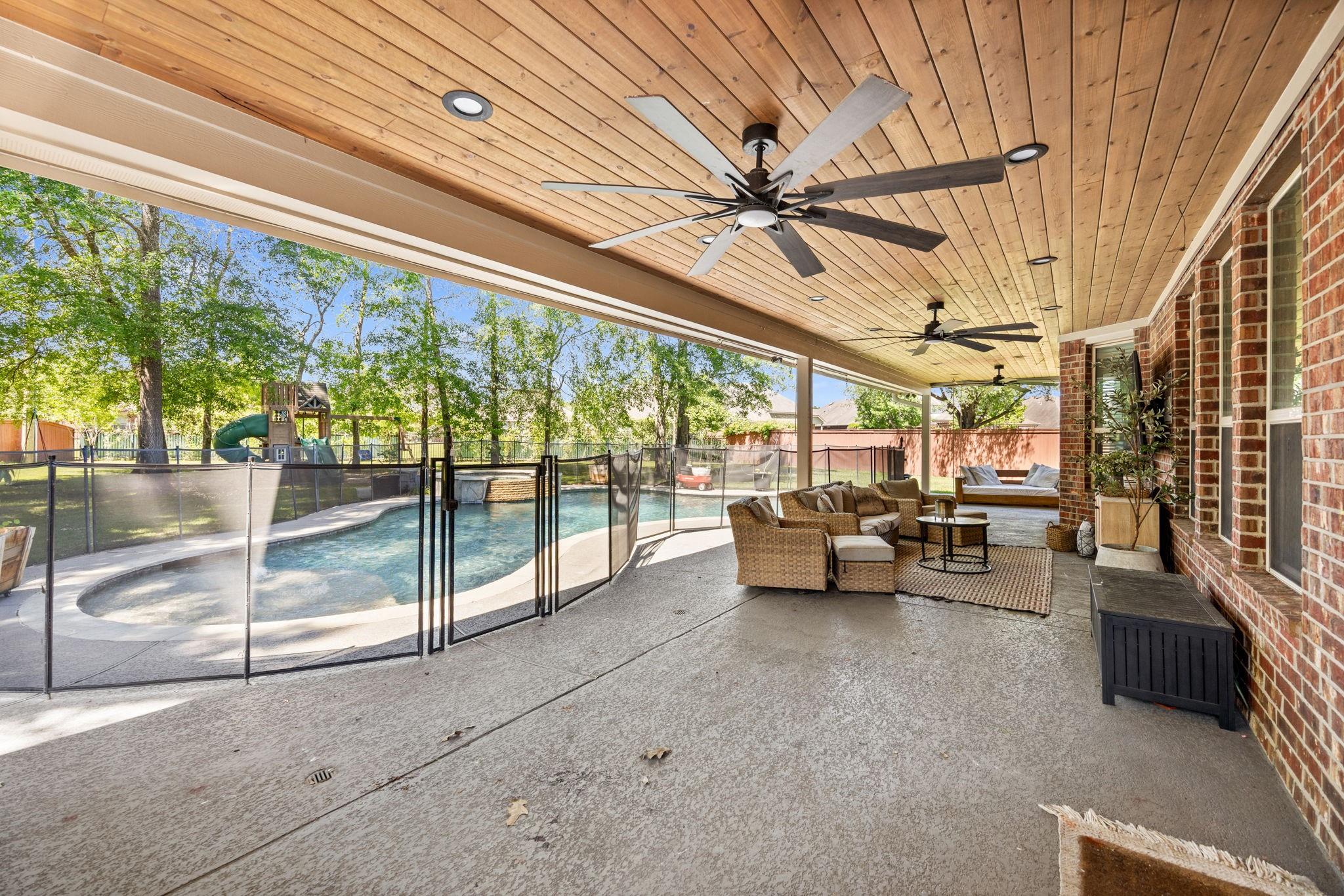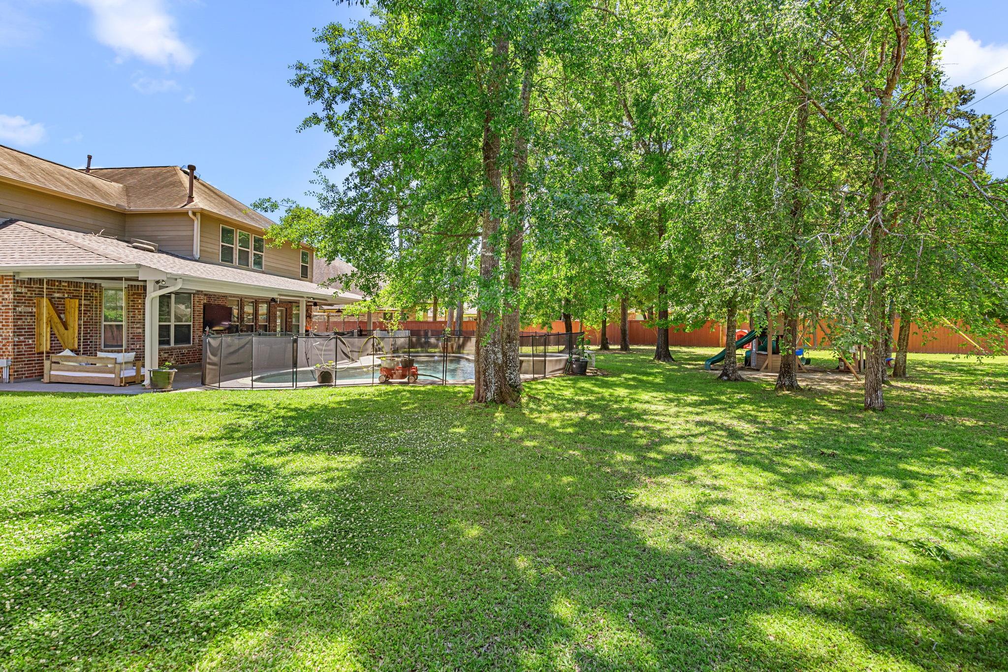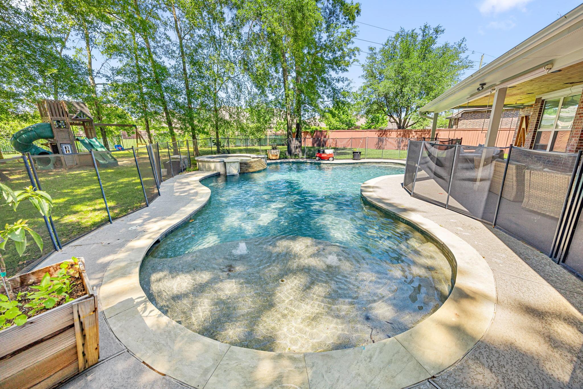 Welcome to this exceptional 4-bedroom, 3.5-bath home in the highly sought-after Woodridge Forest community. Situated on an oversized 1/3+ acre lot with no back neighbors, this property offers privacy and resort-style outdoor living. Enjoy a covered outdoor kitchen, expansive patio, and a stunning in-ground gunite pool featuring a beach entry and spa with a waterfall overflow. Inside, the home boasts a spacious open-concept design with hardwood floors, exposed brick accents, and refined finishes throughout. The large primary suite offers a luxurious retreat, complemented by a dedicated study, media room, and game room—perfect for work and play. This home blends comfort, elegance, and entertainment in one incredible package.