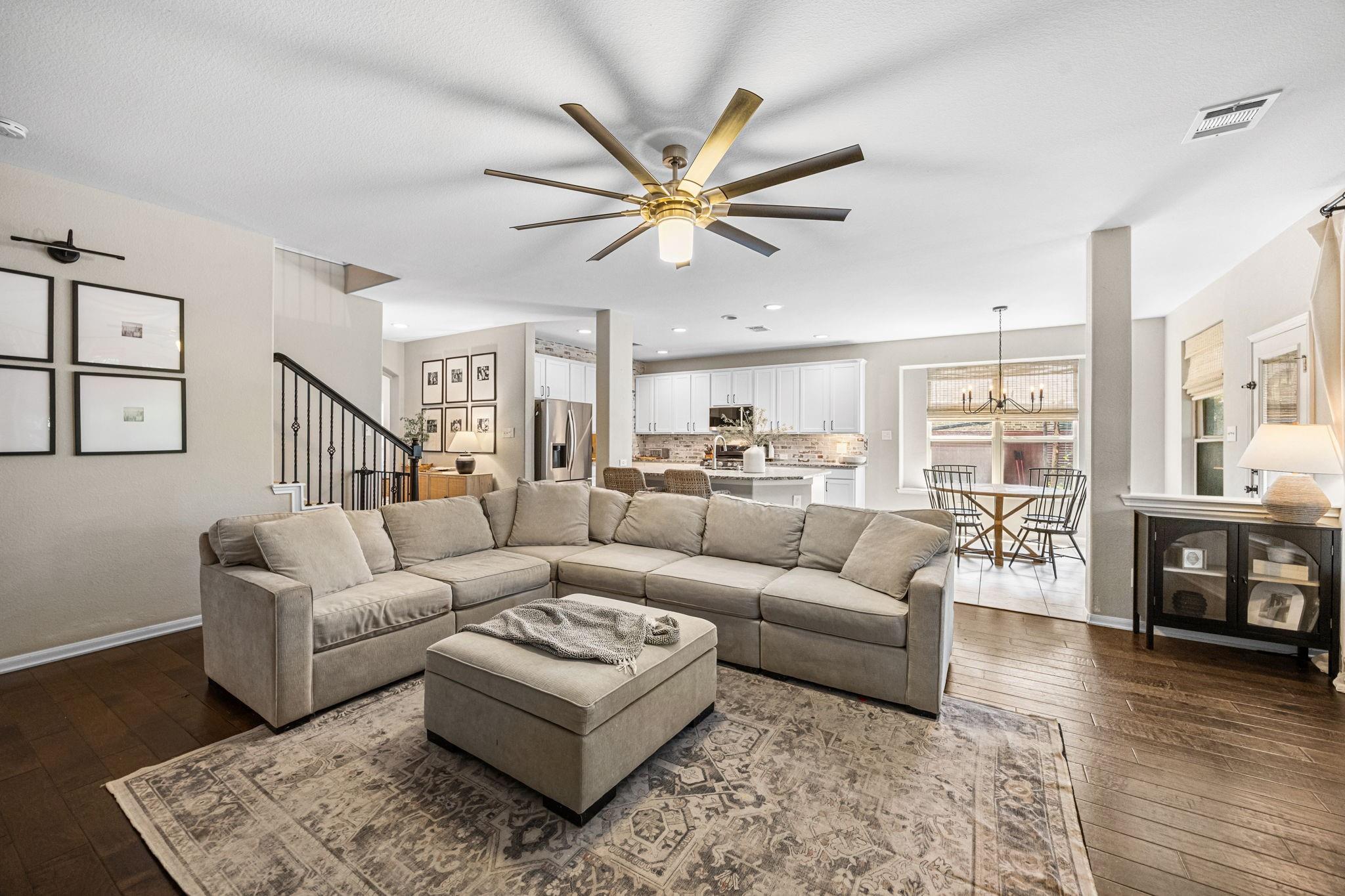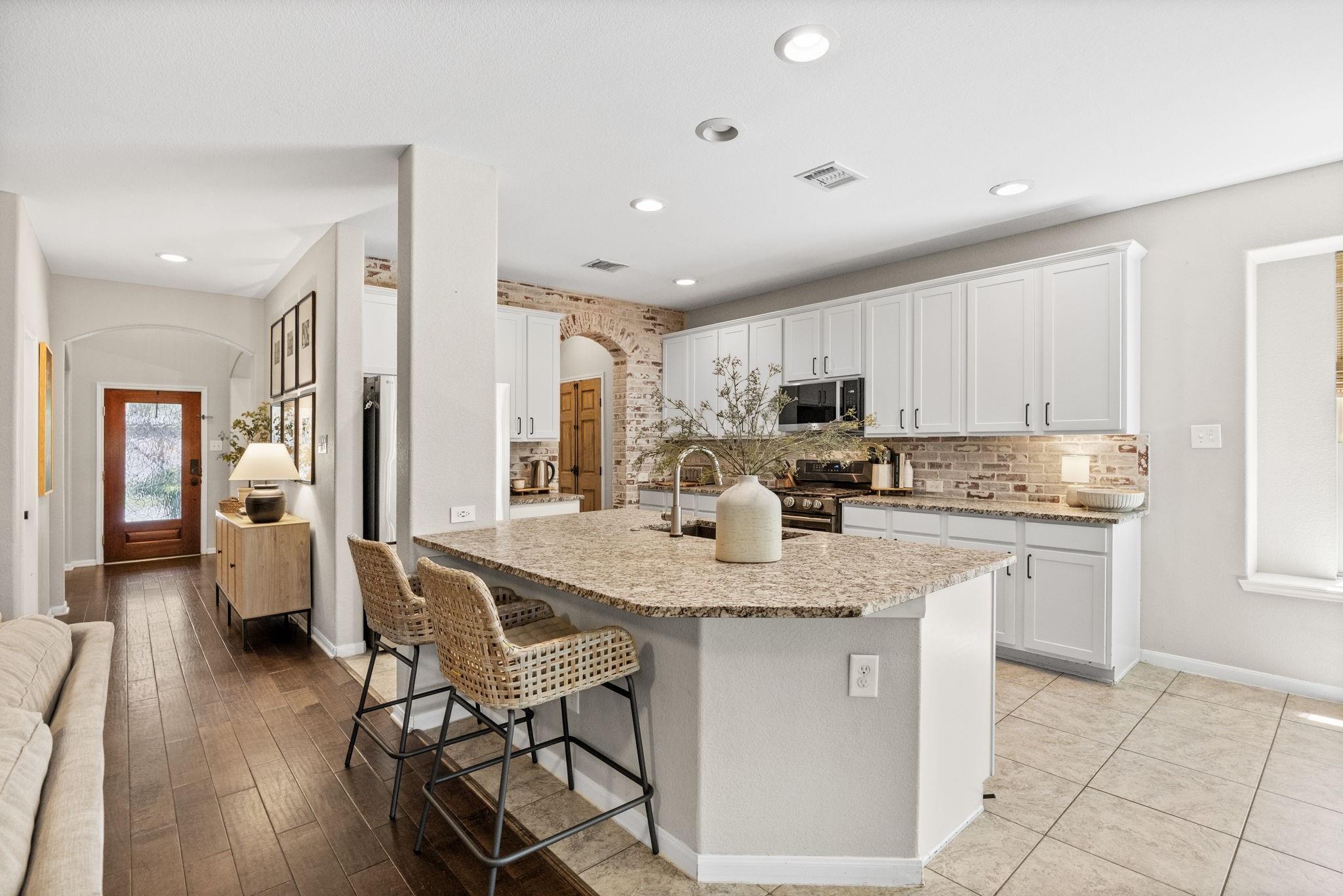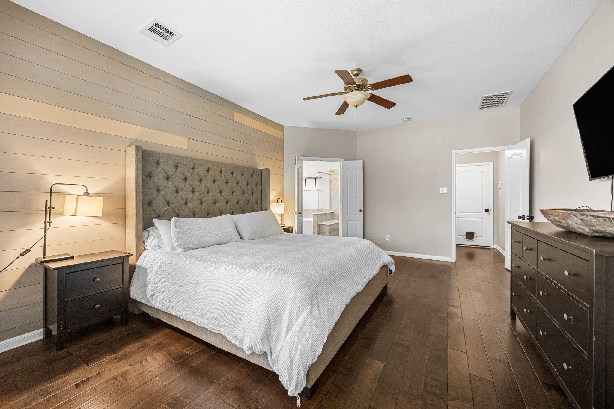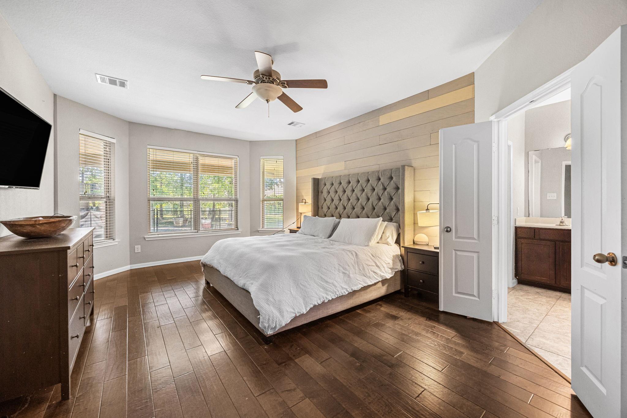 Welcome to this exceptional 4-bedroom, 3.5-bath home in the highly sought-after Woodridge Forest community. Situated on an oversized 1/3+ acre lot with no back neighbors, this property offers privacy and resort-style outdoor living. Enjoy a covered outdoor kitchen, expansive patio, and a stunning in-ground gunite pool featuring a beach entry and spa with a waterfall overflow. Inside, the home boasts a spacious open-concept design with hardwood floors, exposed brick accents, and refined finishes throughout. The large primary suite offers a luxurious retreat, complemented by a dedicated study, media room, and game room—perfect for work and play. This home blends comfort, elegance, and entertainment in one incredible package.