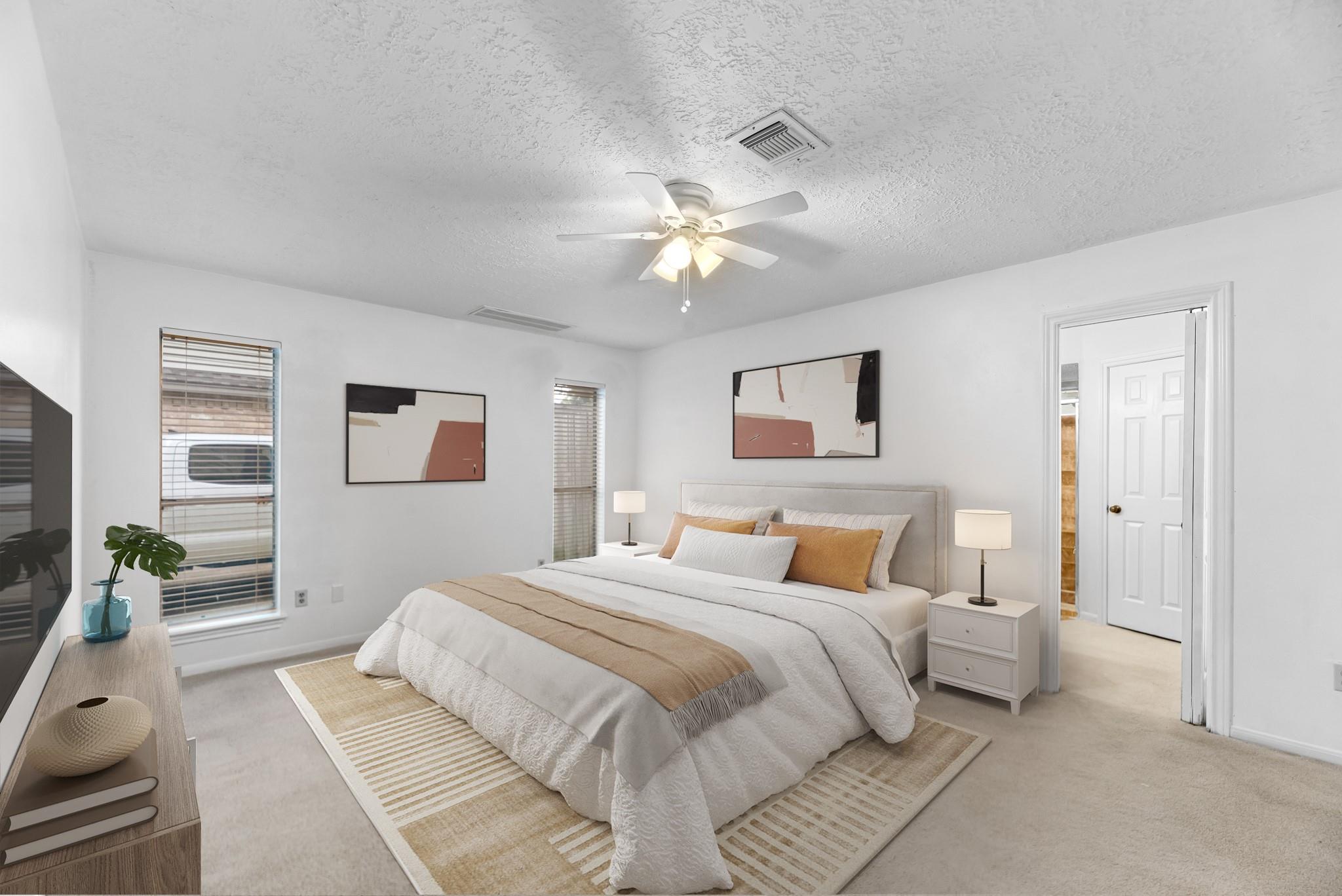 Brand-new roof and interior paint! Entering this home, you are met with high ceilings, plenty of natural light, and incredible storage. The primary suite includes two walk-in closets and an oversized bedroom. The downstairs area includes a formal dining room, kitchen with plenty of storage, full bar adjacent to the living room, laundry room, and large pantry. The downstairs bath is accessible by the downstairs oversized bedroom and living room, across from a large linen closet. Upstairs lies a large game room with walk-in attic space, another oversized bedroom and a full bathroom. The home boasts a courtyard near the front door, a home security system, new sprinkler system and garage door, and ceiling fans throughout. With easy access to the local elementary school and I-10, commuting and dropping kids off at school will be a breeze. Schedule your showing today!