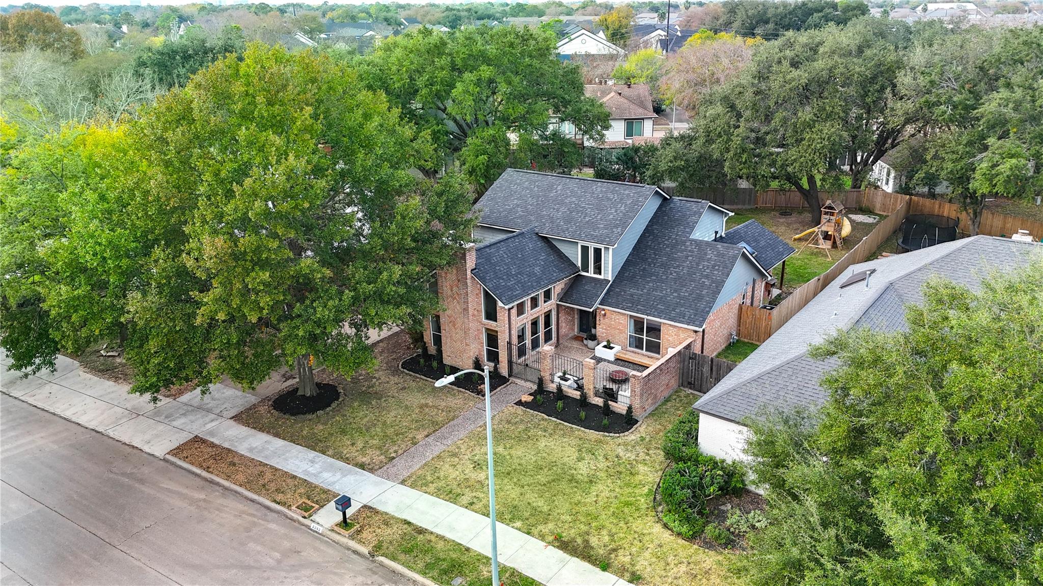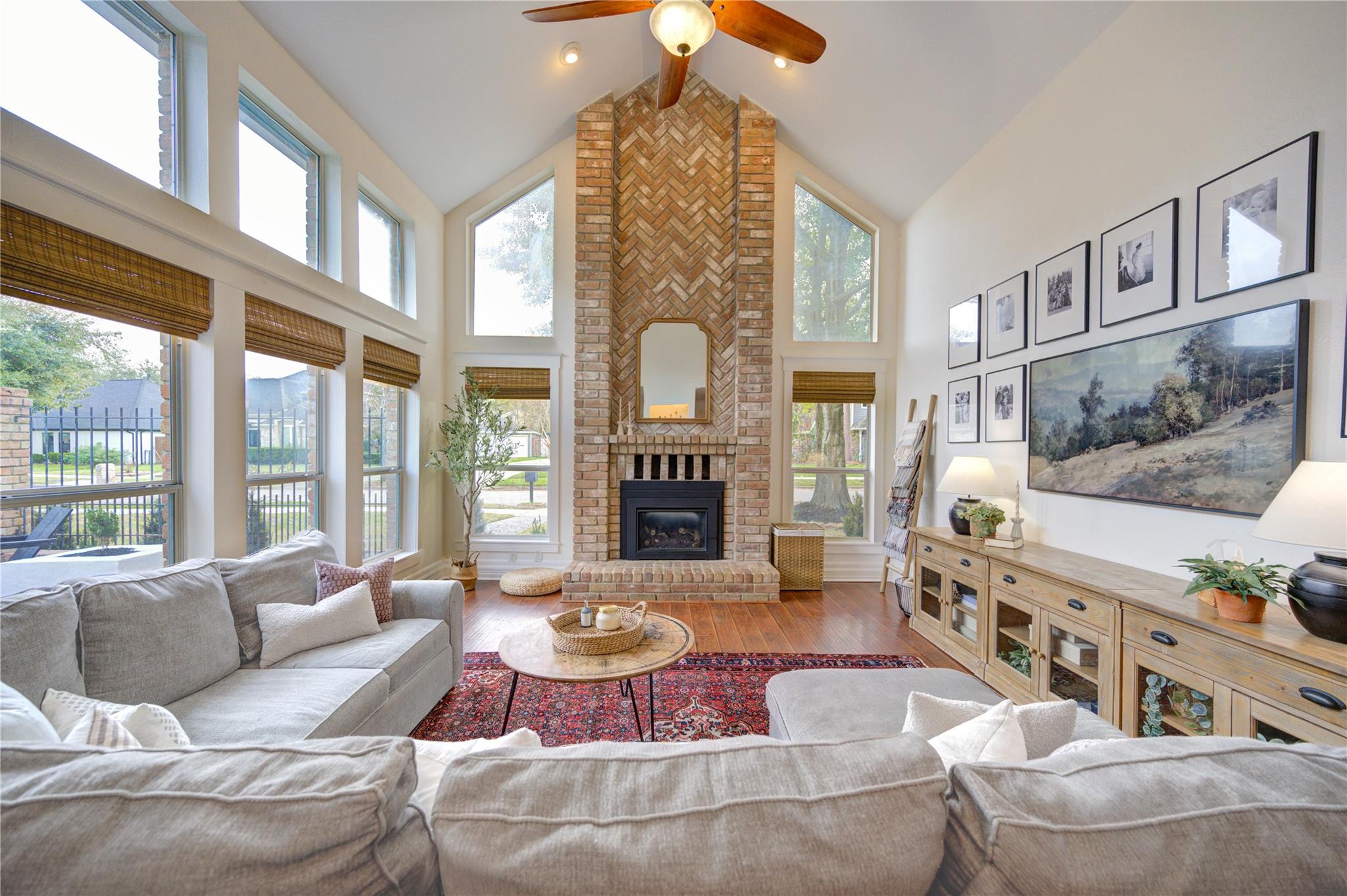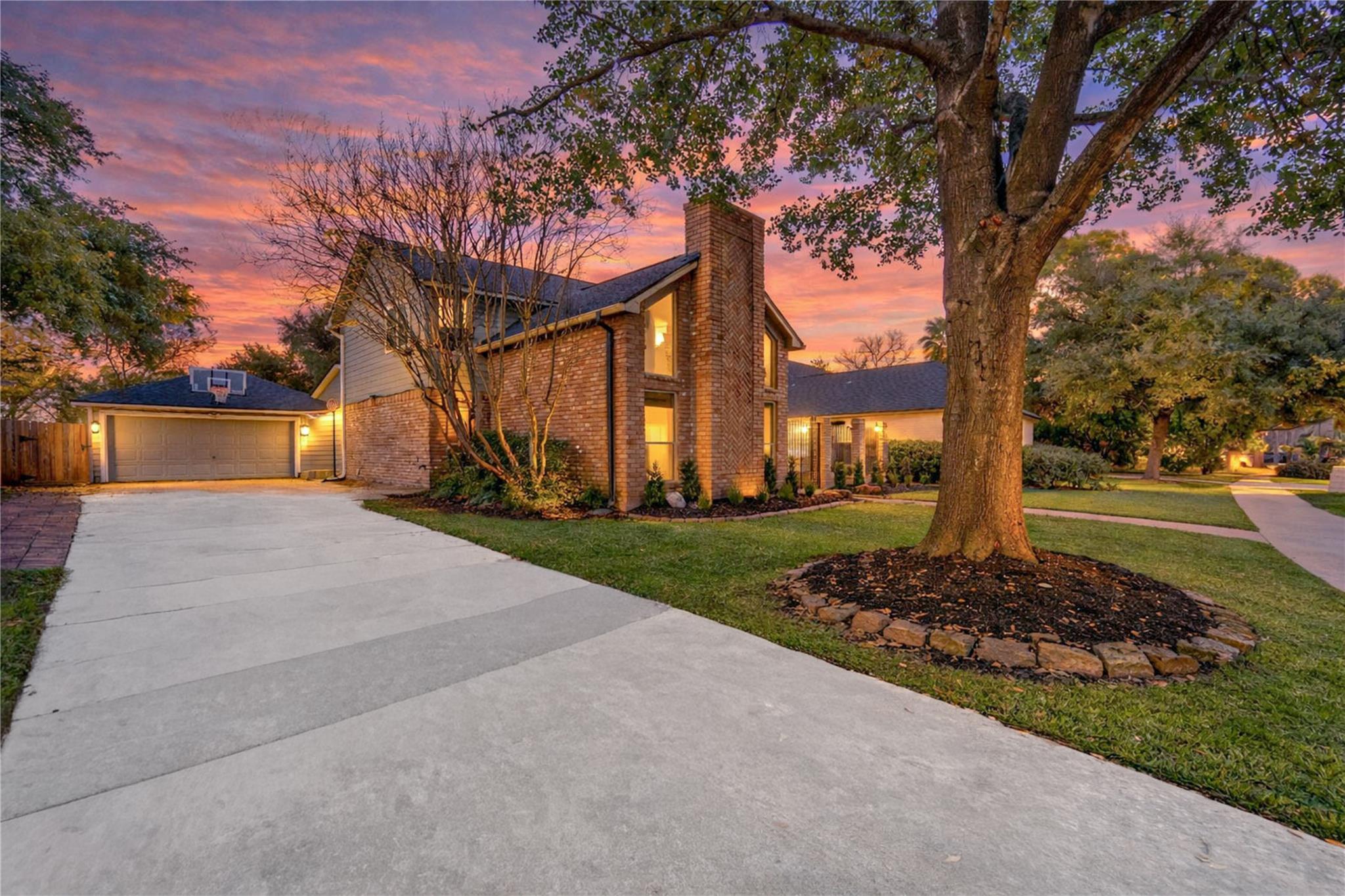 This beautifully remodeled two-story home in the heart of the Energy Corridor features a BRAND NEW ROOF and stylish modern updates throughout. Wood laminate flooring flows through the main living areas and all bedrooms (no carpet!), leading to a stunning living room with vaulted ceilings, a dramatic floor-to-ceiling fireplace that boasts a new sleek glass insert, and abundant natural light from energy-efficient DOUBLE PANE WINDOWS. The RENOVATED KITCHEN offers recent cabinetry, granite countertops, and stainless steel appliances, seamlessly connecting to an eclectic, wood-paneled sunroom that is fully air-conditioned and ideal as a first-floor game room or flex space. The first-floor primary suite includes a RENOVATED ENSUITE BATH with double-sink quartz vanity and marble subway tile. The upstairs boast 3 bedrooms and a renovated bathroom. Step outside to an expansive backyard with a covered patio and ample green space—perfect for creating your own private outdoor retreat.