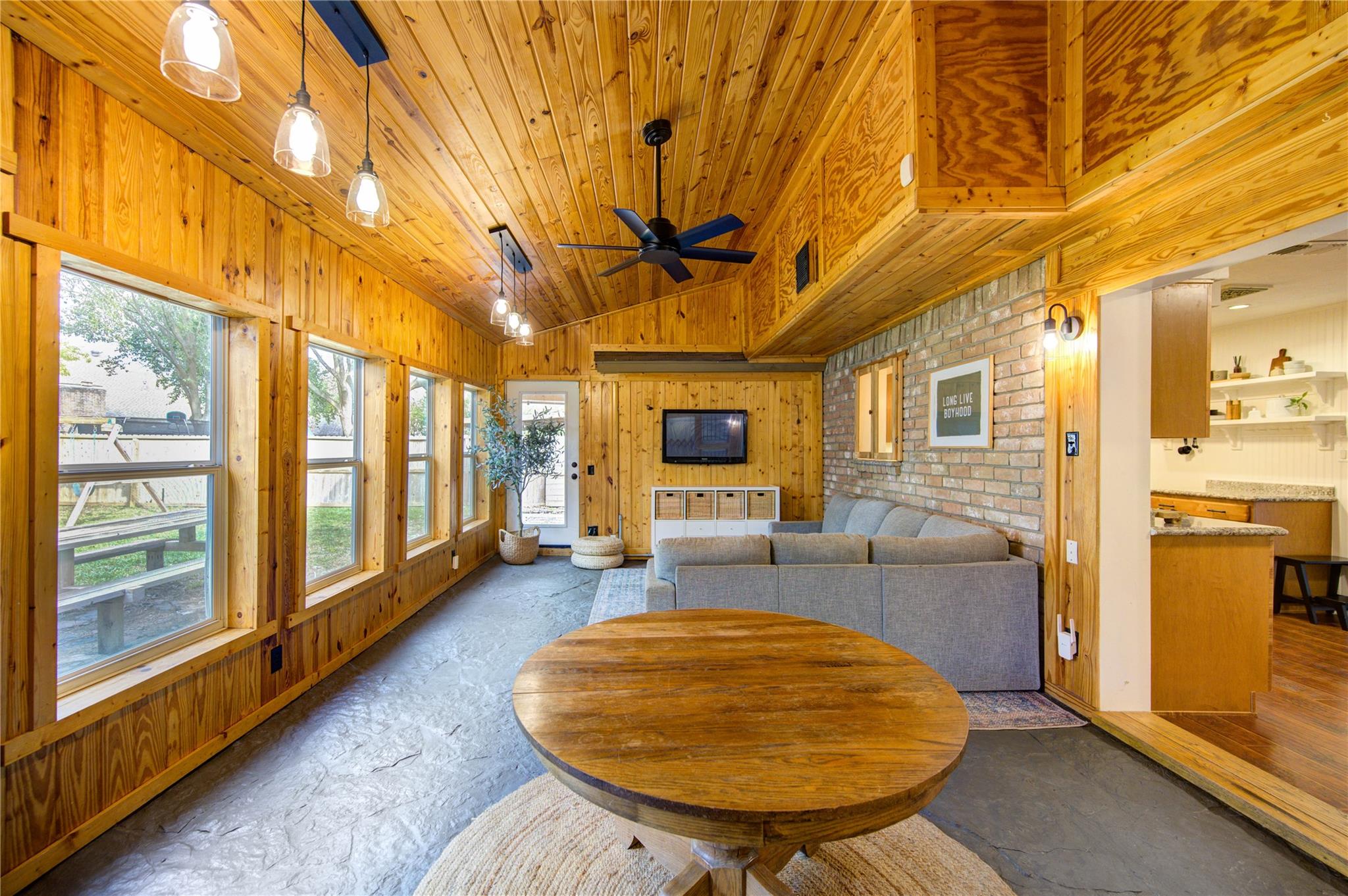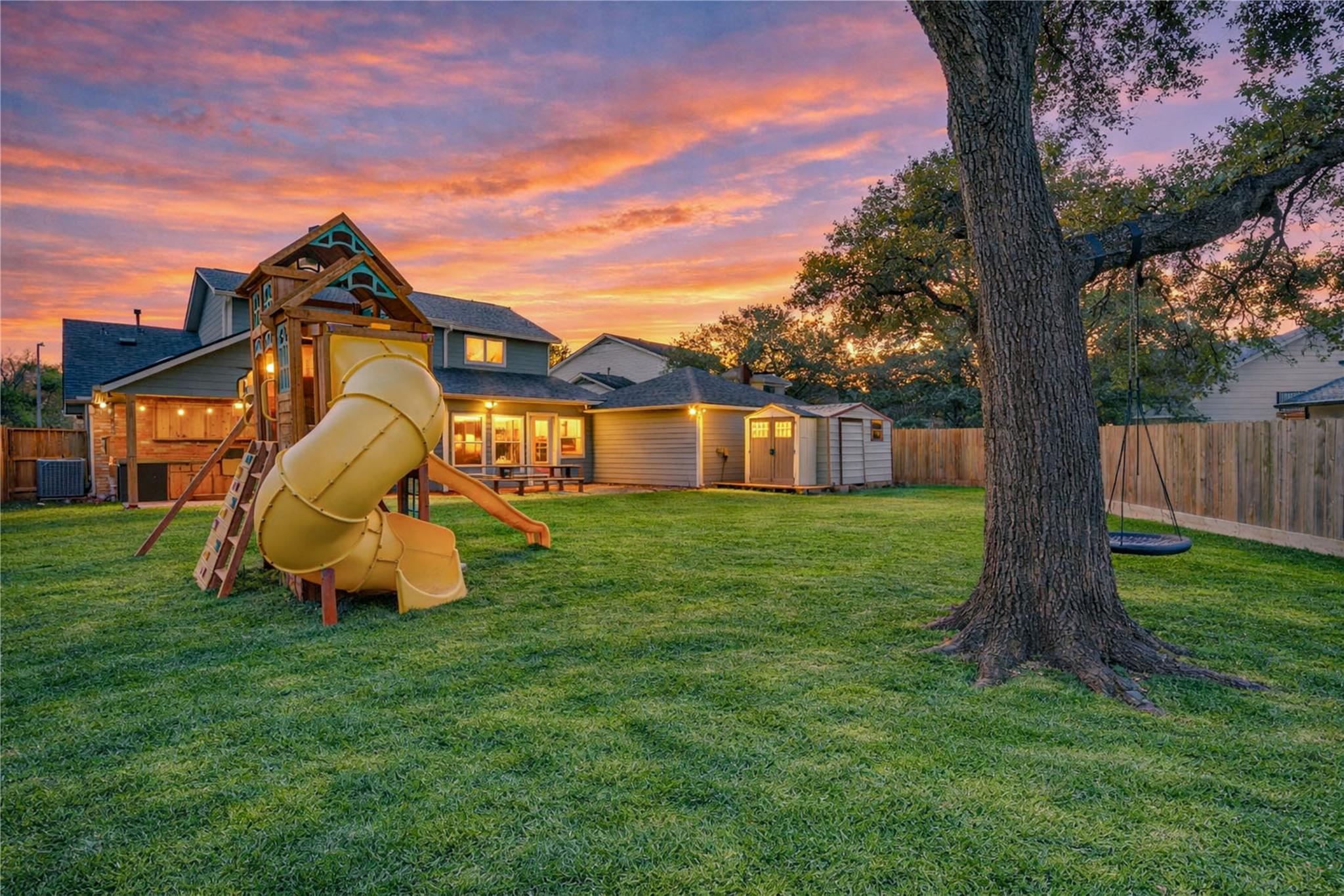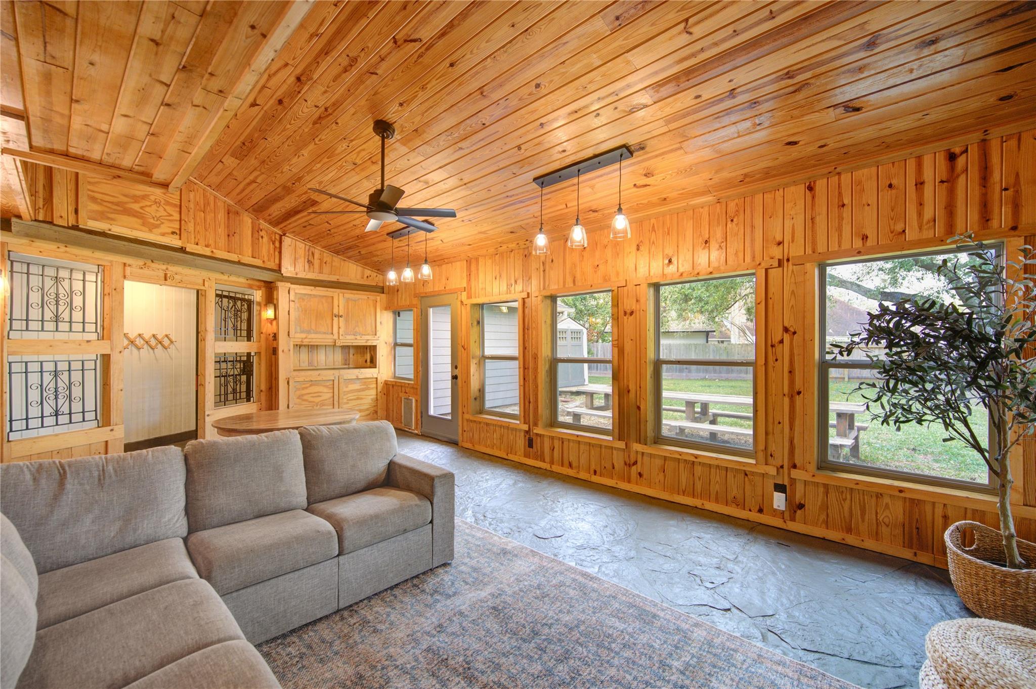 This beautifully remodeled two-story home in the heart of the Energy Corridor features a BRAND NEW ROOF and stylish modern updates throughout. Wood laminate flooring flows through the main living areas and all bedrooms (no carpet!), leading to a stunning living room with vaulted ceilings, a dramatic floor-to-ceiling fireplace that boasts a new sleek glass insert, and abundant natural light from energy-efficient DOUBLE PANE WINDOWS. The RENOVATED KITCHEN offers recent cabinetry, granite countertops, and stainless steel appliances, seamlessly connecting to an eclectic, wood-paneled sunroom that is fully air-conditioned and ideal as a first-floor game room or flex space. The first-floor primary suite includes a RENOVATED ENSUITE BATH with double-sink quartz vanity and marble subway tile. The upstairs boast 3 bedrooms and a renovated bathroom. Step outside to an expansive backyard with a covered patio and ample green space—perfect for creating your own private outdoor retreat.