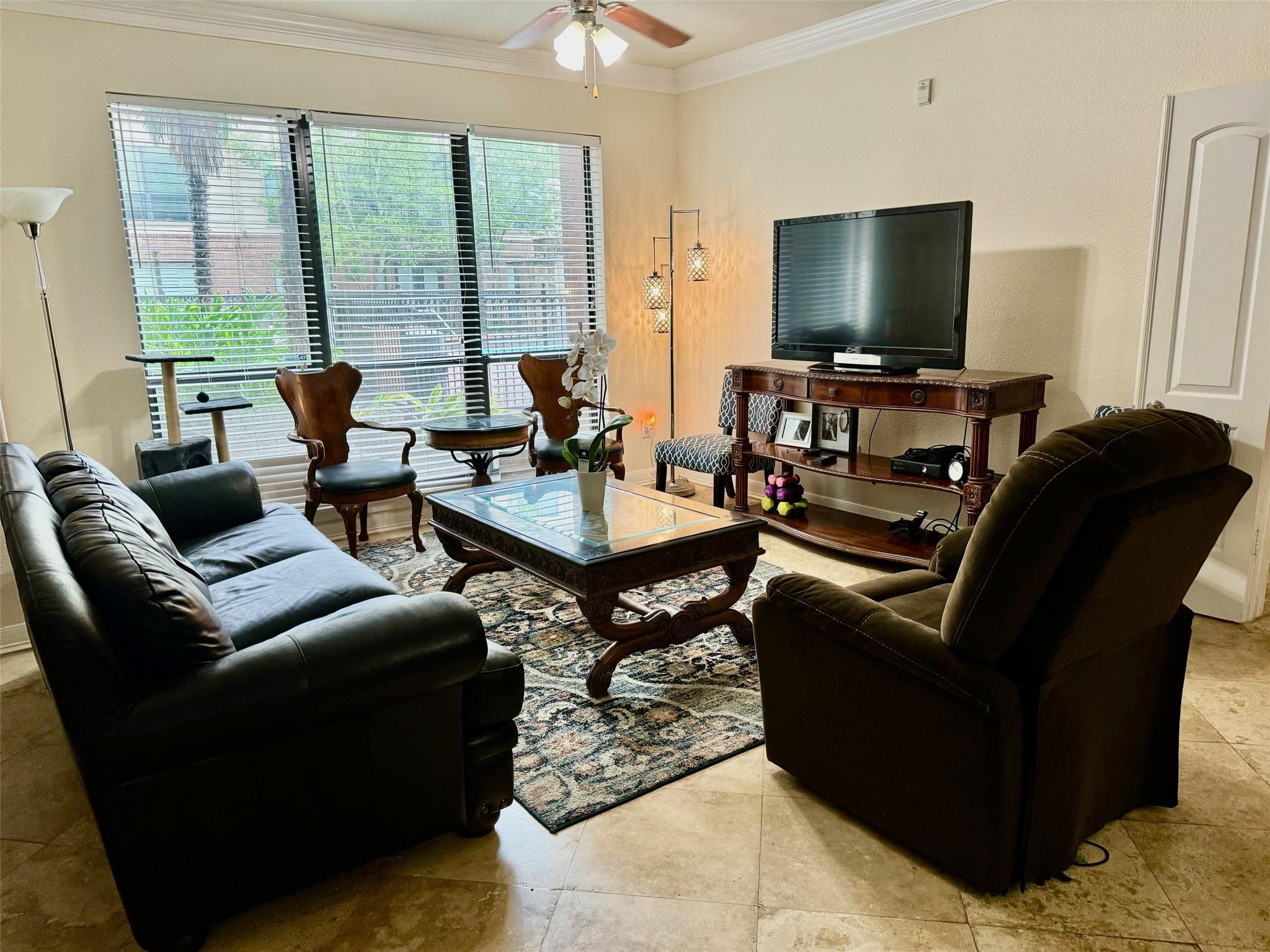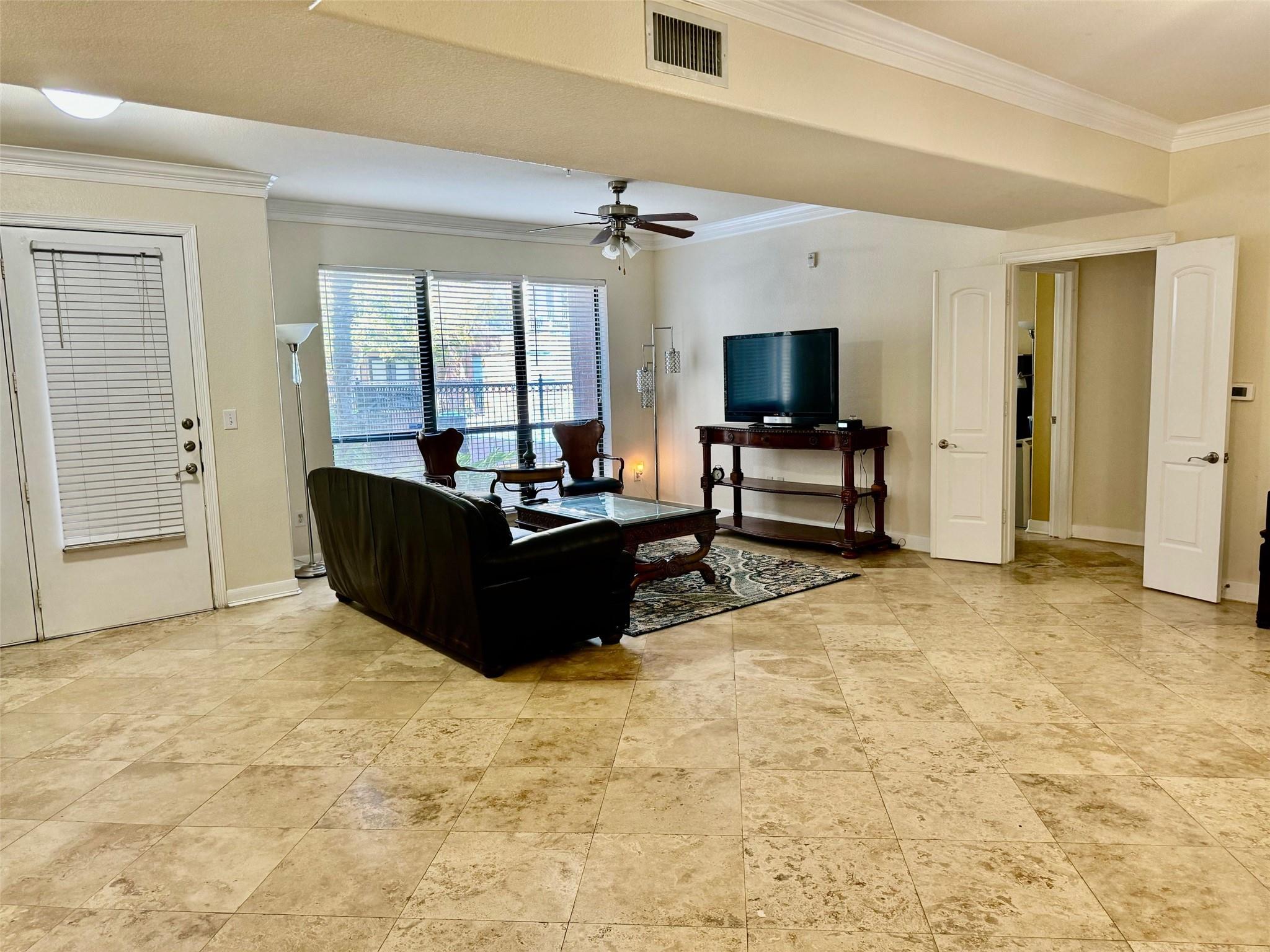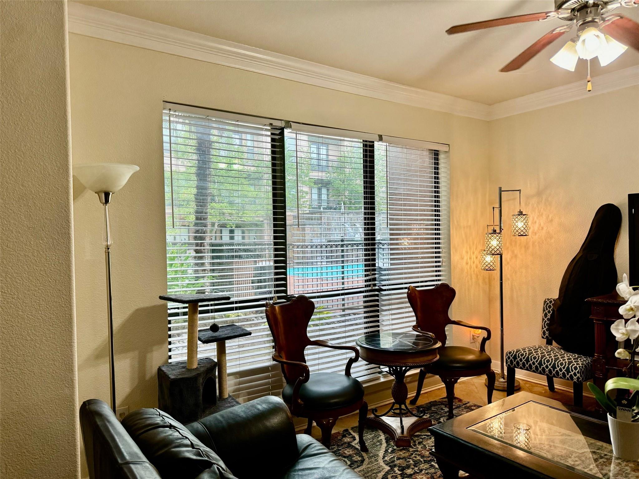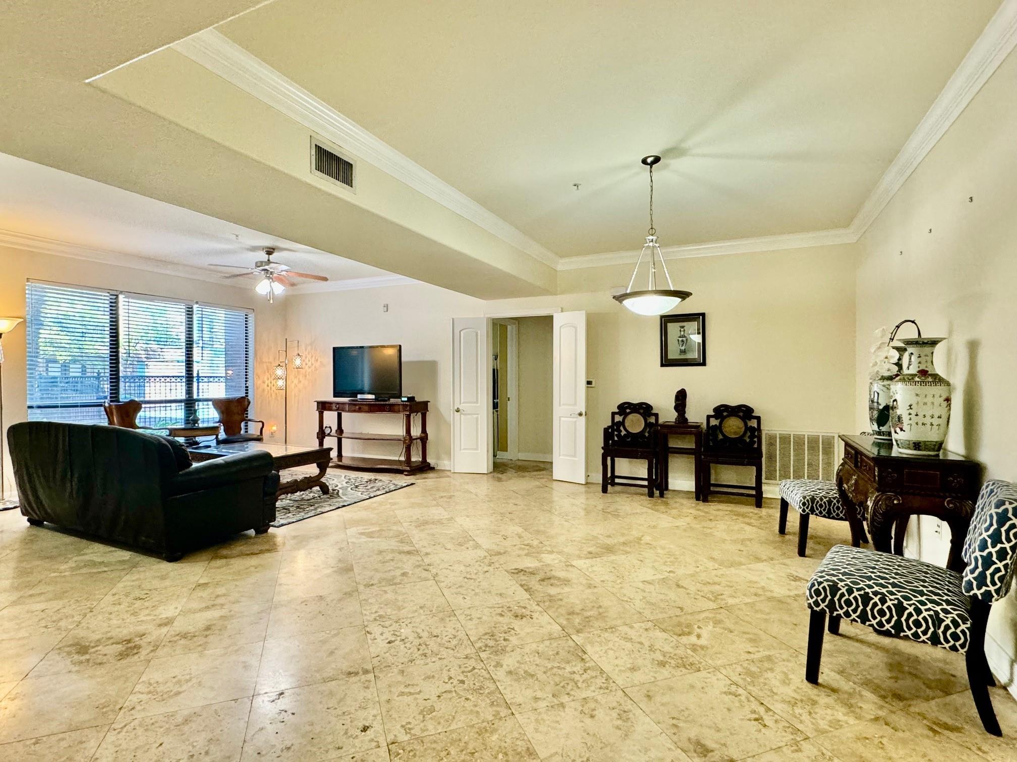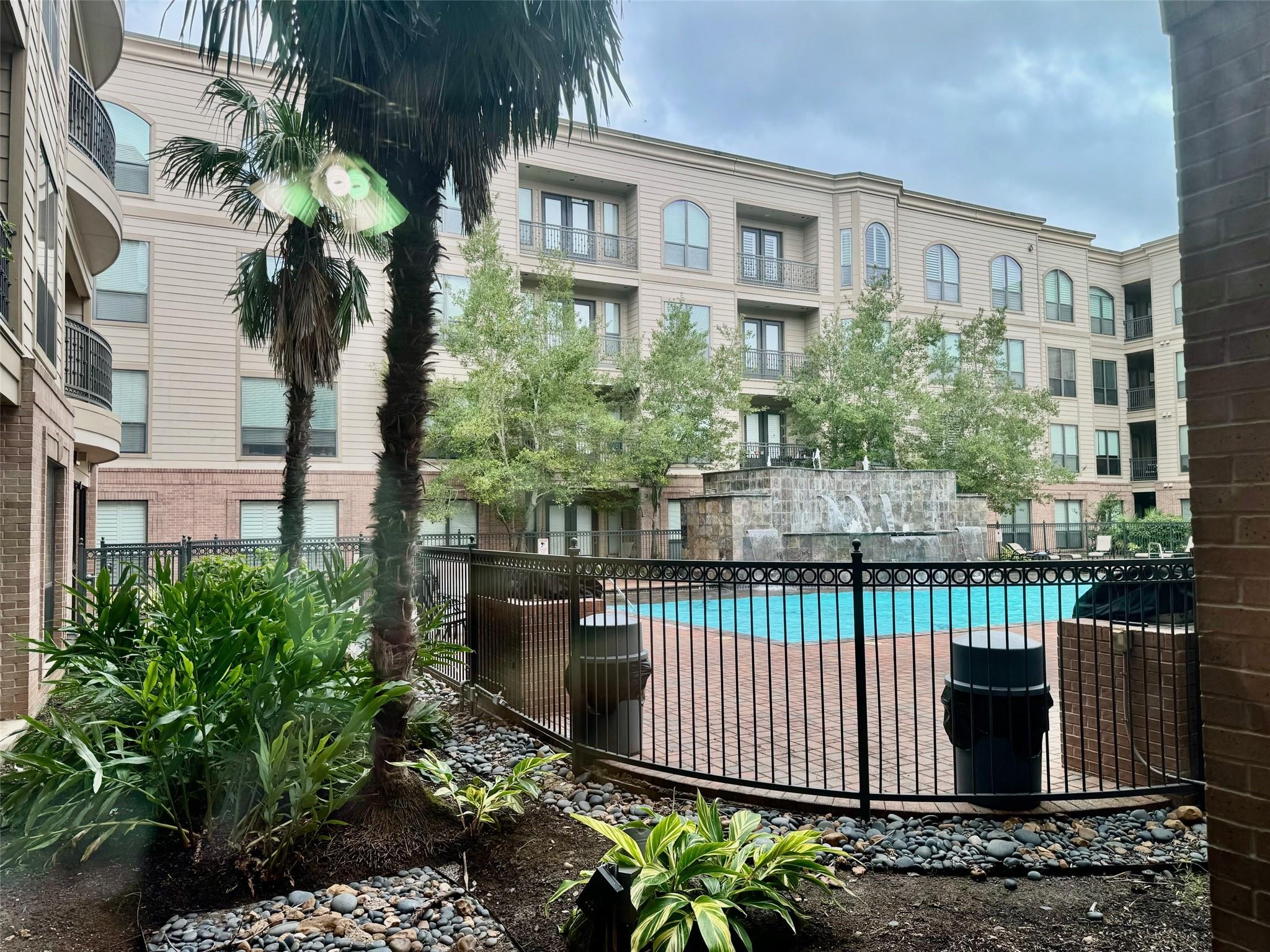 Luxury condominium located in the heart of Sugar Land, gated with upscaled resort type of amenities. Large unit with spacious living and dining areas, 2 bedrooms each has its own bathroom. View of the spectacular waterfall pool from living room and bedrooms, area courtyard from your private balcony. Extra-large kitchen with granite countertops, plenty of counter and cabinets space. Utility room offers washer/dryer and more counter and storage spaces. New Hot water heater/microwave in 2024. Common areas feature living room with electric fireplace and TV, dining tables, bar, full kitchen, meeting room and on-site theater. Enjoy the convenience of major freeways and easy access to shops, restaurants & bars, City Hall, First Colony Mal, nightlife and entertainment at the Sugar Land Town Square! Excellent Fort Bend schools. Low property tax. unit has two assigned parking spaces.