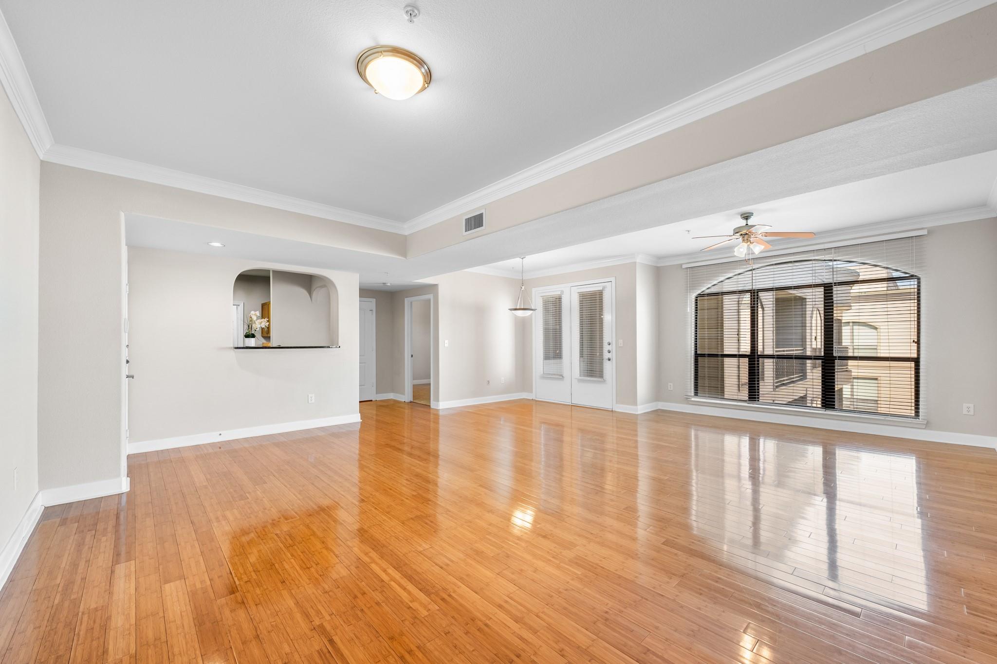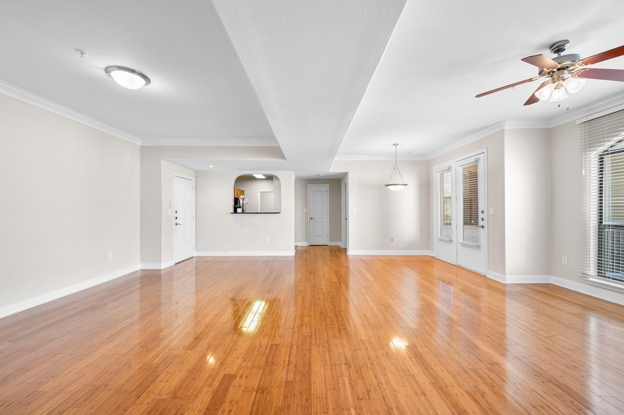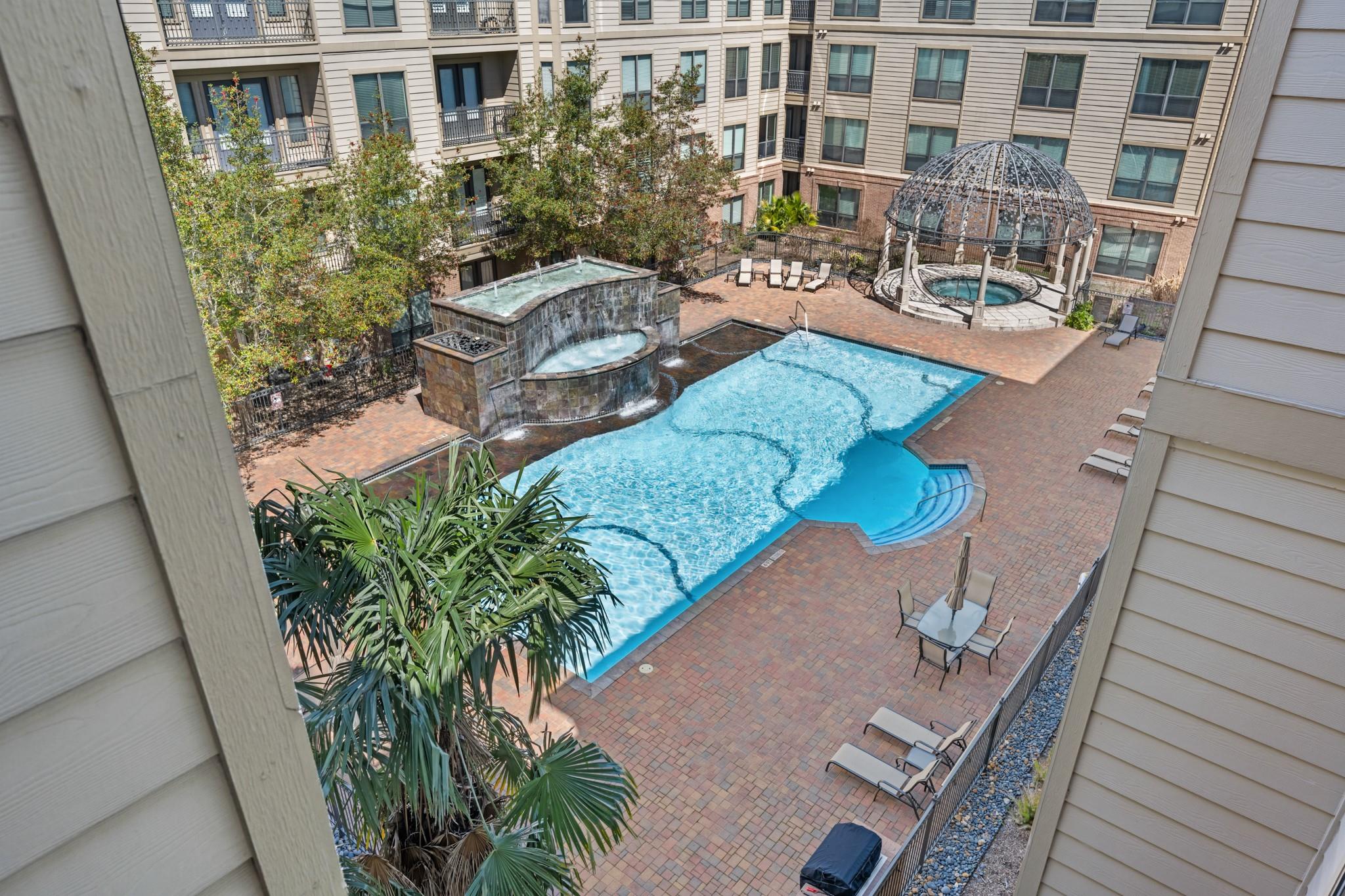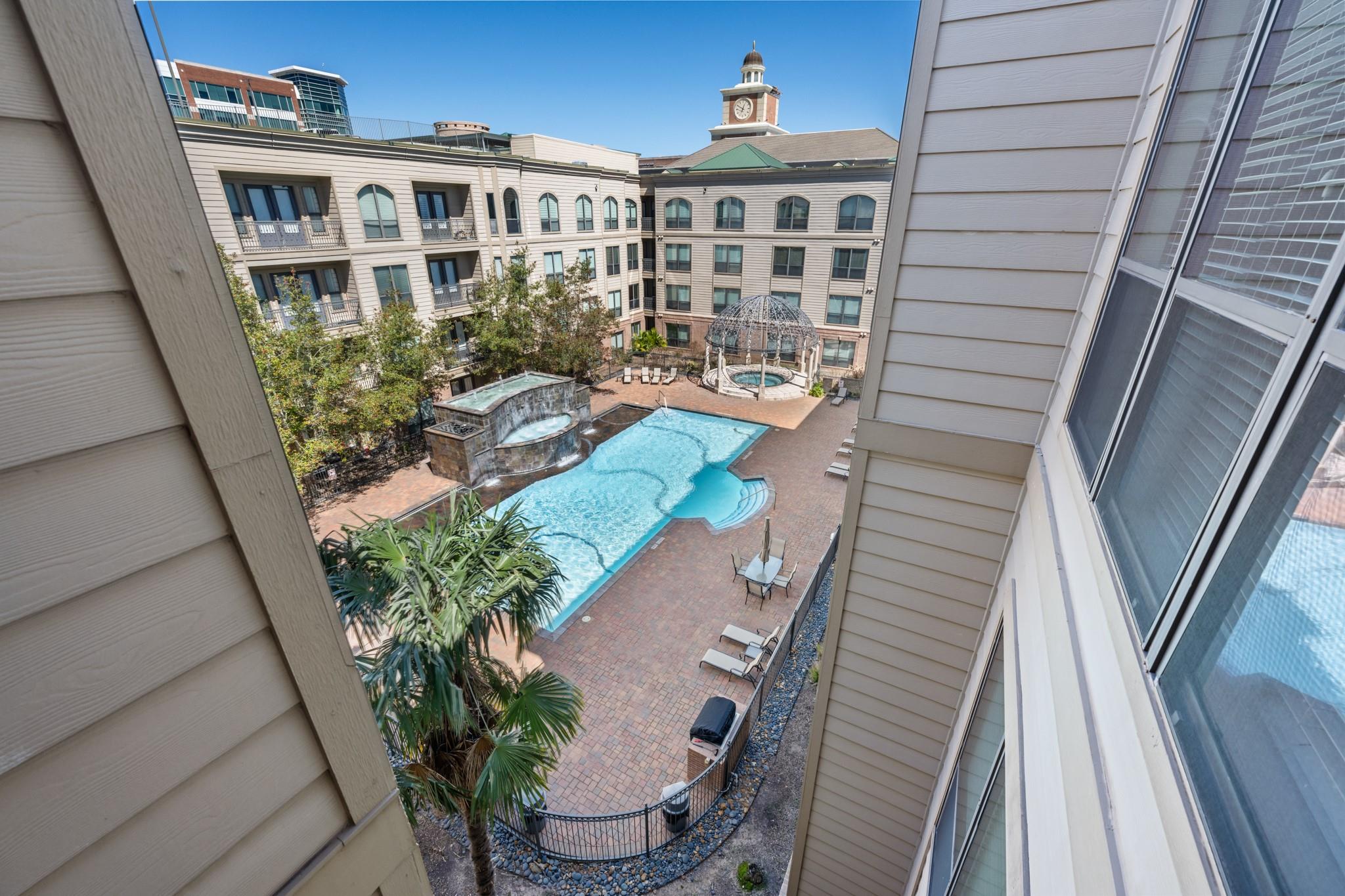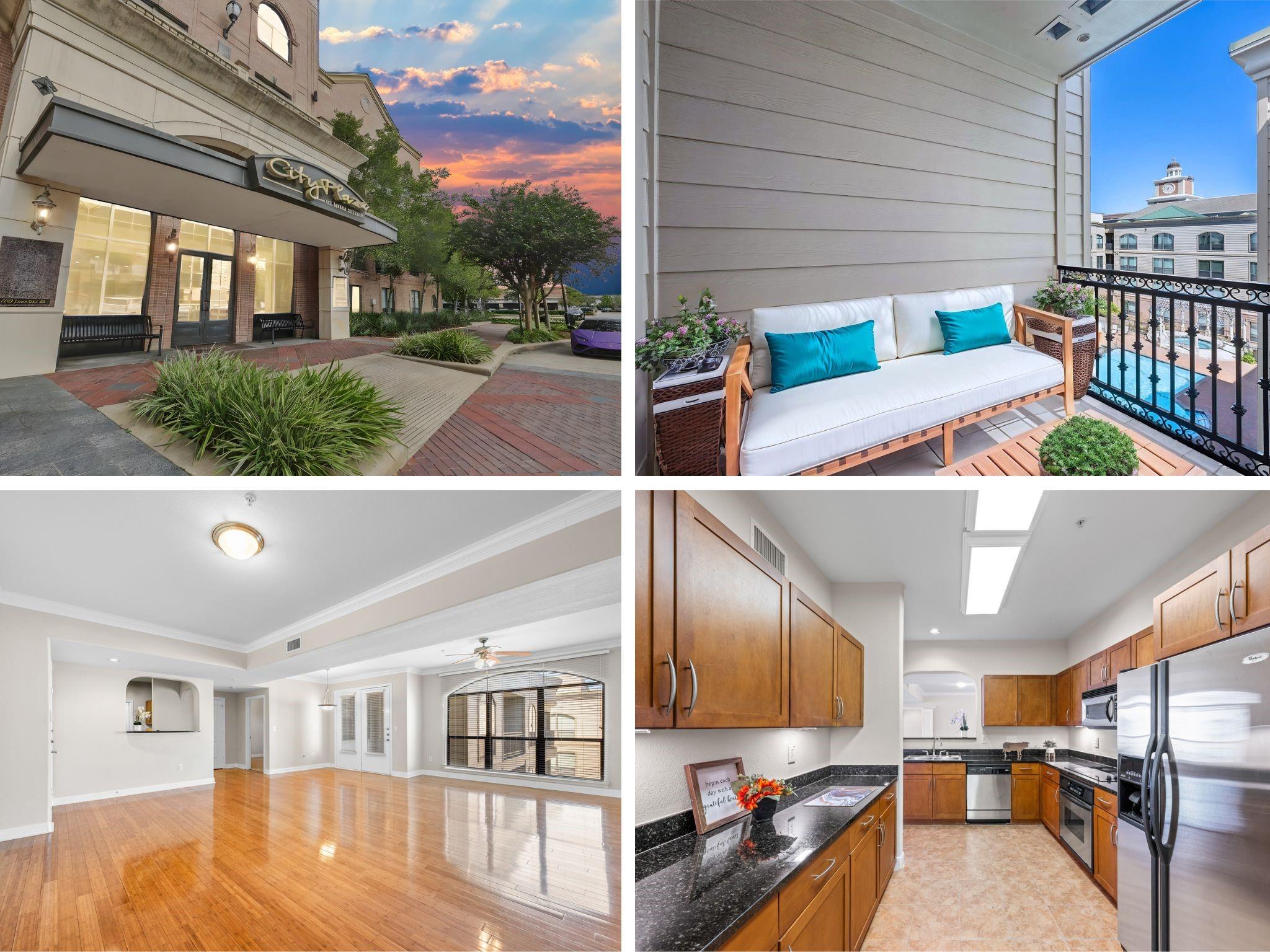 Experience luxury living in this exceptional 4th-floor City Plaza condo overlooking the POOL, featuring 1,478 SF of refined space with 2 bedrooms, each boasting its own bathroom. Stunning bamboo flooring flows through the bright, open-concept living and dining areas, enhancing the modern, elegant aesthetic. Step outside onto your private balcony to enjoy peaceful views overlooking the resort-style pool, with unmatched privacy from having no neighbors above. The kitchen comes fully equipped with appliances, including a fridge, ready for your culinary adventures, while the adjacent utility room offers a washer and dryer. Convenience are prioritized with gated access and two assigned parking spaces in the private garage. As a resident of City Plaza, enjoy access to fantastic amenities such as a resort-style pool, a relaxing spa, Party room, club house with TV, Conference room, Theater room with 15 reclining seats. 2nd, 3rd, and 4th floor patio seating