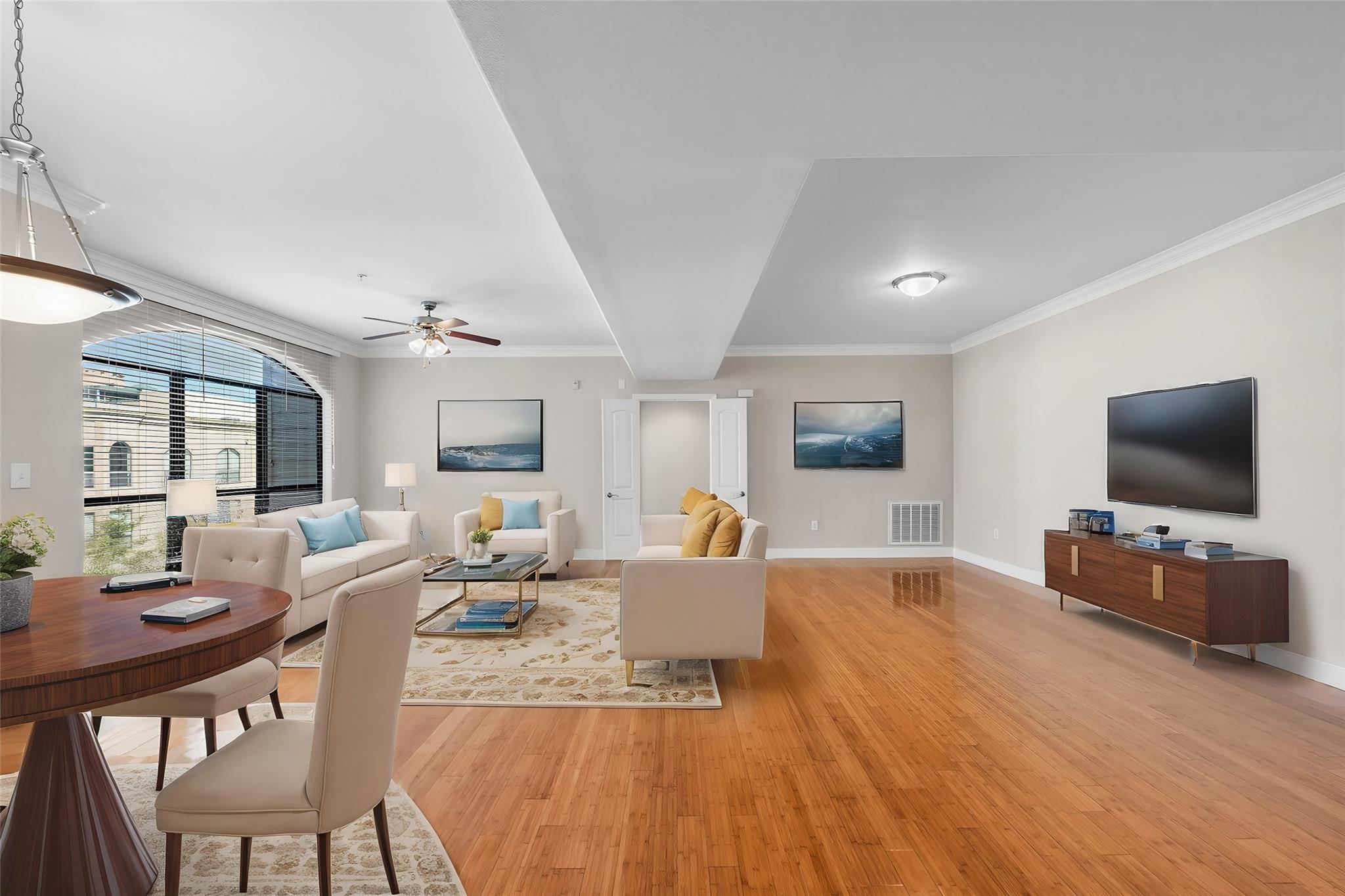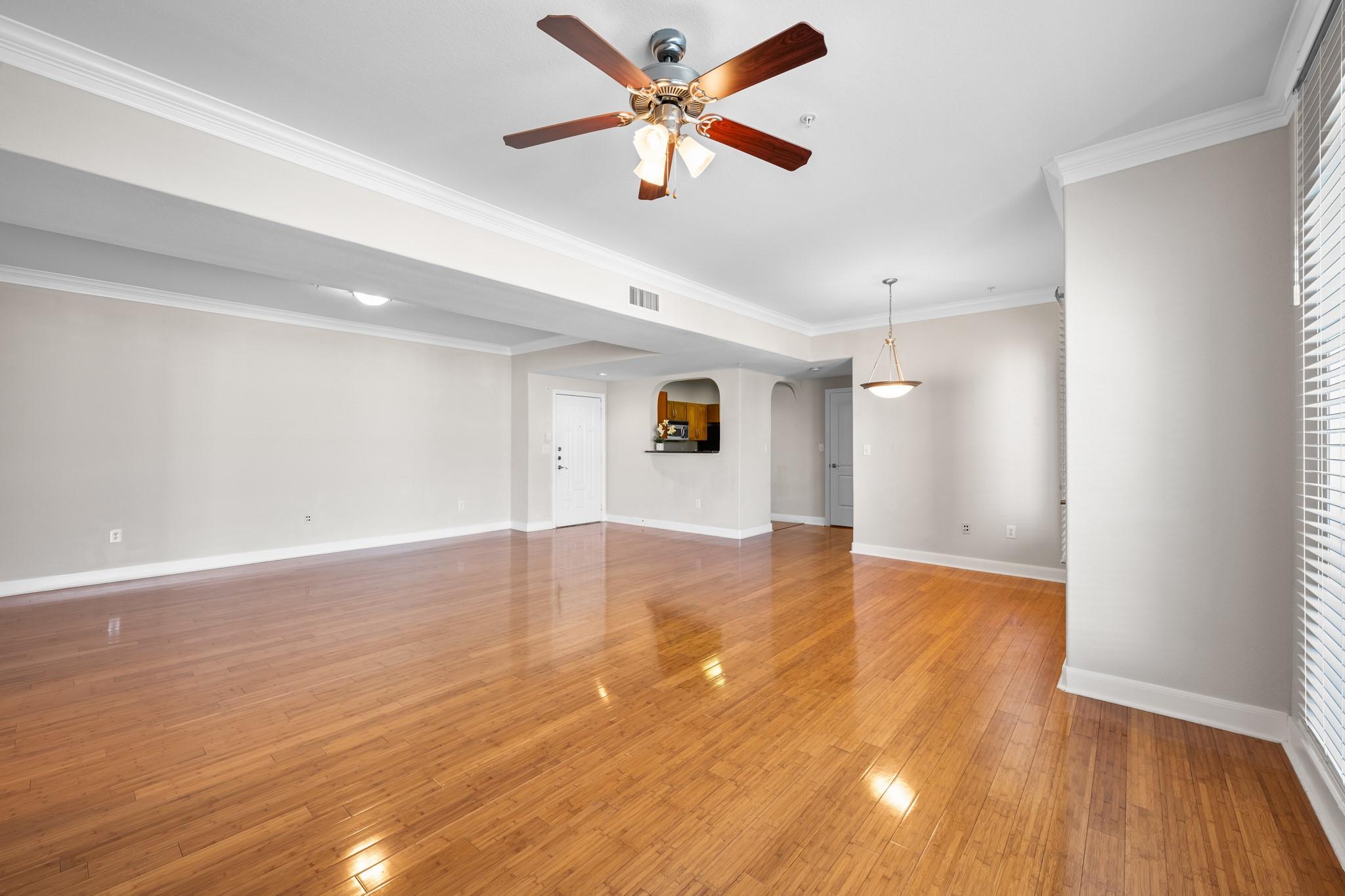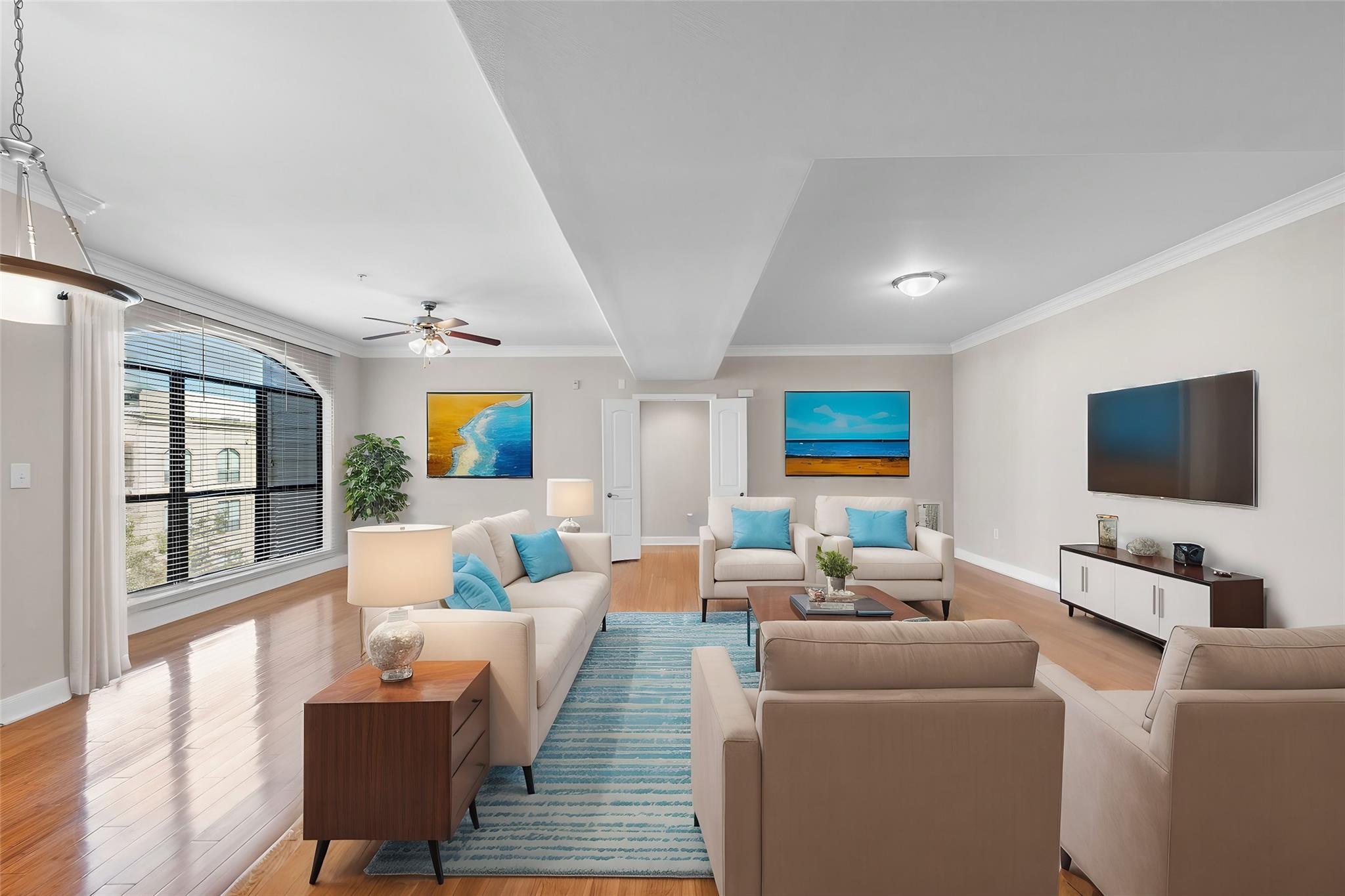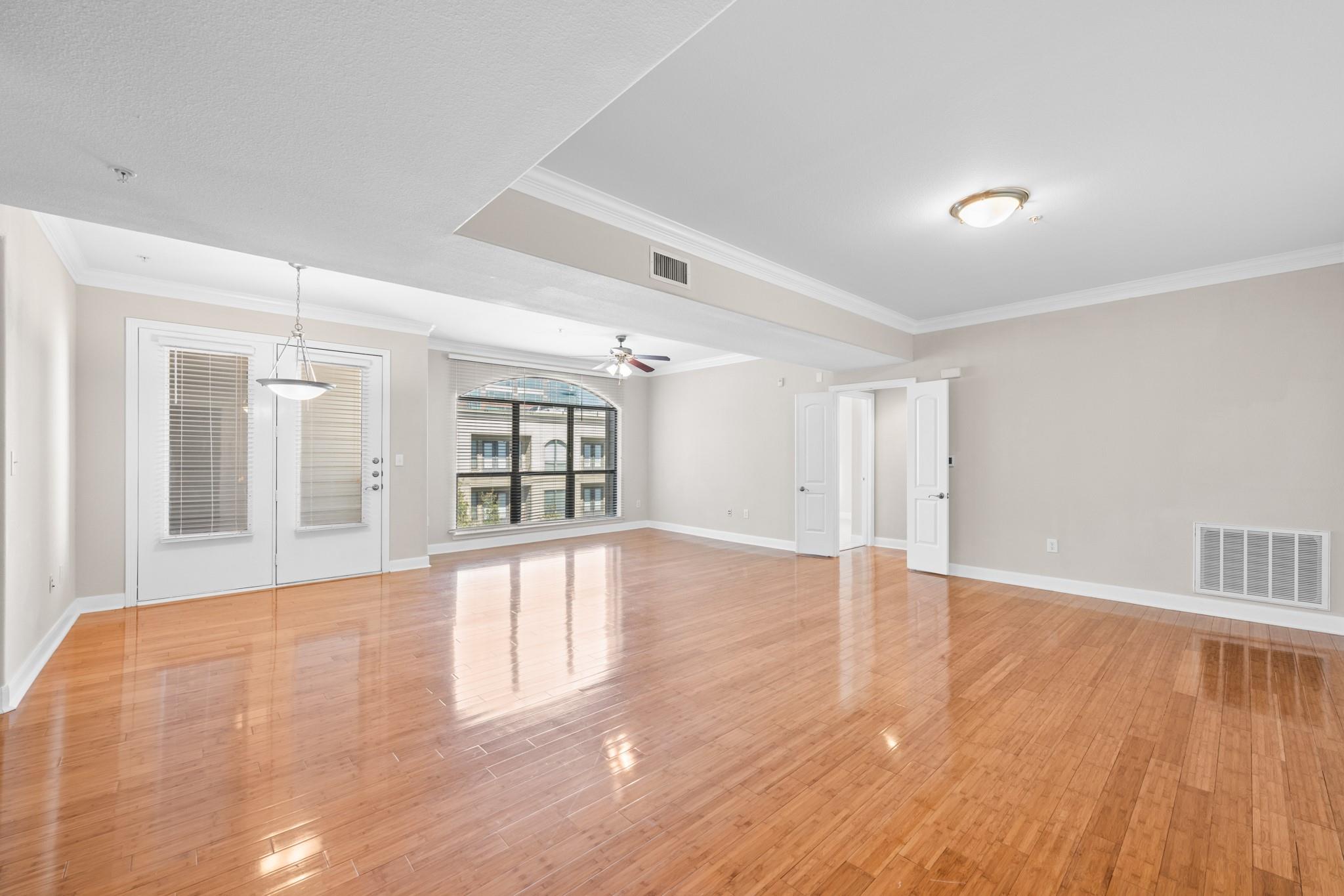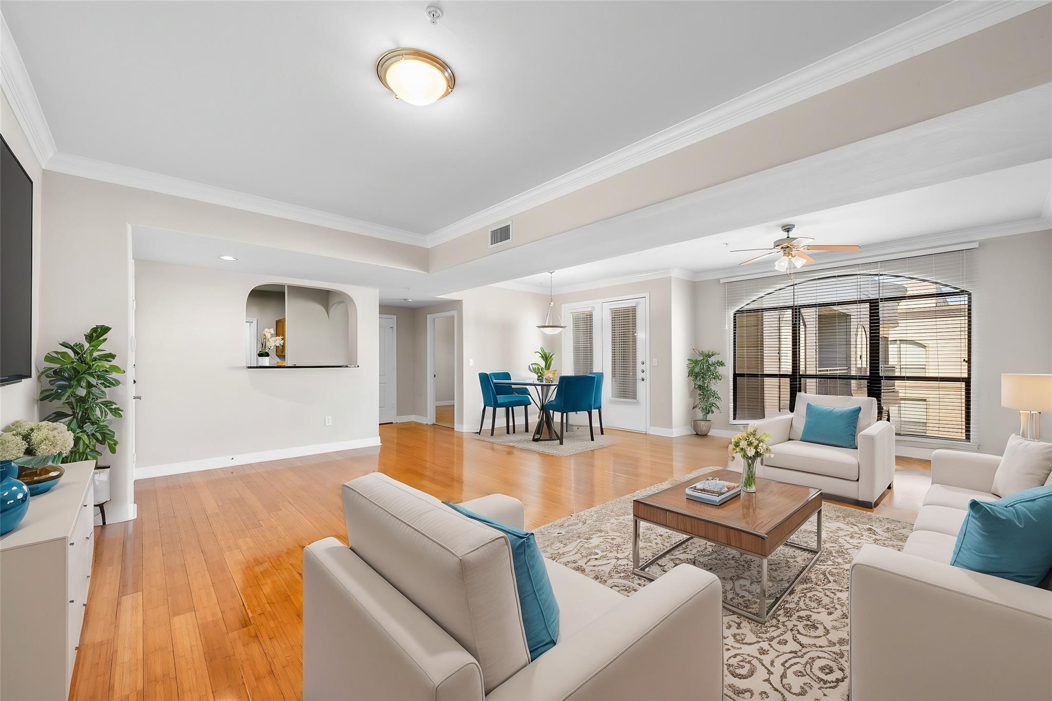 Experience luxury living in this exceptional 4th-floor City Plaza condo overlooking the POOL, featuring 1,478 SF of refined space with 2 bedrooms, each boasting its own bathroom. Stunning bamboo flooring flows through the bright, open-concept living and dining areas, enhancing the modern, elegant aesthetic. Step outside onto your private balcony to enjoy peaceful views overlooking the resort-style pool, with unmatched privacy from having no neighbors above. The kitchen comes fully equipped with appliances, including a fridge, ready for your culinary adventures, while the adjacent utility room offers a washer and dryer. Convenience are prioritized with gated access and two assigned parking spaces in the private garage. As a resident of City Plaza, enjoy access to fantastic amenities such as a resort-style pool, a relaxing spa, Party room, club house with TV, Conference room, Theater room with 15 reclining seats. 2nd, 3rd, and 4th floor patio seating