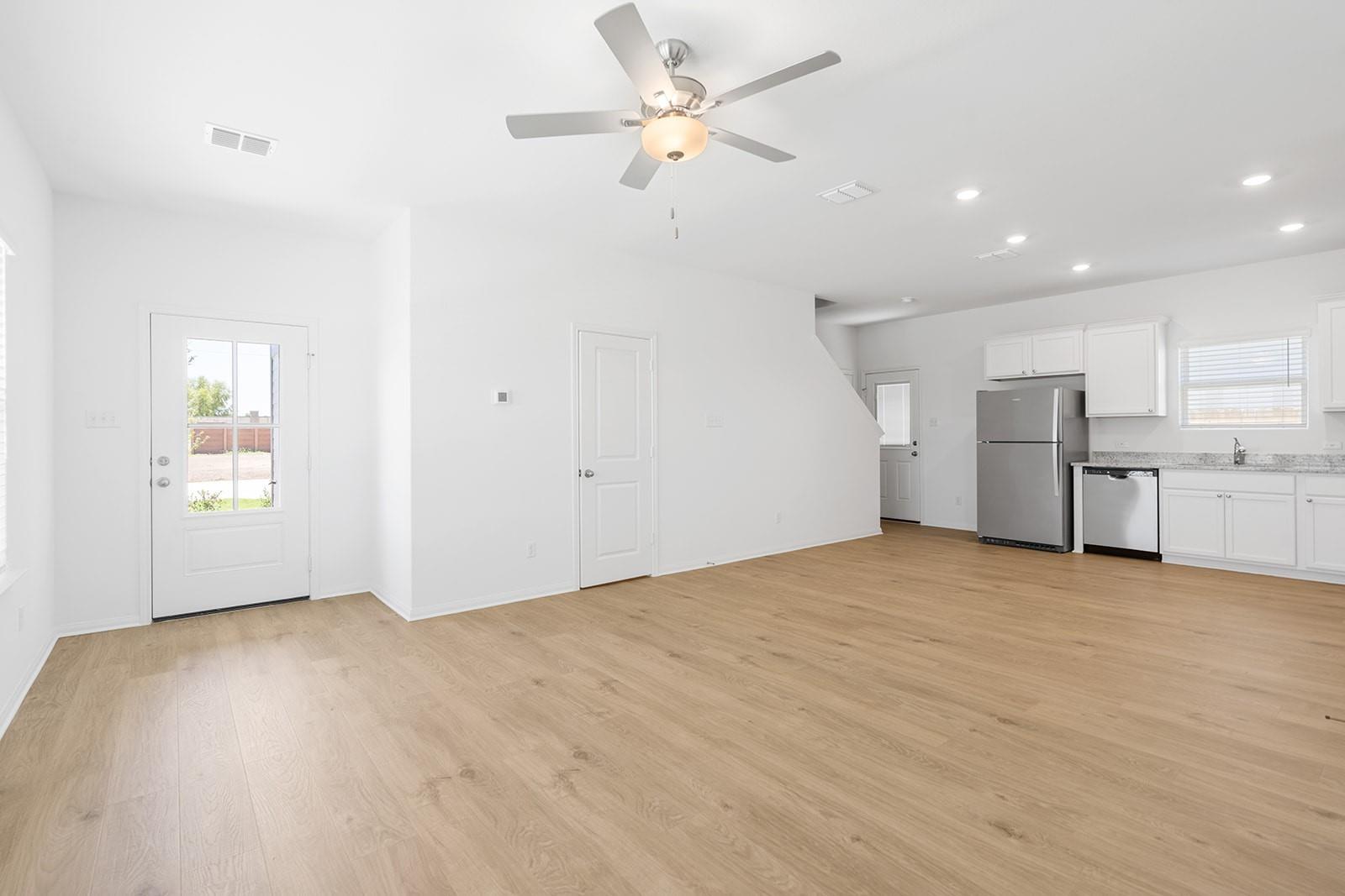 The Vaughan floor plan has three generously sized bedrooms and two-and-a-half bathrooms filled with designer upgrades at no extra cost, including stainless steel Whirlpool® appliances, granite countertops, smart home technology and so much more. The Vaughan offers a thoughtfully designed layout that’s perfect for making lifelong memories with friends and family. With its warm, open layout, the Vaughan is the ideal setting for everyday moments and special occasions. Whether it’s cozy movie nights or lively game nights, the spacious family room provides plenty of room to relax and connect. The chef-ready kitchen flows seamlessly into the adjoining dining room, creating an inviting space to share meals, stories, and laughter.