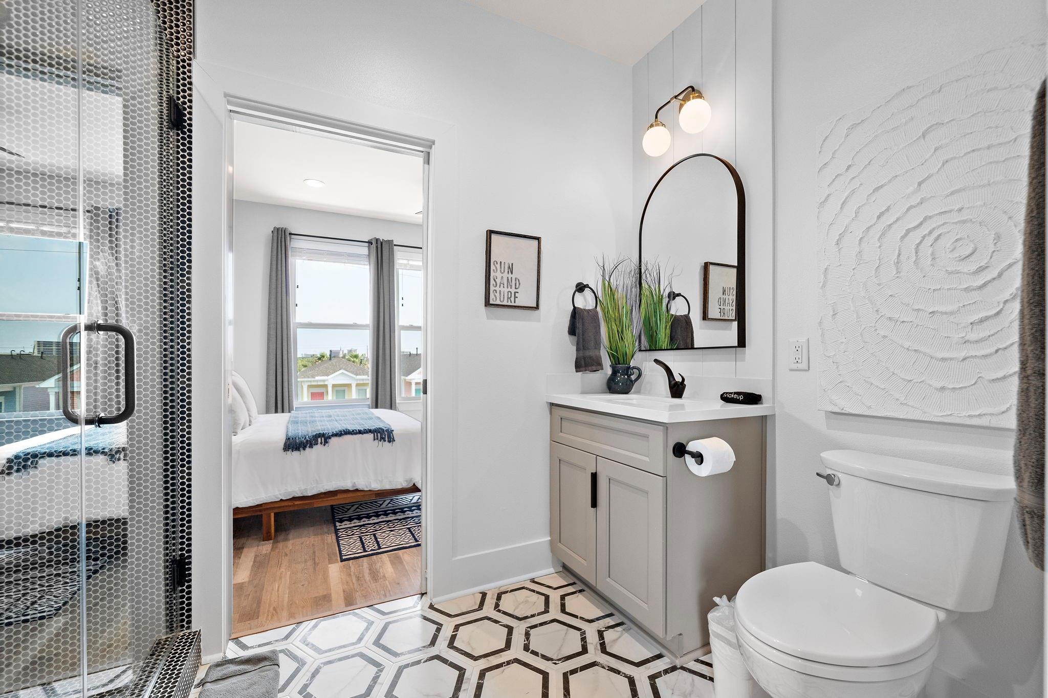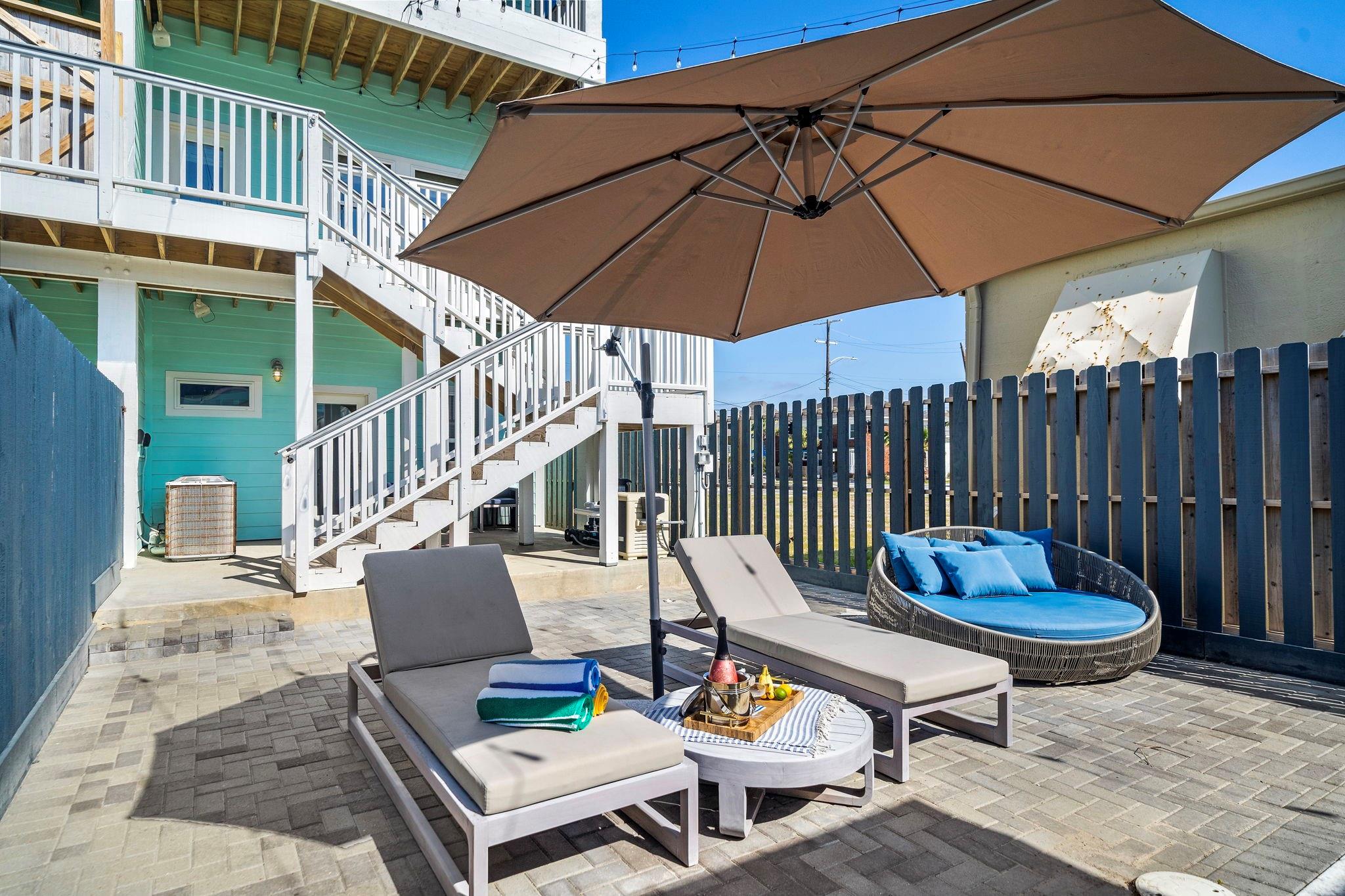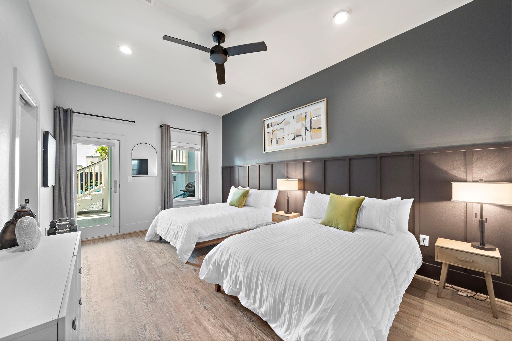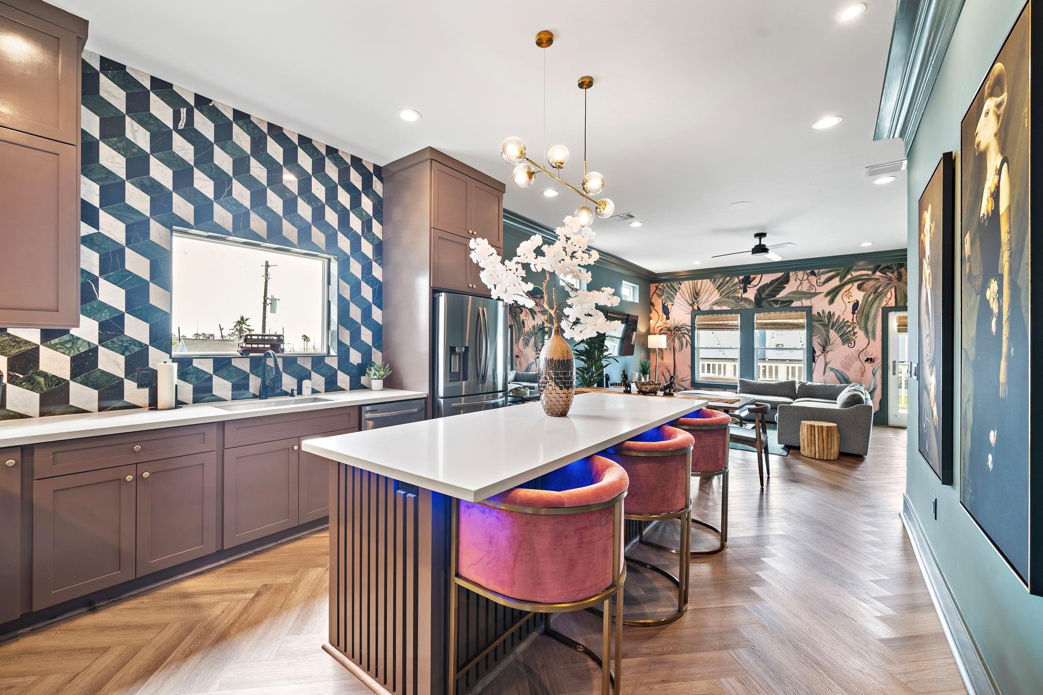 Luxury duplex just a 5-minute walk from the Pleasure Pier, beach, and downtown Galveston! Each side offers 4 bedrooms, 3.5 baths, tall ceilings, 2 primary suites, spacious closets, and a bonus room—sold fully furnished and separately metered. Unit A features a heated pool with waterfall, outdoor bar, gym, and speakeasy-style wet bar. Unit B offers a spacious backyard with hot tub and game room. Each unit boasts four balconies—front and rear—with stunning views of the beach, Pleasure Pier, and cruise ships from the 3rd-floor guest suite. Built with storm-rated windows and doors, LVP herringbone floors, marble tile, and quartz countertops. A turn-key, income-producing property perfect for Airbnb or luxury coastal living in one of Galveston’s most desirable locations! Close location to UTMB, Downtown, Beach, Perfect for short term rental, LTR, Resident Nurse rental.