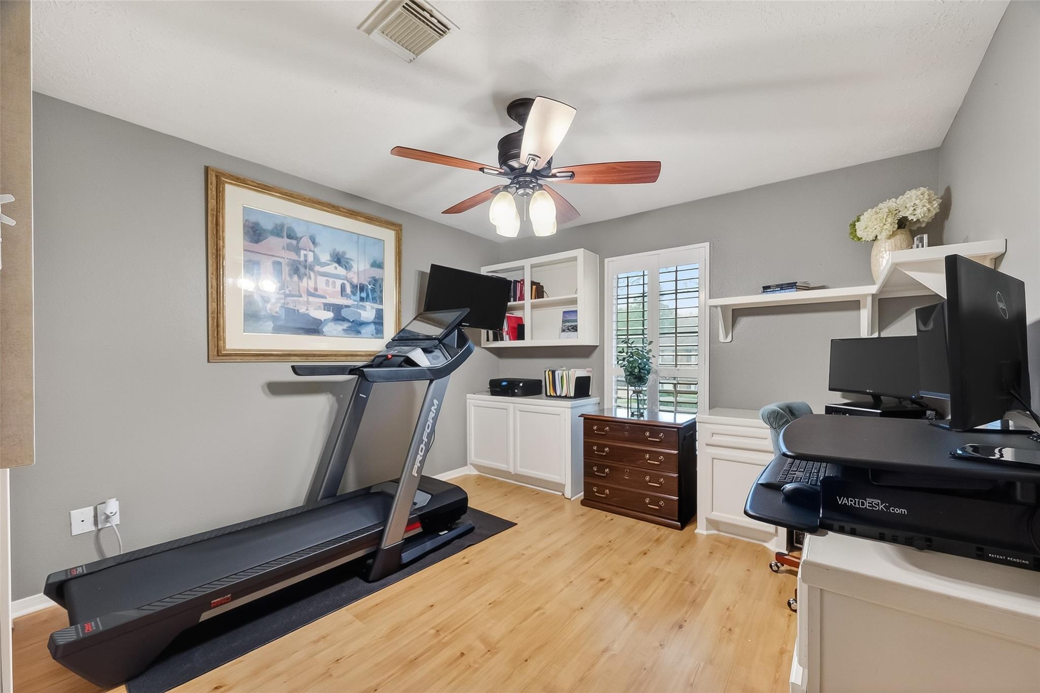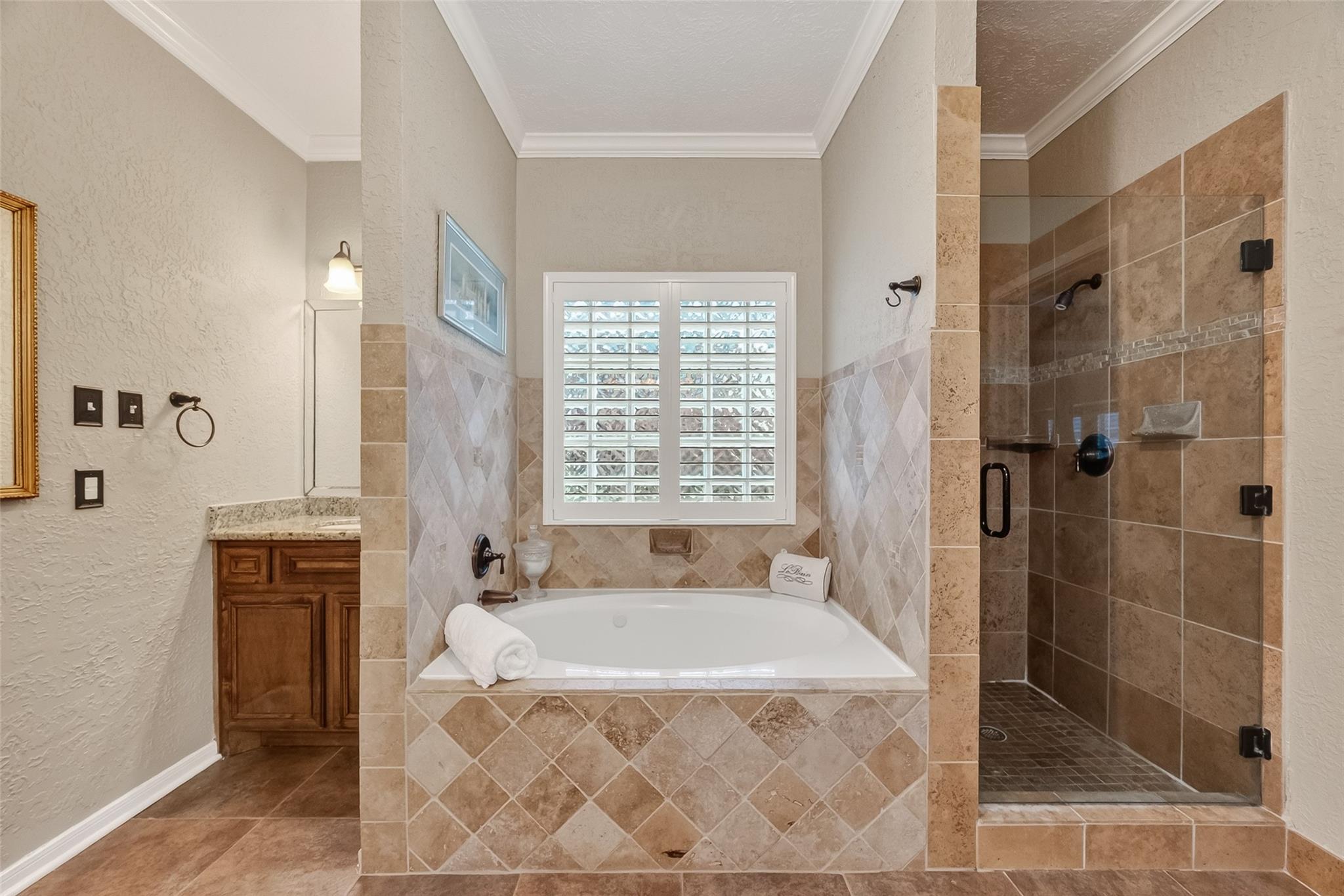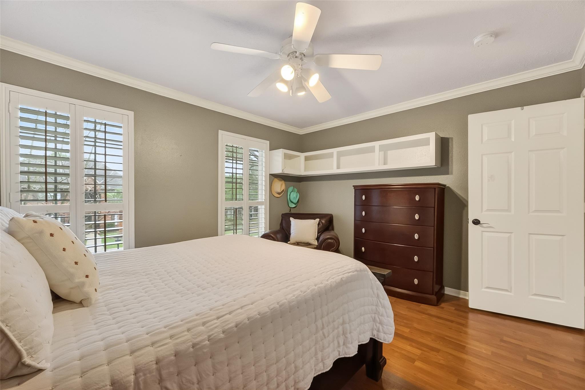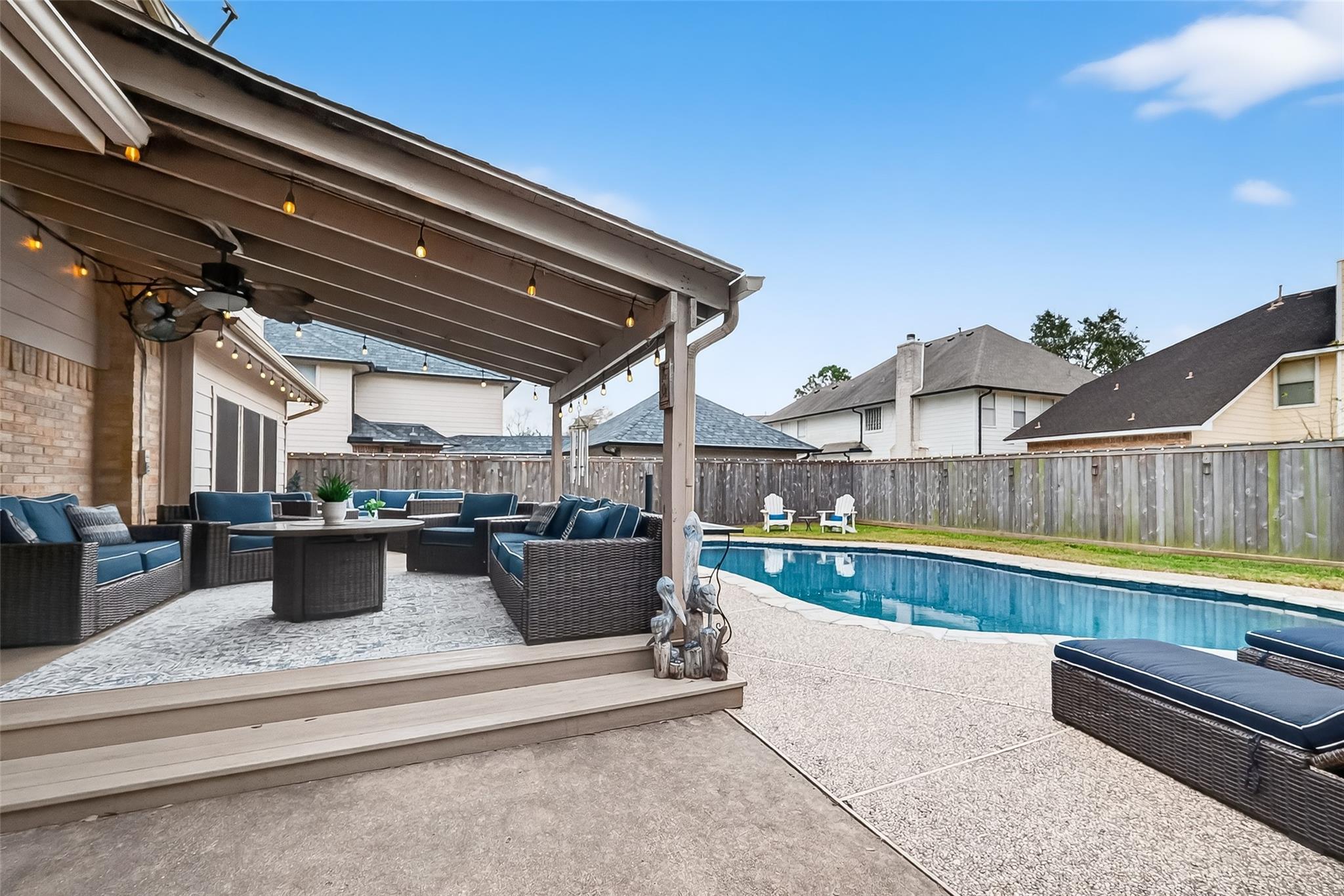 This immaculate, light filled home welcomes you with a 2-story entry, elegant wood floors, and an appealing architectural design. Thoughtful details include plantation shutters, a gas corner fireplace, built ins in the guest bedrooms, and walls of windows that frame views of the backyard oasis. The open, updated kitchen features stainless steel appliances, including a double-oven, granite countertops, a travertine backsplash, center island, and breakfast bar—perfect for everyday living and entertaining. A rear staircase adds convenience and charm. The primary suite offers a peaceful retreat with a window seat, coffered ceiling, and double crown molding. Step outside to your private paradise: a sparkling pool, hot tub, covered patio, and an extended Trex deck ideal for gatherings or quiet relaxation. The 3-car detached garage with a triple wide driveway provides ample parking and storage. Roof (2017), Dishwasher (2025) and full sprinkler system.