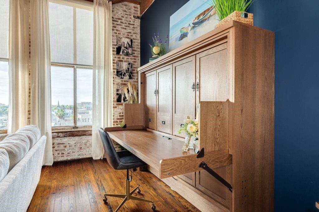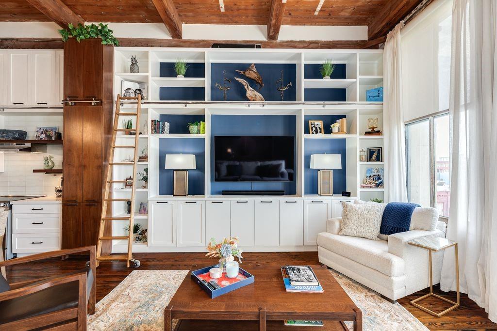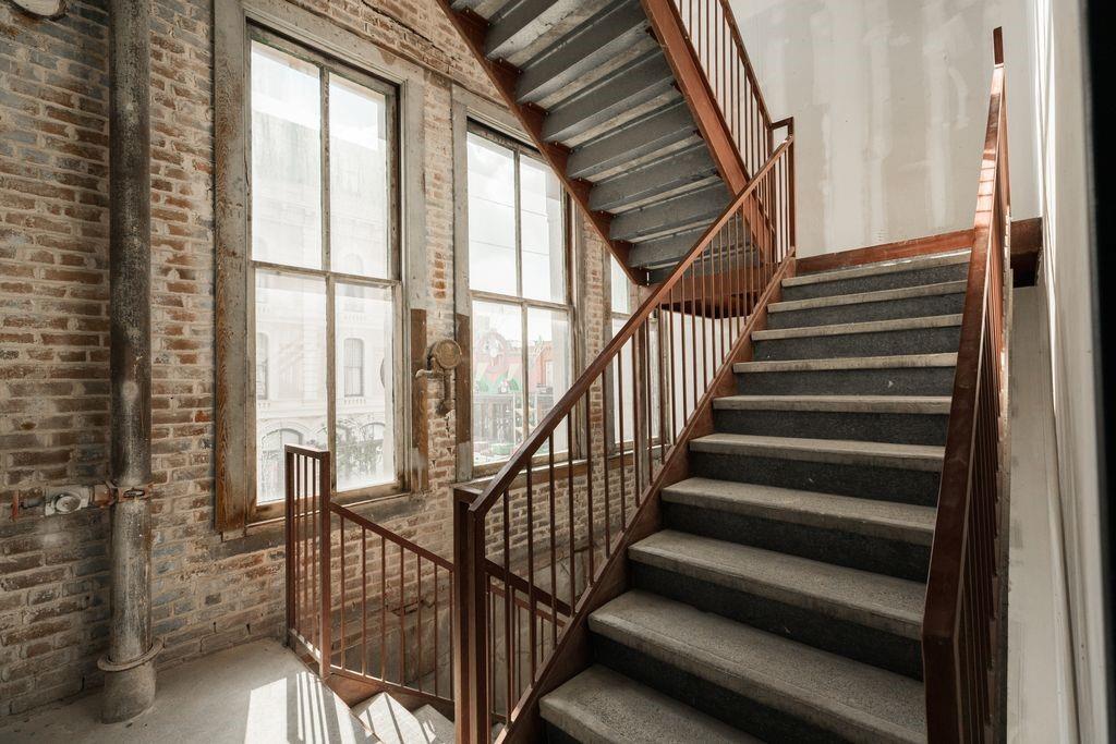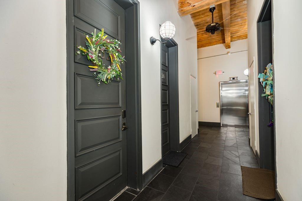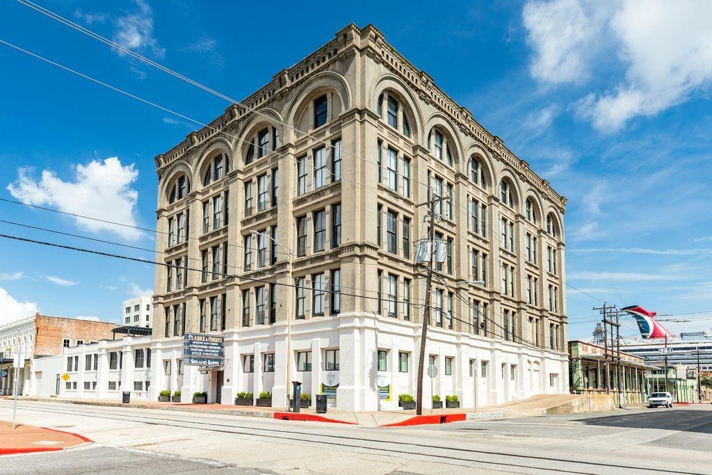 Located in the iconic Clarke & Courts Building, this beautiful downtown efficiency offers an antique brick wall with windows offering a view of the Mardi Gras parades. The open concept kitchen boasts abundant cabinetry that extends to the ceiling, an island offering plenty of space for dining or entertaining, and a living room with custom cabinetry and room for a bed. Wood floors add warmth to the unit. The unit has a large bathroom with double sinks and a full size new washer/dryer. Upgrades to this unit in the last year include new HVAC and ductwork, new hot water heater, new dishwasher, new refrigerator, new antique pendant fixtures over island, custom solar shades, Wi-fi enabled thermostat, and much more (see attached list in MLS). A new building elevator has been installed, a new parking garage is under construction along with a swimming pool, and a new roof in 2024. All assessments have been paid. Some furniture may be available for sale under a separate Bill of Sale.